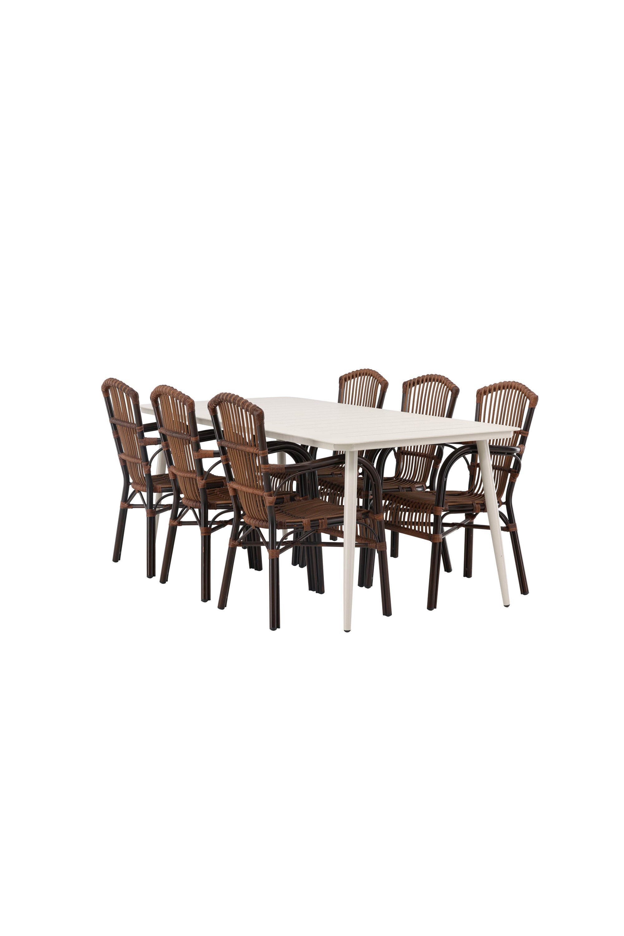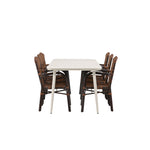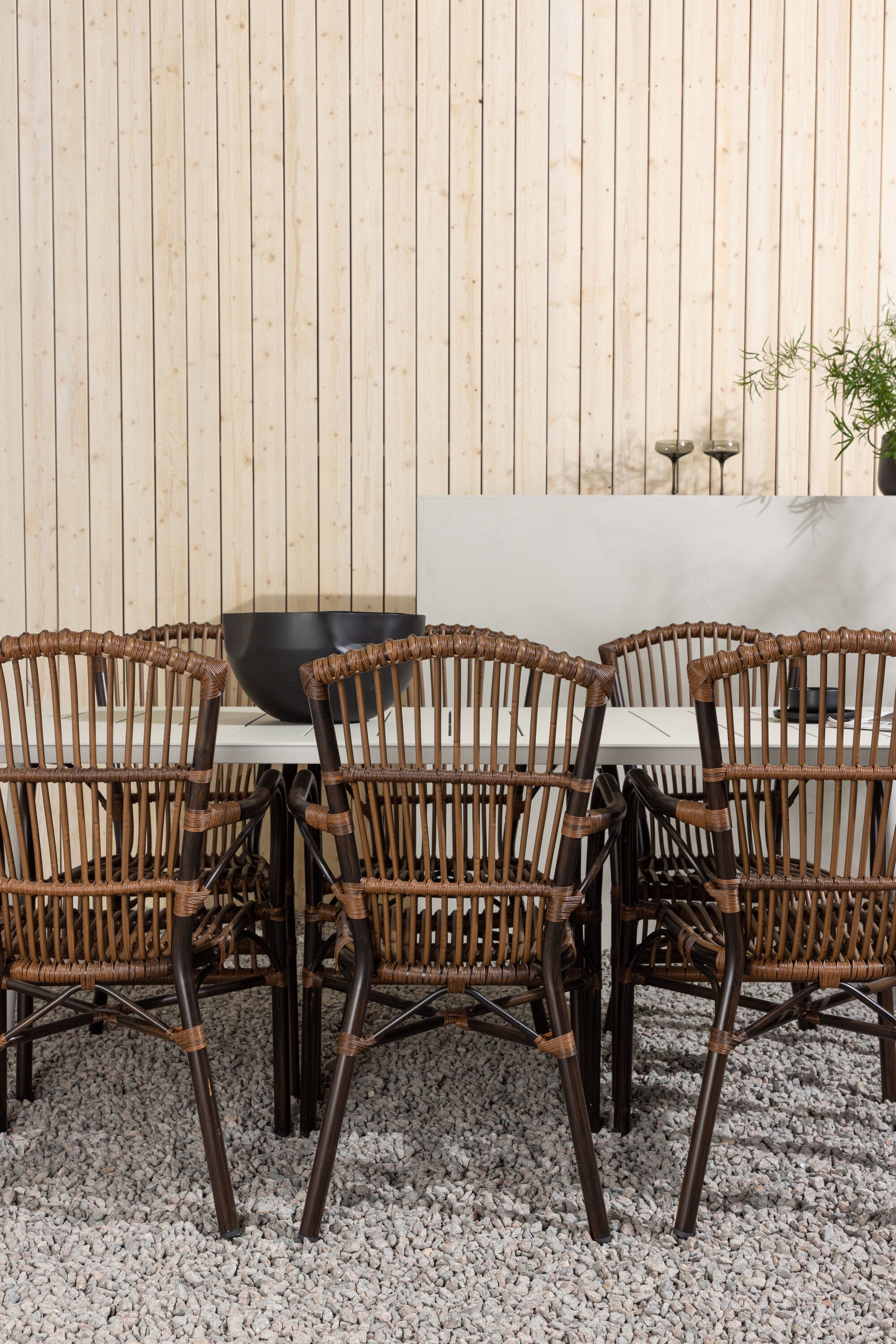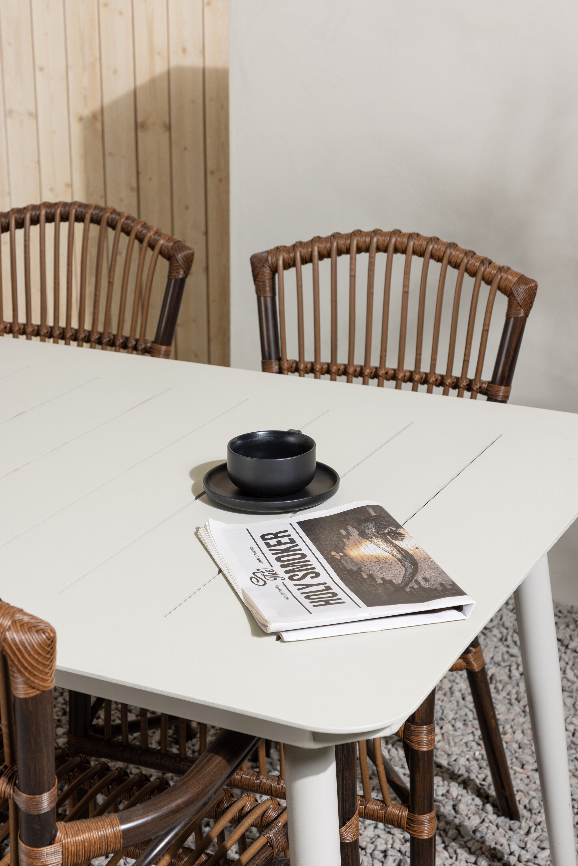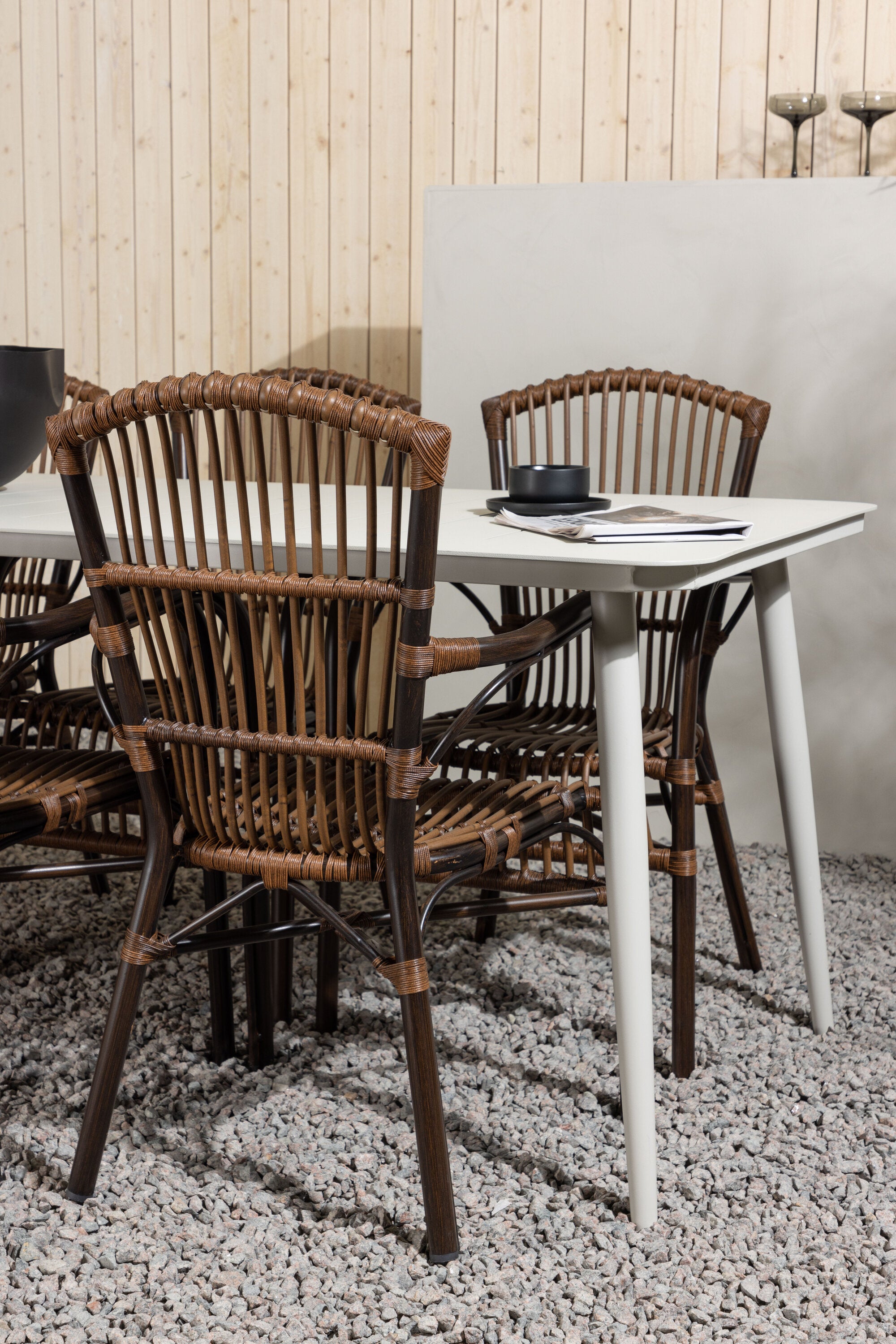 Vytvořte na své terase příjemnou atmosféru! Náš obdélníkový jídelní stůl ze série Lina má minimalistický design v jemné béžové barvě. Vyrobeno z béžové oceli s tenkým horním kotoučem a mírně rozšířenými nohami. Zde společně s našimi oblíbenými jídelními židlemi ze série Galera. Židle má moderní barvu v ořechu a vkusné provedení v materiálu pletené proutí. Hliníková rámová konstrukce je robustní s vysokými područkami pro extra pohodlí a krásnou hloubkou sedu, která vám umožní sedět pohodlně po dlouhou dobu. Užijte si toto léto lahodná jídla! Rozměry stolu: 200 x 90 cm.