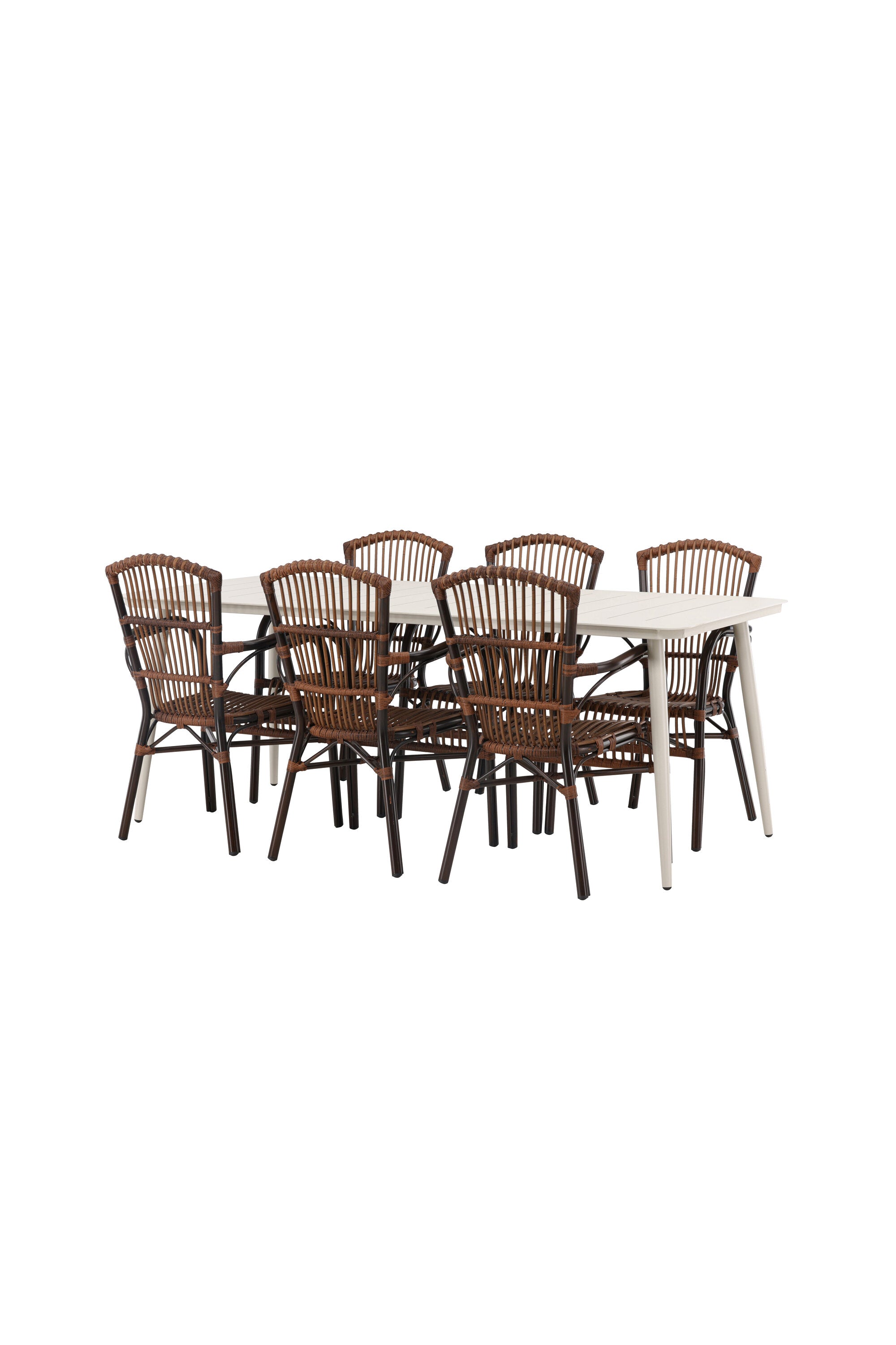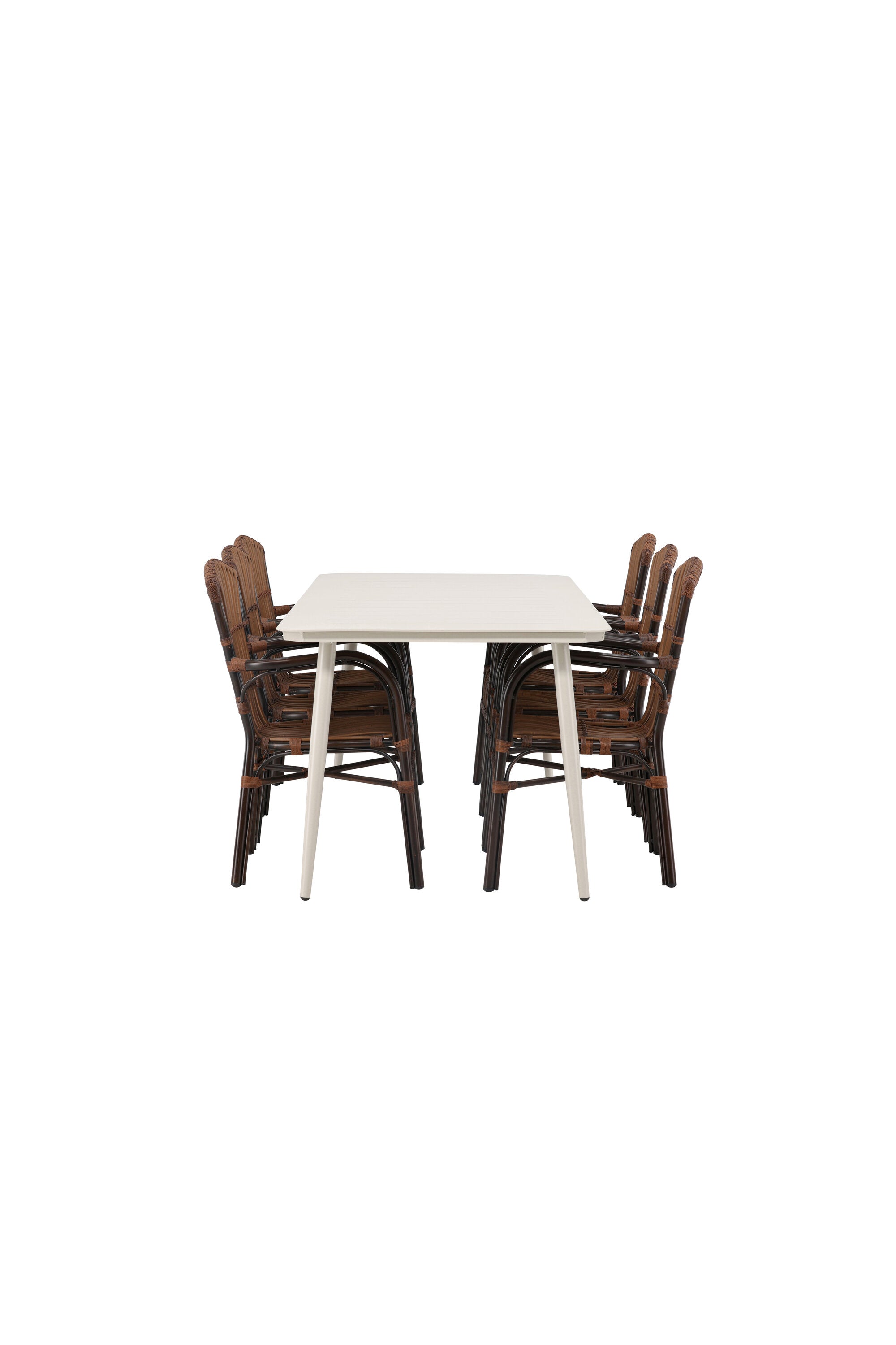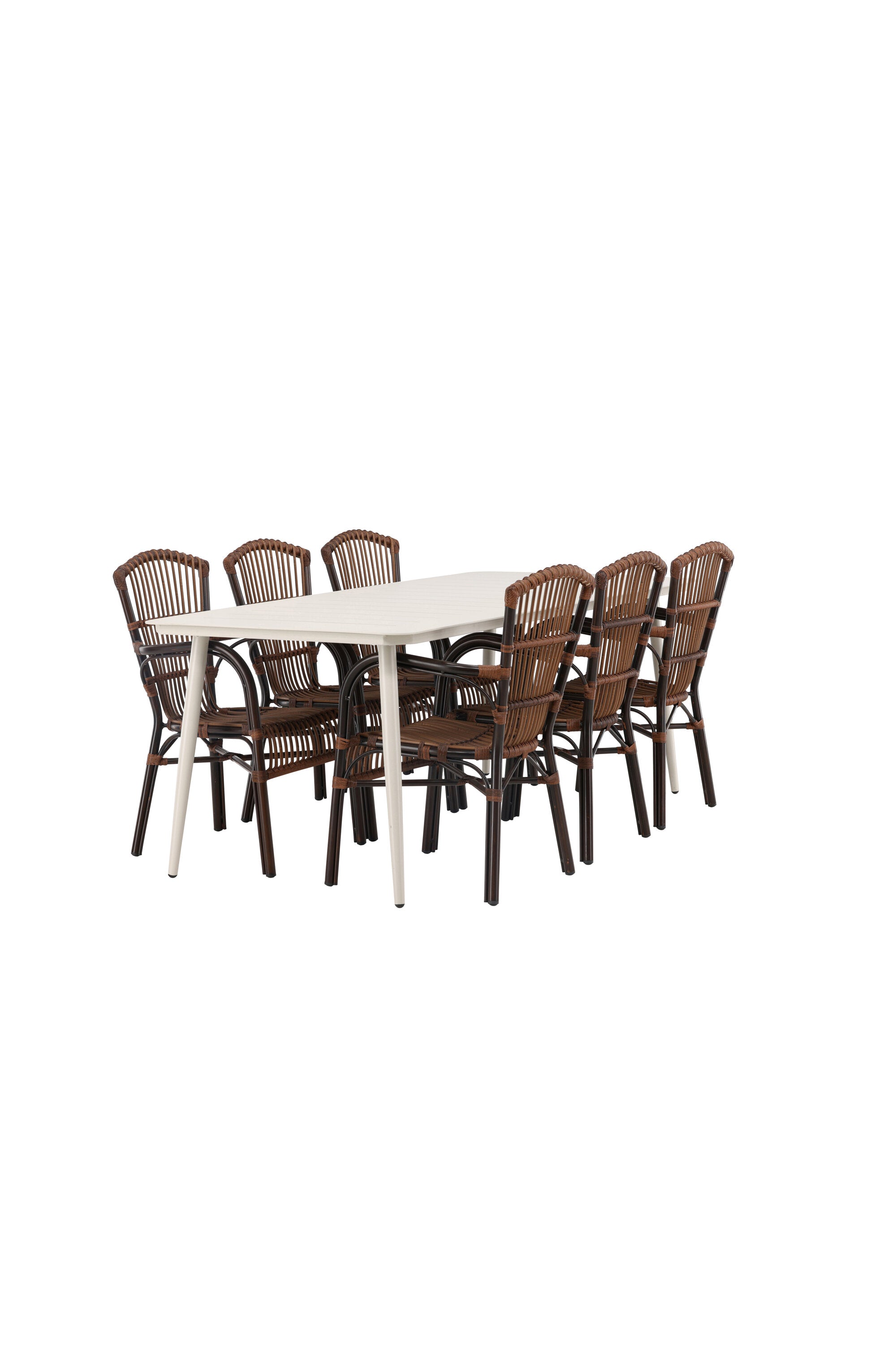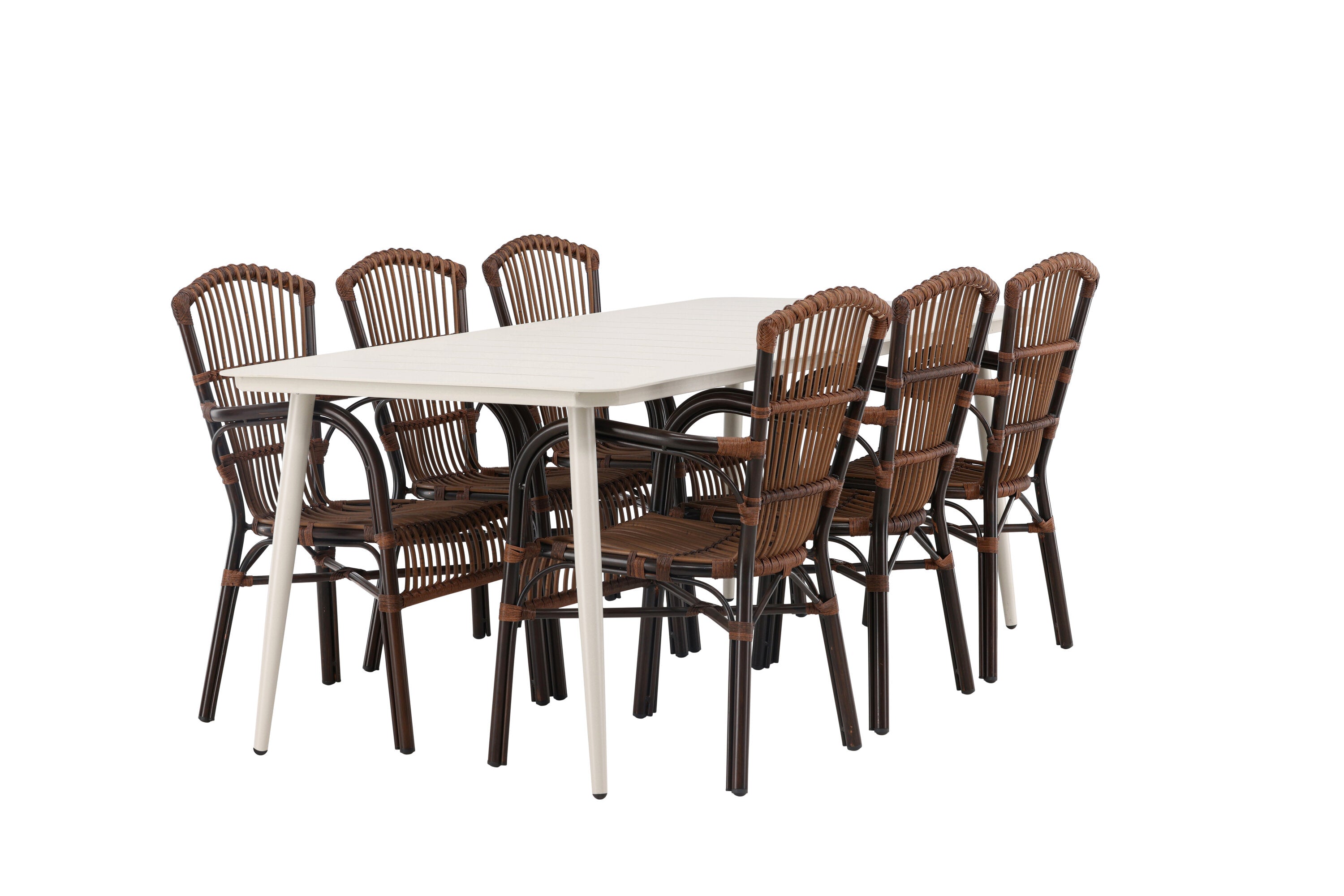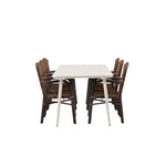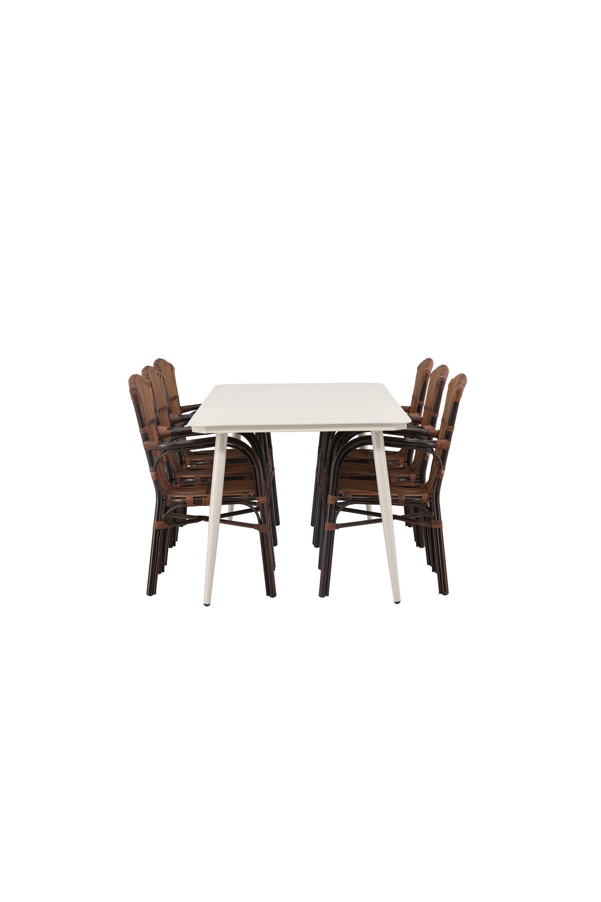 Vytvořte na své terase příjemnou atmosféru! Náš obdélníkový jídelní stůl ze série Lina má minimalistický design v jemné béžové barvě. Vyrobeno z béžové oceli s tenkým horním kotoučem a mírně rozšířenými nohami. Zde společně s našimi oblíbenými jídelními židlemi ze série Galera. Židle má moderní barvu v ořechu a vkusné provedení v materiálu pletené proutí. Hliníková rámová konstrukce je robustní s vysokými područkami pro extra pohodlí a krásnou hloubkou sedu, která vám umožní sedět pohodlně po dlouhou dobu. Užijte si toto léto lahodná jídla! Rozměry stolu: 200 x 90 cm.