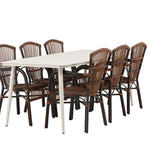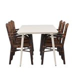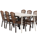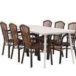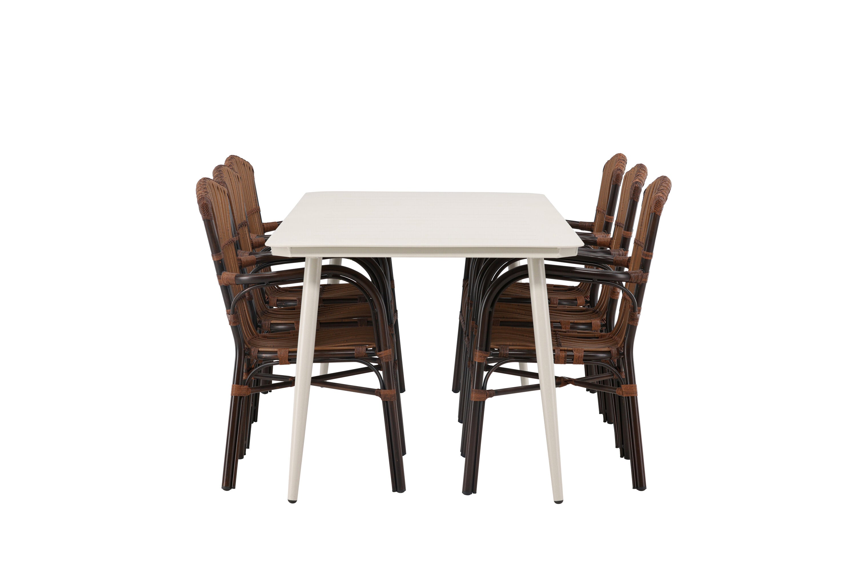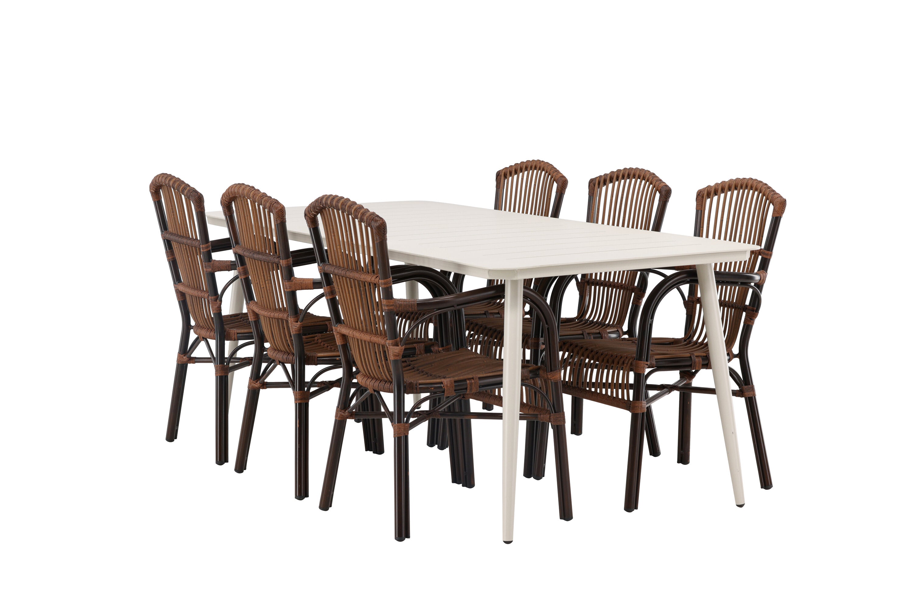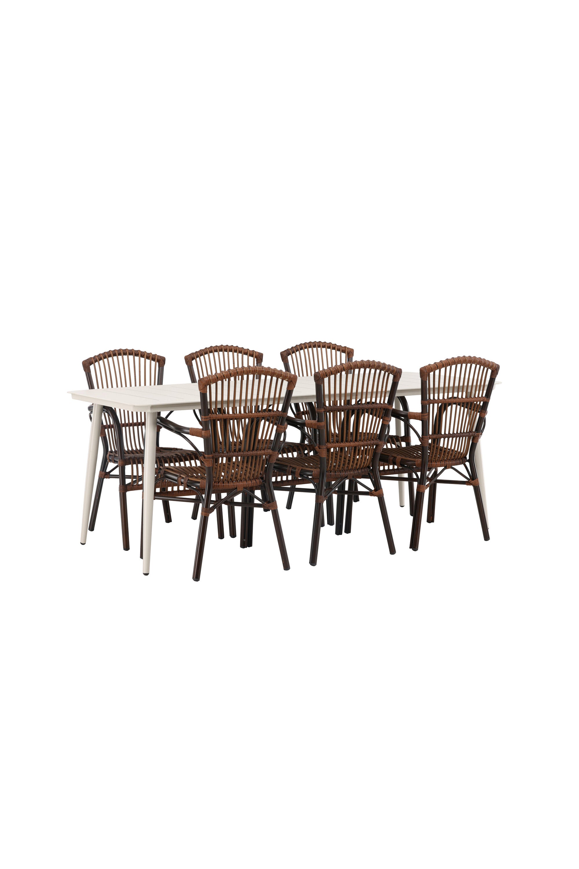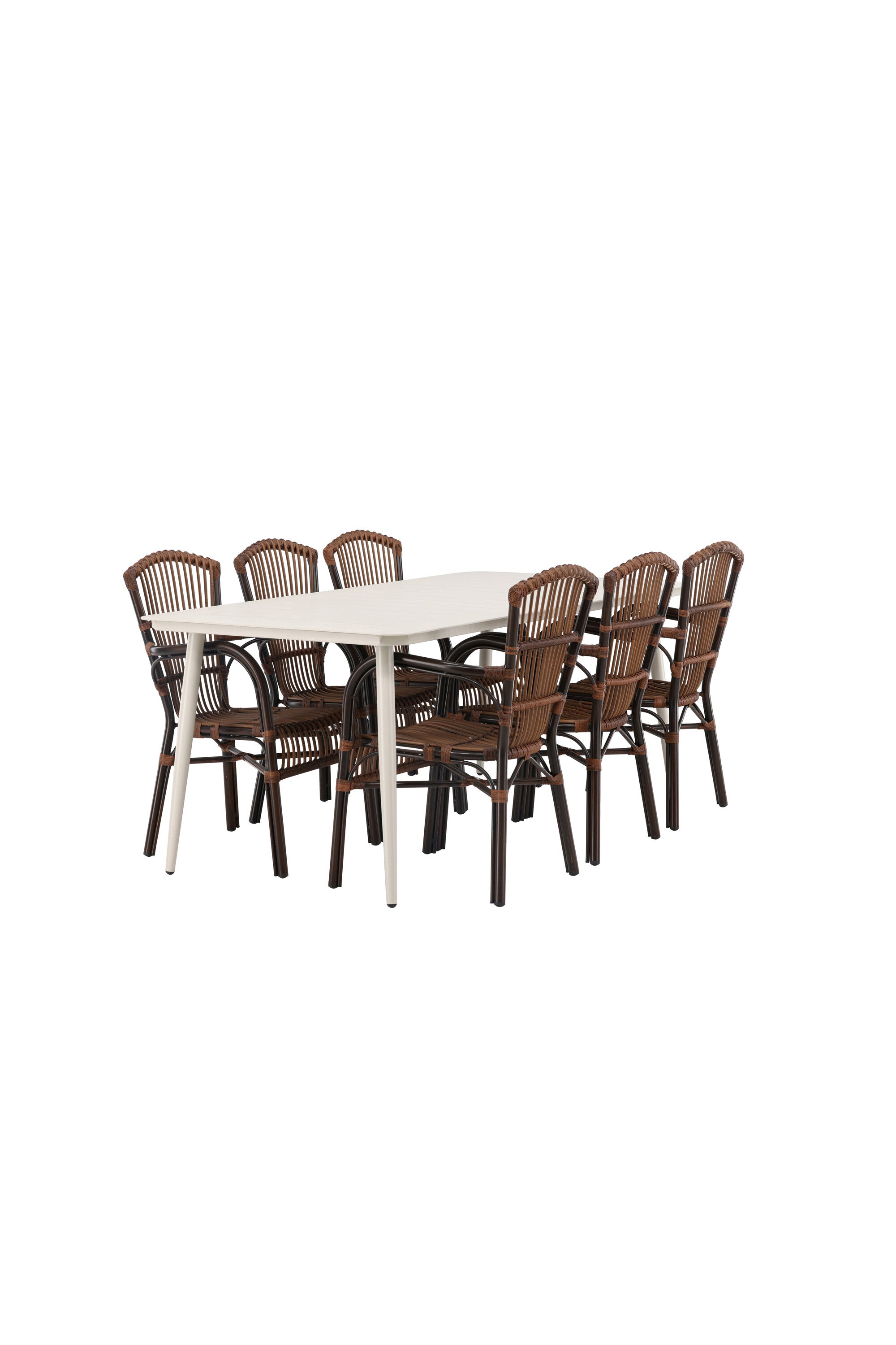 Vytvořte na své terase příjemnou atmosféru! Náš obdélníkový jídelní stůl ze série Lina má minimalistický design v jemné béžové barvě. Vyrobeno z béžové oceli s tenkým horním kotoučem a mírně rozšířenými nohami. Zde společně s našimi oblíbenými jídelními židlemi ze série Galera. Židle má moderní barvu v ořechu a vkusné provedení v materiálu pletené proutí. Hliníková rámová konstrukce je robustní s vysokými područkami pro extra pohodlí a krásnou hloubkou sedu, která vám umožní sedět pohodlně po dlouhou dobu. Užijte si toto léto lahodná jídla! Rozměry stolu: 200 x 90 cm.