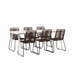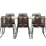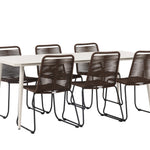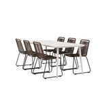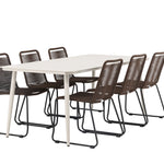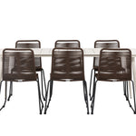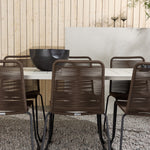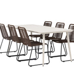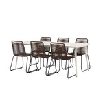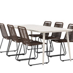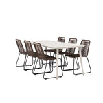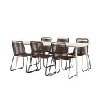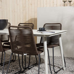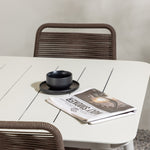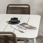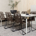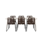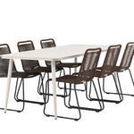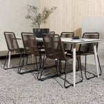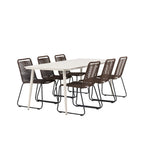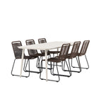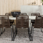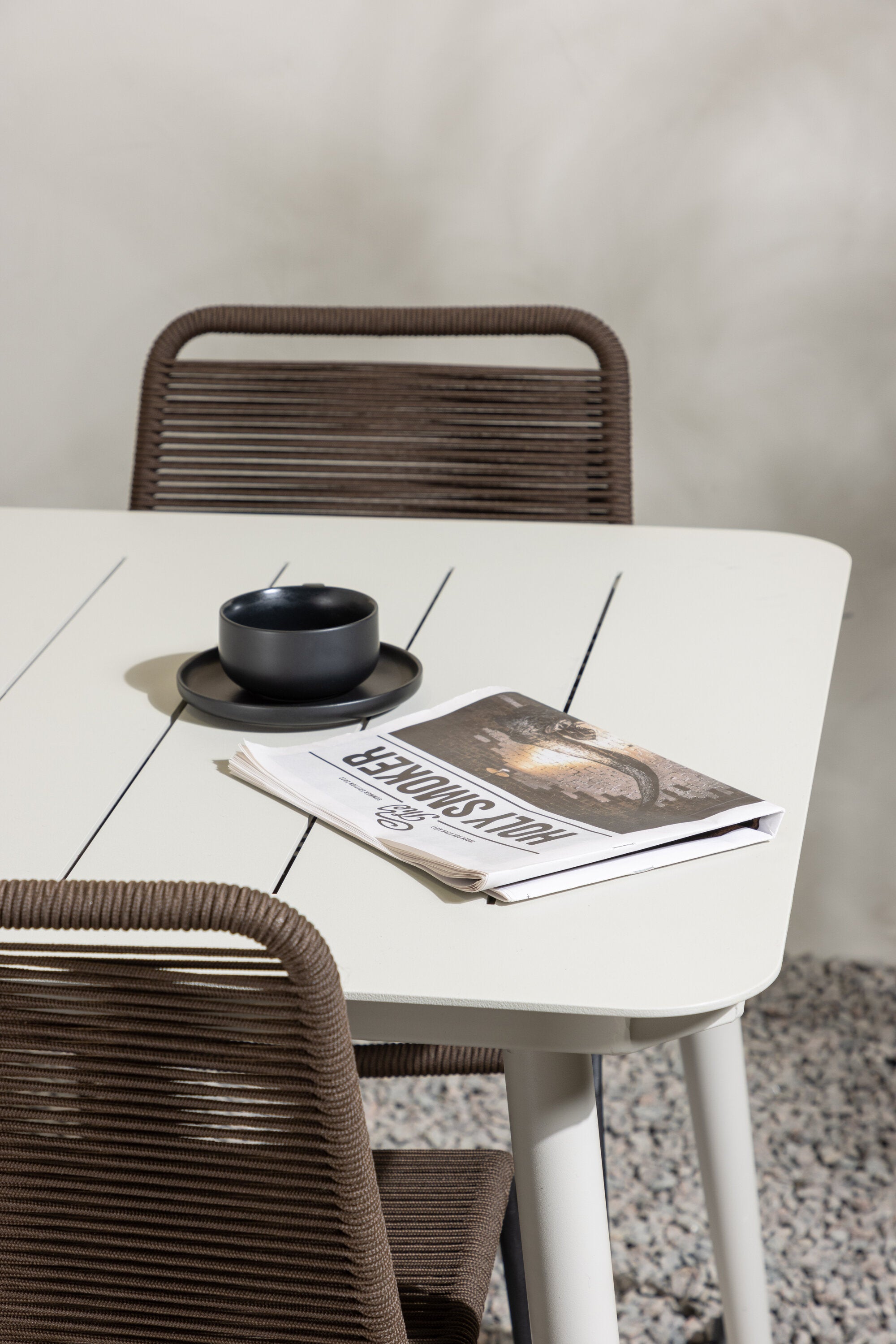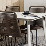 Jídelní skupina navržená zcela v souladu s trendy! Jídelní stůl Lina má obdélníkovou desku v minimalistickém designu a mírně rozšířené nohy, důsledně vyrobené z béžové oceli. Zde společně s moderními jídelními židlemi ze série Lindos v minimalistickém designu. Židle má sedák z odolného lana v oblíbené hnědé barvě a minimalistickou kostru z černé oceli. Připravte se letos v létě na skvělý noční život! Rozměry stolu: 200 x 90 cm.