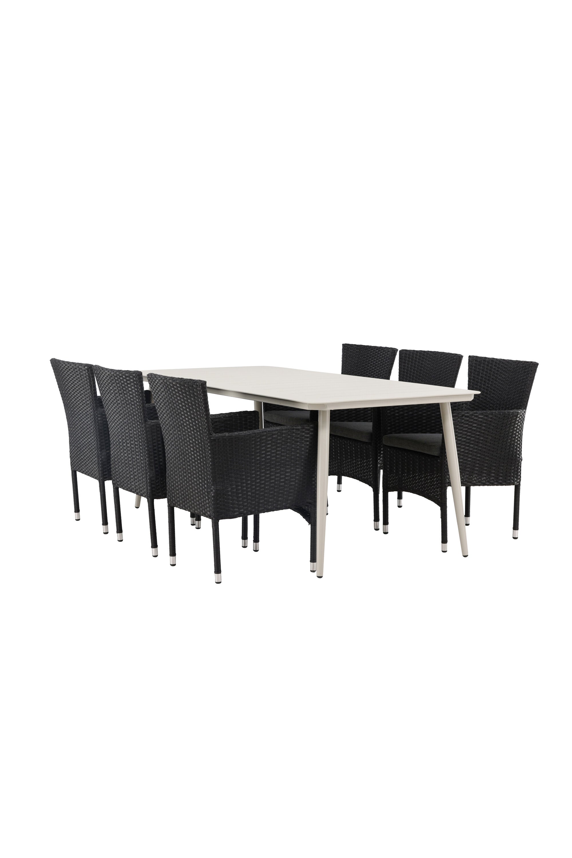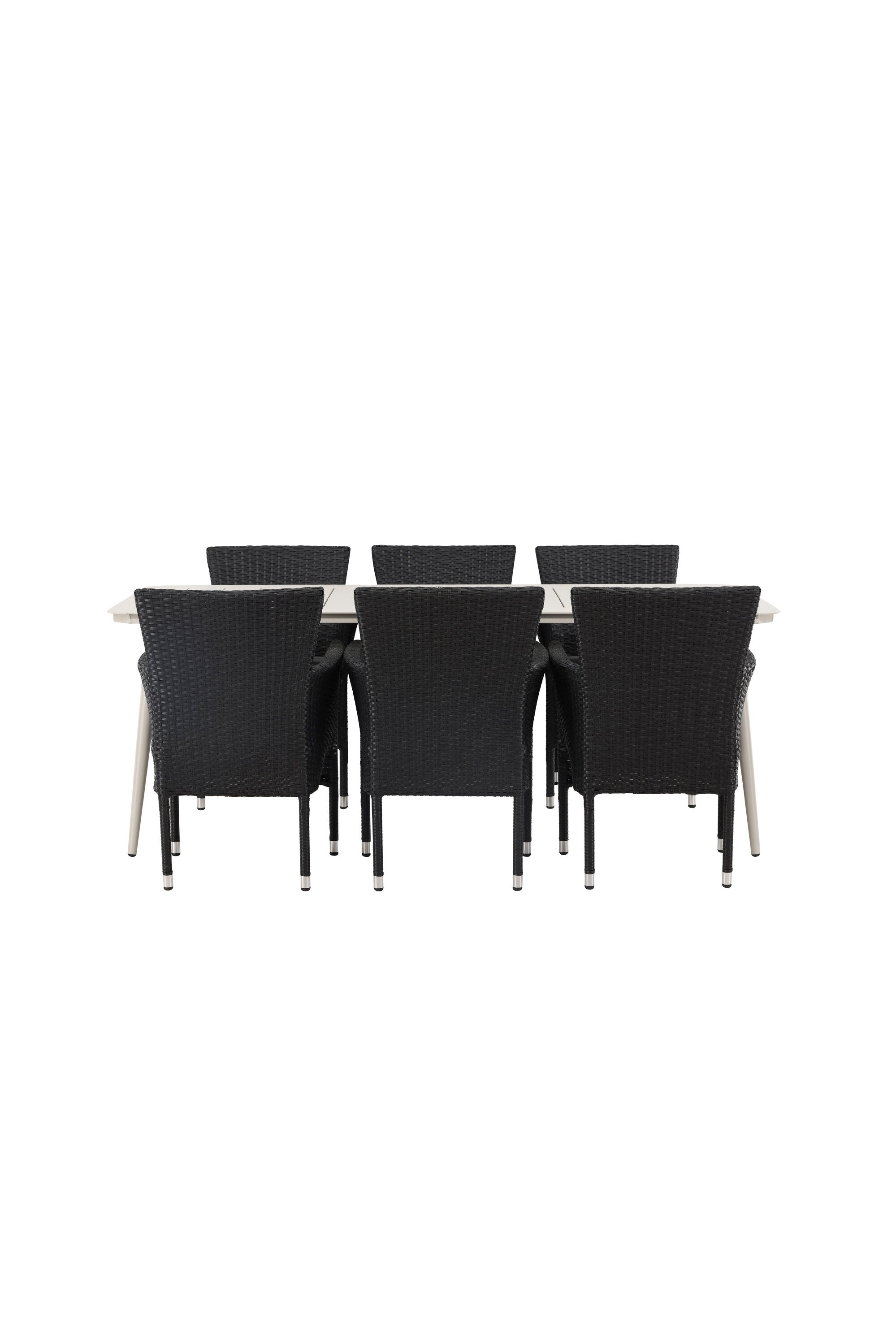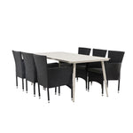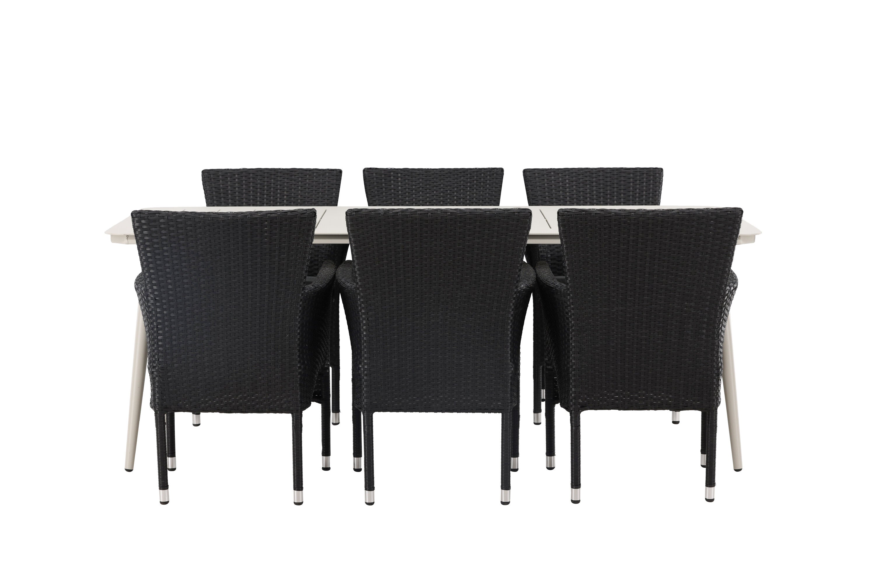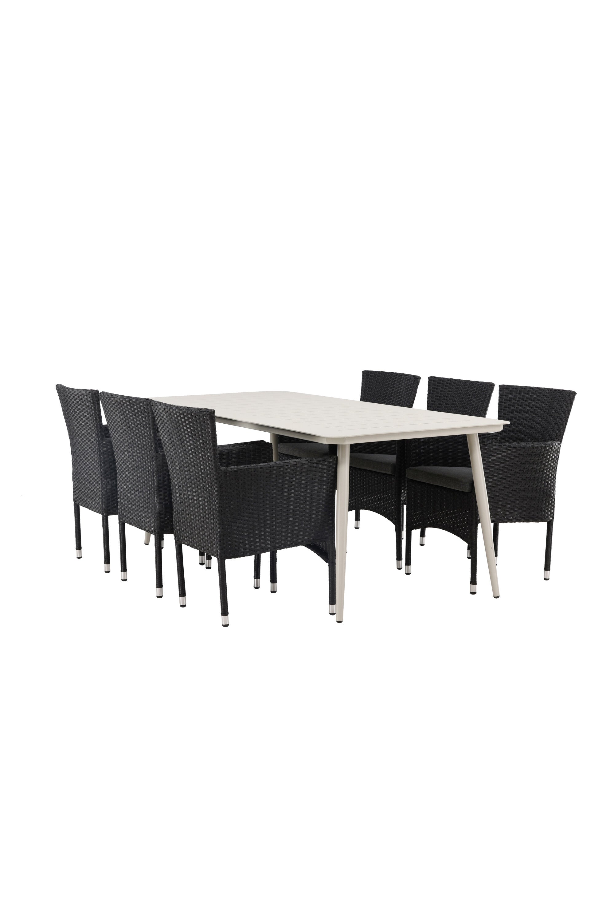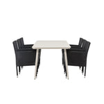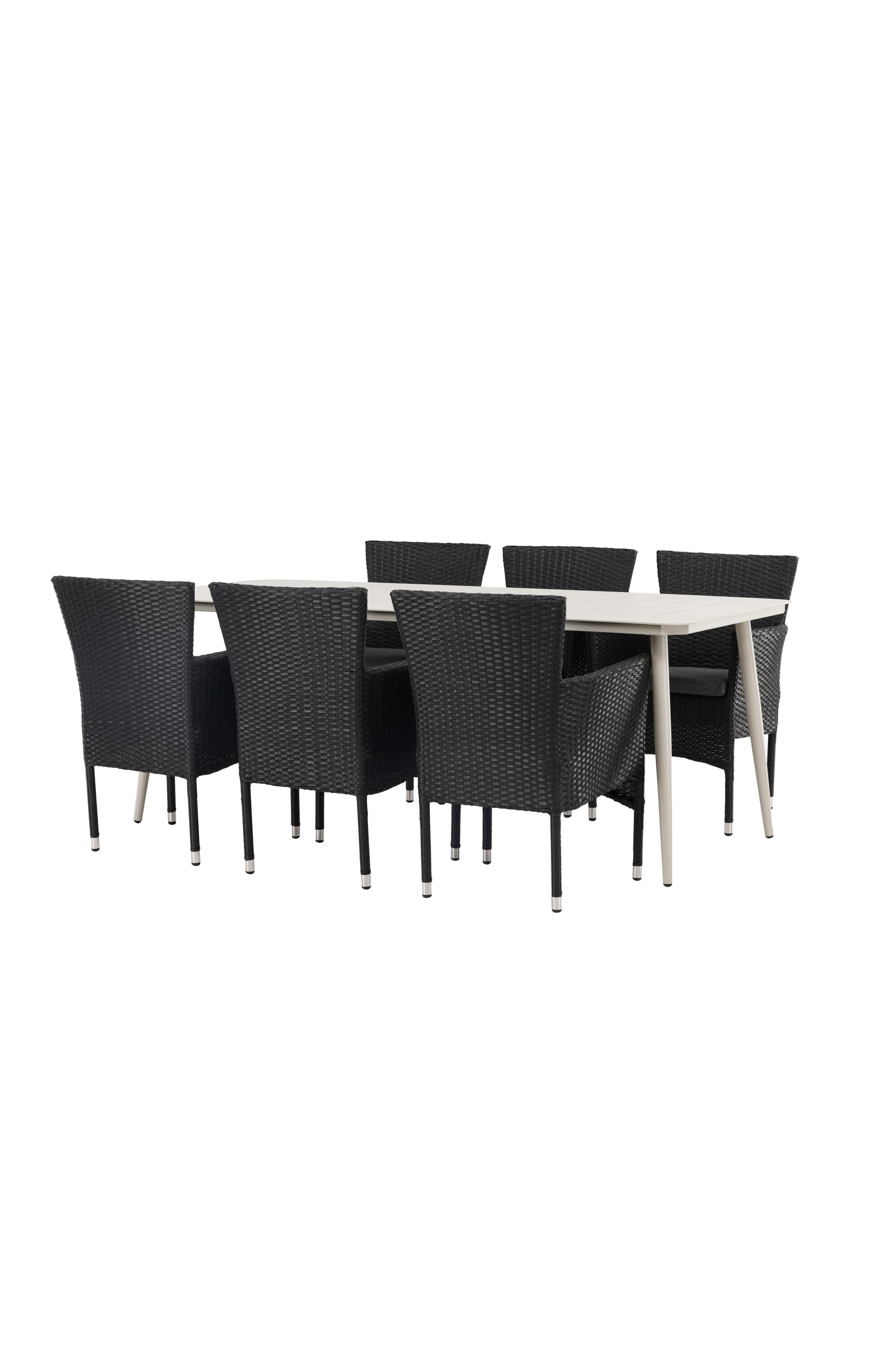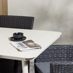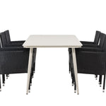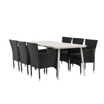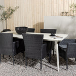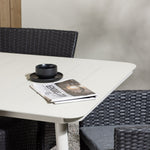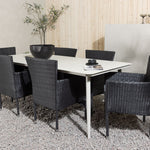 Dokonalá kombinace vysokého komfortu a stylového designu - tato jídelní sestava je vhodná pro všechny příležitosti! Jídelní stůl Lina má obdélníkovou desku v minimalistickém designu a mírně rozšířené nohy, důsledně vyrobené z béžové oceli. Zde ve fantastické kombinaci s jídelními židlemi ze série Malina. Křeslo má hliníkový rám a umělý ratan v sazově černé barvě. Pohodlně se letos v létě usaďte a vychutnejte si lahodná jídla venku! Rozměry stolu: 200 x 90 cm.