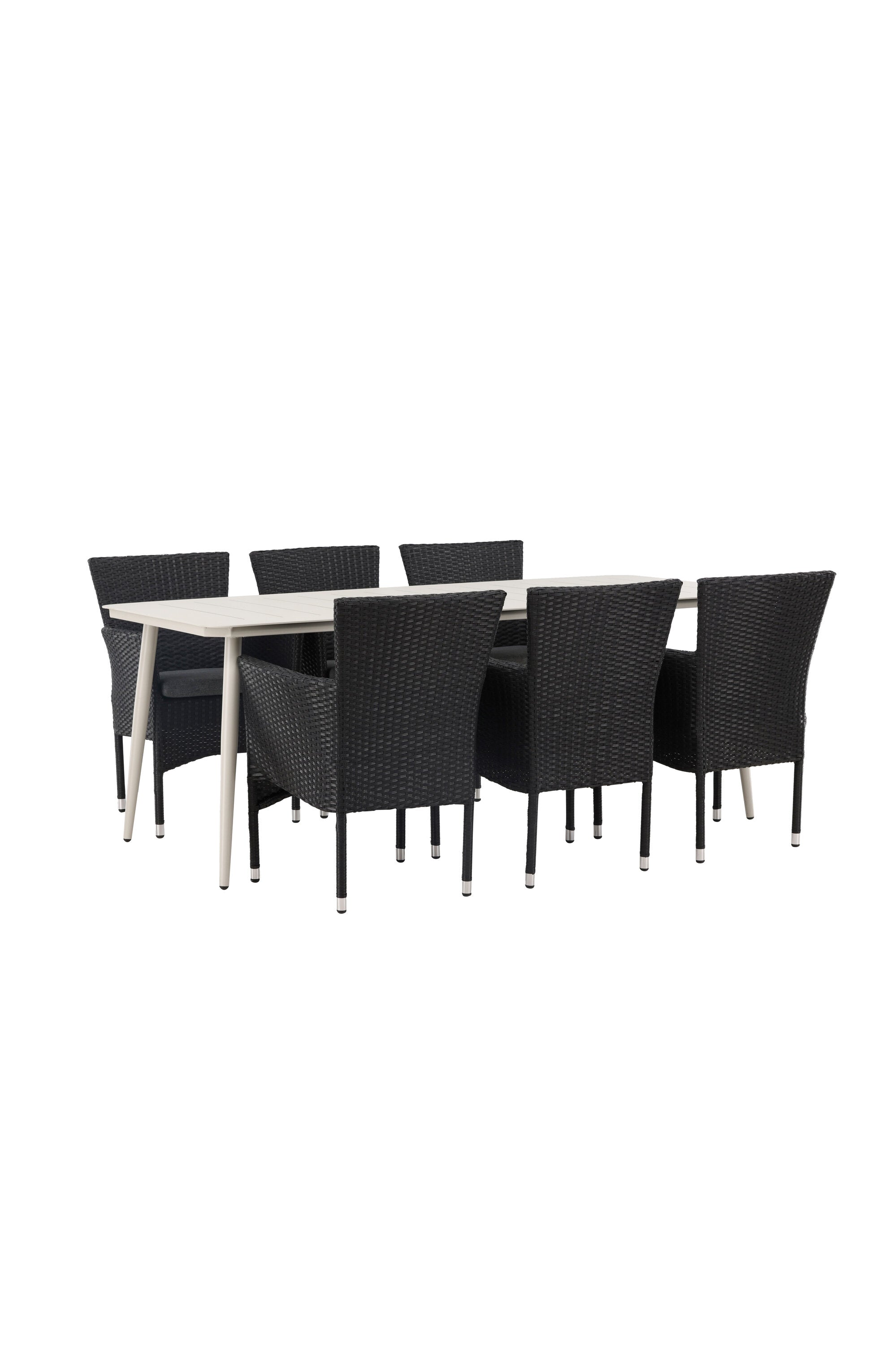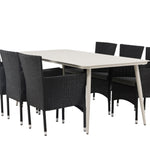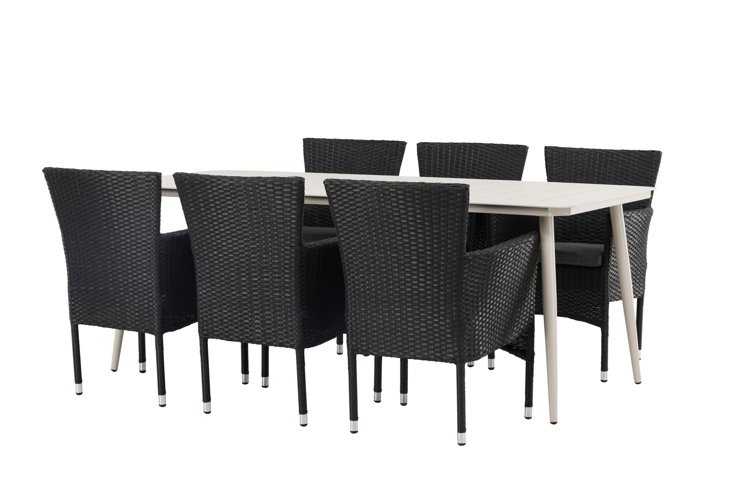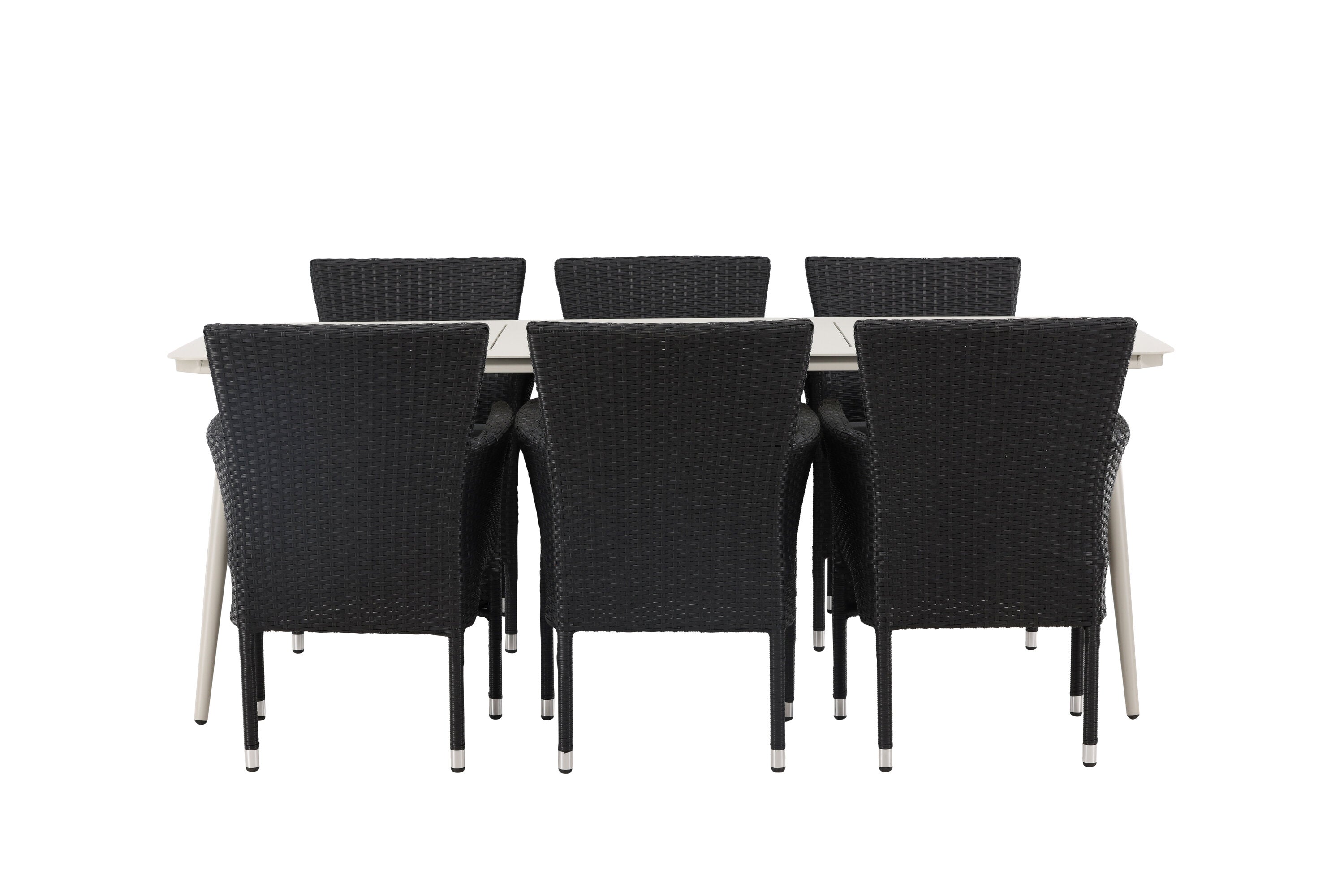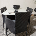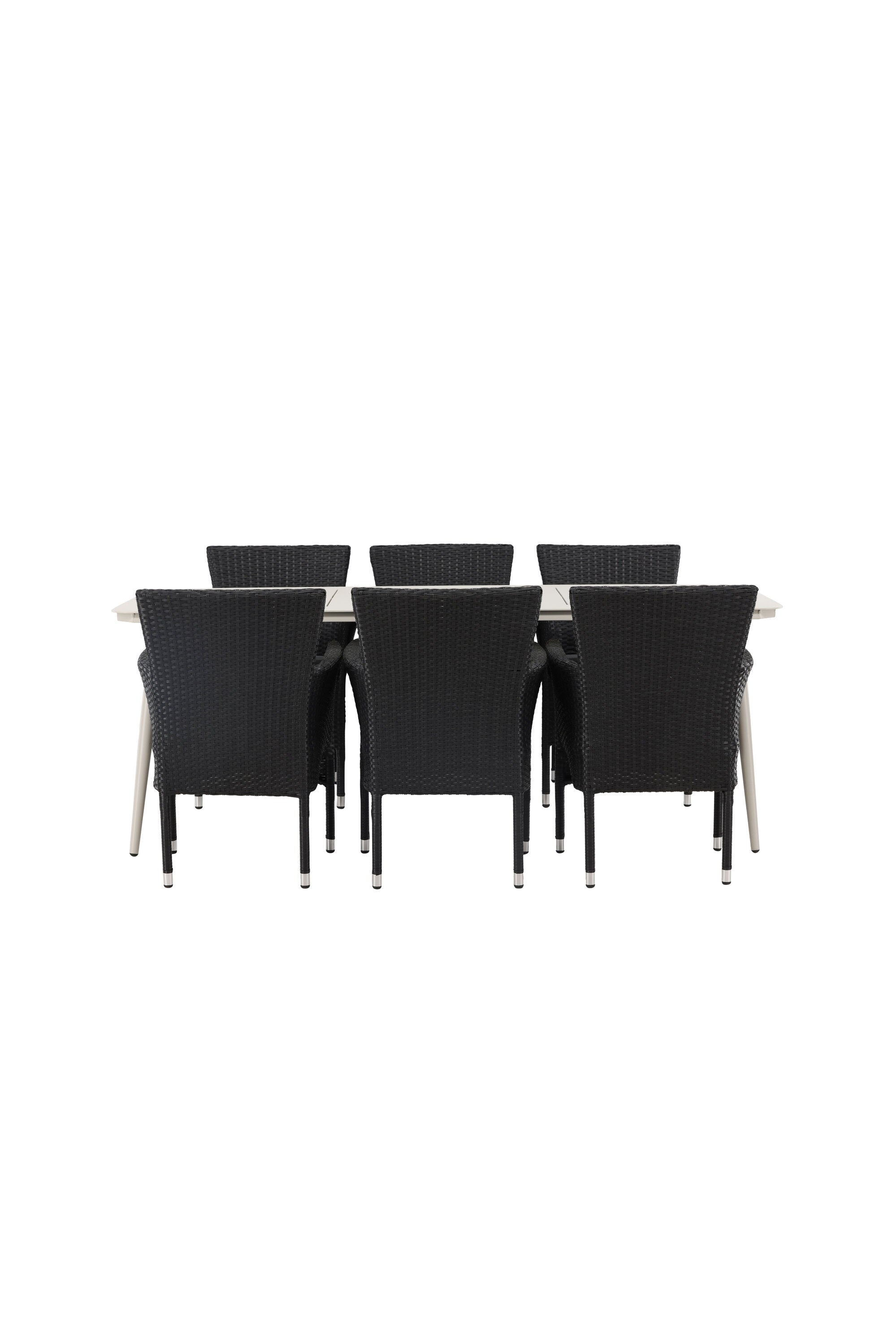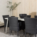 Dokonalá kombinace vysokého komfortu a stylového designu - tato jídelní sestava je vhodná pro všechny příležitosti! Jídelní stůl Lina má obdélníkovou desku v minimalistickém designu a mírně rozšířené nohy, důsledně vyrobené z béžové oceli. Zde ve fantastické kombinaci s jídelními židlemi ze série Malina. Křeslo má hliníkový rám a umělý ratan v sazově černé barvě. Pohodlně se letos v létě usaďte a vychutnejte si lahodná jídla venku! Rozměry stolu: 200 x 90 cm.