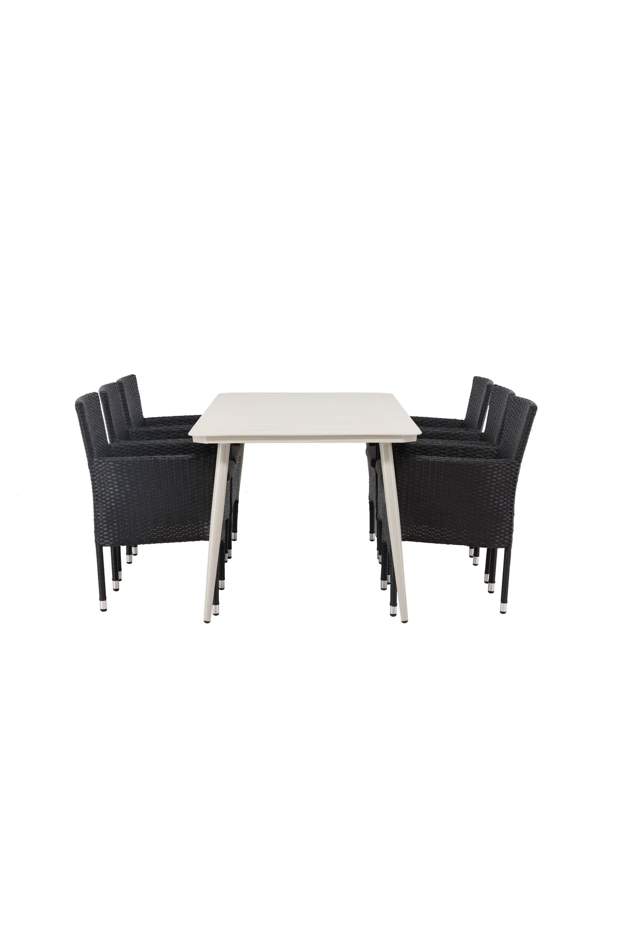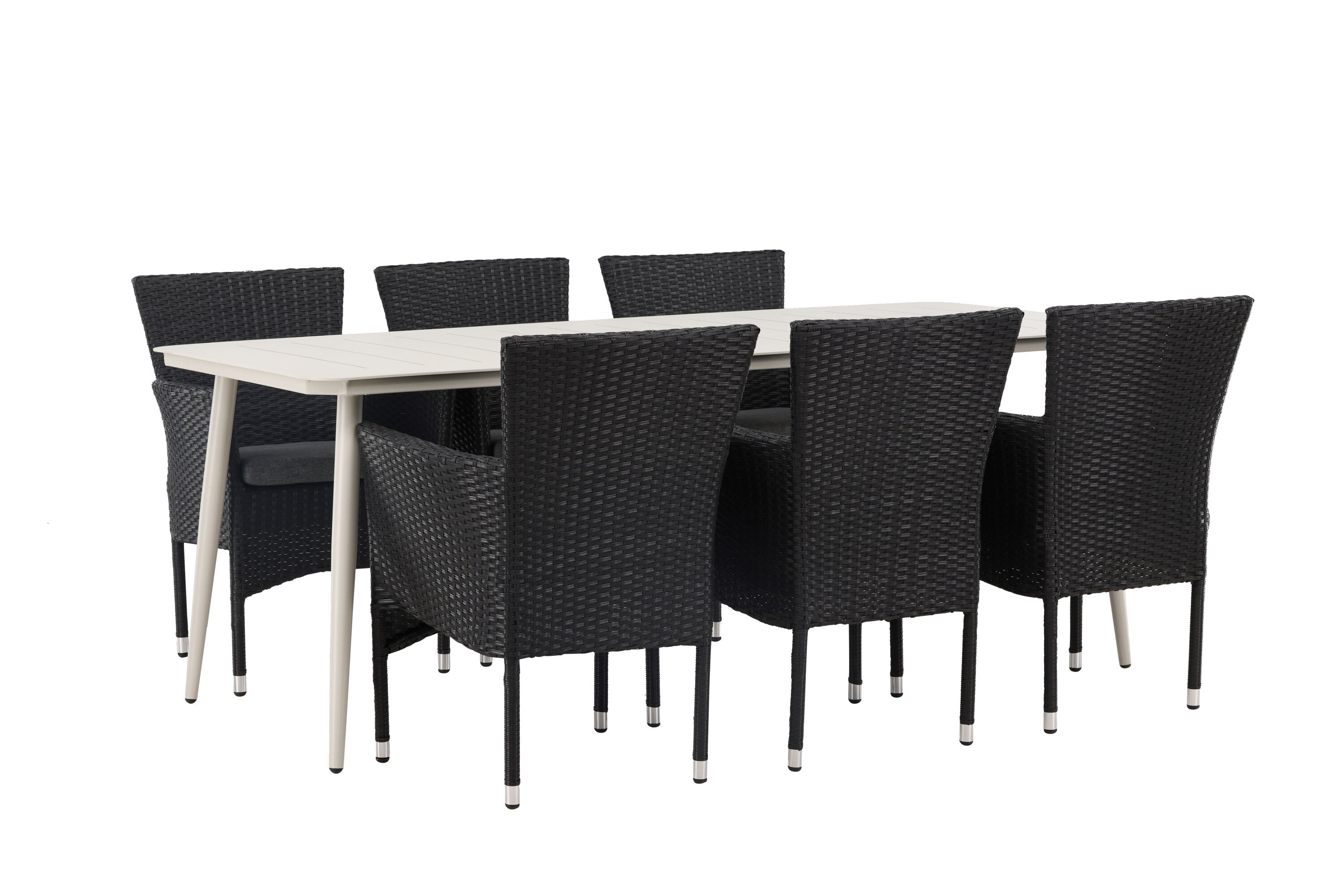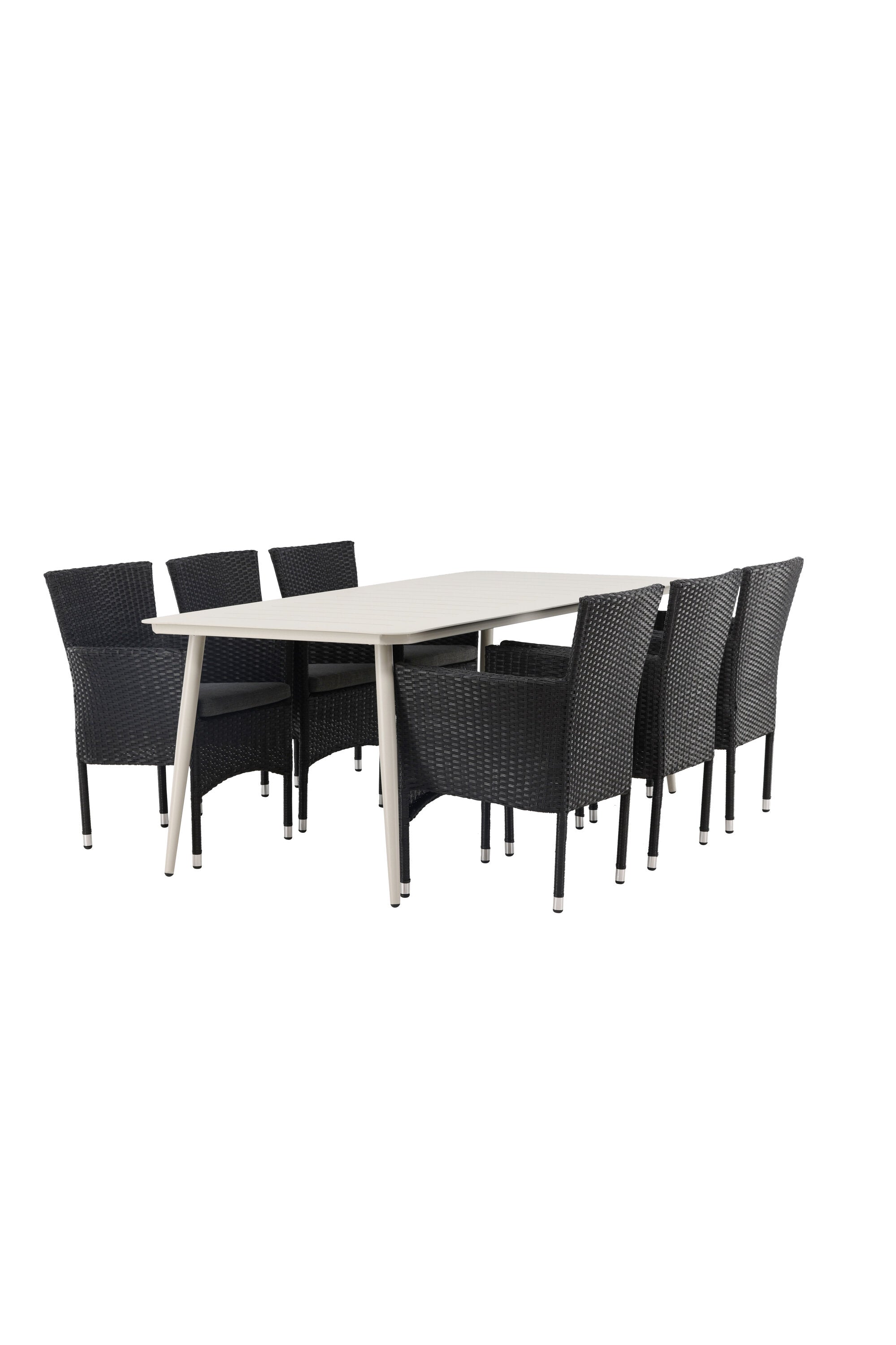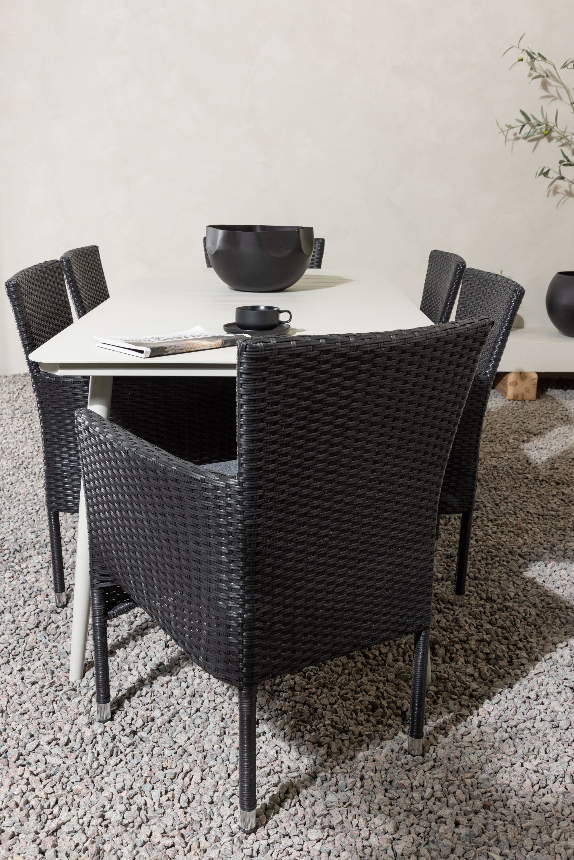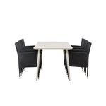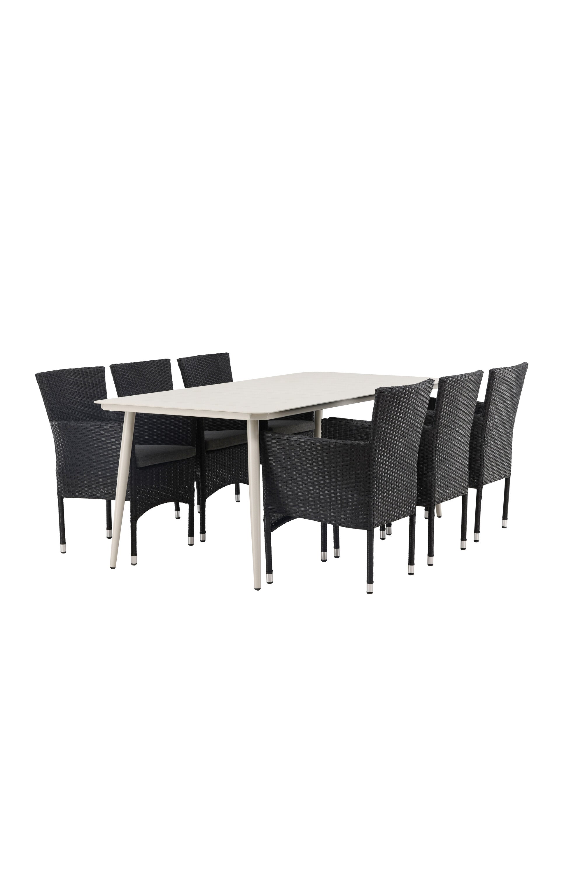 Dokonalá kombinace vysokého komfortu a stylového designu - tato jídelní sestava je vhodná pro všechny příležitosti! Jídelní stůl Lina má obdélníkovou desku v minimalistickém designu a mírně rozšířené nohy, důsledně vyrobené z béžové oceli. Zde ve fantastické kombinaci s jídelními židlemi ze série Malina. Křeslo má hliníkový rám a umělý ratan v sazově černé barvě. Pohodlně se letos v létě usaďte a vychutnejte si lahodná jídla venku! Rozměry stolu: 200 x 90 cm.