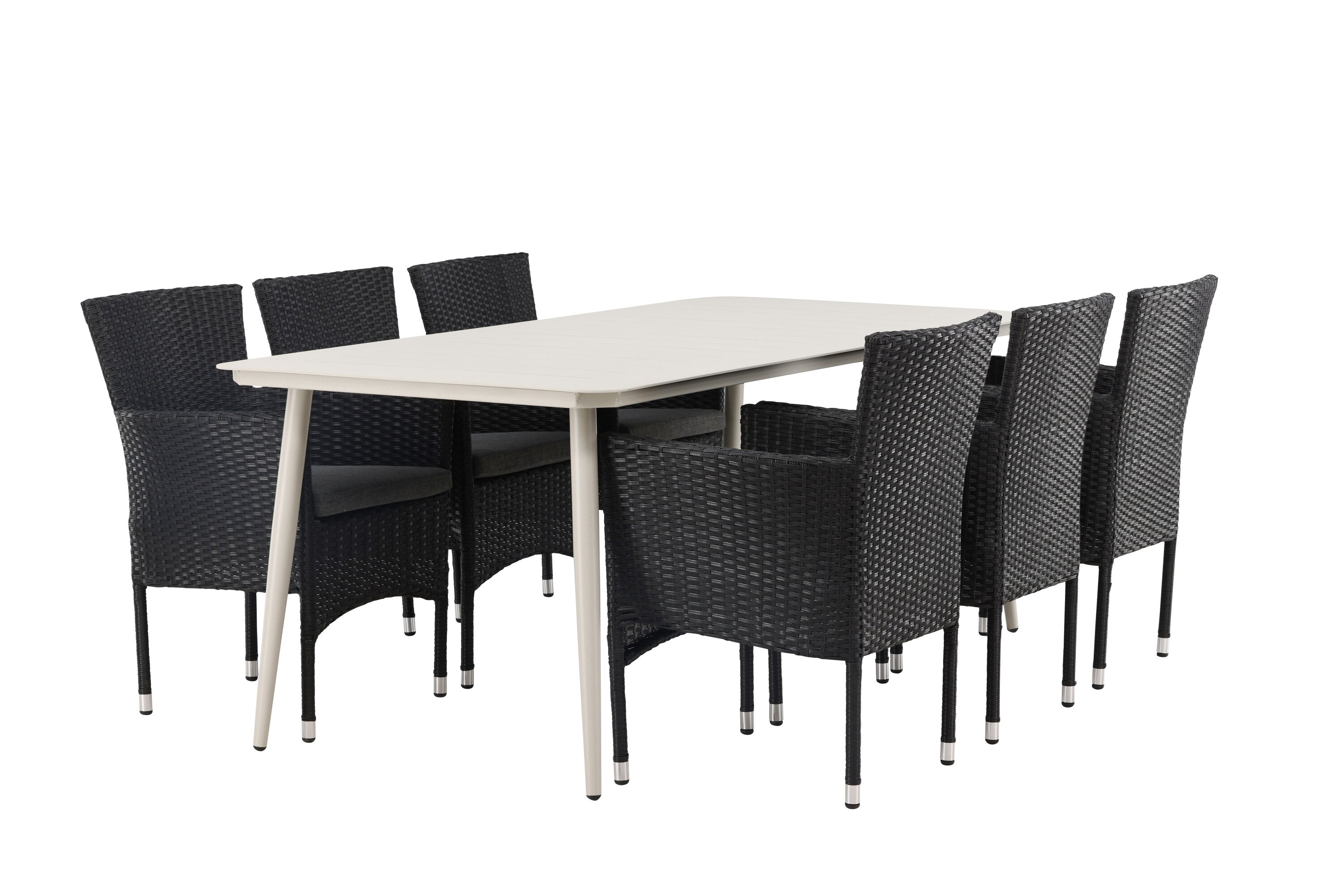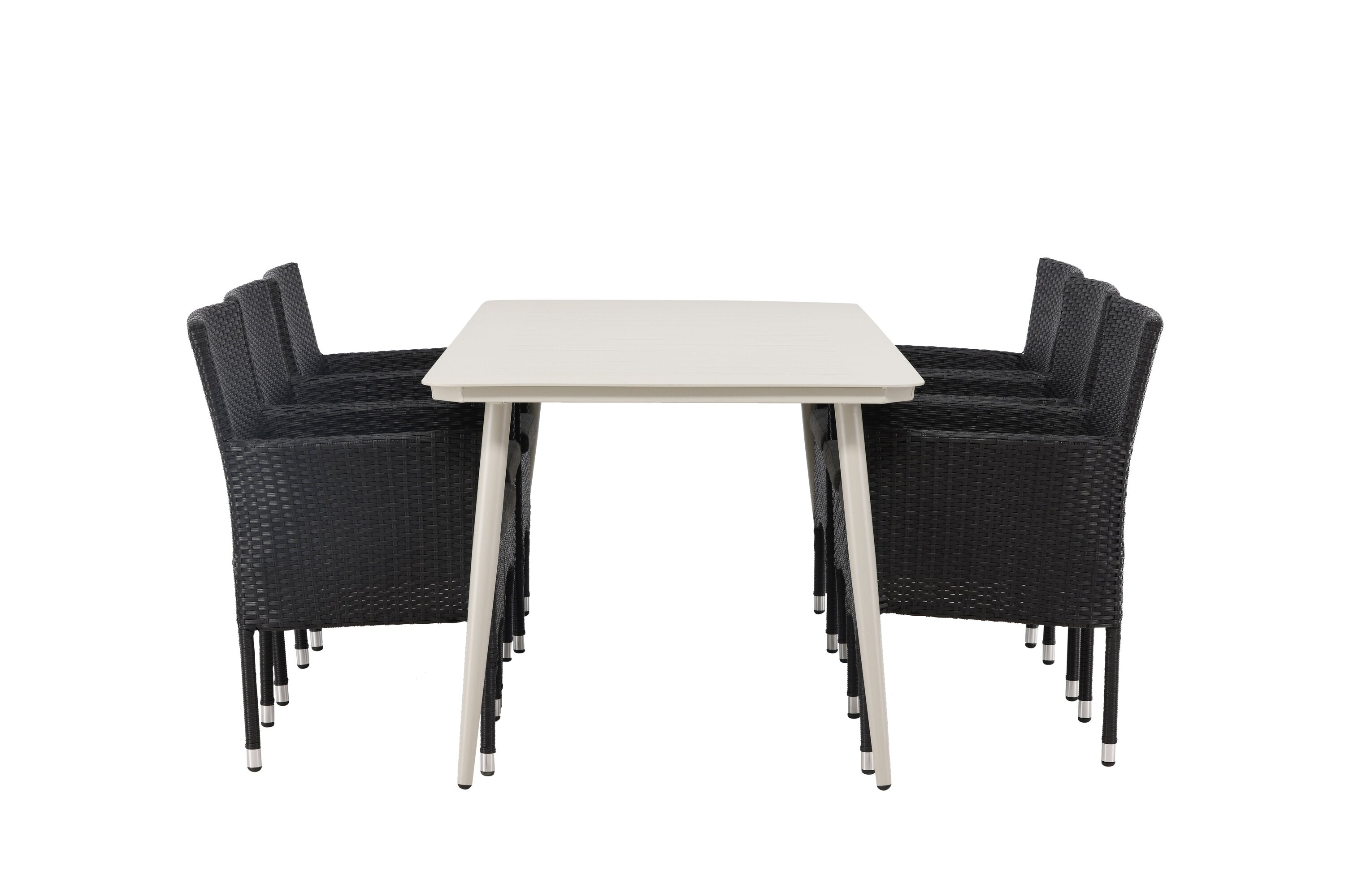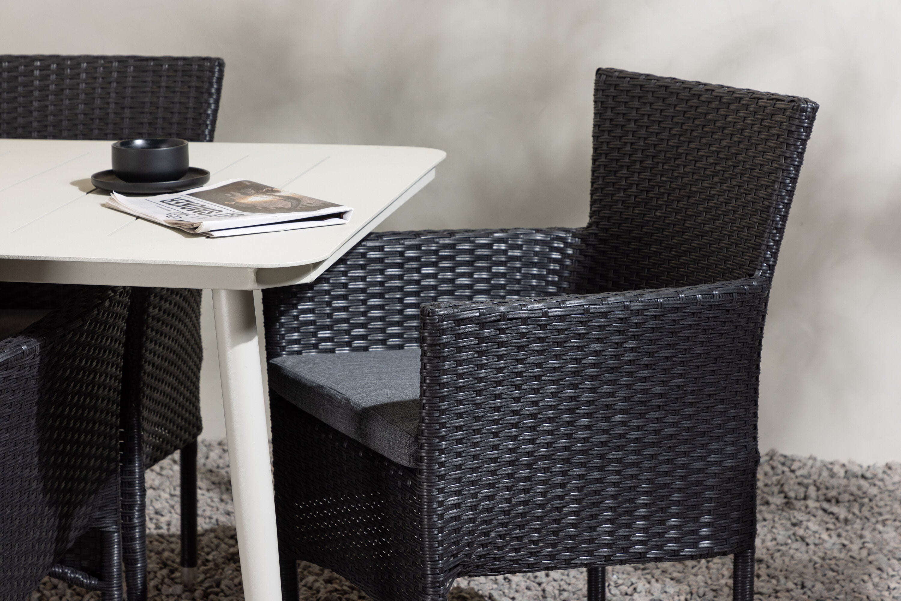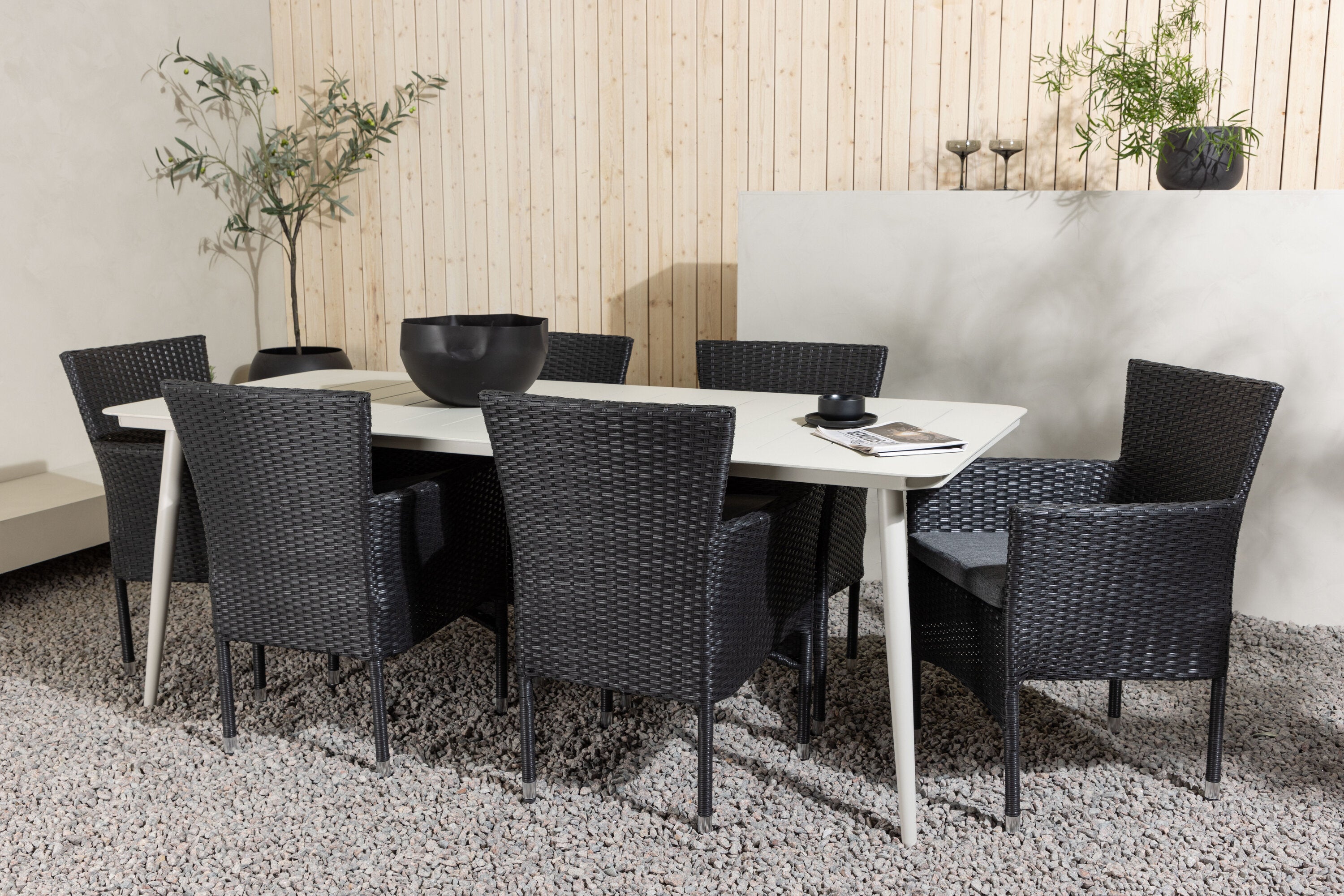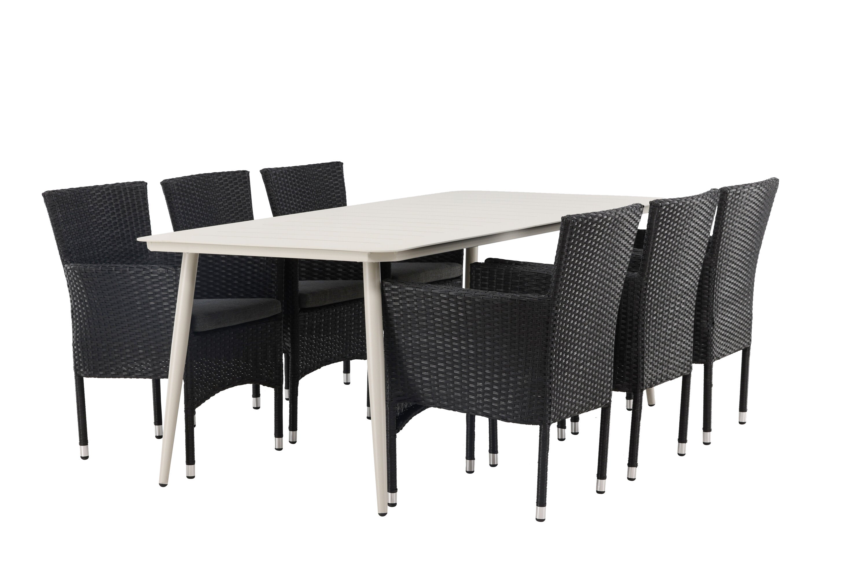 Dokonalá kombinace vysokého komfortu a stylového designu - tato jídelní sestava je vhodná pro všechny příležitosti! Jídelní stůl Lina má obdélníkovou desku v minimalistickém designu a mírně rozšířené nohy, důsledně vyrobené z béžové oceli. Zde ve fantastické kombinaci s jídelními židlemi ze série Malina. Křeslo má hliníkový rám a umělý ratan v sazově černé barvě. Pohodlně se letos v létě usaďte a vychutnejte si lahodná jídla venku! Rozměry stolu: 200 x 90 cm.