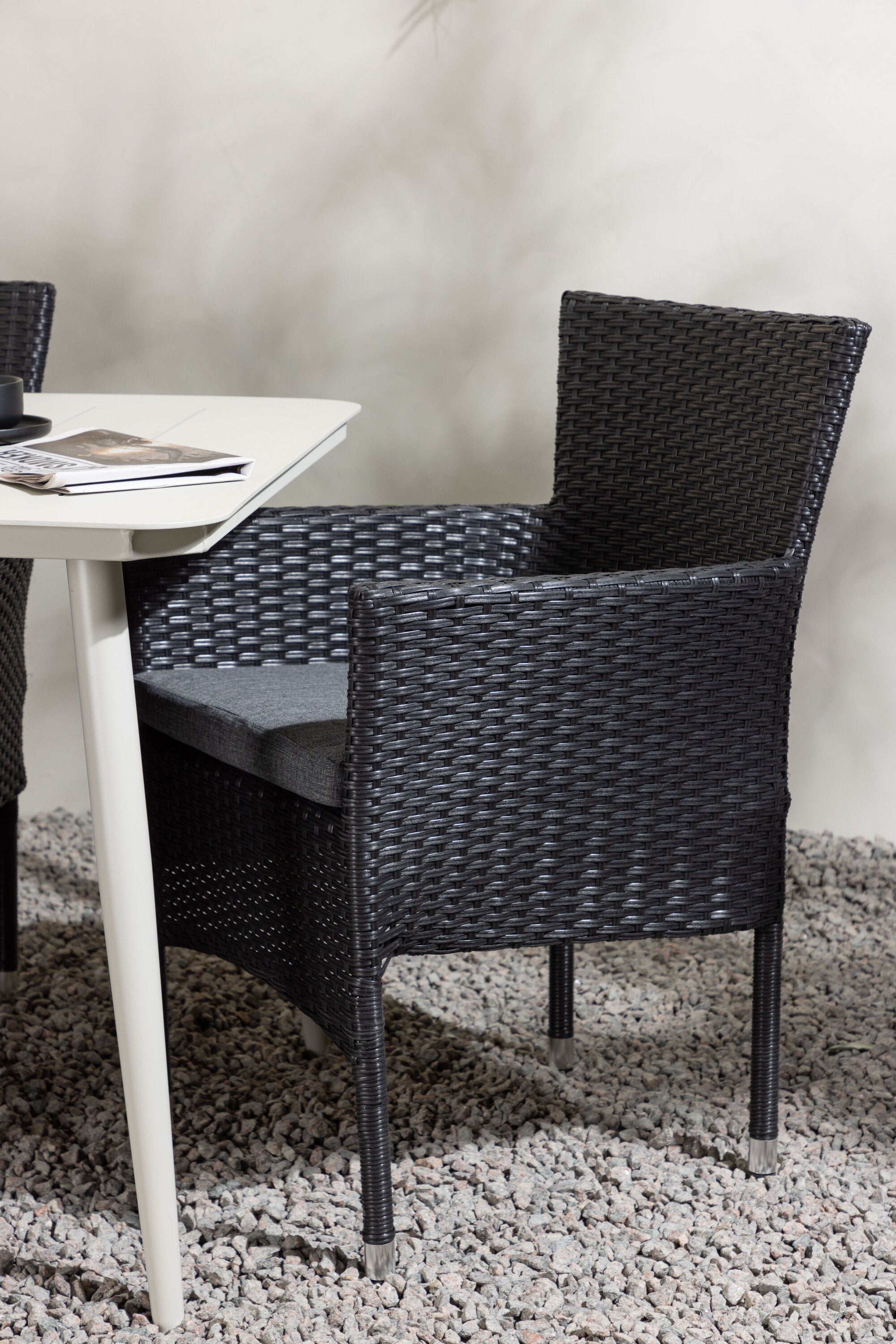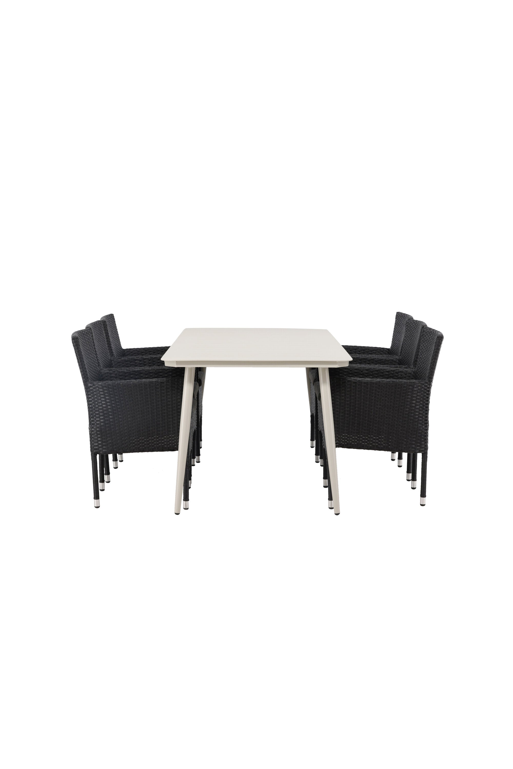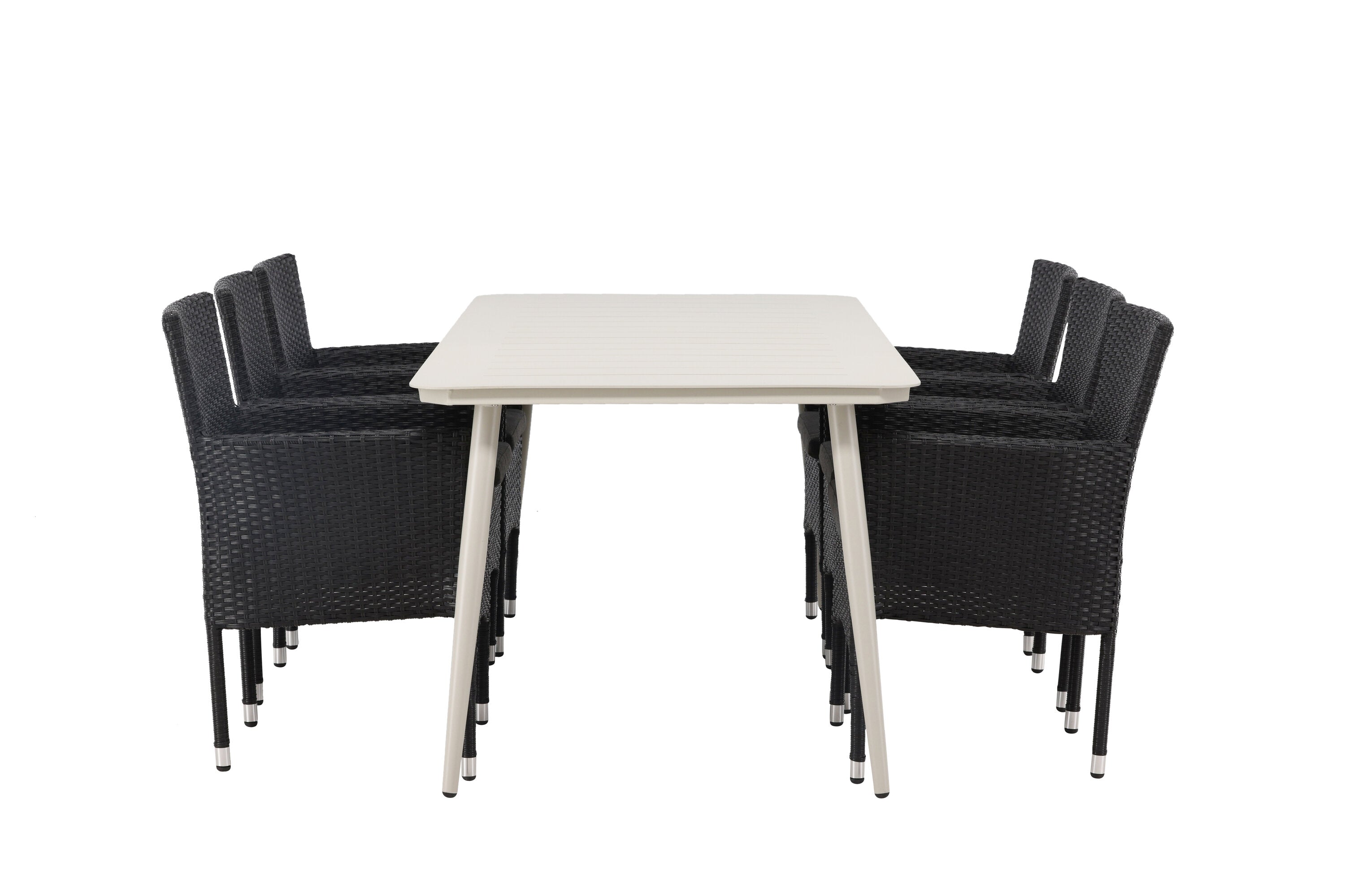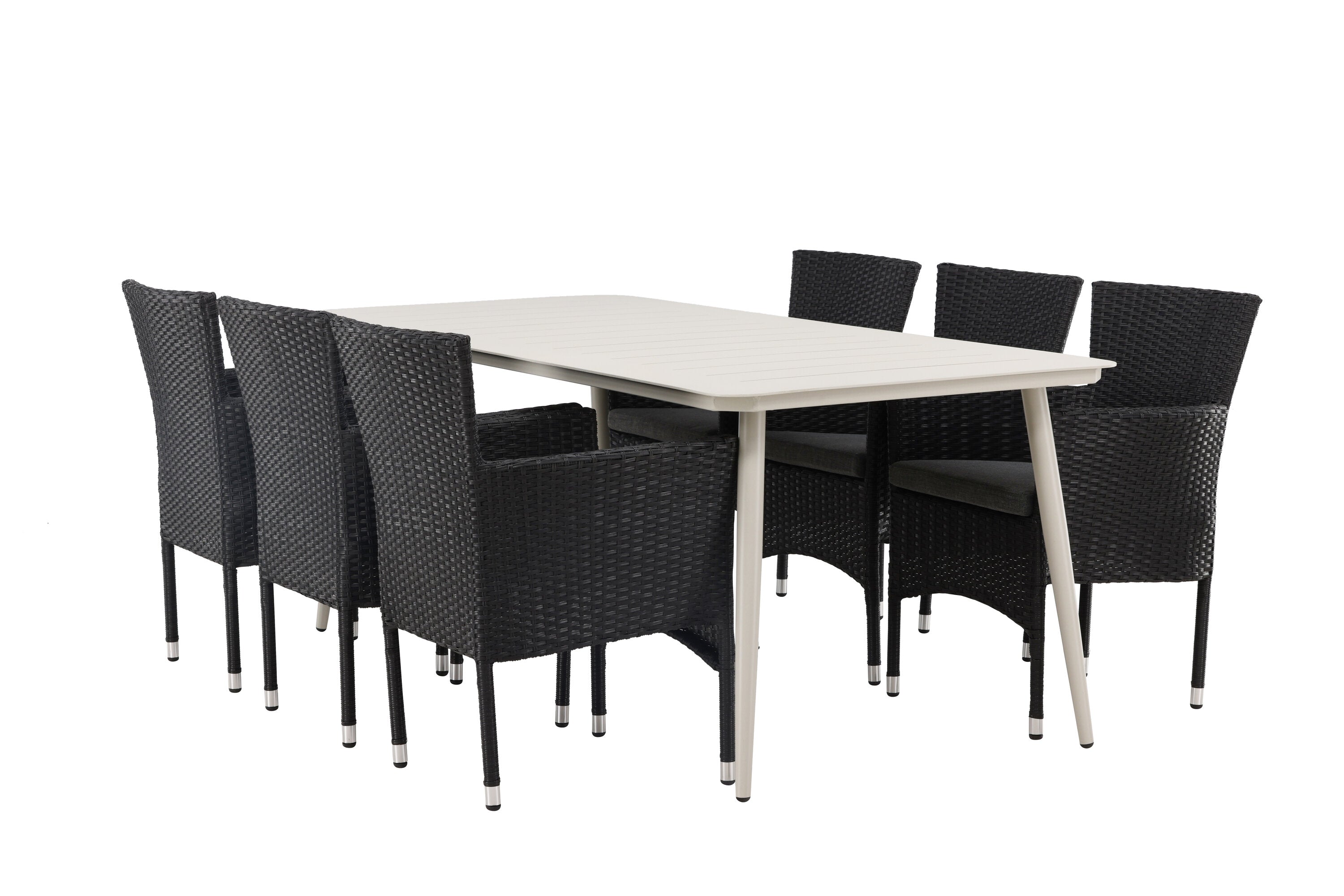 Dokonalá kombinace vysokého komfortu a stylového designu - tato jídelní sestava je vhodná pro všechny příležitosti! Jídelní stůl Lina má obdélníkovou desku v minimalistickém designu a mírně rozšířené nohy, důsledně vyrobené z béžové oceli. Zde ve fantastické kombinaci s jídelními židlemi ze série Malina. Křeslo má hliníkový rám a umělý ratan v sazově černé barvě. Pohodlně se letos v létě usaďte a vychutnejte si lahodná jídla venku! Rozměry stolu: 200 x 90 cm.