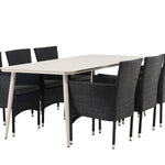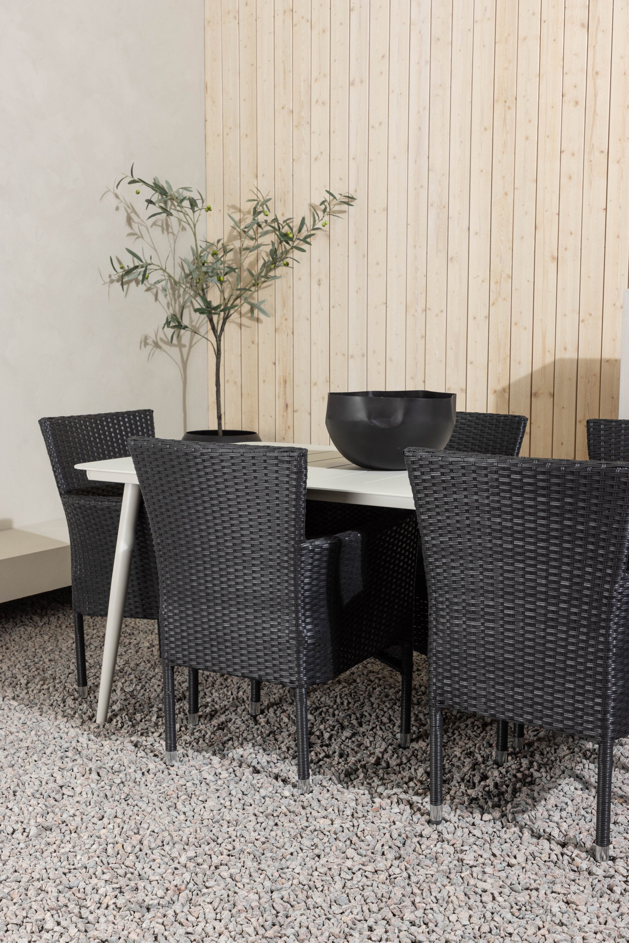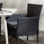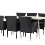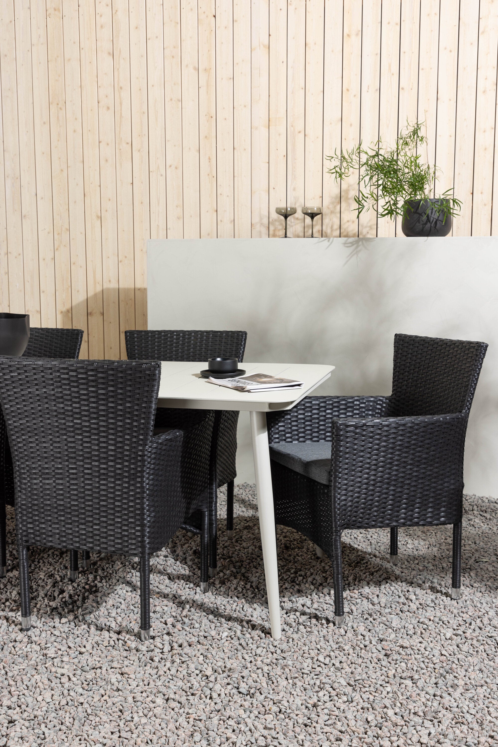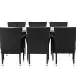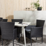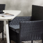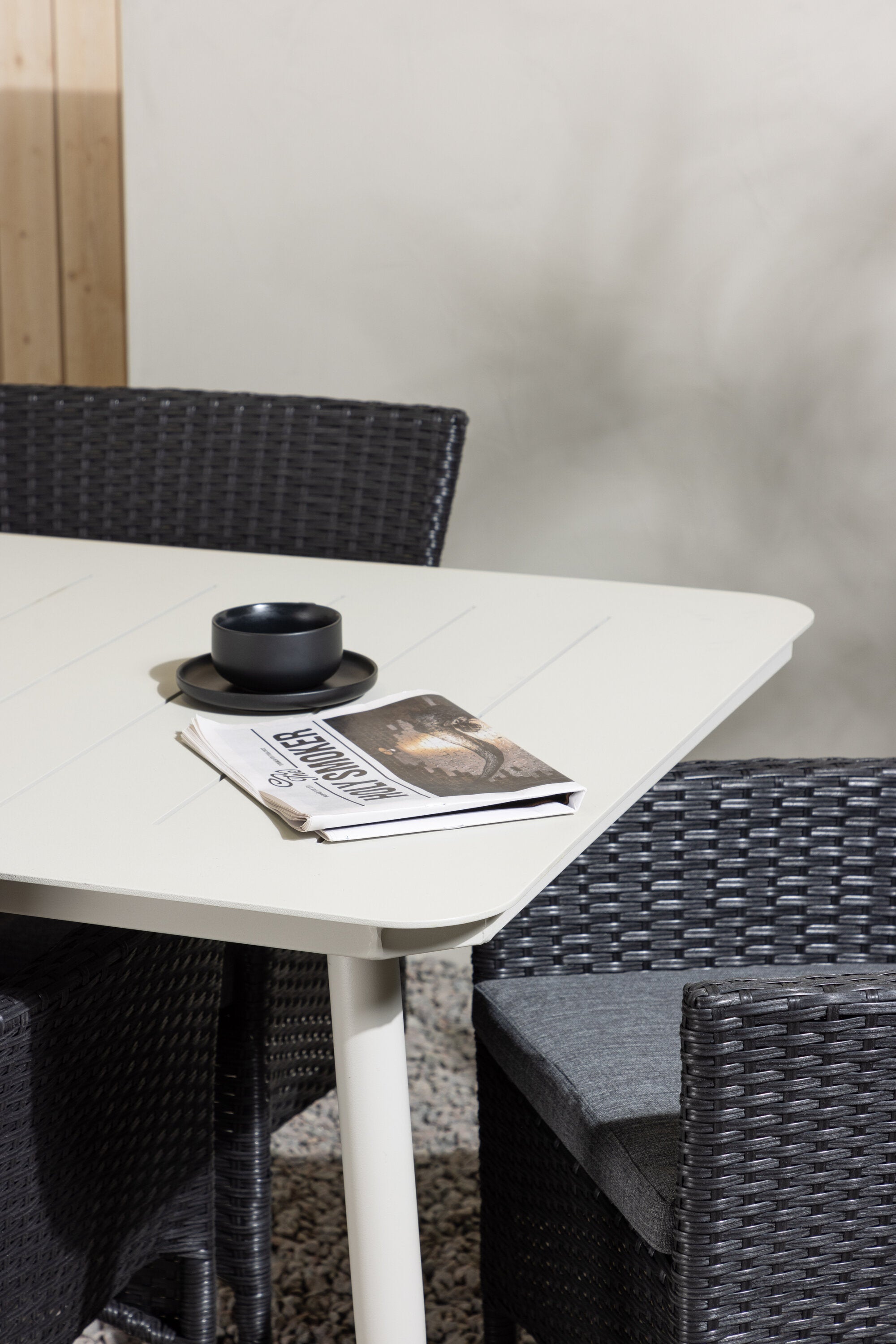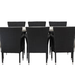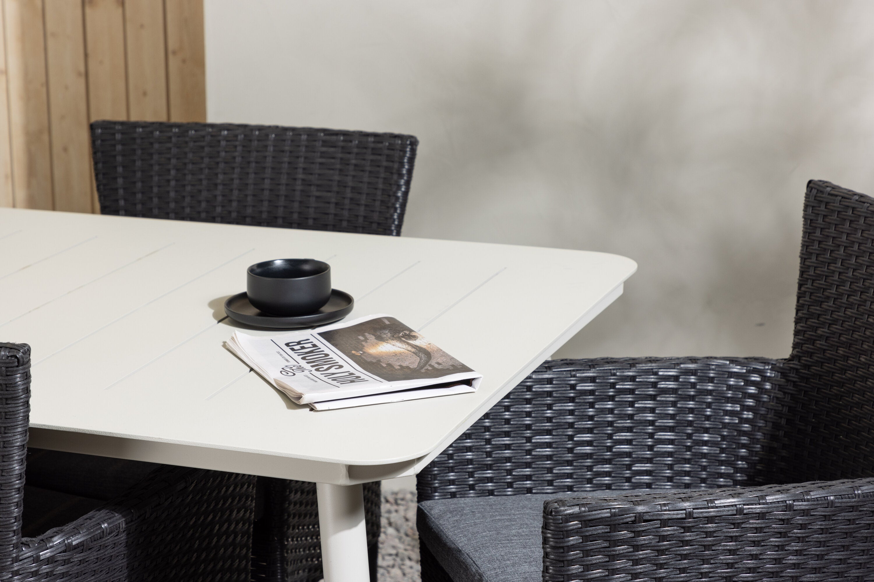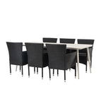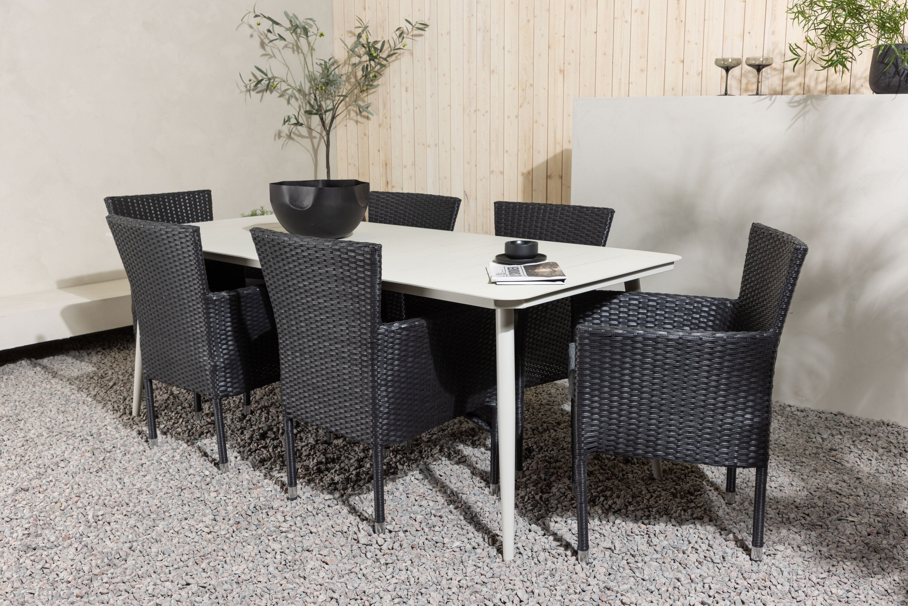 Dokonalá kombinace vysokého komfortu a stylového designu - tato jídelní sestava je vhodná pro všechny příležitosti! Jídelní stůl Lina má obdélníkovou desku v minimalistickém designu a mírně rozšířené nohy, důsledně vyrobené z béžové oceli. Zde ve fantastické kombinaci s jídelními židlemi ze série Malina. Křeslo má hliníkový rám a umělý ratan v sazově černé barvě. Pohodlně se letos v létě usaďte a vychutnejte si lahodná jídla venku! Rozměry stolu: 200 x 90 cm.
