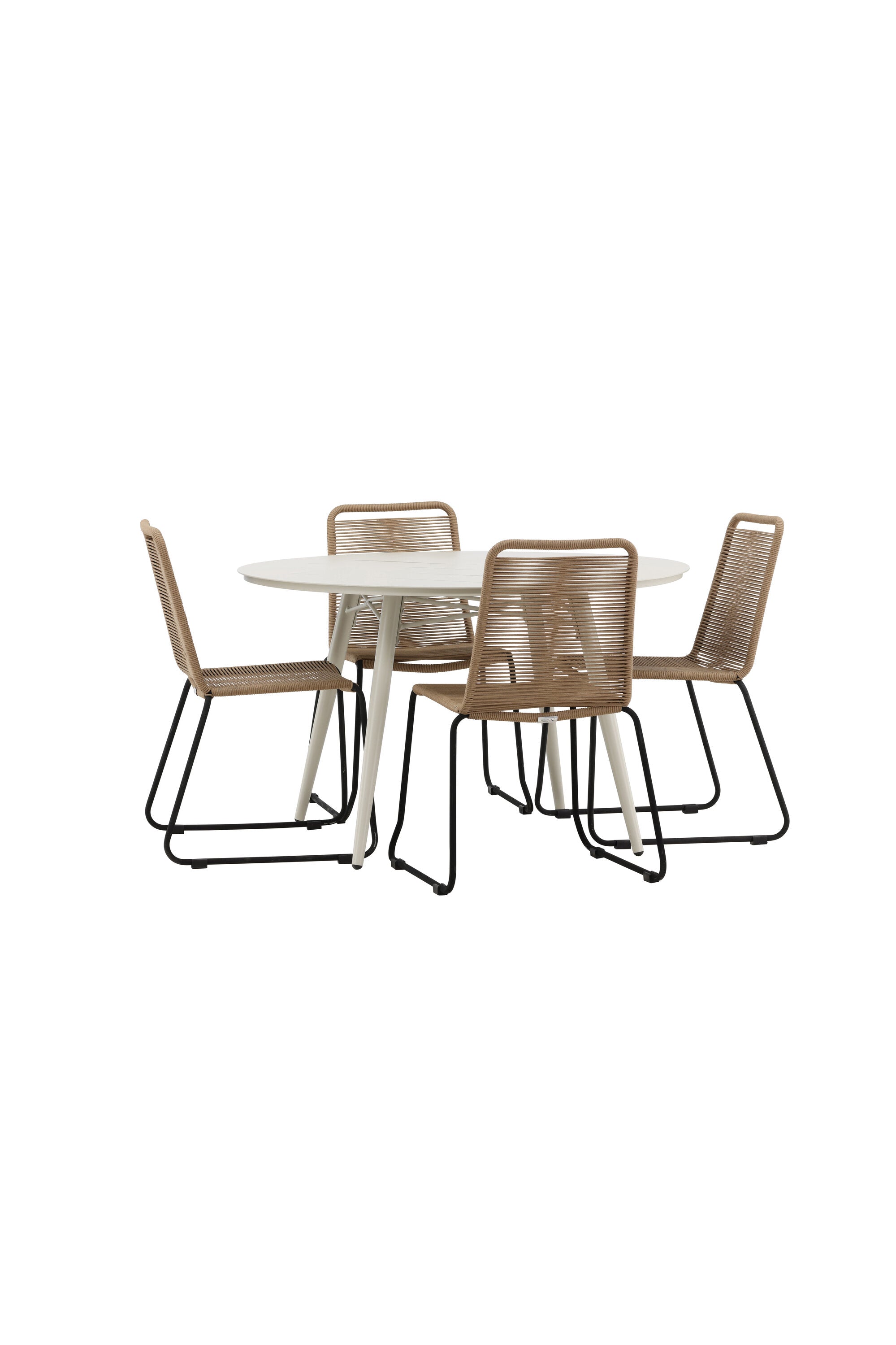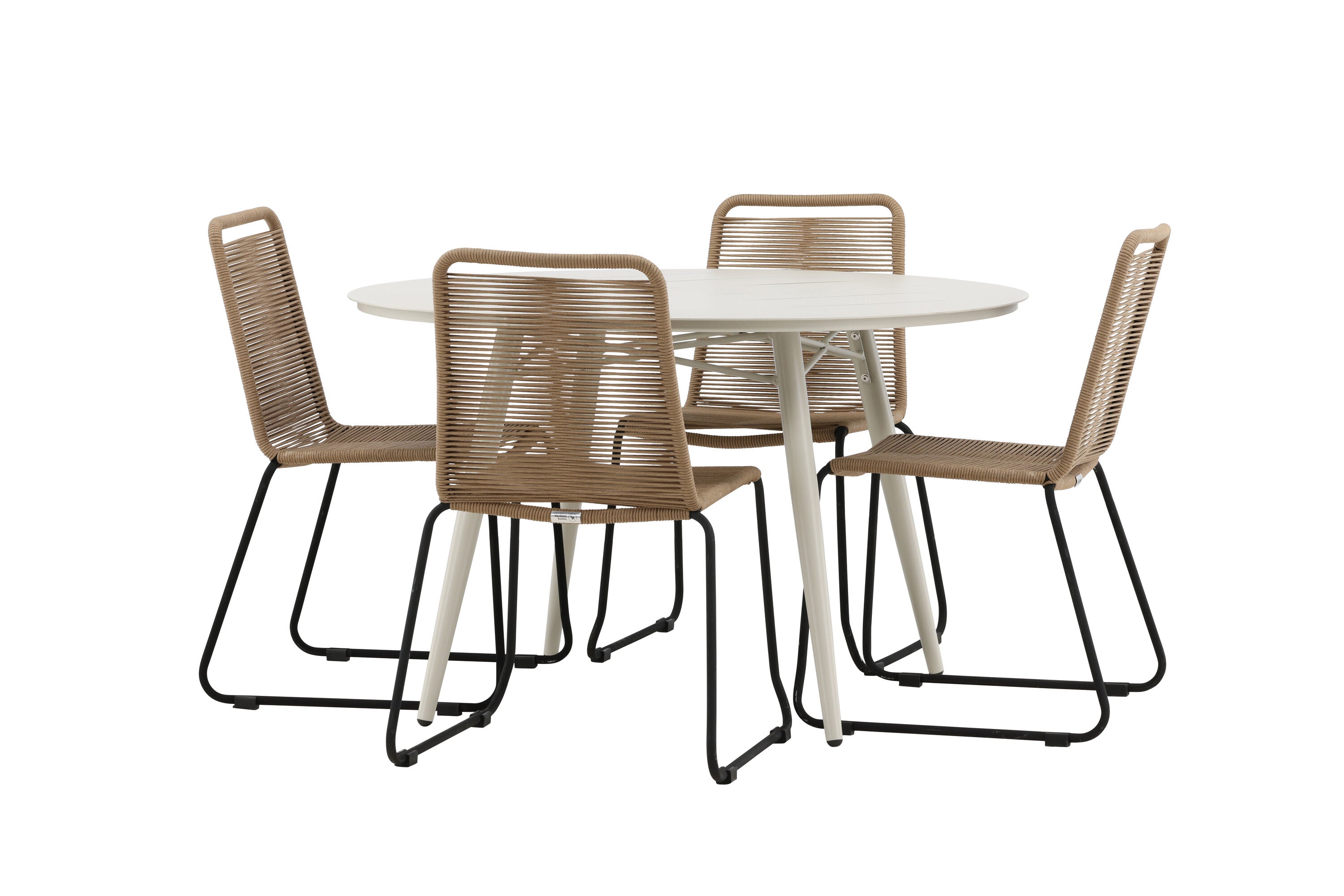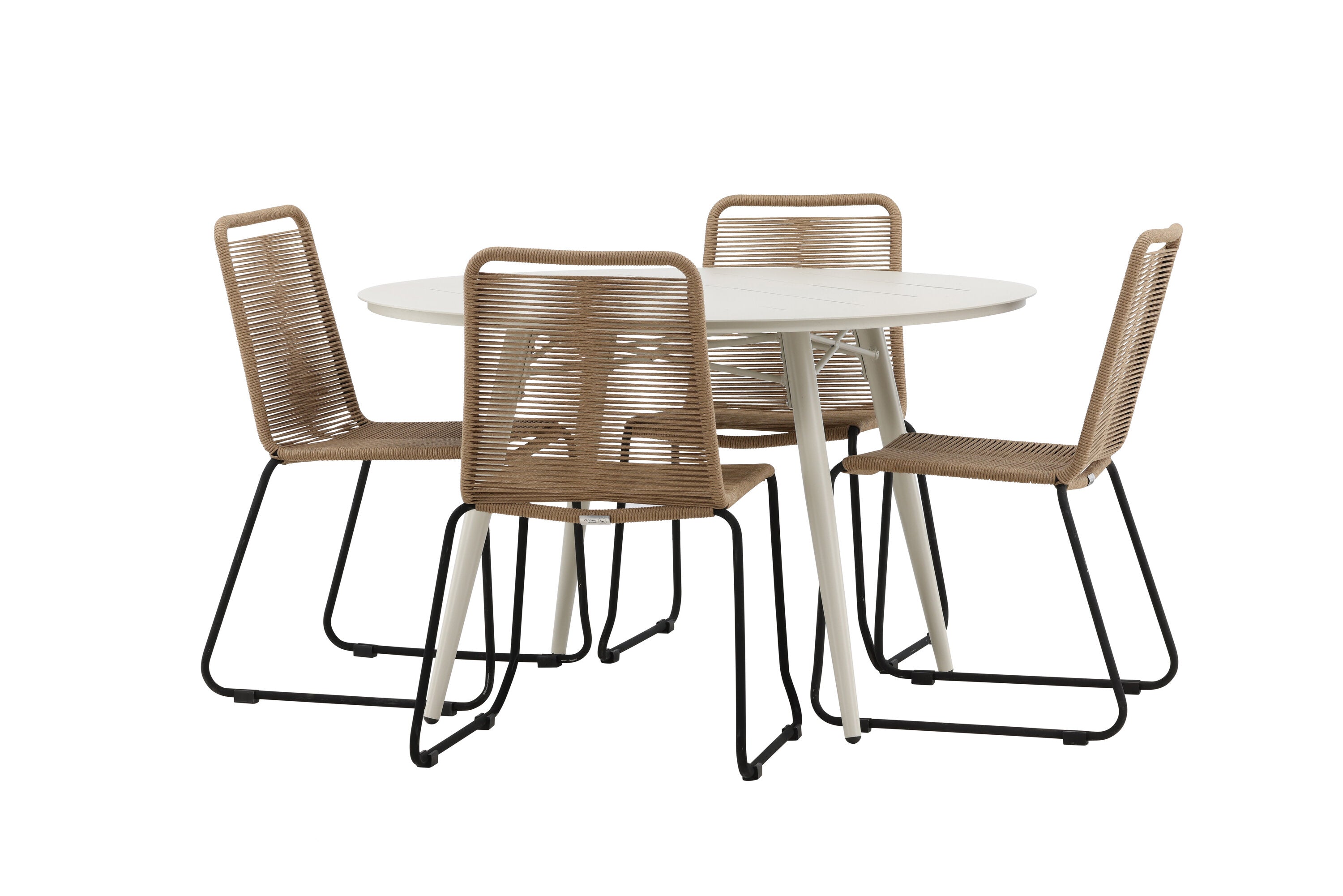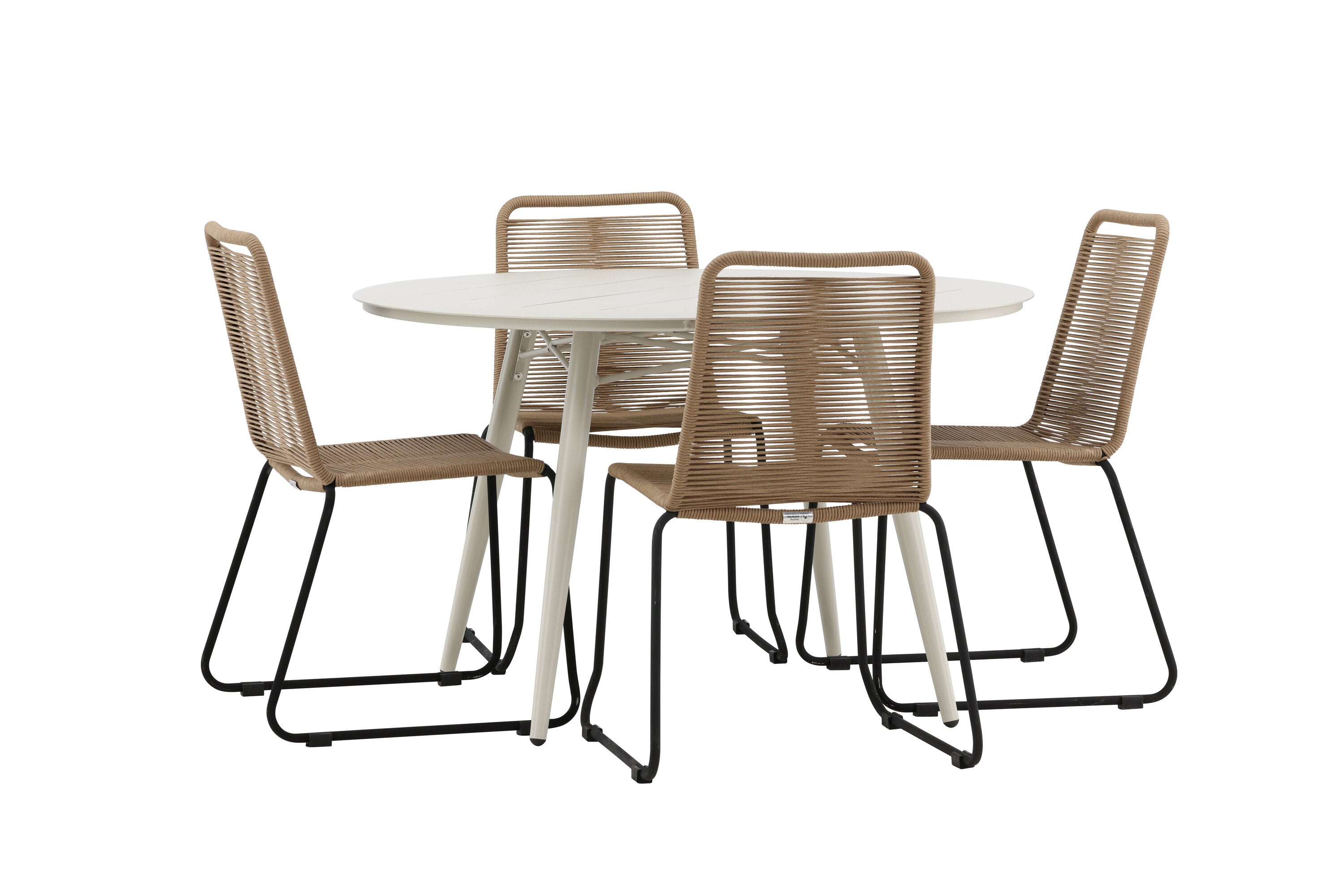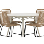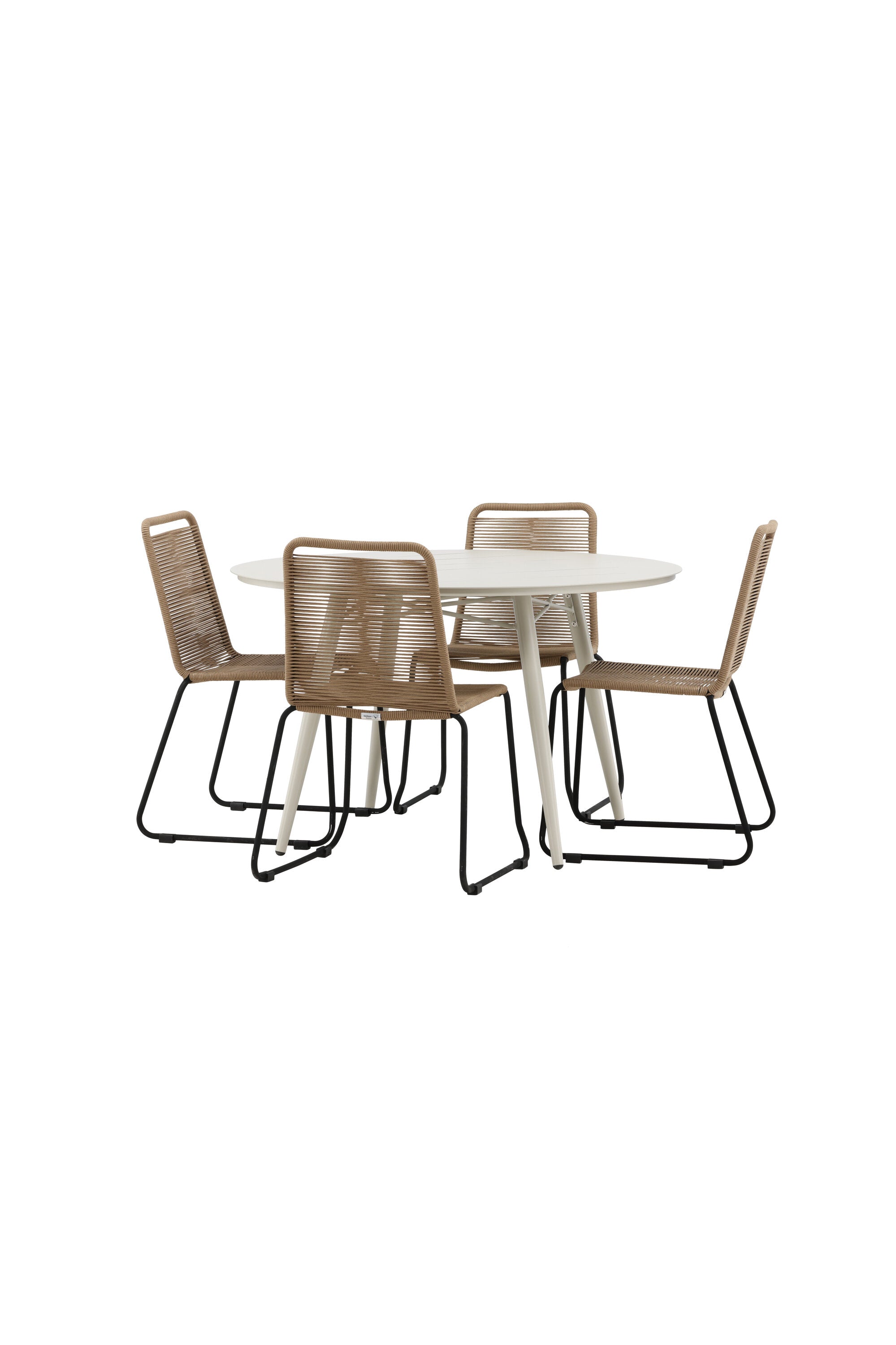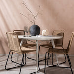 Kulatá jídelní skupina je ideální pro vytvoření příjemné atmosféry - zde nikdo nekončí na okraji! Jídelní stůl Lina má minimalistickou konstrukci z bílé oceli s obdélníkovou deskou stolu a mírně rozšířenými nohami. Zde společně s našimi oblíbenými jídelními židlemi ze série Lindos. Židle je vyrobena z odolných materiálů se sedákem z lana v odstínu zemité béžové a nohami v černém kovu. Zde získáte jídelní skupinu, která je okouzlující a příjemná pro vaše hosty! Průměr stolu: 120 cm.