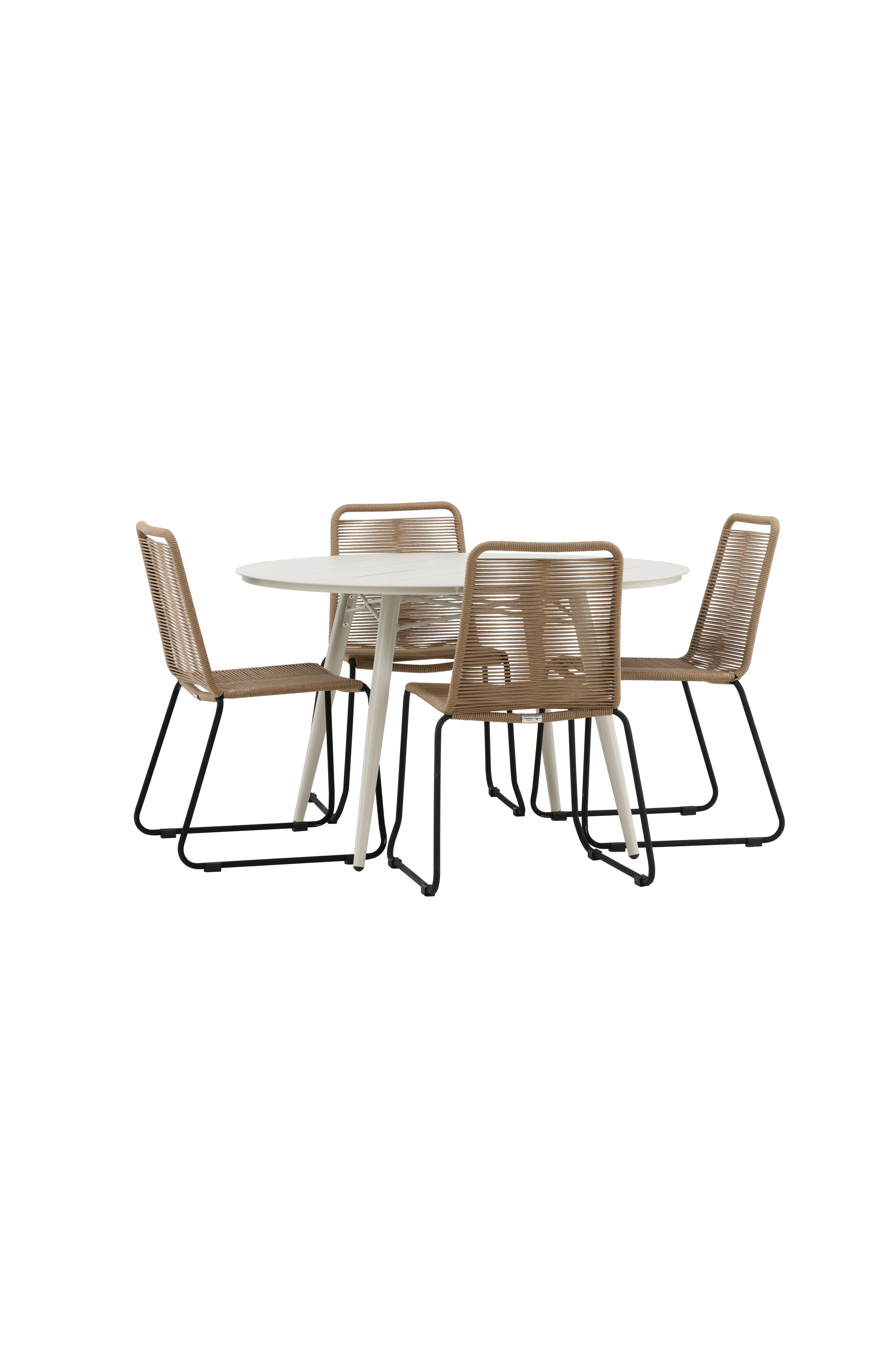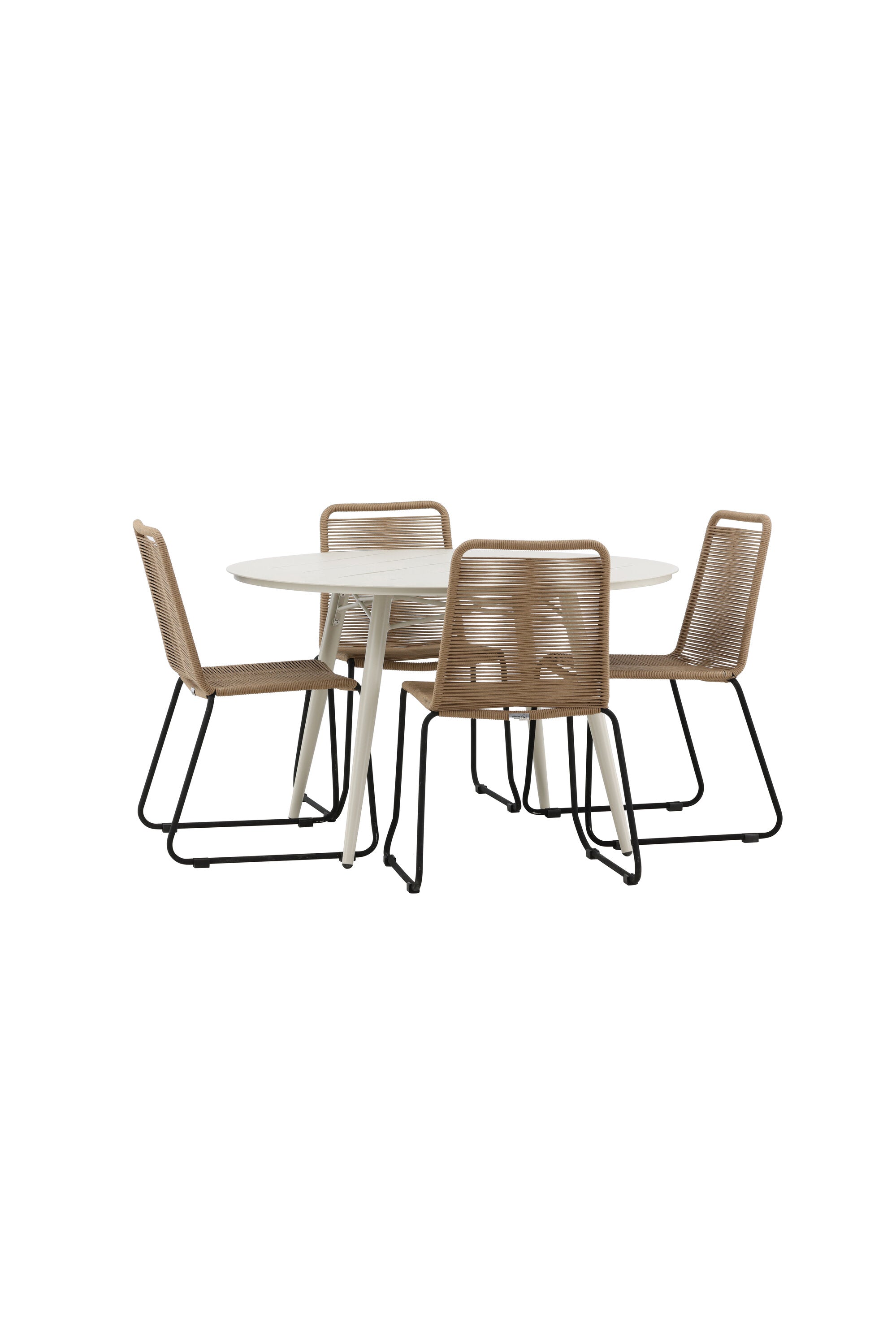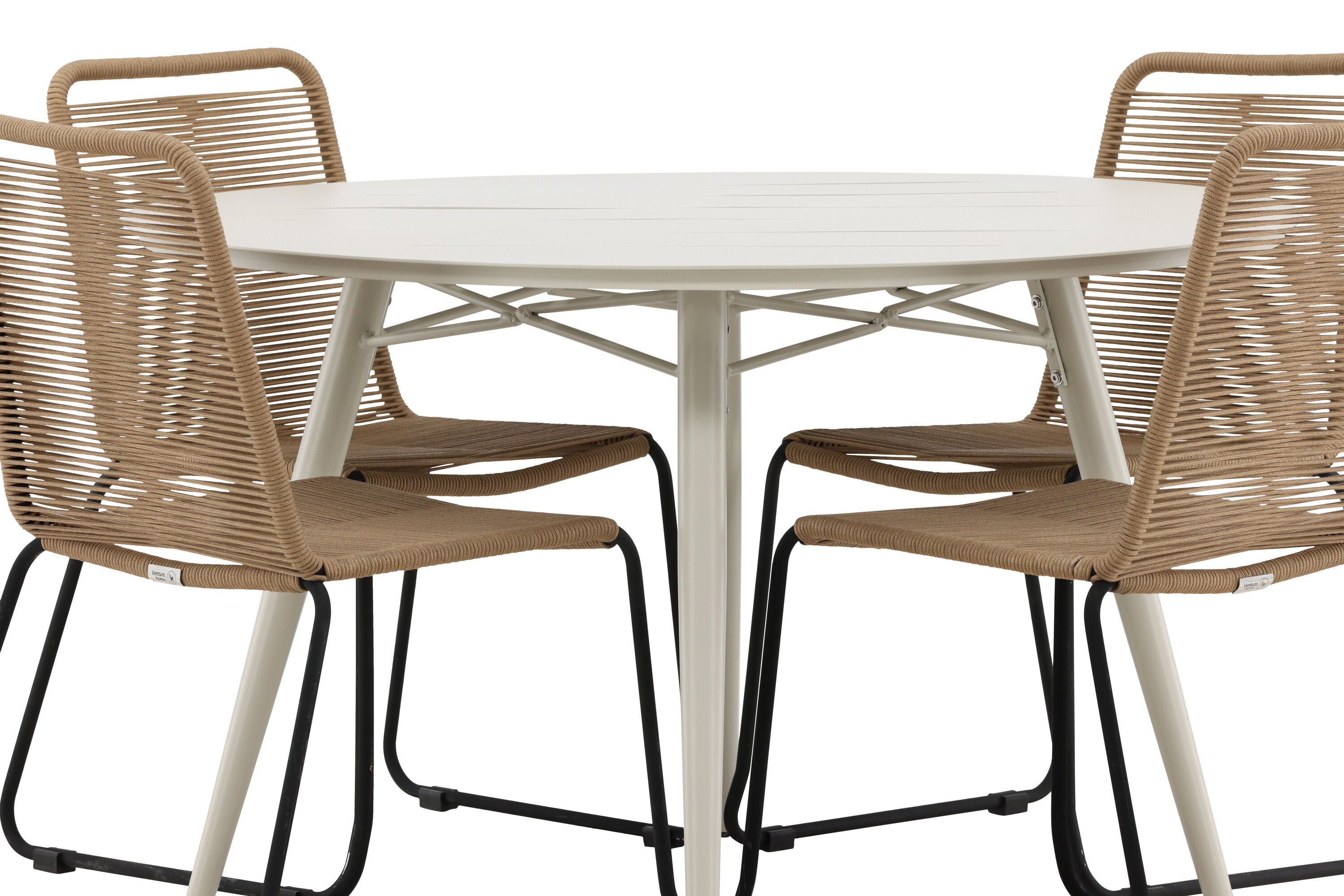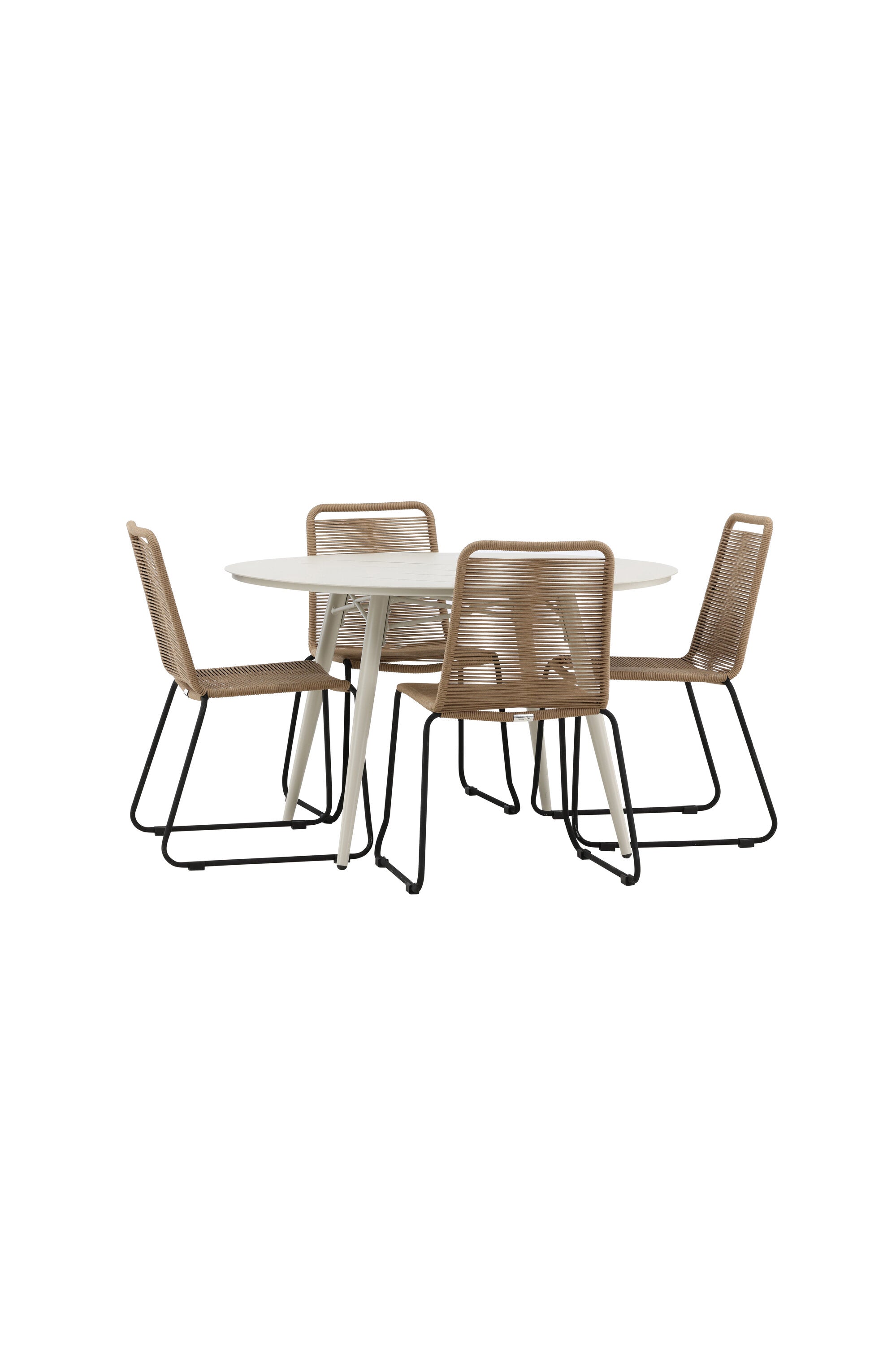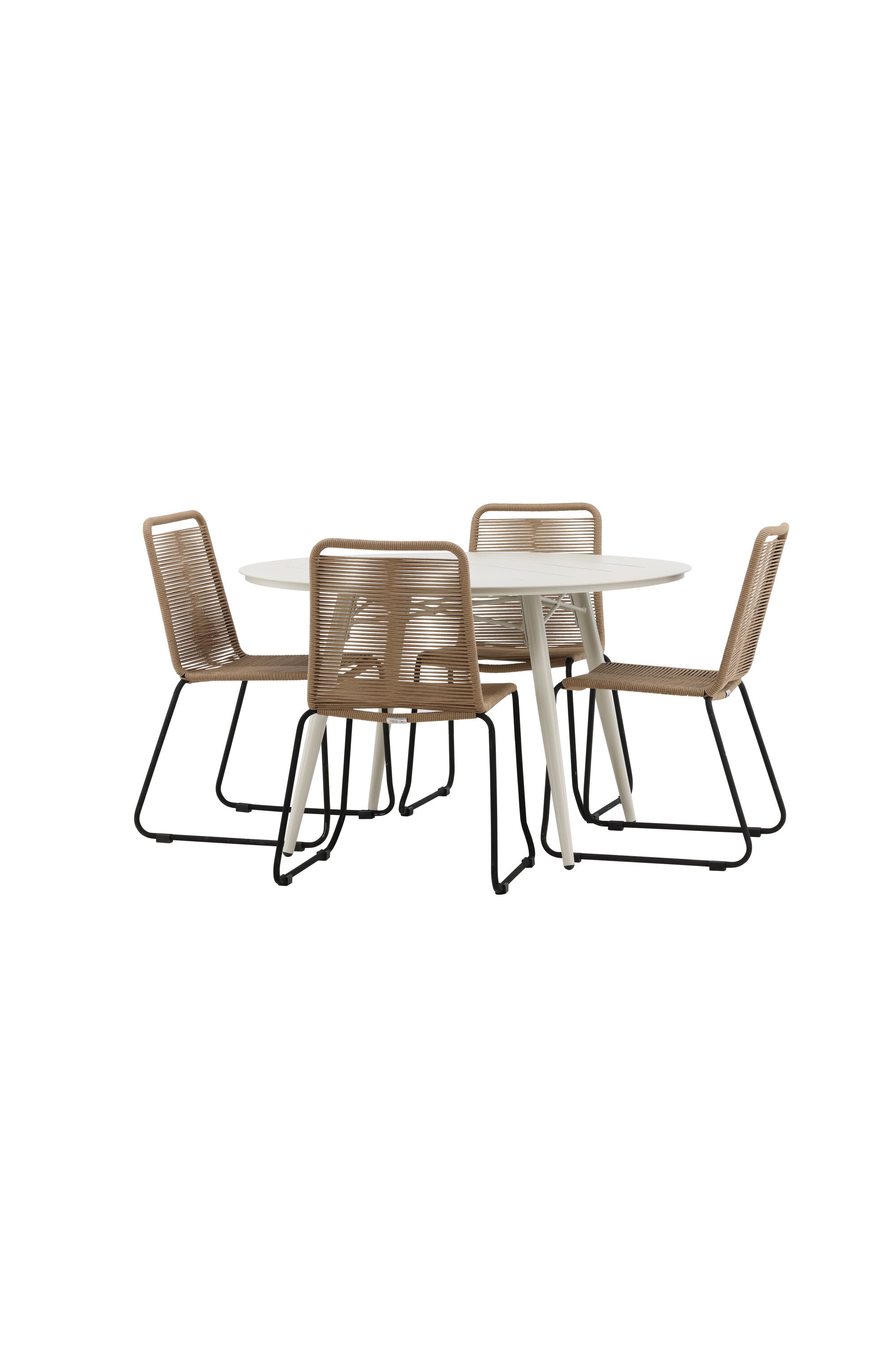 Kulatá jídelní skupina je ideální pro vytvoření příjemné atmosféry - zde nikdo nekončí na okraji! Jídelní stůl Lina má minimalistickou konstrukci z bílé oceli s obdélníkovou deskou stolu a mírně rozšířenými nohami. Zde společně s našimi oblíbenými jídelními židlemi ze série Lindos. Židle je vyrobena z odolných materiálů se sedákem z lana v odstínu zemité béžové a nohami v černém kovu. Zde získáte jídelní skupinu, která je okouzlující a příjemná pro vaše hosty! Průměr stolu: 120 cm.
