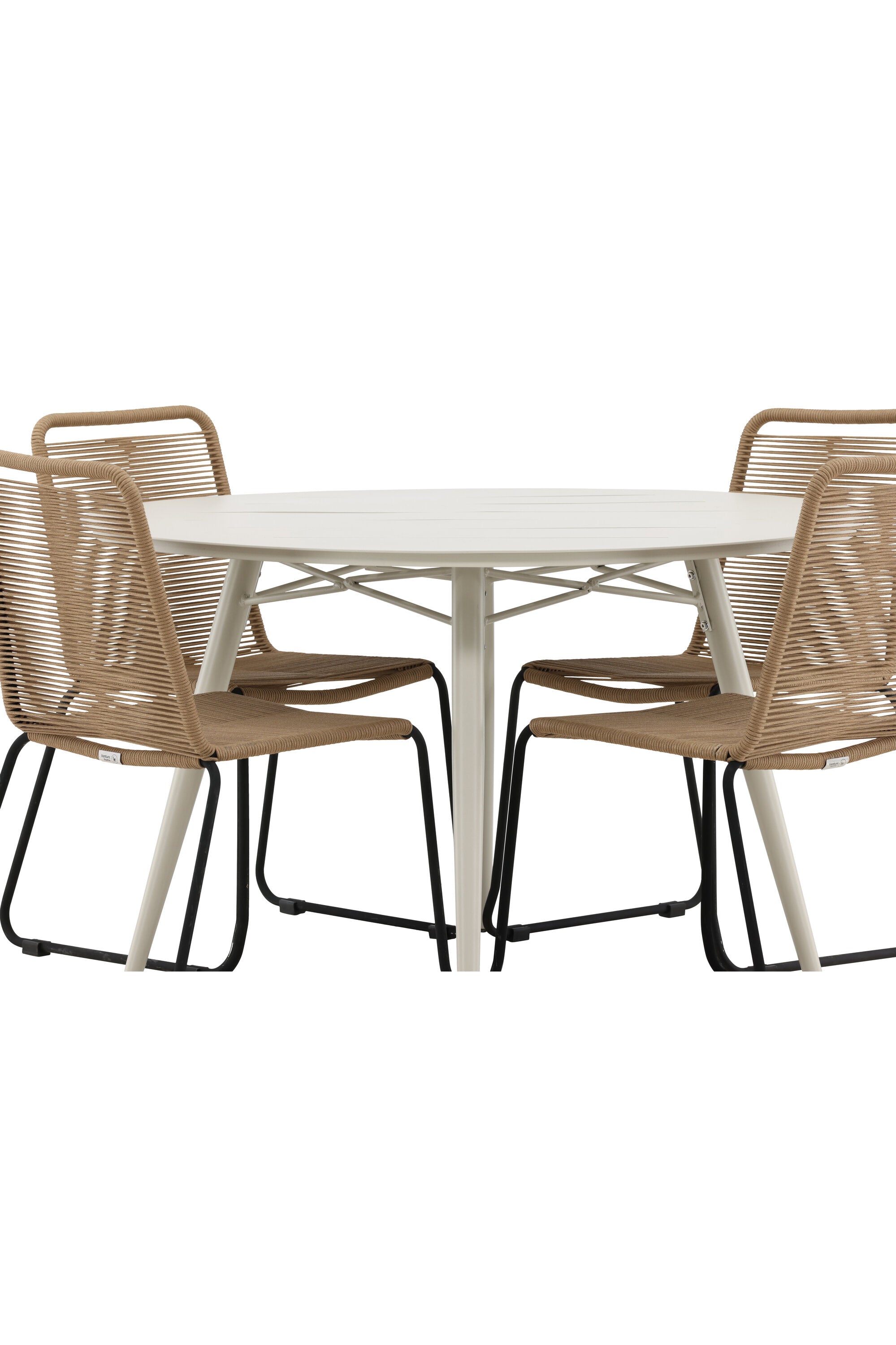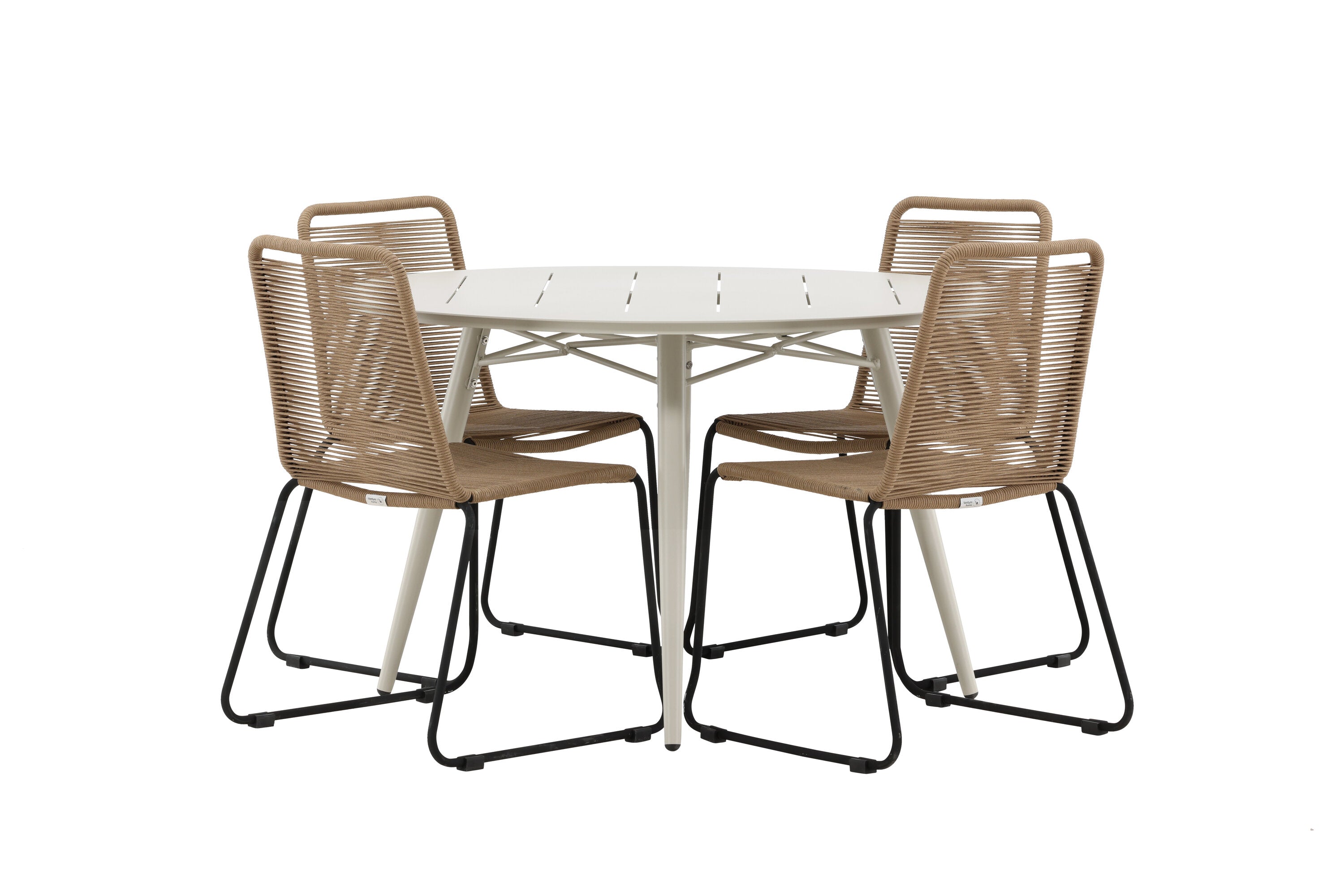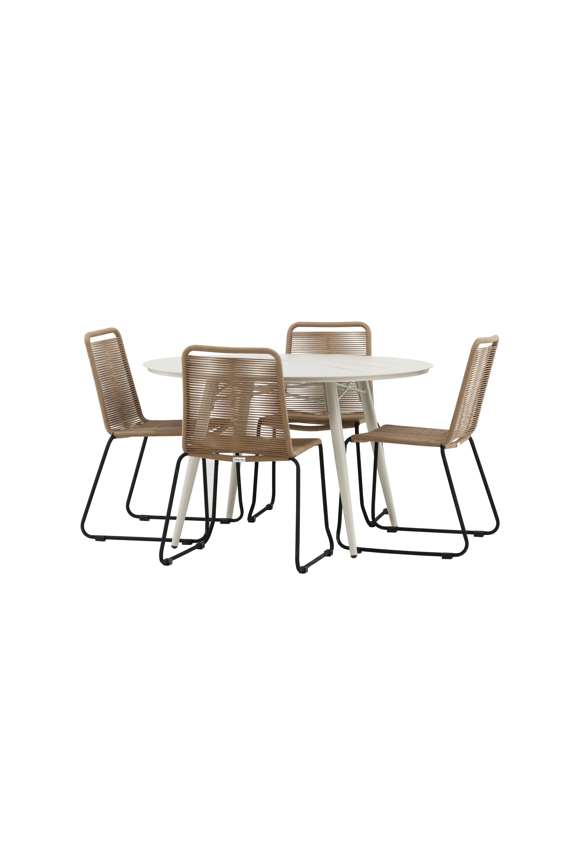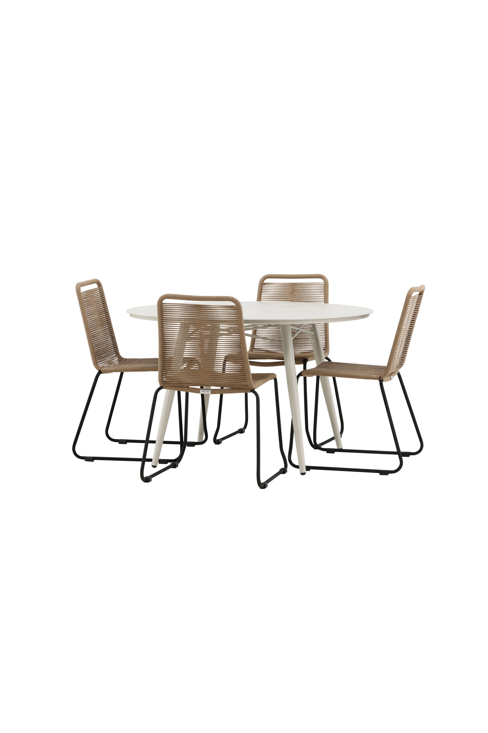 Kulatá jídelní skupina je ideální pro vytvoření příjemné atmosféry - zde nikdo nekončí na okraji! Jídelní stůl Lina má minimalistickou konstrukci z bílé oceli s obdélníkovou deskou stolu a mírně rozšířenými nohami. Zde společně s našimi oblíbenými jídelními židlemi ze série Lindos. Židle je vyrobena z odolných materiálů se sedákem z lana v odstínu zemité béžové a nohami v černém kovu. Zde získáte jídelní skupinu, která je okouzlující a příjemná pro vaše hosty! Průměr stolu: 120 cm.