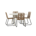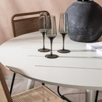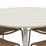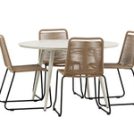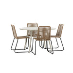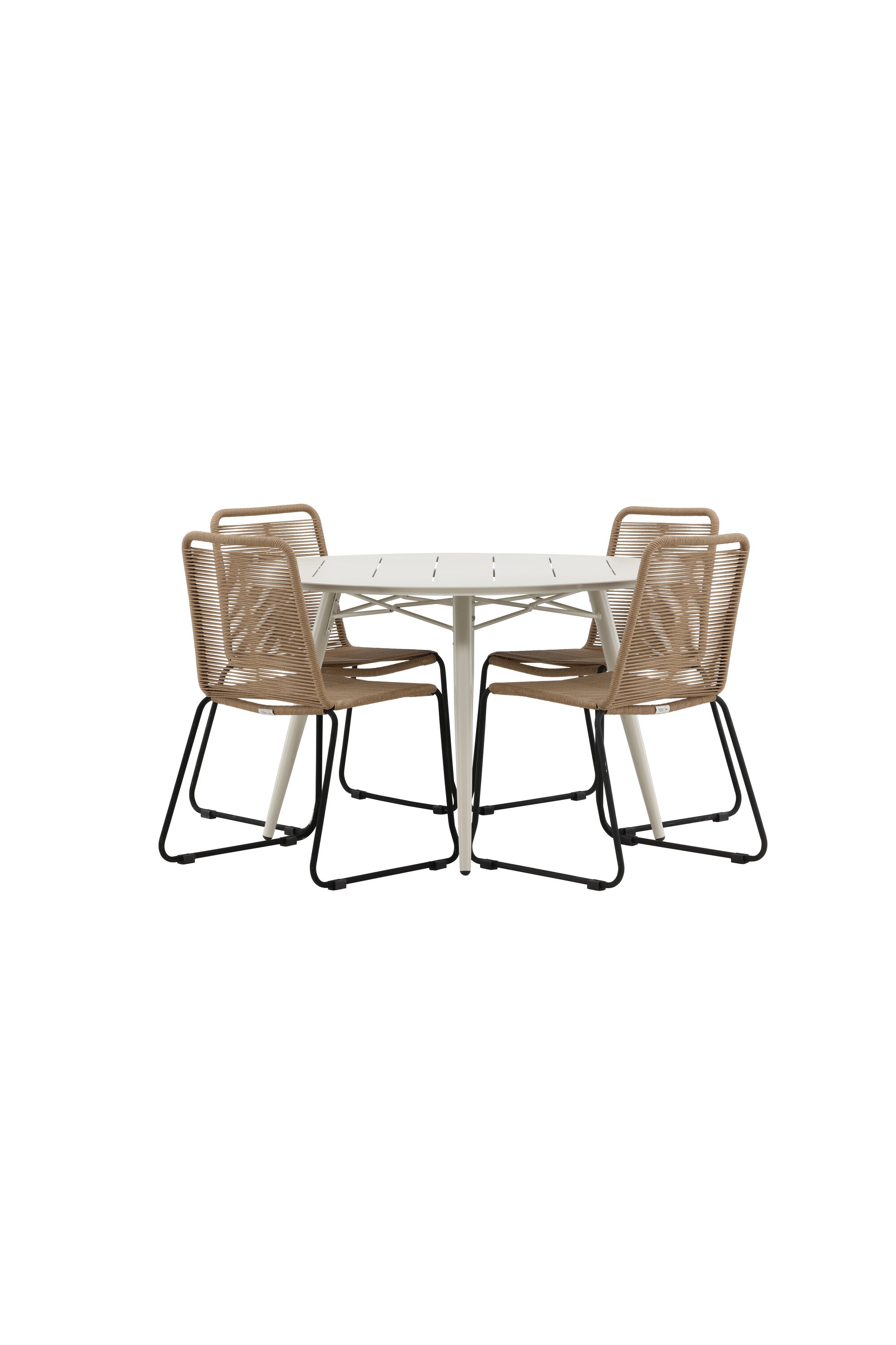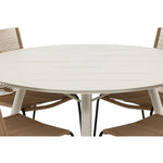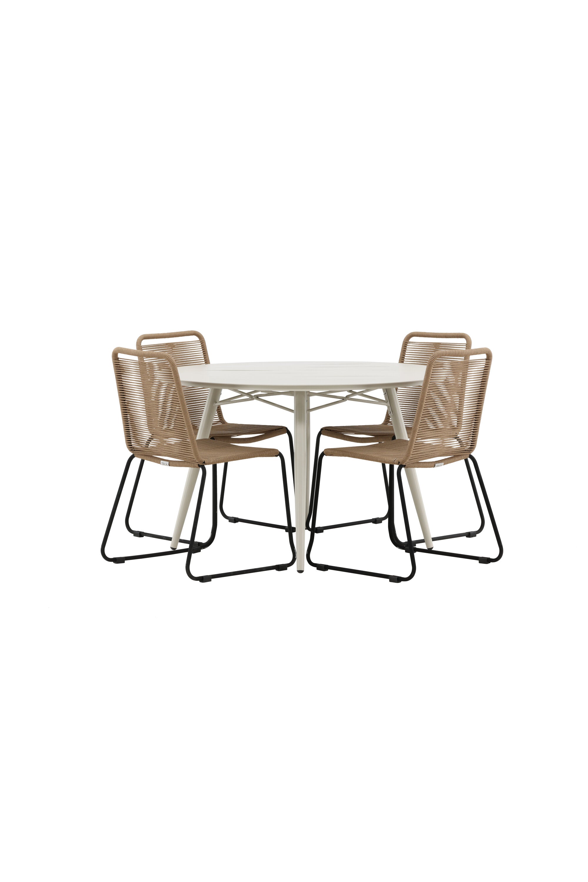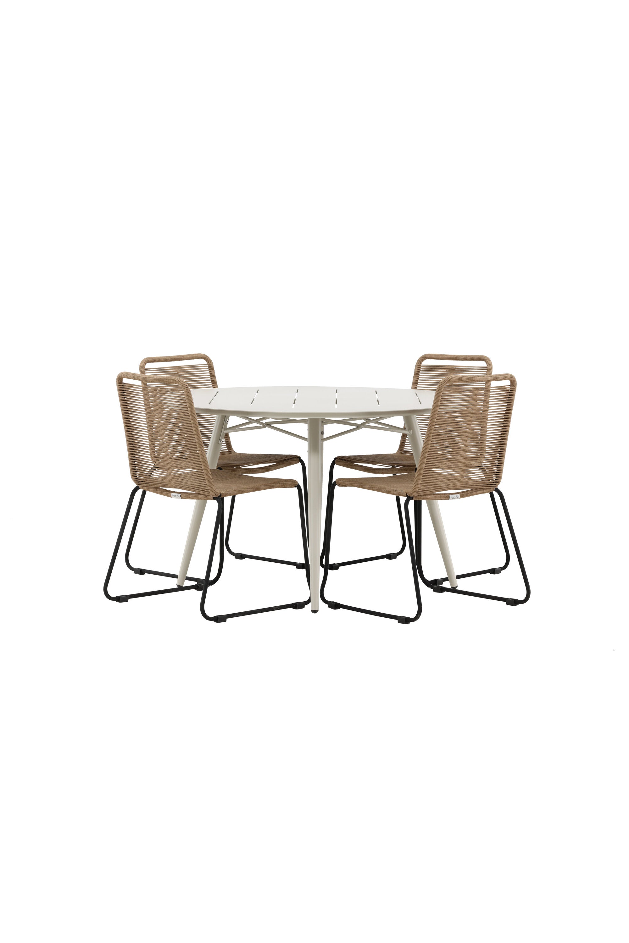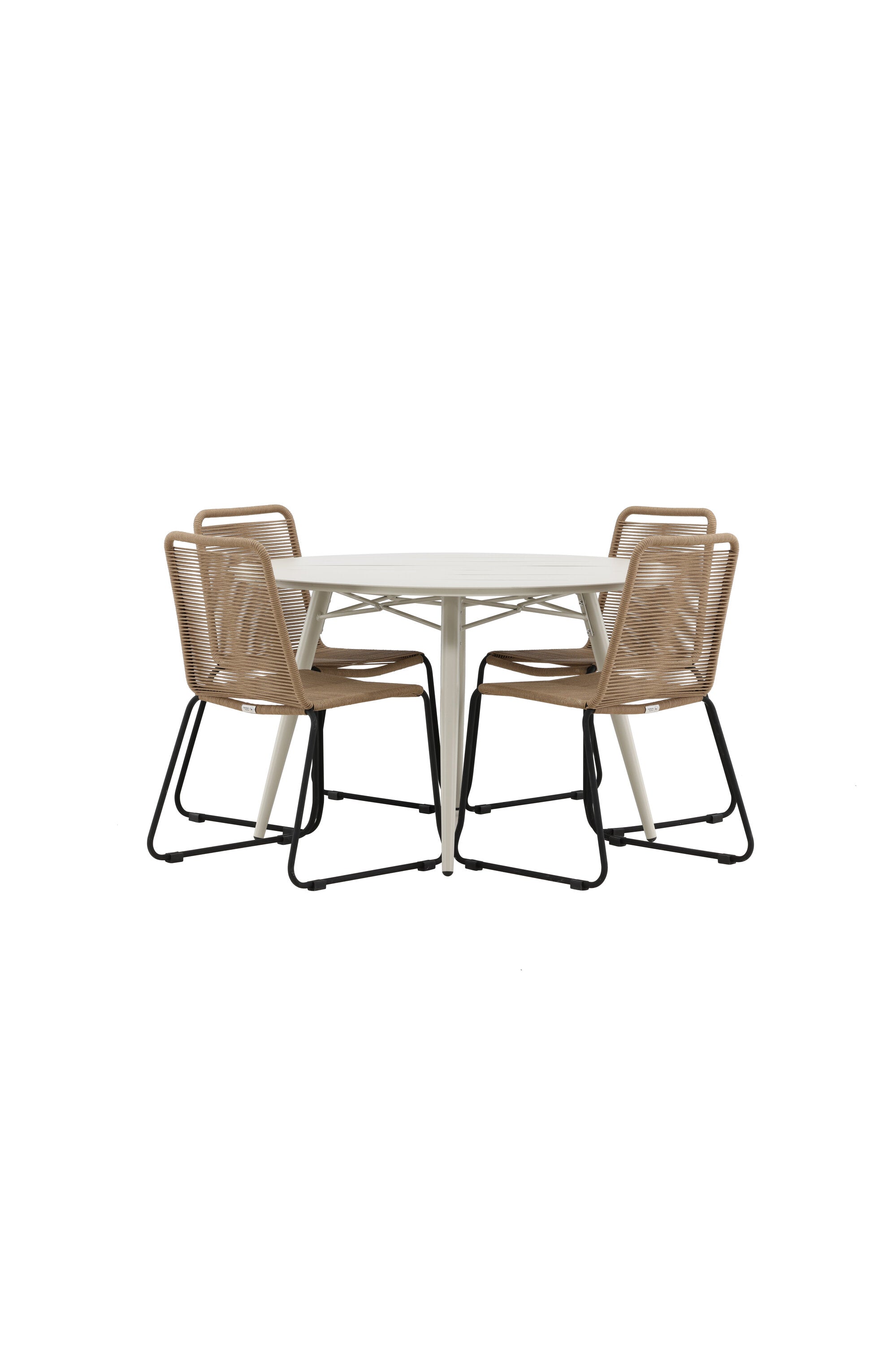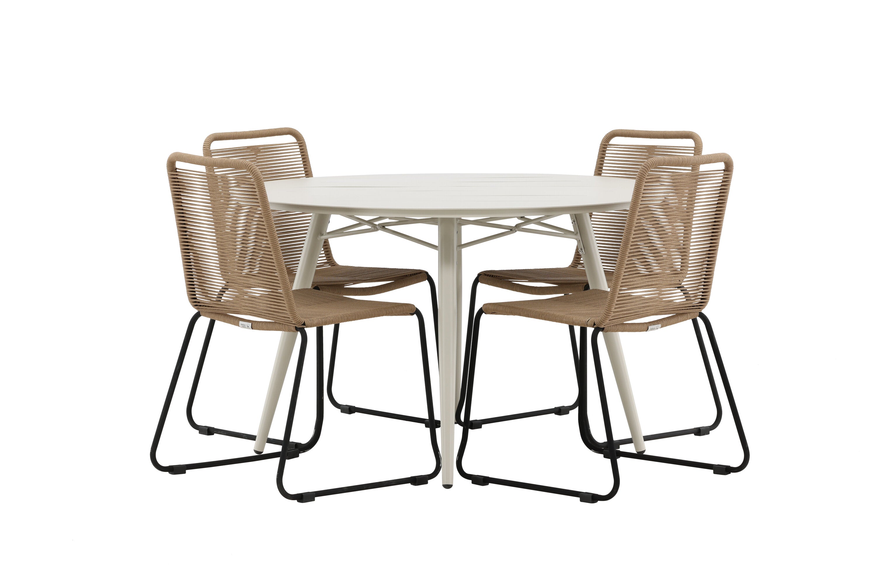 Kulatá jídelní skupina je ideální pro vytvoření příjemné atmosféry - zde nikdo nekončí na okraji! Jídelní stůl Lina má minimalistickou konstrukci z bílé oceli s obdélníkovou deskou stolu a mírně rozšířenými nohami. Zde společně s našimi oblíbenými jídelními židlemi ze série Lindos. Židle je vyrobena z odolných materiálů se sedákem z lana v odstínu zemité béžové a nohami v černém kovu. Zde získáte jídelní skupinu, která je okouzlující a příjemná pro vaše hosty! Průměr stolu: 120 cm.