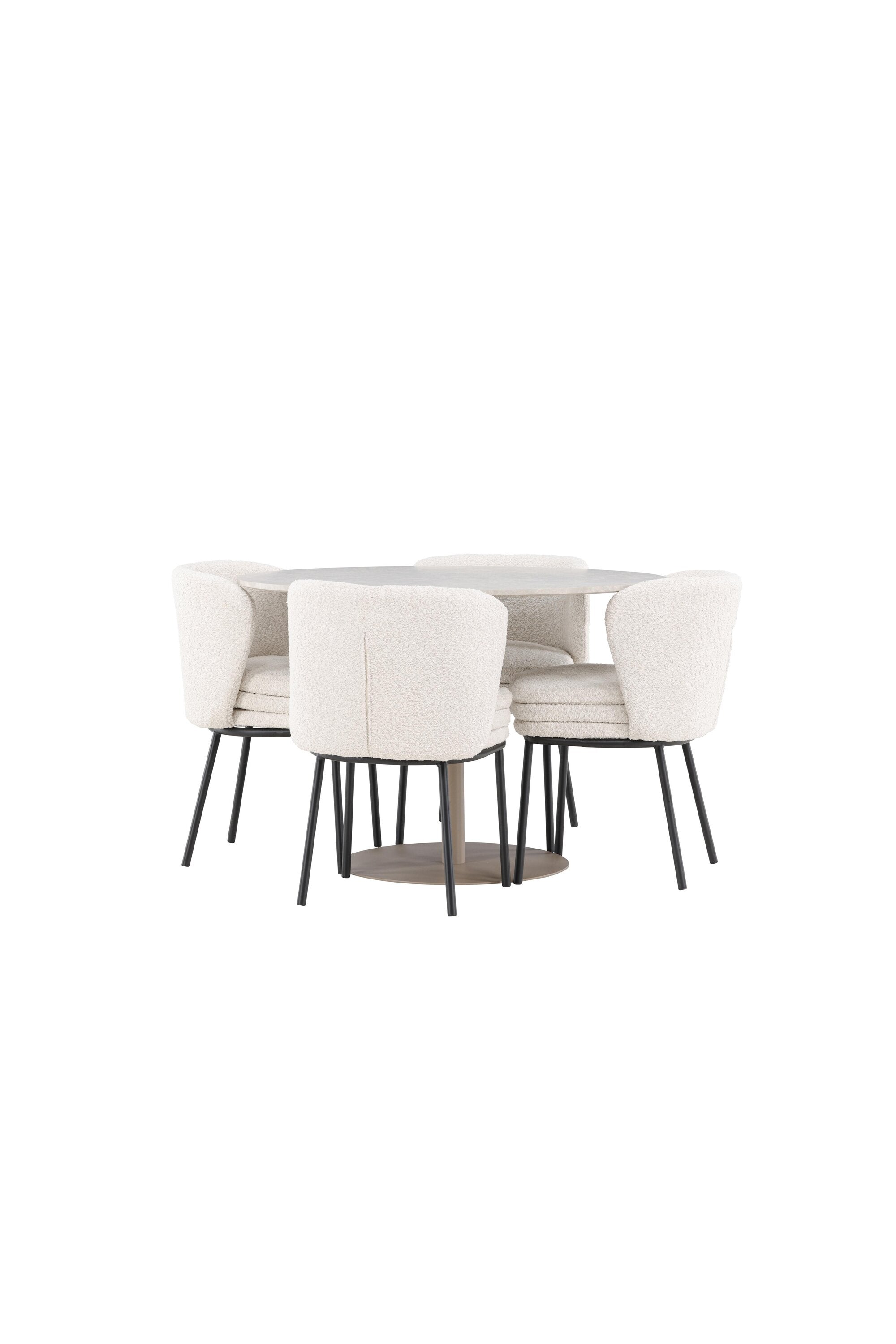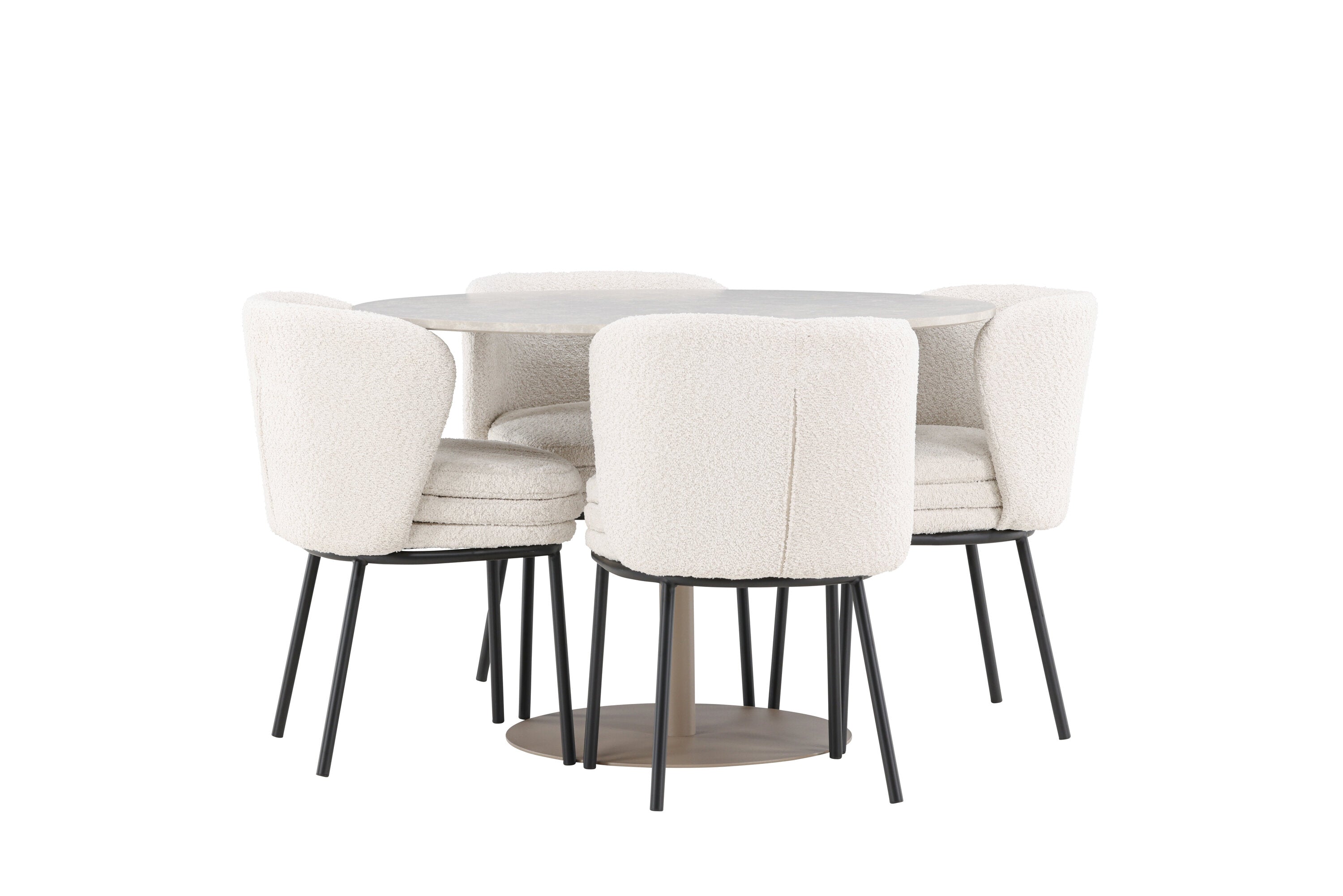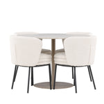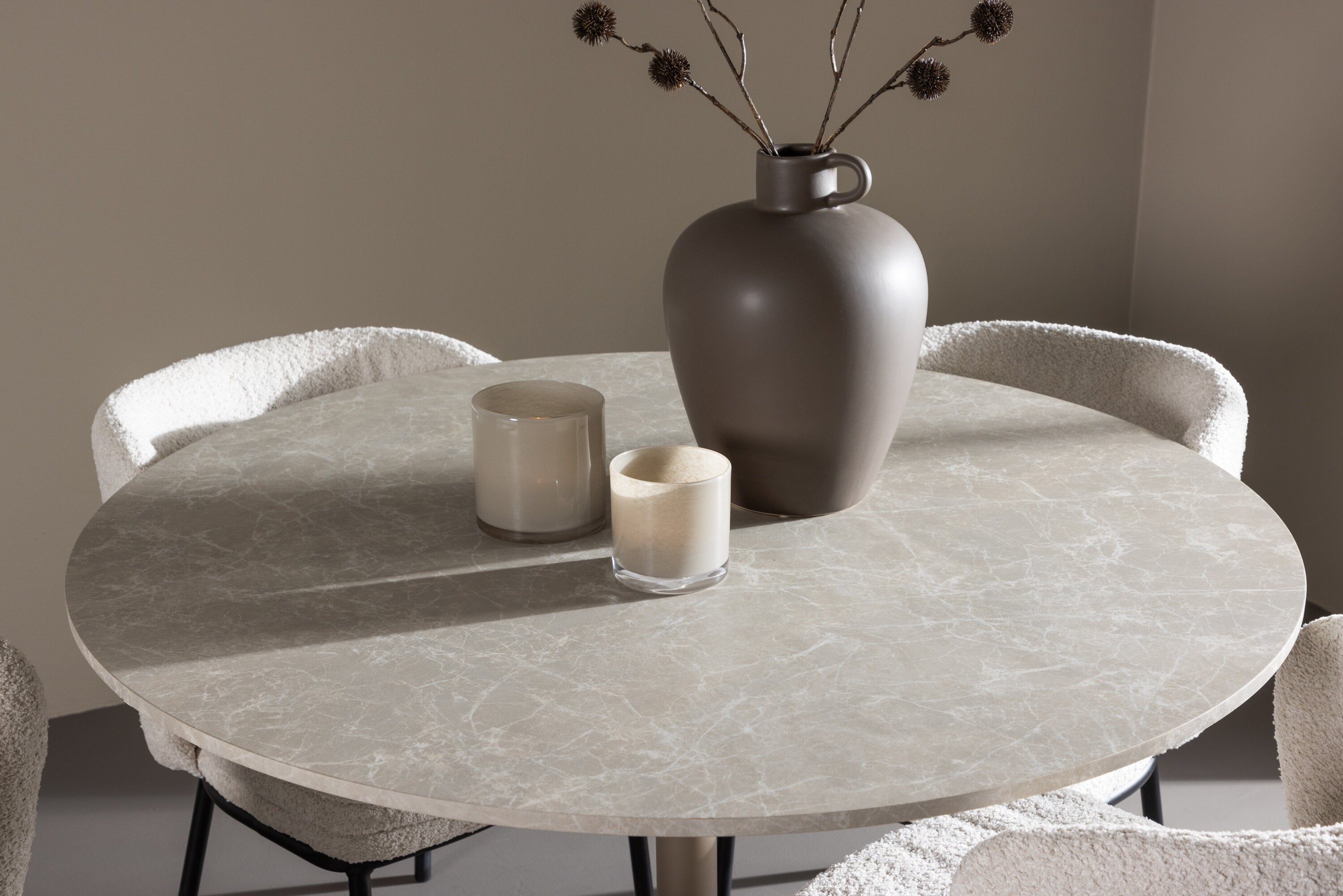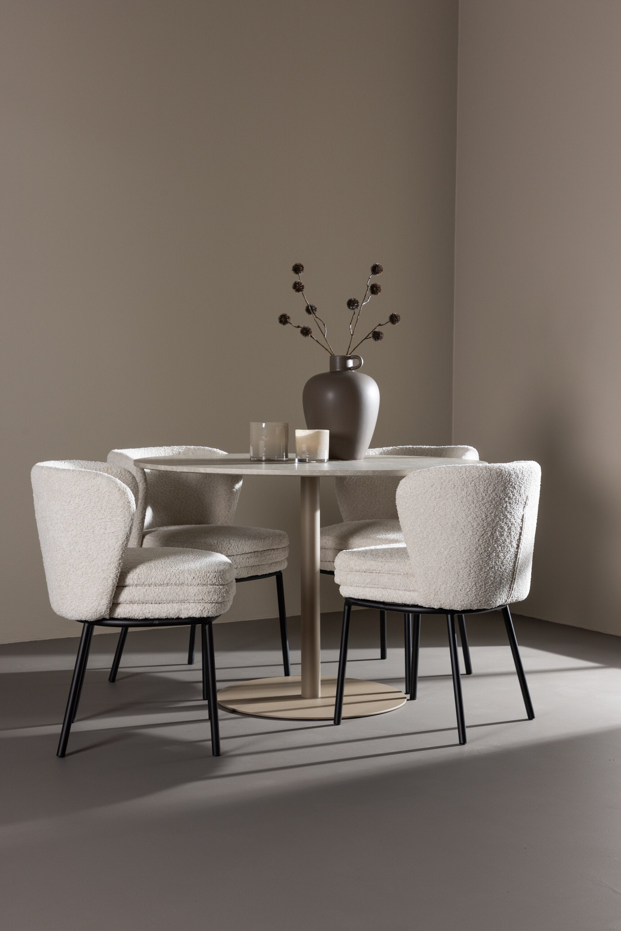 Vytvořte sofistikované a příjemné jídelní prostředí s jídelním setem, který se skládá ze stolu Lycke a židlí Agnes. Tato jídelní souprava spojuje moderní eleganci s vysokým komfortem a je tak dokonalým doplňkem vašeho domova. Stůl Lycke je se svou sofistikovanou béžovou barvou a MDF konstrukcí krásným středobodem. Stůl s průměrem 110 cm nabízí dostatek prostoru pro stolování a posezení a jeho harmonický design dodá vaší jídelně elegantní a klidnou atmosféru. Odolný povrch se snadno čistí a udržuje a zajišťuje tak dlouhotrvající krásu a funkčnost stolu. Čtyři doprovodné židle Agnes skvěle doplňují stůl. Tyto židle jsou čalouněny měkkým bílým buklem, který poskytuje luxusní a pohodlné sezení. Tkanina Boucle je známá svou texturou a měkkostí, což vám a vašim hostům umožňuje pohodlně sedět při dlouhých večeřích a rozhovorech. Bílá barva židlí vytváří krásný kontrast k béžovému stolu a dodává vaší jídelně moderní a sofistikovaný nádech. Jídelní set Lycke se židlemi Agnes je perfektní volbou pro ty, kteří chtějí vytvořit elegantní a funkční jídelní prostředí. Kombinace nadčasového designu a vysokého komfortu dělá z každého jídla příjemný zážitek. Vítejte na nové úrovni stylu a pohodlí u vás doma s Lycke a Agnes!