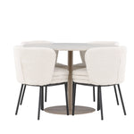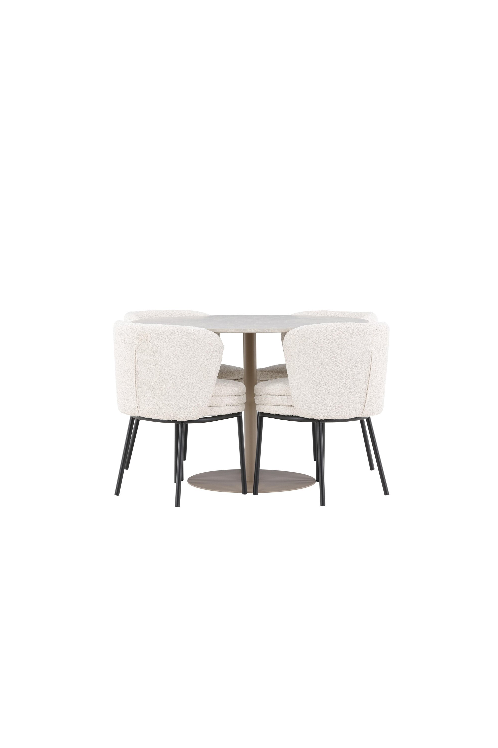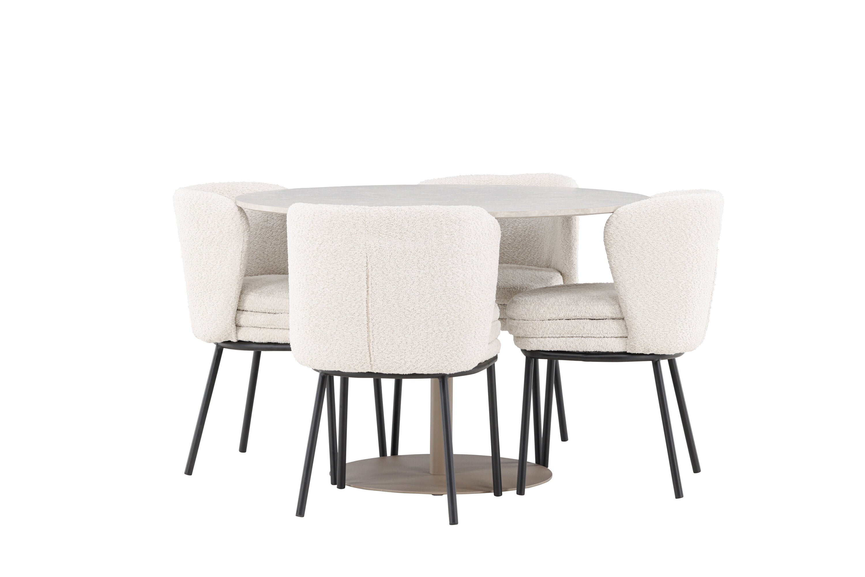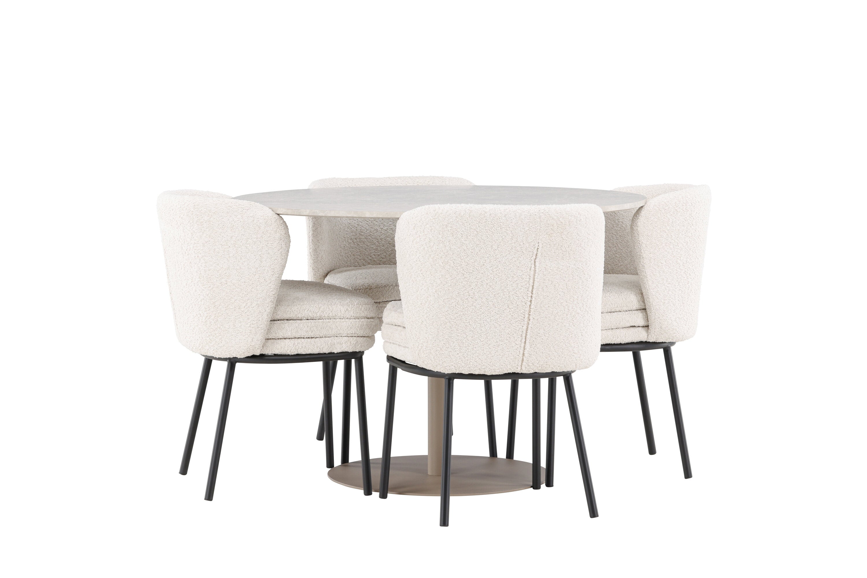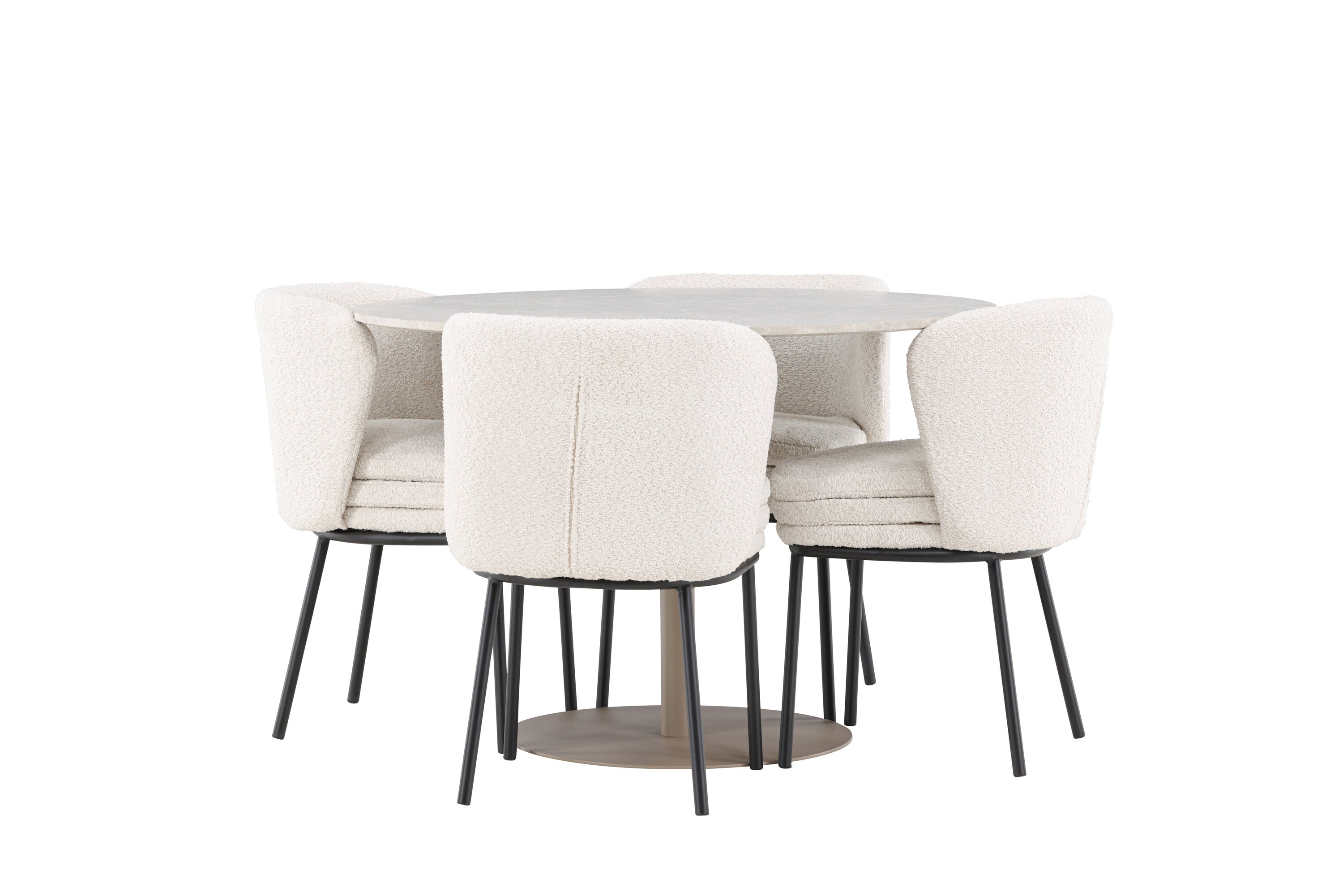 Vytvořte sofistikované a příjemné jídelní prostředí s jídelním setem, který se skládá ze stolu Lycke a židlí Agnes. Tato jídelní souprava spojuje moderní eleganci s vysokým komfortem a je tak dokonalým doplňkem vašeho domova. Stůl Lycke je se svou sofistikovanou béžovou barvou a MDF konstrukcí krásným středobodem. Stůl s průměrem 110 cm nabízí dostatek prostoru pro stolování a posezení a jeho harmonický design dodá vaší jídelně elegantní a klidnou atmosféru. Odolný povrch se snadno čistí a udržuje a zajišťuje tak dlouhotrvající krásu a funkčnost stolu. Čtyři doprovodné židle Agnes skvěle doplňují stůl. Tyto židle jsou čalouněny měkkým bílým buklem, který poskytuje luxusní a pohodlné sezení. Tkanina Boucle je známá svou texturou a měkkostí, což vám a vašim hostům umožňuje pohodlně sedět při dlouhých večeřích a rozhovorech. Bílá barva židlí vytváří krásný kontrast k béžovému stolu a dodává vaší jídelně moderní a sofistikovaný nádech. Jídelní set Lycke se židlemi Agnes je perfektní volbou pro ty, kteří chtějí vytvořit elegantní a funkční jídelní prostředí. Kombinace nadčasového designu a vysokého komfortu dělá z každého jídla příjemný zážitek. Vítejte na nové úrovni stylu a pohodlí u vás doma s Lycke a Agnes!