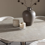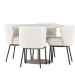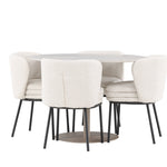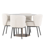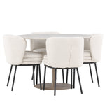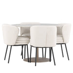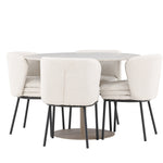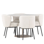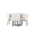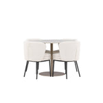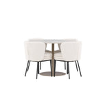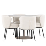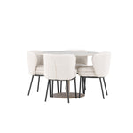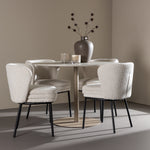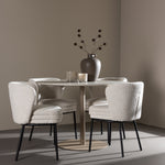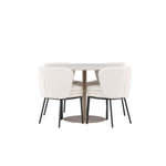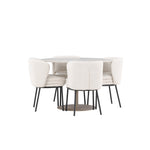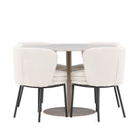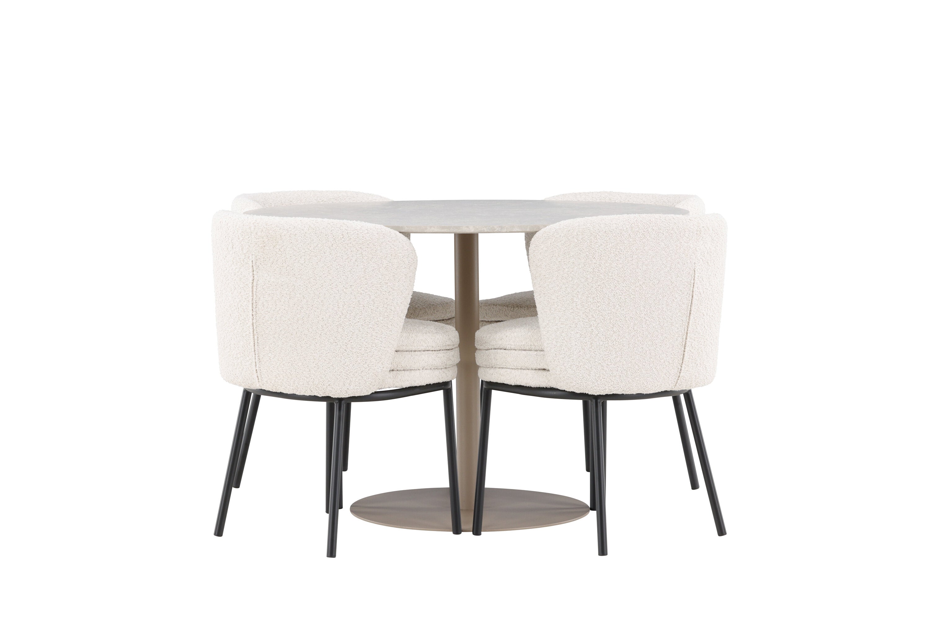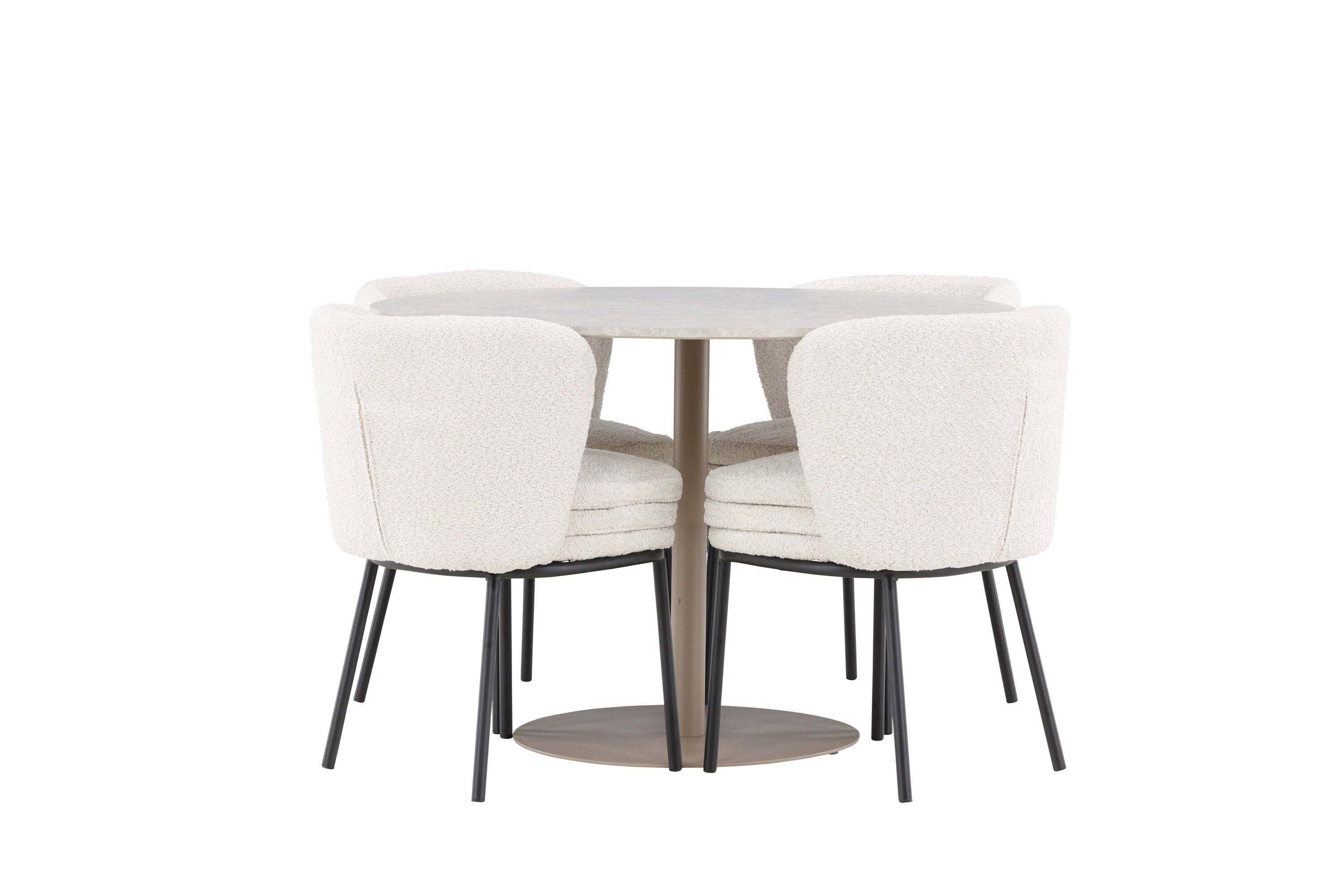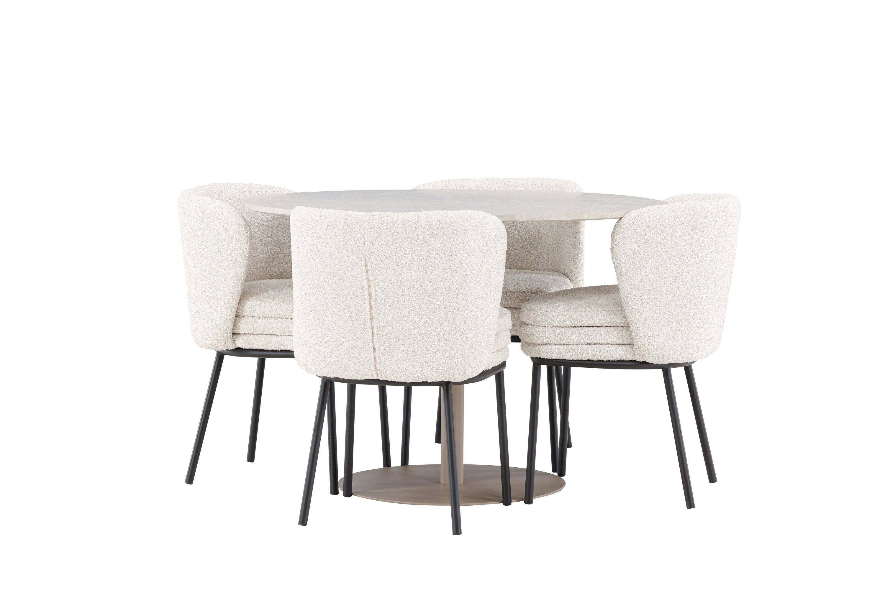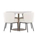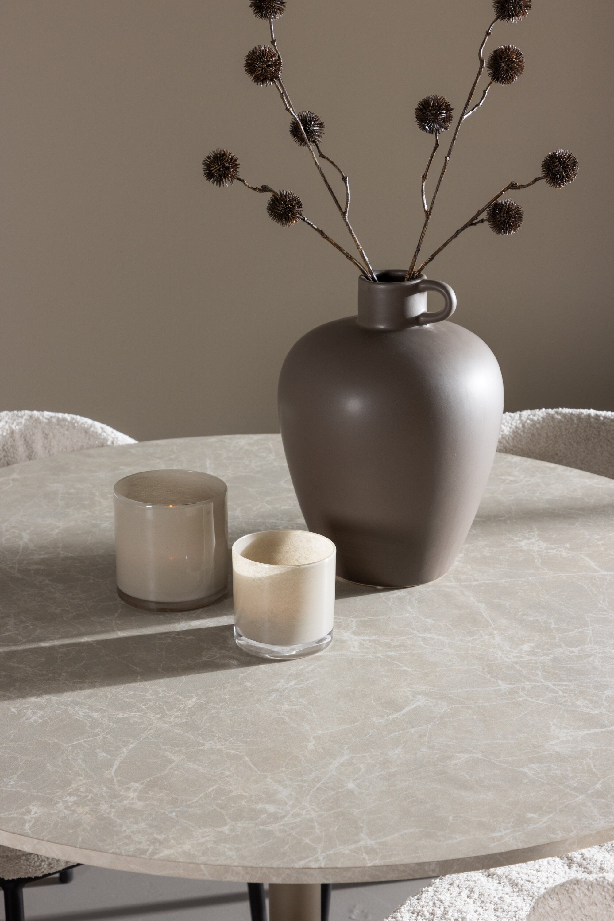 Vytvořte sofistikované a příjemné jídelní prostředí s jídelním setem, který se skládá ze stolu Lycke a židlí Agnes. Tato jídelní souprava spojuje moderní eleganci s vysokým komfortem a je tak dokonalým doplňkem vašeho domova. Stůl Lycke je se svou sofistikovanou béžovou barvou a MDF konstrukcí krásným středobodem. Stůl s průměrem 110 cm nabízí dostatek prostoru pro stolování a posezení a jeho harmonický design dodá vaší jídelně elegantní a klidnou atmosféru. Odolný povrch se snadno čistí a udržuje a zajišťuje tak dlouhotrvající krásu a funkčnost stolu. Čtyři doprovodné židle Agnes skvěle doplňují stůl. Tyto židle jsou čalouněny měkkým bílým buklem, který poskytuje luxusní a pohodlné sezení. Tkanina Boucle je známá svou texturou a měkkostí, což vám a vašim hostům umožňuje pohodlně sedět při dlouhých večeřích a rozhovorech. Bílá barva židlí vytváří krásný kontrast k béžovému stolu a dodává vaší jídelně moderní a sofistikovaný nádech. Jídelní set Lycke se židlemi Agnes je perfektní volbou pro ty, kteří chtějí vytvořit elegantní a funkční jídelní prostředí. Kombinace nadčasového designu a vysokého komfortu dělá z každého jídla příjemný zážitek. Vítejte na nové úrovni stylu a pohodlí u vás doma s Lycke a Agnes!