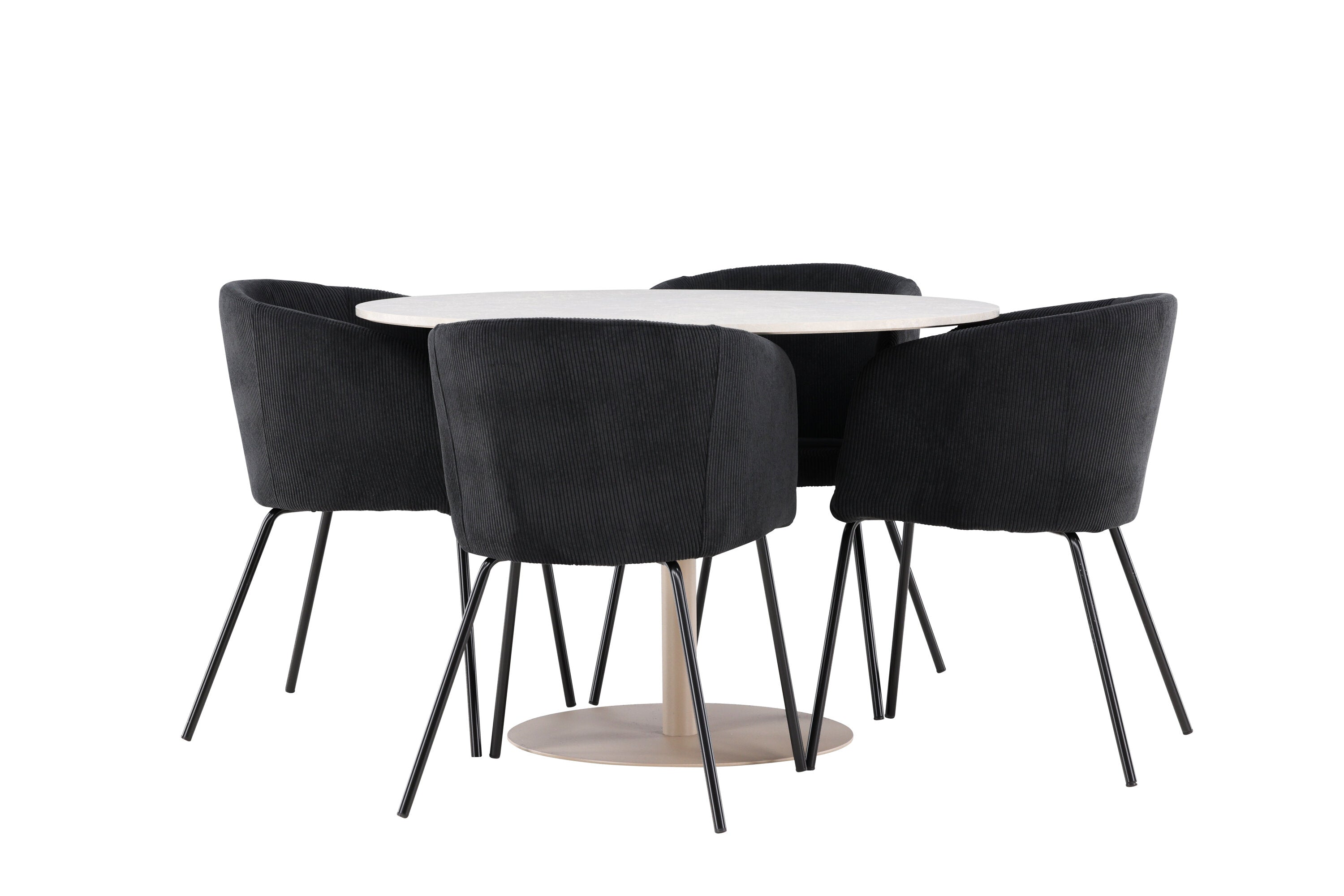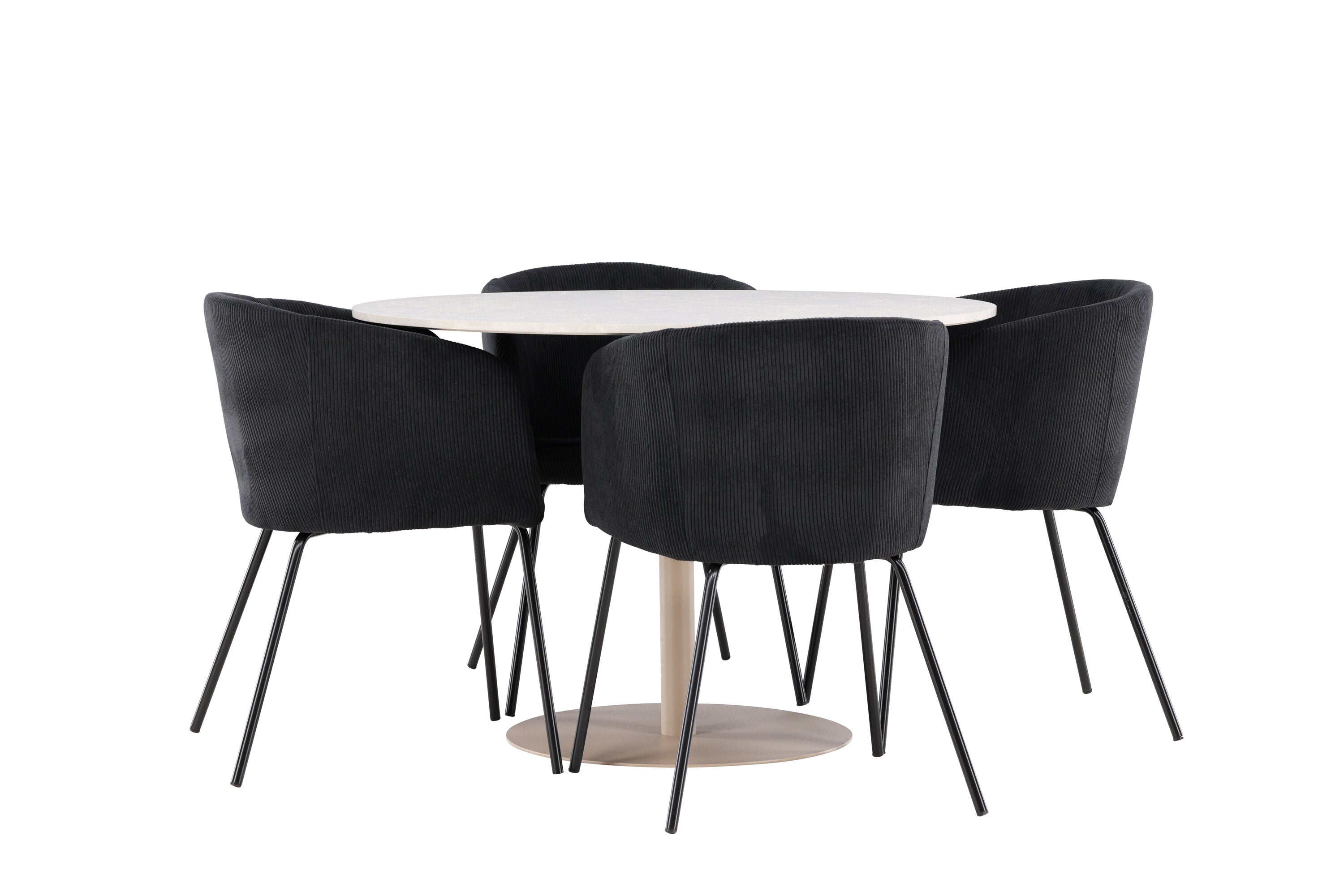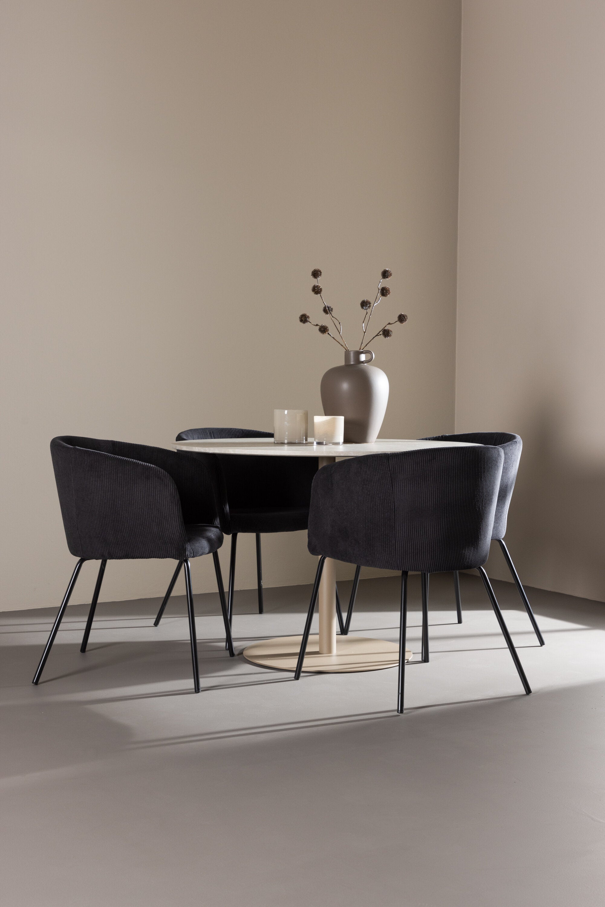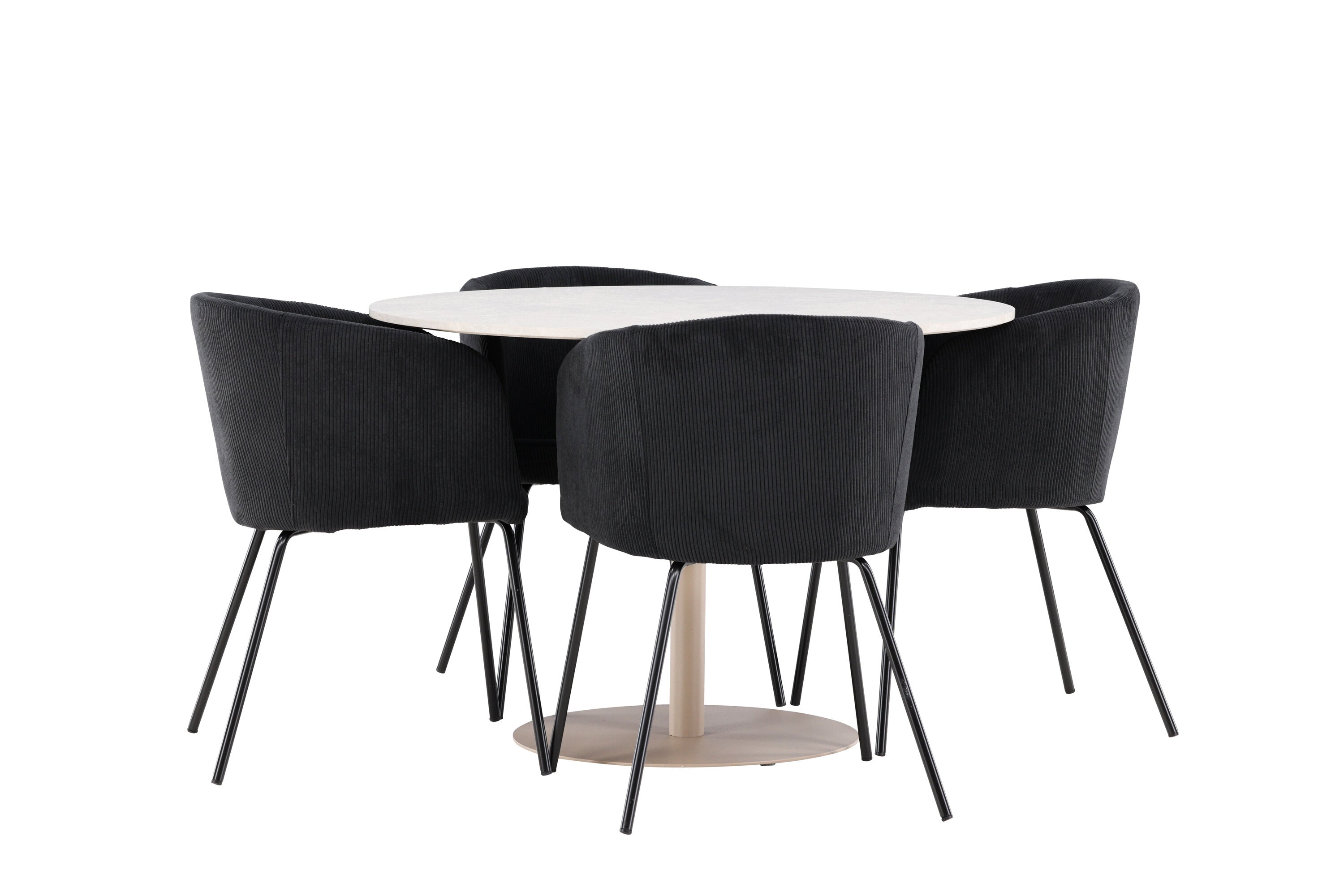 Proměňte svou jídelnu pomocí elegantního a moderního jídelního setu, který se skládá ze stolu Lycke a židlí Berit. Tato jídelní souprava v sobě spojuje styl a pohodlí a je tak dokonalým doplňkem vašeho domova. Stůl Lycke zaujme sofistikovanou béžovou barvou a MDF konstrukcí. Stůl s průměrem 110 cm nabízí dostatek prostoru pro jídlo a setkání, zatímco jeho harmonický design dodá vaší jídelně klidný a elegantní nádech. Odolný povrch usnadňuje čištění a údržbu stolu a zajišťuje dlouhotrvající krásu a funkčnost. Čtyři doprovodné židle Berit skvěle doplňují stůl. Tyto židle jsou čalouněny měkkým černým manšestrem a poskytují luxusní a pohodlné sezení. Manšestrová tkanina je známá svou odolností a pohodlím a umožňuje vám a vašim hostům pohodlně sedět při dlouhých večeřích a rozhovorech. Černá barva židlí vytváří stylový kontrast k béžovému stolu a dodává vaší jídelně moderní a sofistikovanou atmosféru. Jídelní set Lycke se židlemi Berit je perfektní volbou pro ty, kteří chtějí vytvořit elegantní a funkční jídelní prostředí. Kombinace moderního designu a vysokého komfortu dělá z každého jídla příjemný zážitek. Vítejte na nové úrovni stylu a pohodlí u vás doma s Lycke a Berit!