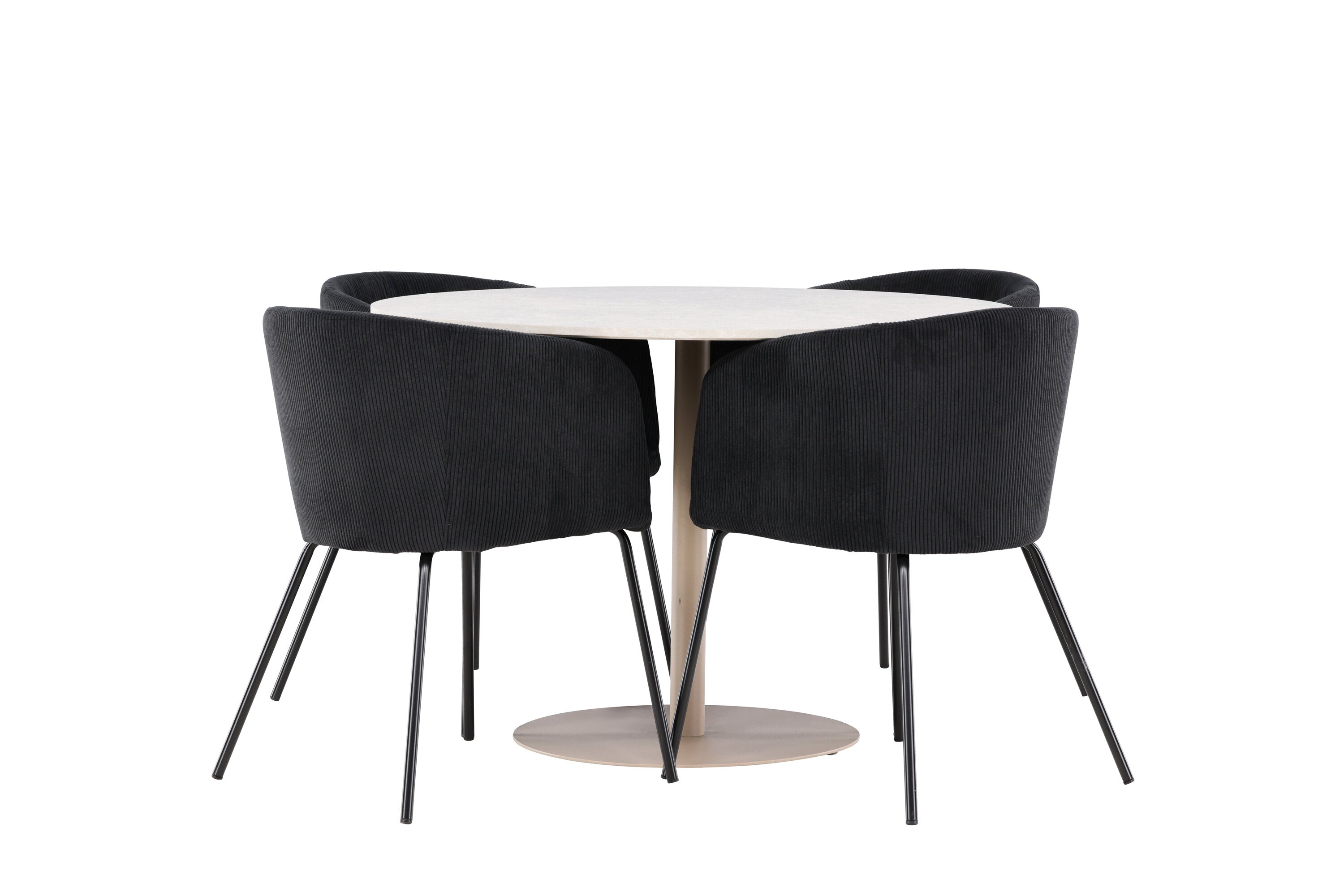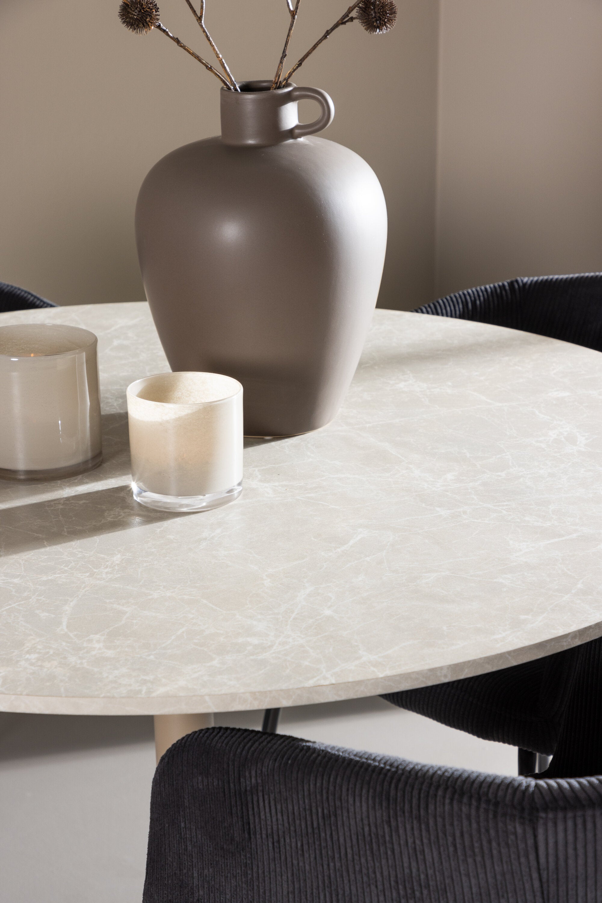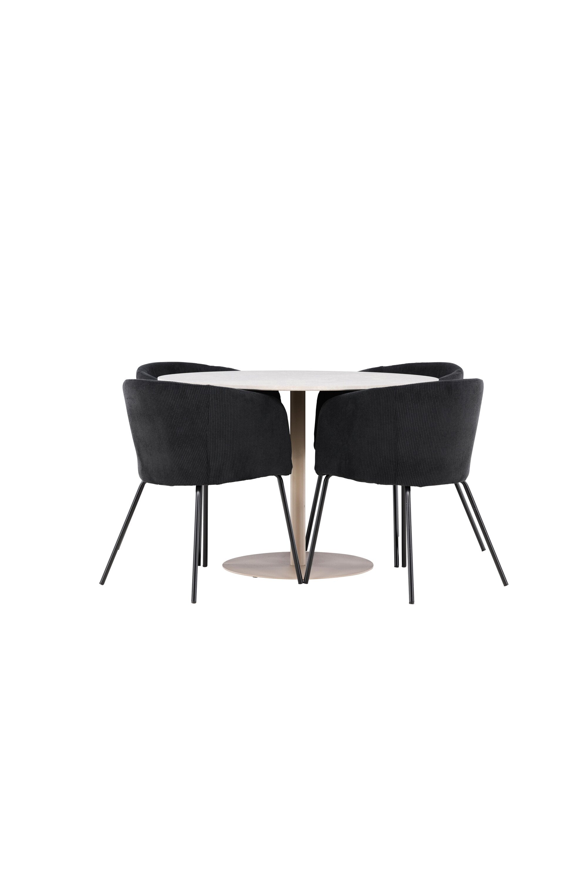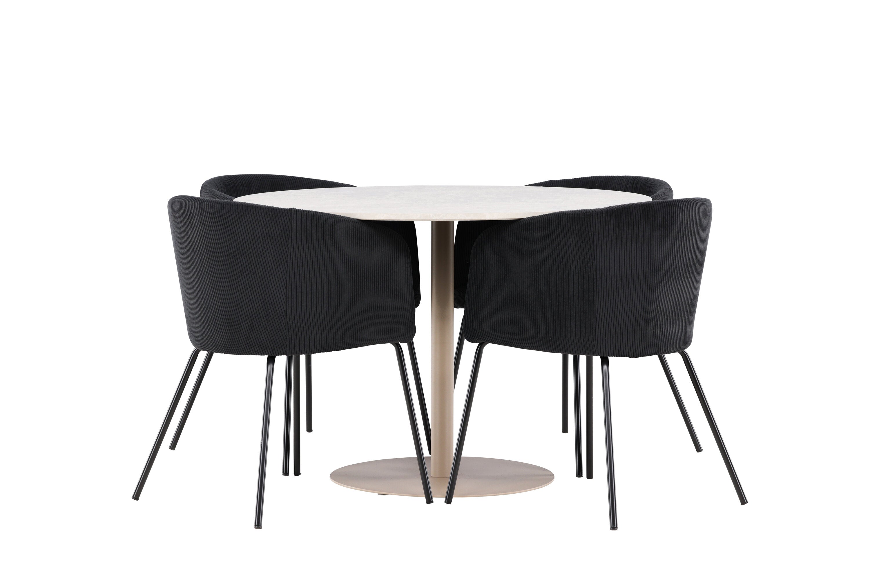 Proměňte svou jídelnu pomocí elegantního a moderního jídelního setu, který se skládá ze stolu Lycke a židlí Berit. Tato jídelní souprava v sobě spojuje styl a pohodlí a je tak dokonalým doplňkem vašeho domova. Stůl Lycke zaujme sofistikovanou béžovou barvou a MDF konstrukcí. Stůl s průměrem 110 cm nabízí dostatek prostoru pro jídlo a setkání, zatímco jeho harmonický design dodá vaší jídelně klidný a elegantní nádech. Odolný povrch usnadňuje čištění a údržbu stolu a zajišťuje dlouhotrvající krásu a funkčnost. Čtyři doprovodné židle Berit skvěle doplňují stůl. Tyto židle jsou čalouněny měkkým černým manšestrem a poskytují luxusní a pohodlné sezení. Manšestrová tkanina je známá svou odolností a pohodlím a umožňuje vám a vašim hostům pohodlně sedět při dlouhých večeřích a rozhovorech. Černá barva židlí vytváří stylový kontrast k béžovému stolu a dodává vaší jídelně moderní a sofistikovanou atmosféru. Jídelní set Lycke se židlemi Berit je perfektní volbou pro ty, kteří chtějí vytvořit elegantní a funkční jídelní prostředí. Kombinace moderního designu a vysokého komfortu dělá z každého jídla příjemný zážitek. Vítejte na nové úrovni stylu a pohodlí u vás doma s Lycke a Berit!