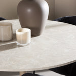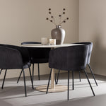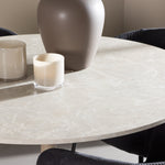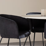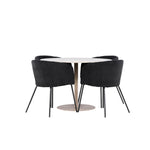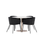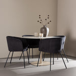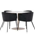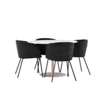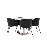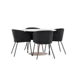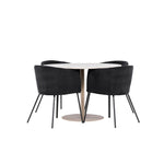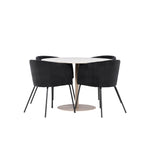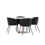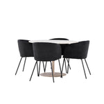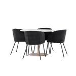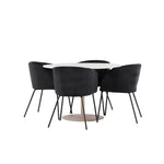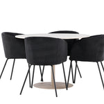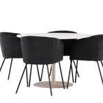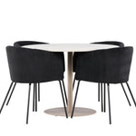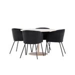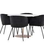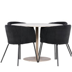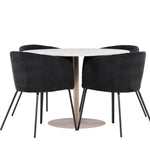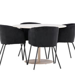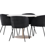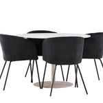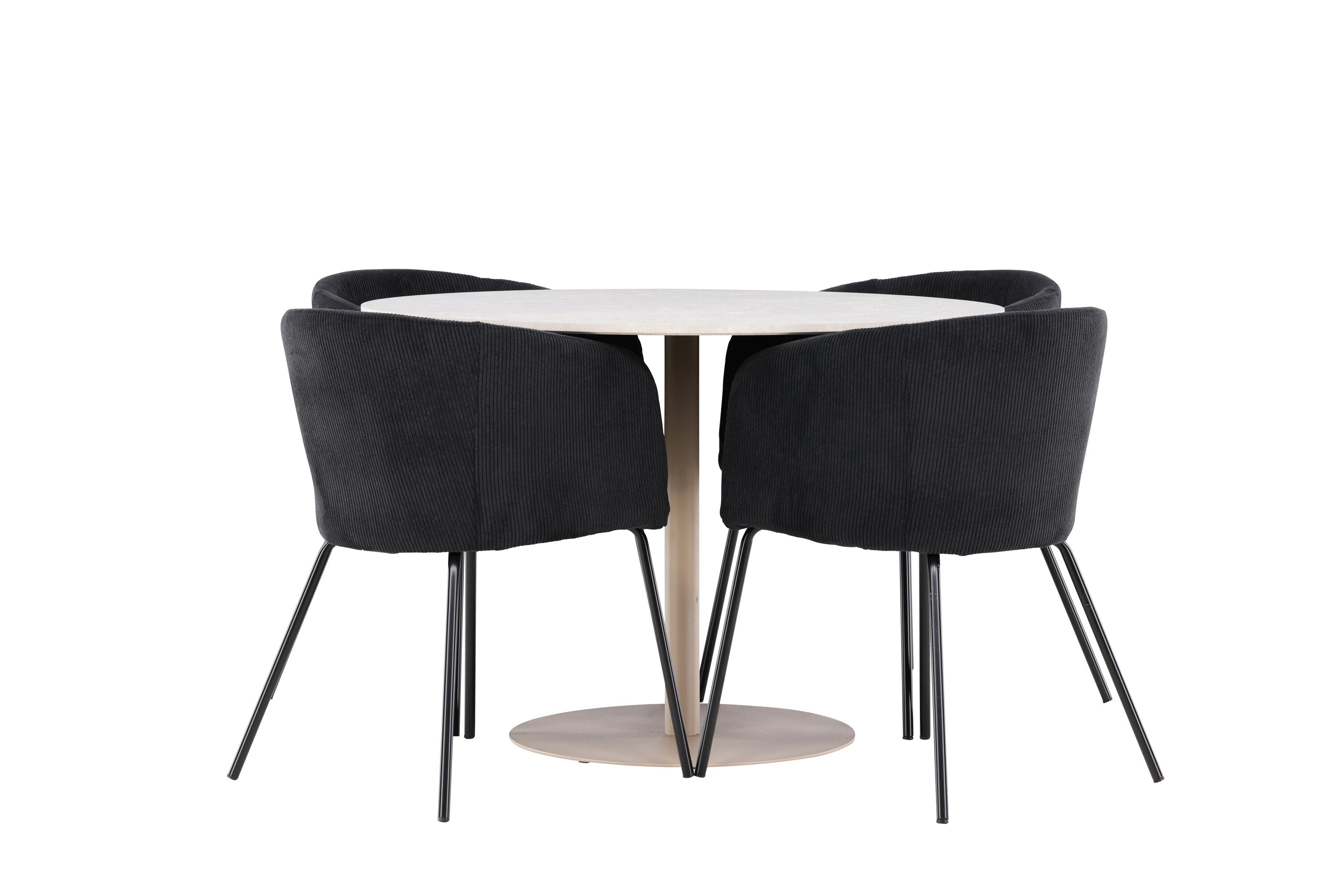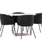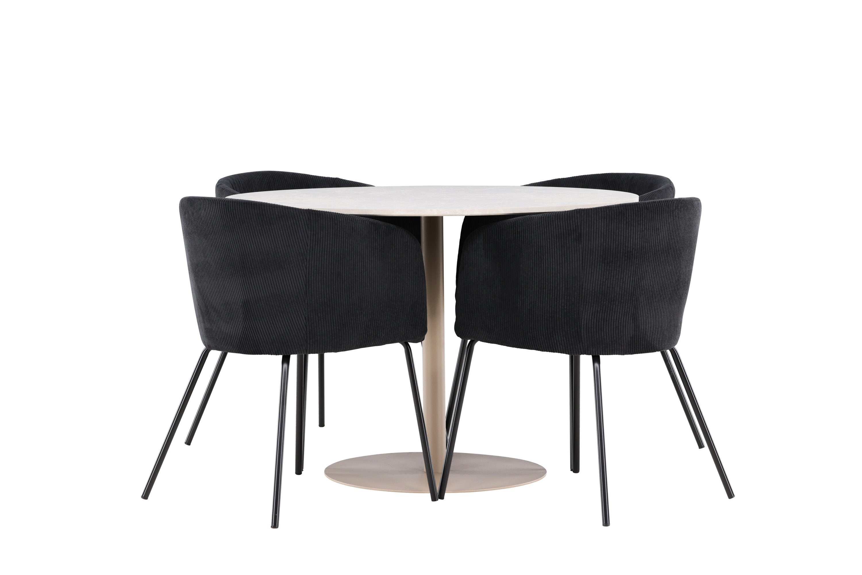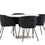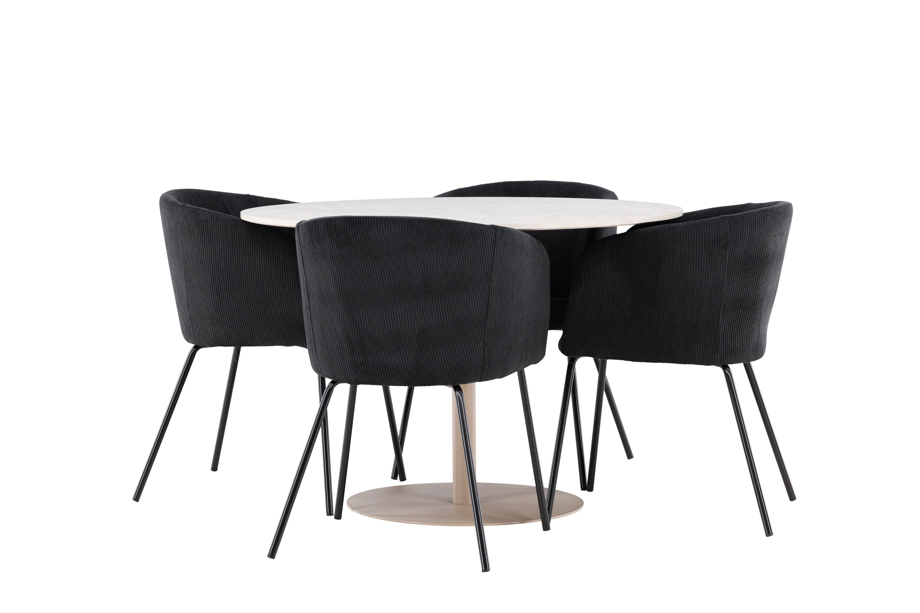 Proměňte svou jídelnu pomocí elegantního a moderního jídelního setu, který se skládá ze stolu Lycke a židlí Berit. Tato jídelní souprava v sobě spojuje styl a pohodlí a je tak dokonalým doplňkem vašeho domova. Stůl Lycke zaujme sofistikovanou béžovou barvou a MDF konstrukcí. Stůl s průměrem 110 cm nabízí dostatek prostoru pro jídlo a setkání, zatímco jeho harmonický design dodá vaší jídelně klidný a elegantní nádech. Odolný povrch usnadňuje čištění a údržbu stolu a zajišťuje dlouhotrvající krásu a funkčnost. Čtyři doprovodné židle Berit skvěle doplňují stůl. Tyto židle jsou čalouněny měkkým černým manšestrem a poskytují luxusní a pohodlné sezení. Manšestrová tkanina je známá svou odolností a pohodlím a umožňuje vám a vašim hostům pohodlně sedět při dlouhých večeřích a rozhovorech. Černá barva židlí vytváří stylový kontrast k béžovému stolu a dodává vaší jídelně moderní a sofistikovanou atmosféru. Jídelní set Lycke se židlemi Berit je perfektní volbou pro ty, kteří chtějí vytvořit elegantní a funkční jídelní prostředí. Kombinace moderního designu a vysokého komfortu dělá z každého jídla příjemný zážitek. Vítejte na nové úrovni stylu a pohodlí u vás doma s Lycke a Berit!