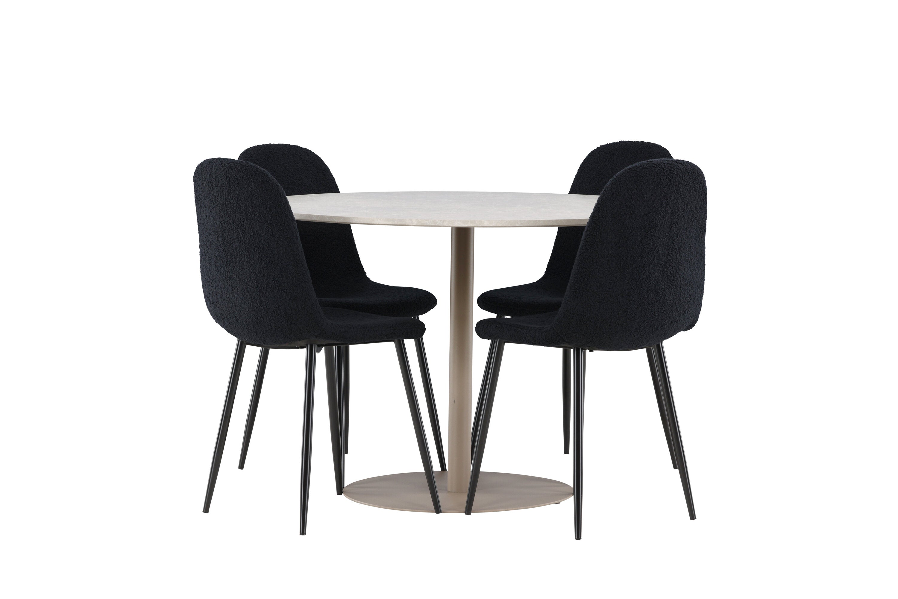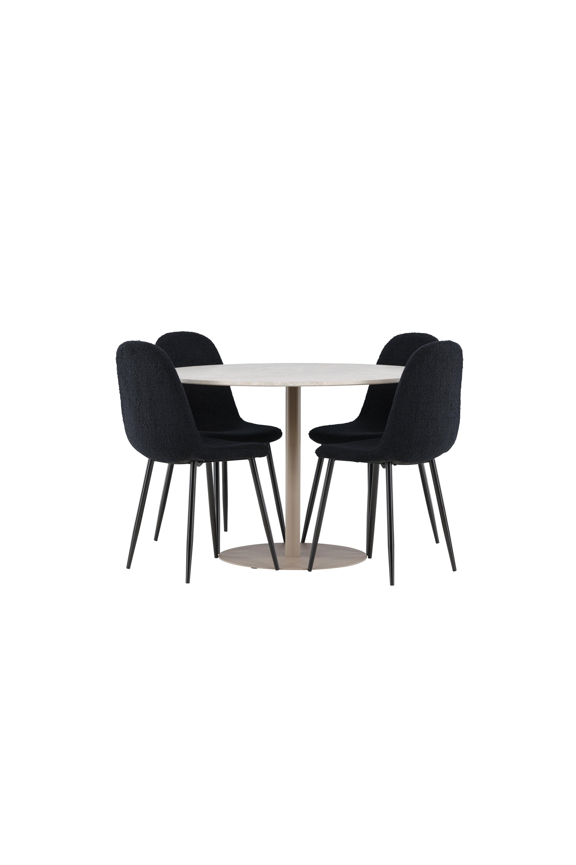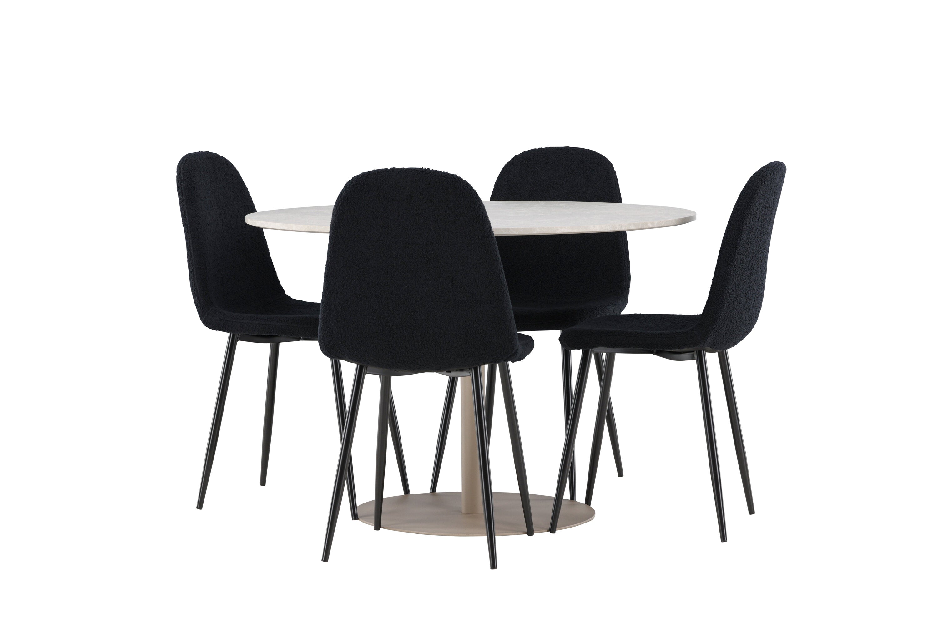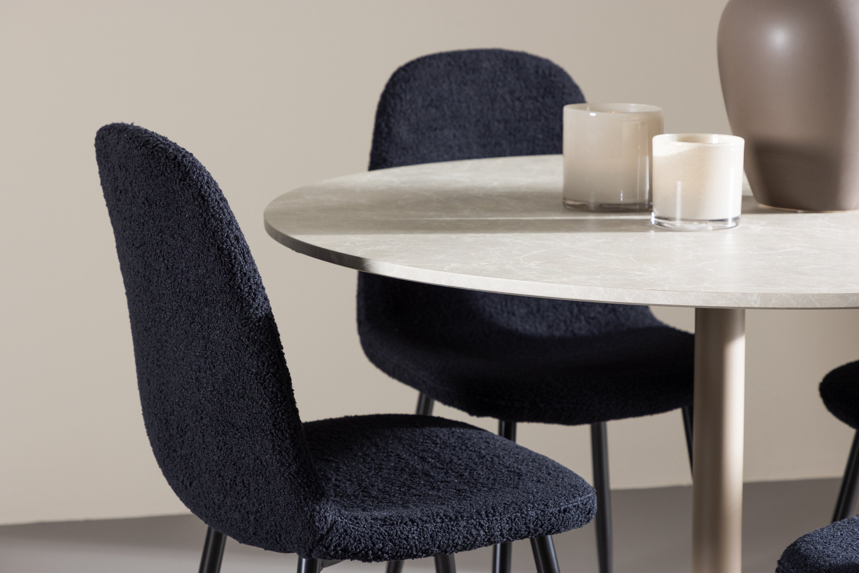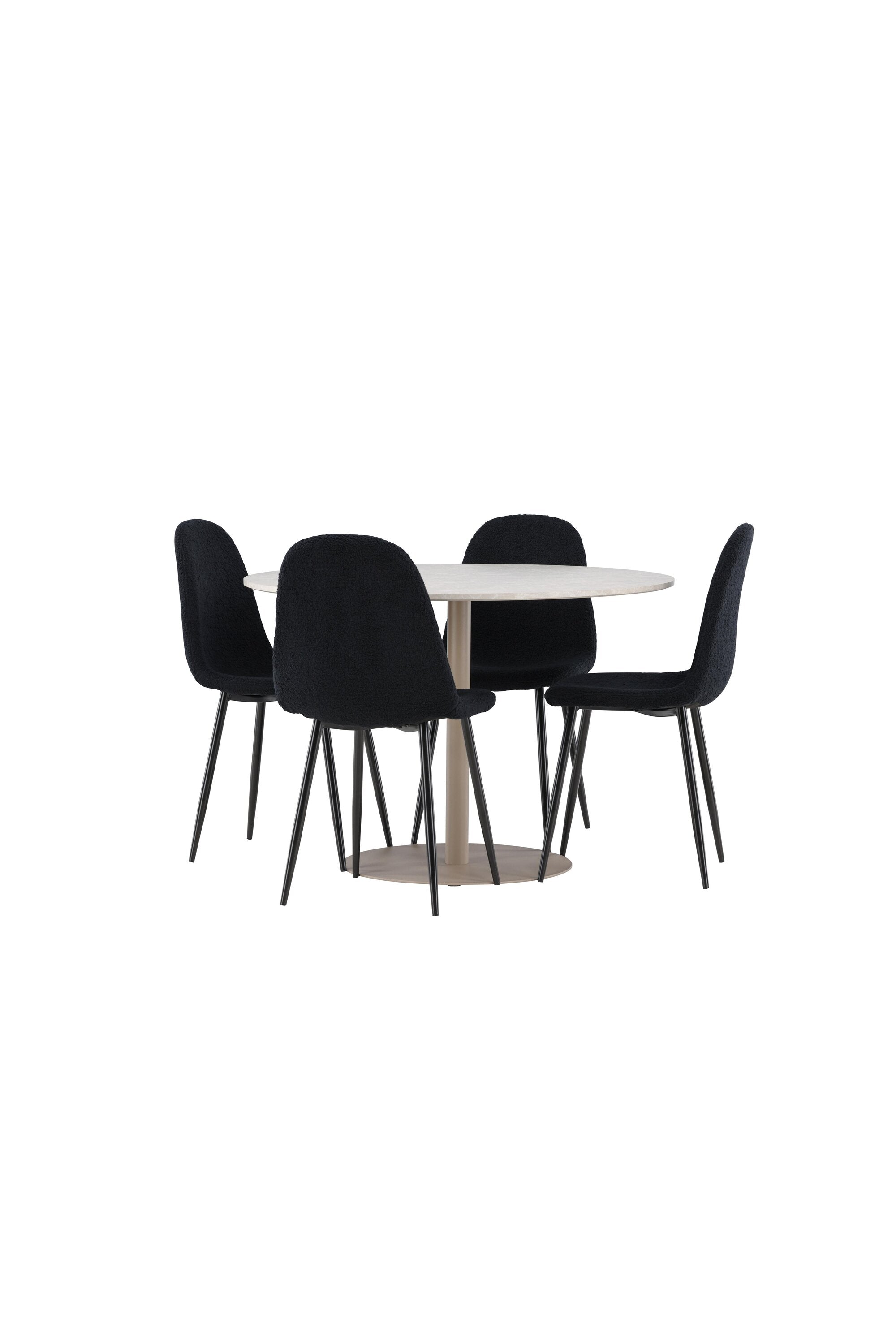Proměňte svou jídelnu pomocí elegantního a moderního jídelního setu, který se skládá ze stolu Lycke a židlí Polar. Tato jídelní souprava je navržena tak, aby v sobě spojovala styl a pohodlí a stala se tak fantastickým doplňkem vašeho domova. Stůl Lycke je působivým středobodem se svou sofistikovanou béžovou barvou a MDF konstrukcí. Stůl s průměrem 110 cm nabízí dostatek prostoru pro stolování i společenská setkání a jeho harmonický design dodá vaší jídelně moderní a elegantní nádech. Odolný povrch usnadňuje čištění a údržbu stolu a zajišťuje jeho dlouhotrvající krásu a funkčnost. Čtyři doprovodné židle Polar skvěle doplňují stůl. Tyto židle jsou čalouněny měkkým černým polyesterovým plyšovým plyšem, který poskytuje luxusní a pohodlné sezení. Teddy materiál je známý pro svou hřejivost a měkkost, umožňuje vám i vašim hostům pohodlně sedět při dlouhých večeřích a rozhovorech. Černé nohy na židlích poskytují stabilní konstrukci a zároveň podtrhují moderní a elegantní vzhled židlí. Jídelní set Lycke se židlemi Polar je perfektní volbou pro ty, kteří chtějí vytvořit stylové a funkční jídelní prostředí. Kombinace moderního designu a vysokého komfortu dělá z každého jídla příjemný zážitek. Vítejte na nové úrovni stylu a pohodlí u vás doma s Lycke a Polar!