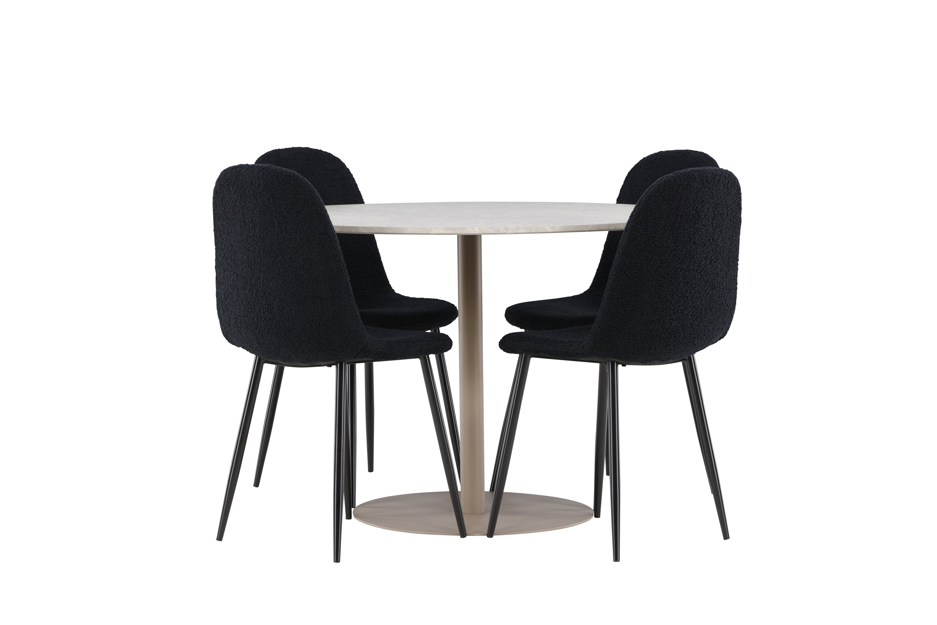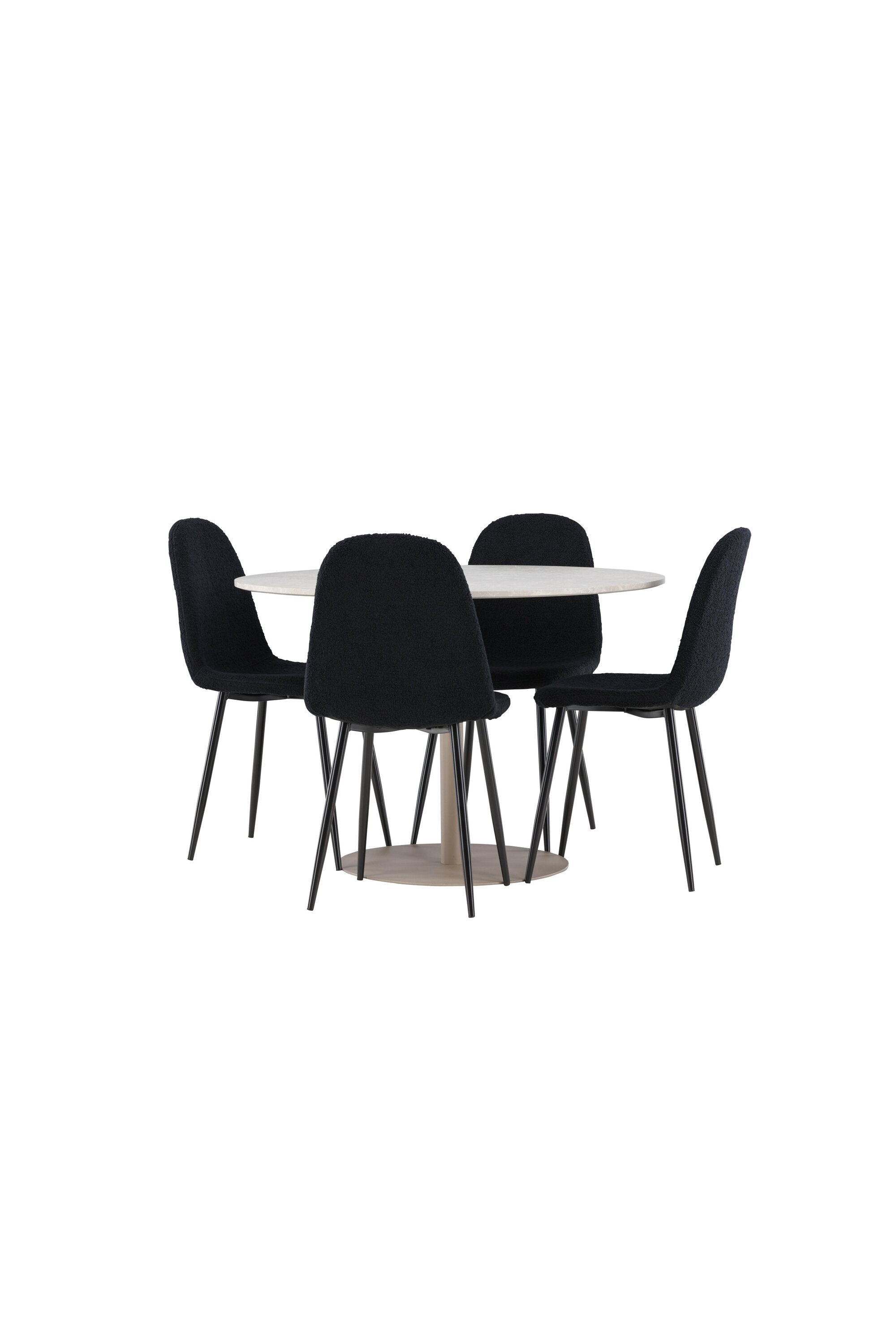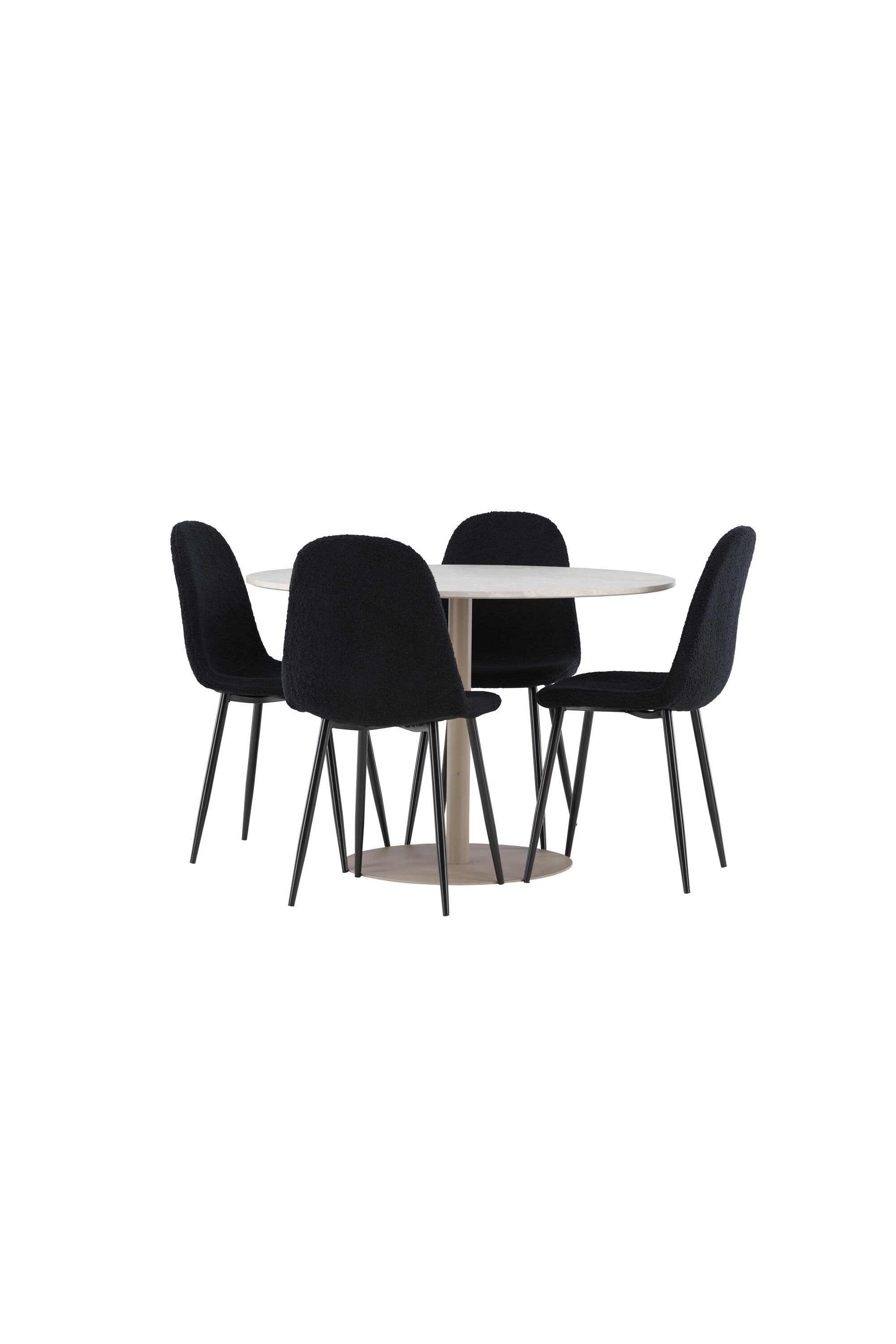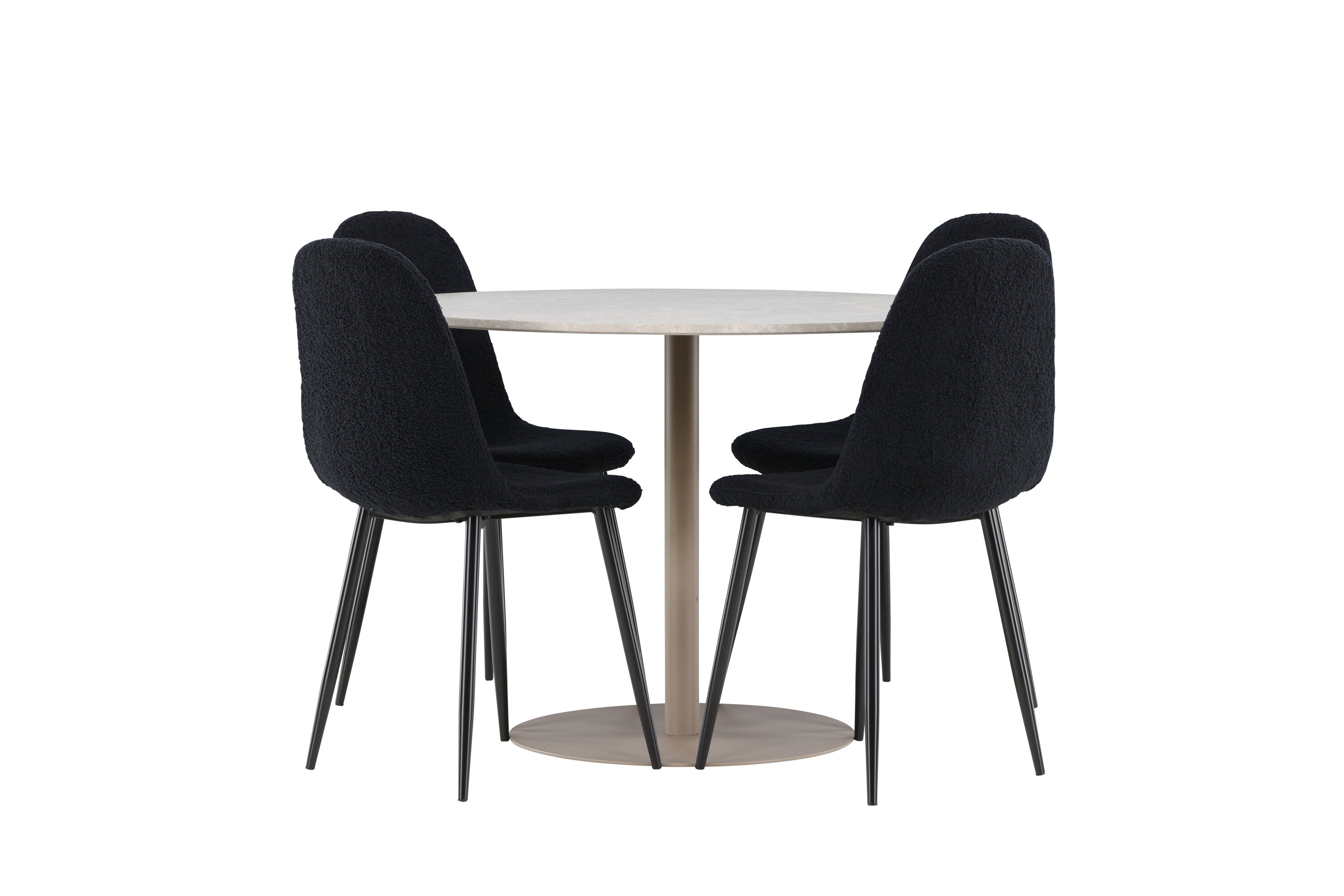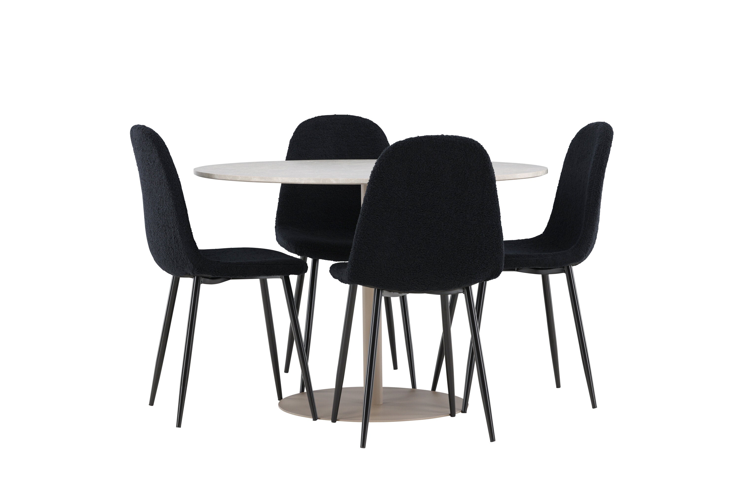 Proměňte svou jídelnu pomocí elegantního a moderního jídelního setu, který se skládá ze stolu Lycke a židlí Polar. Tato jídelní souprava je navržena tak, aby v sobě spojovala styl a pohodlí a stala se tak fantastickým doplňkem vašeho domova. Stůl Lycke je působivým středobodem se svou sofistikovanou béžovou barvou a MDF konstrukcí. Stůl s průměrem 110 cm nabízí dostatek prostoru pro stolování i společenská setkání a jeho harmonický design dodá vaší jídelně moderní a elegantní nádech. Odolný povrch usnadňuje čištění a údržbu stolu a zajišťuje jeho dlouhotrvající krásu a funkčnost. Čtyři doprovodné židle Polar skvěle doplňují stůl. Tyto židle jsou čalouněny měkkým černým polyesterovým plyšovým plyšem, který poskytuje luxusní a pohodlné sezení. Teddy materiál je známý pro svou hřejivost a měkkost, umožňuje vám i vašim hostům pohodlně sedět při dlouhých večeřích a rozhovorech. Černé nohy na židlích poskytují stabilní konstrukci a zároveň podtrhují moderní a elegantní vzhled židlí. Jídelní set Lycke se židlemi Polar je perfektní volbou pro ty, kteří chtějí vytvořit stylové a funkční jídelní prostředí. Kombinace moderního designu a vysokého komfortu dělá z každého jídla příjemný zážitek. Vítejte na nové úrovni stylu a pohodlí u vás doma s Lycke a Polar!