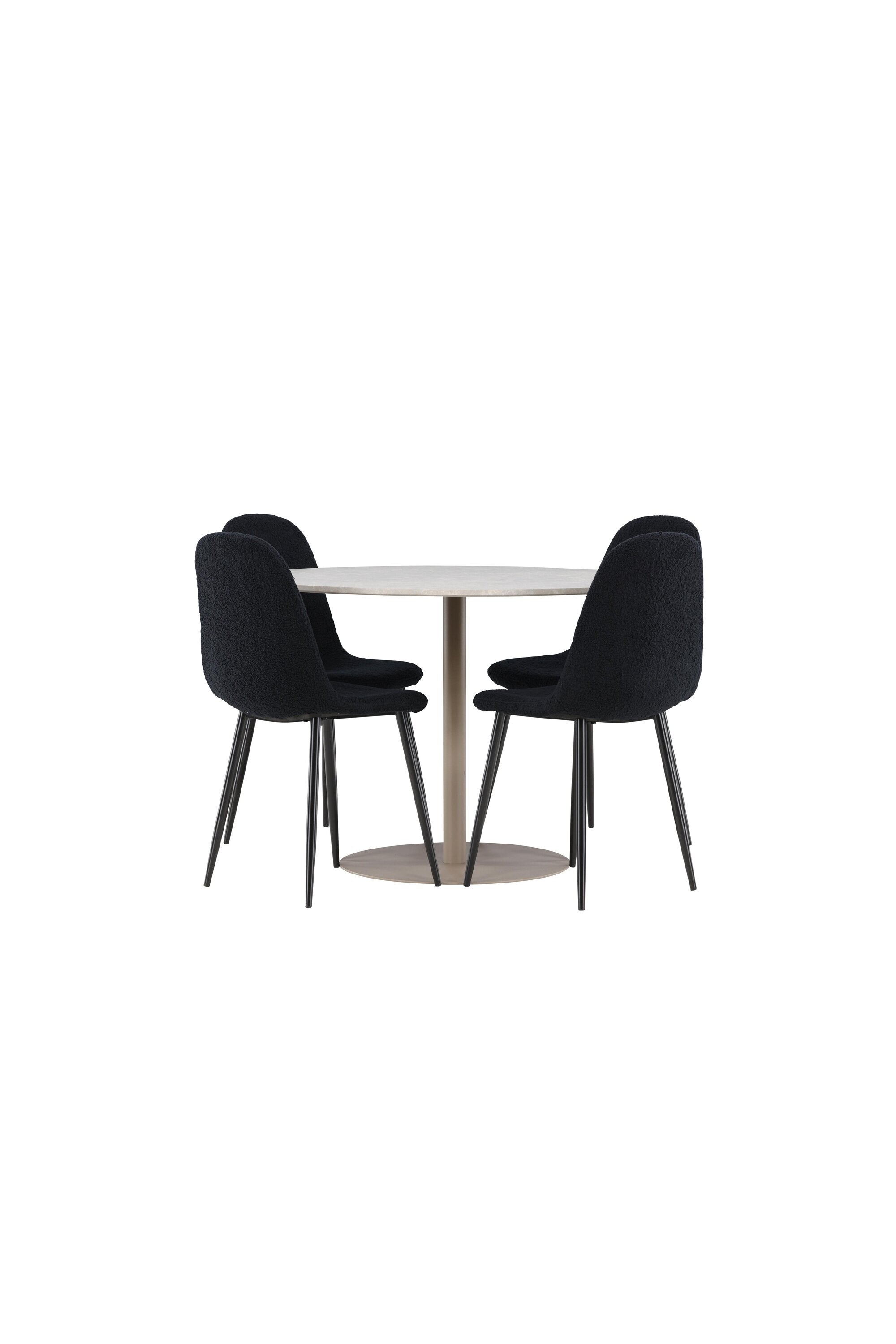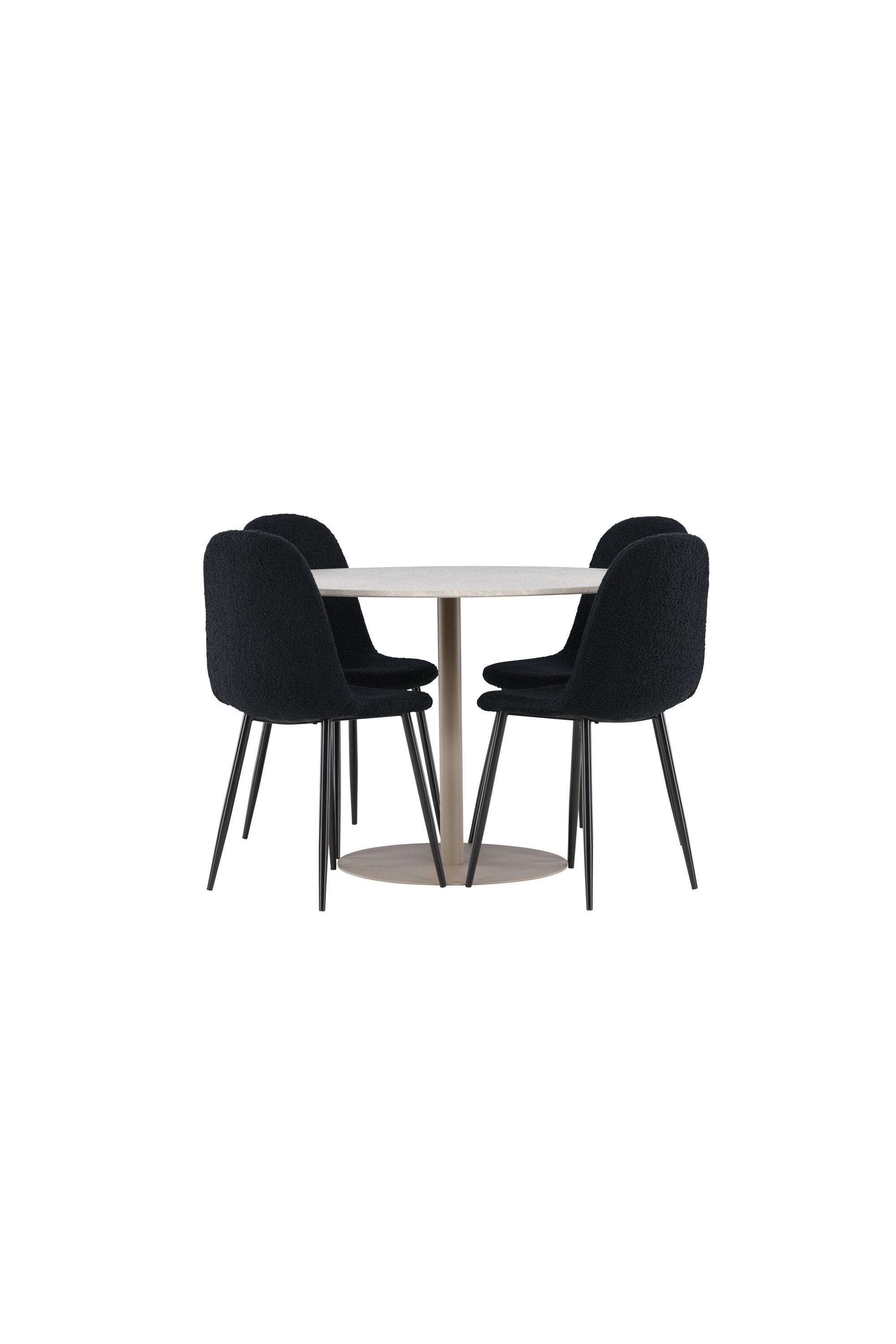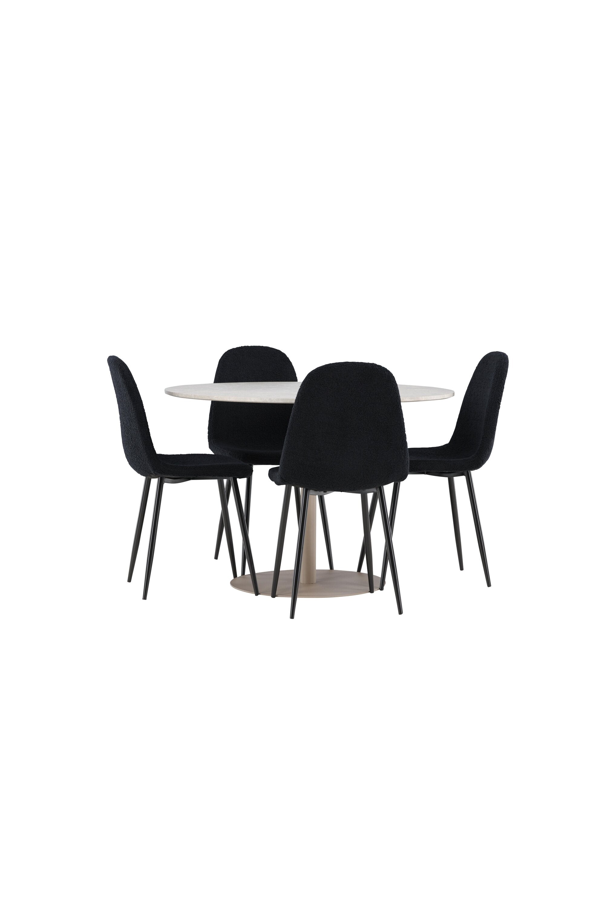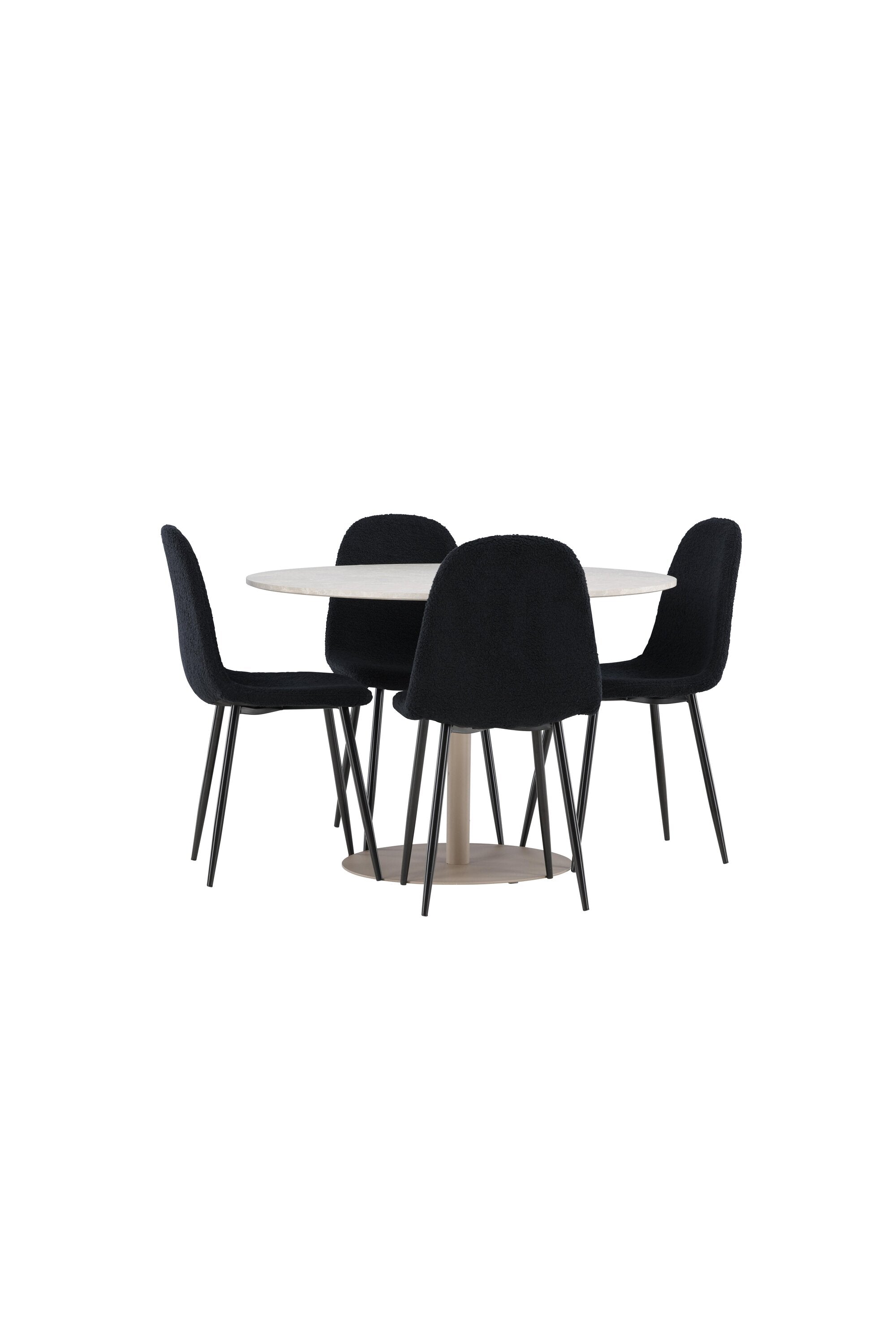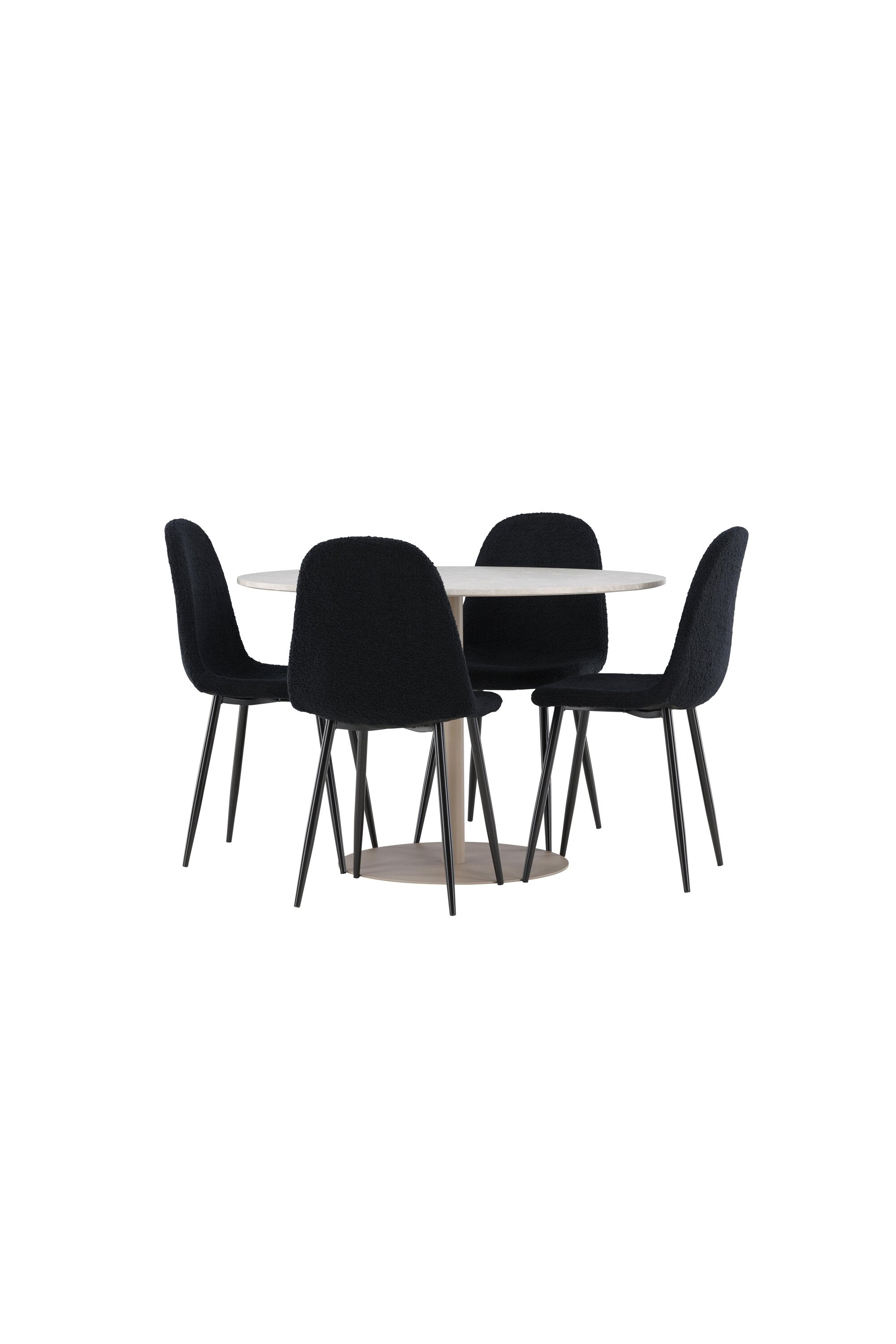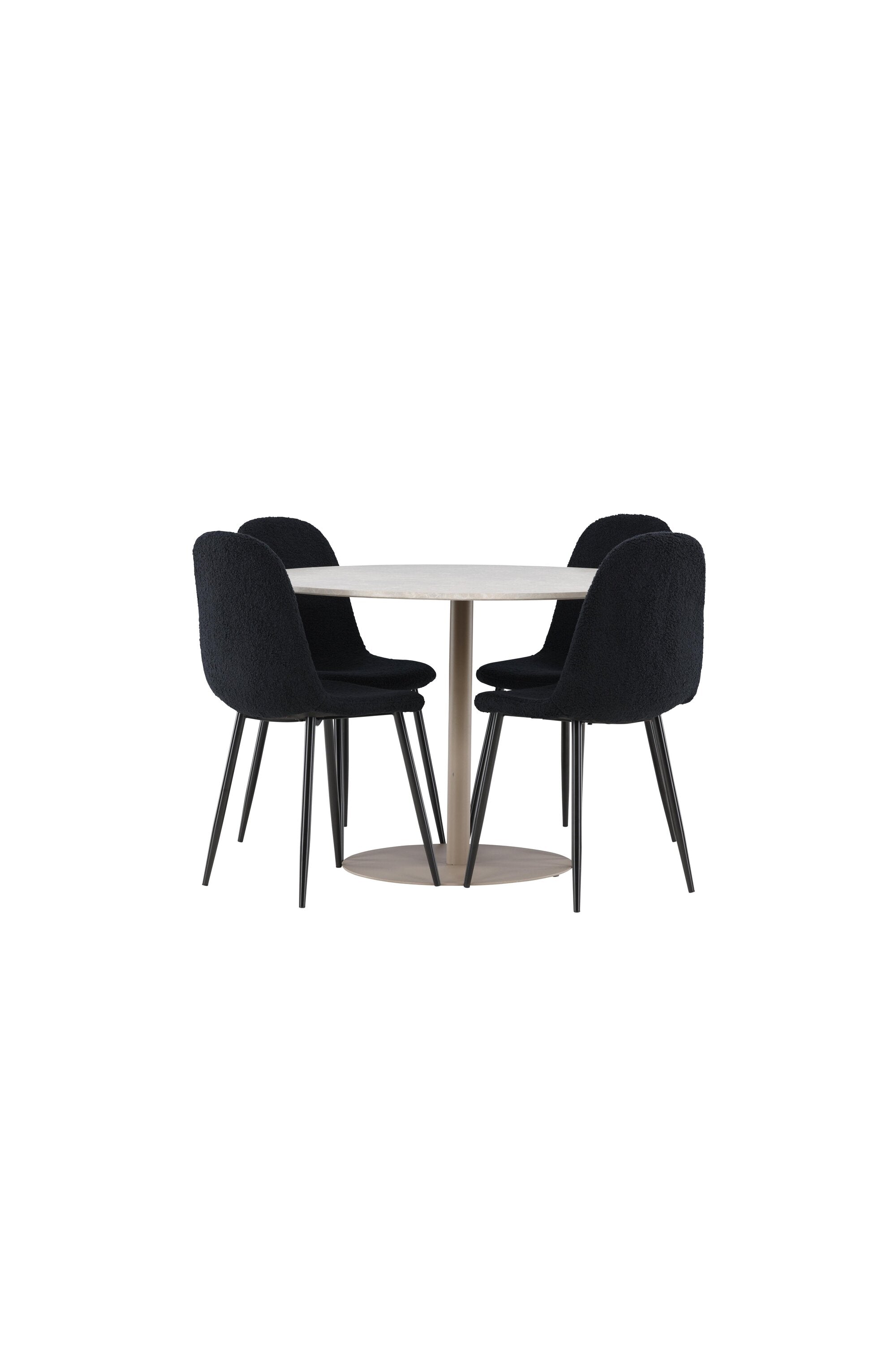 Proměňte svou jídelnu pomocí elegantního a moderního jídelního setu, který se skládá ze stolu Lycke a židlí Polar. Tato jídelní souprava je navržena tak, aby v sobě spojovala styl a pohodlí a stala se tak fantastickým doplňkem vašeho domova. Stůl Lycke je působivým středobodem se svou sofistikovanou béžovou barvou a MDF konstrukcí. Stůl s průměrem 110 cm nabízí dostatek prostoru pro stolování i společenská setkání a jeho harmonický design dodá vaší jídelně moderní a elegantní nádech. Odolný povrch usnadňuje čištění a údržbu stolu a zajišťuje jeho dlouhotrvající krásu a funkčnost. Čtyři doprovodné židle Polar skvěle doplňují stůl. Tyto židle jsou čalouněny měkkým černým polyesterovým plyšovým plyšem, který poskytuje luxusní a pohodlné sezení. Teddy materiál je známý pro svou hřejivost a měkkost, umožňuje vám i vašim hostům pohodlně sedět při dlouhých večeřích a rozhovorech. Černé nohy na židlích poskytují stabilní konstrukci a zároveň podtrhují moderní a elegantní vzhled židlí. Jídelní set Lycke se židlemi Polar je perfektní volbou pro ty, kteří chtějí vytvořit stylové a funkční jídelní prostředí. Kombinace moderního designu a vysokého komfortu dělá z každého jídla příjemný zážitek. Vítejte na nové úrovni stylu a pohodlí u vás doma s Lycke a Polar!
