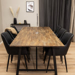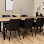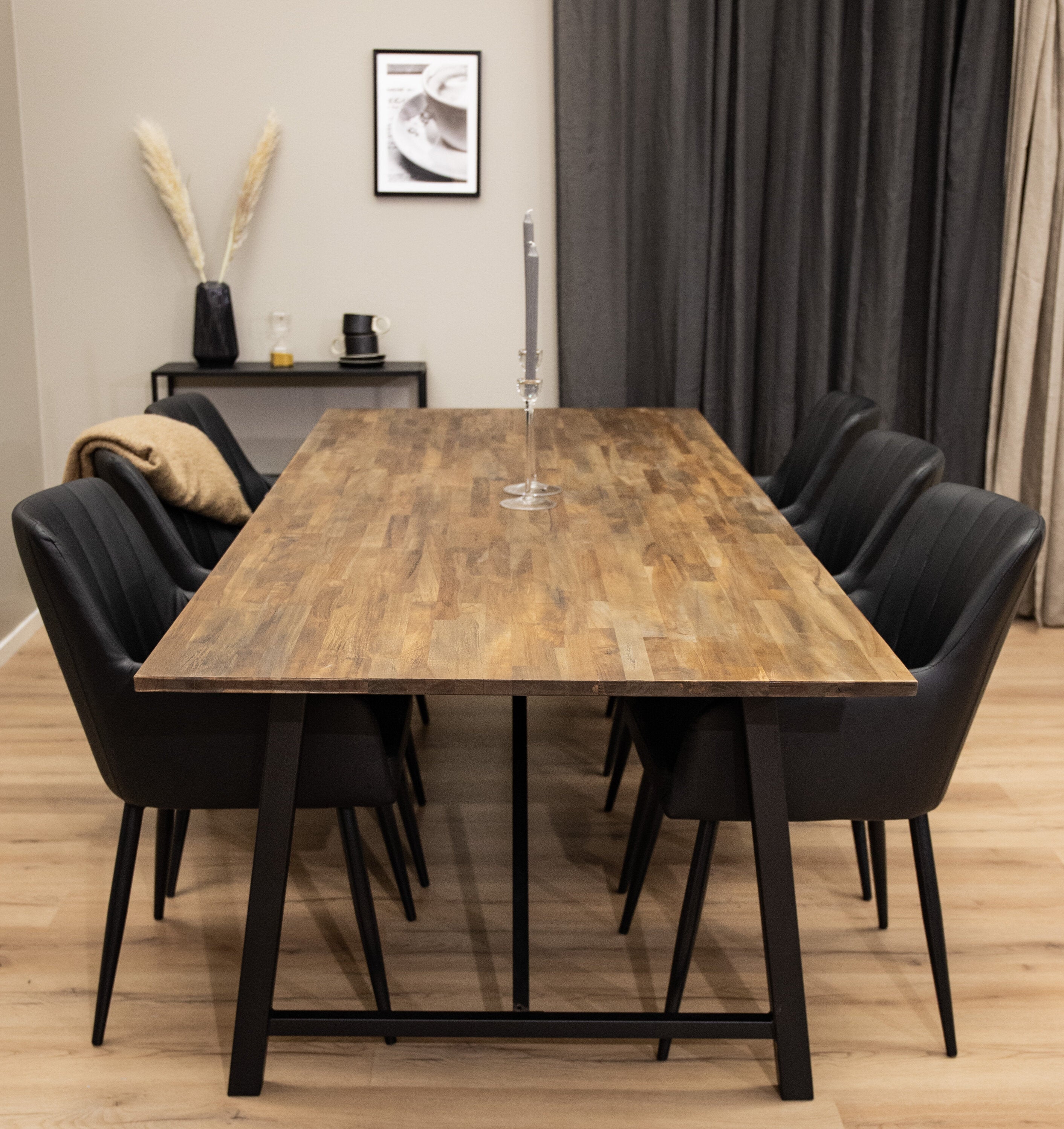 Klasické a robustní zároveň. Náš jídelní stůl Malang v Trälooku spolu s černými koženými židlemi (Comfort) je kombinací, která nikdy neomrzí. Kovové nohy stolu společně s koženou a dřevěnou lokomotivou jsou vítězným konceptem.