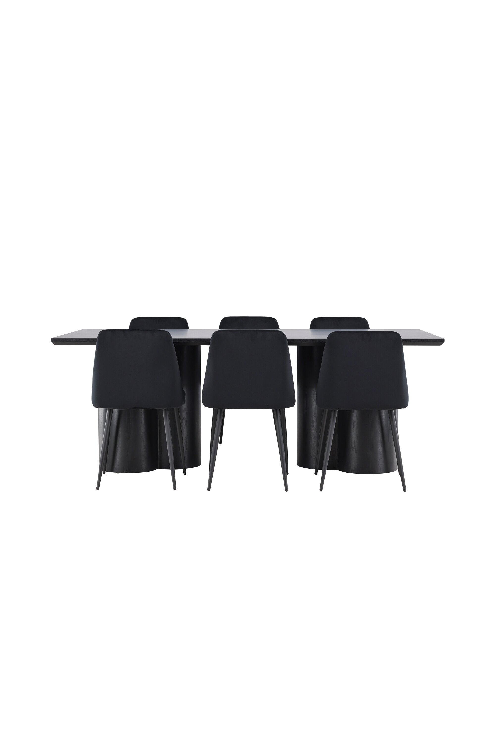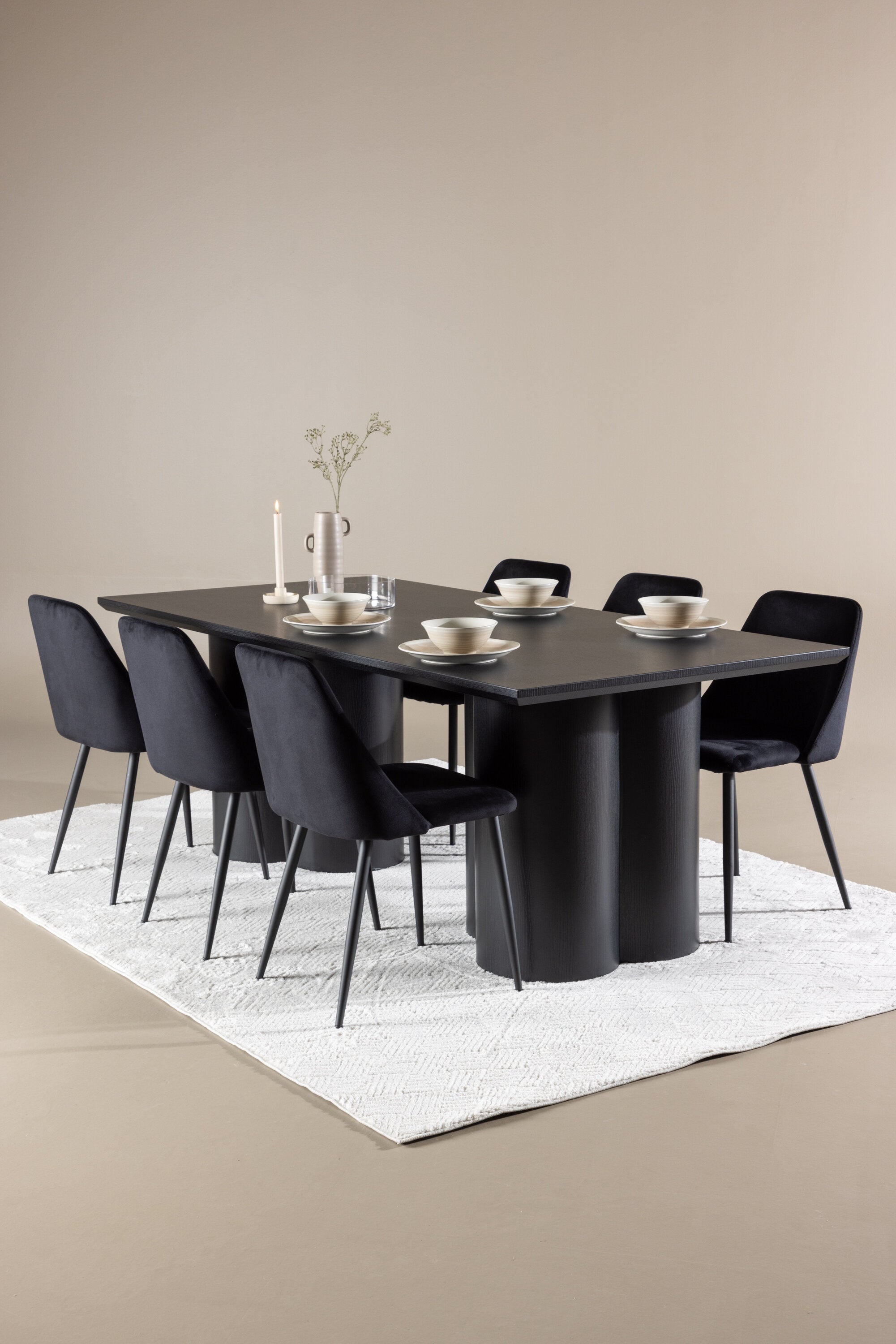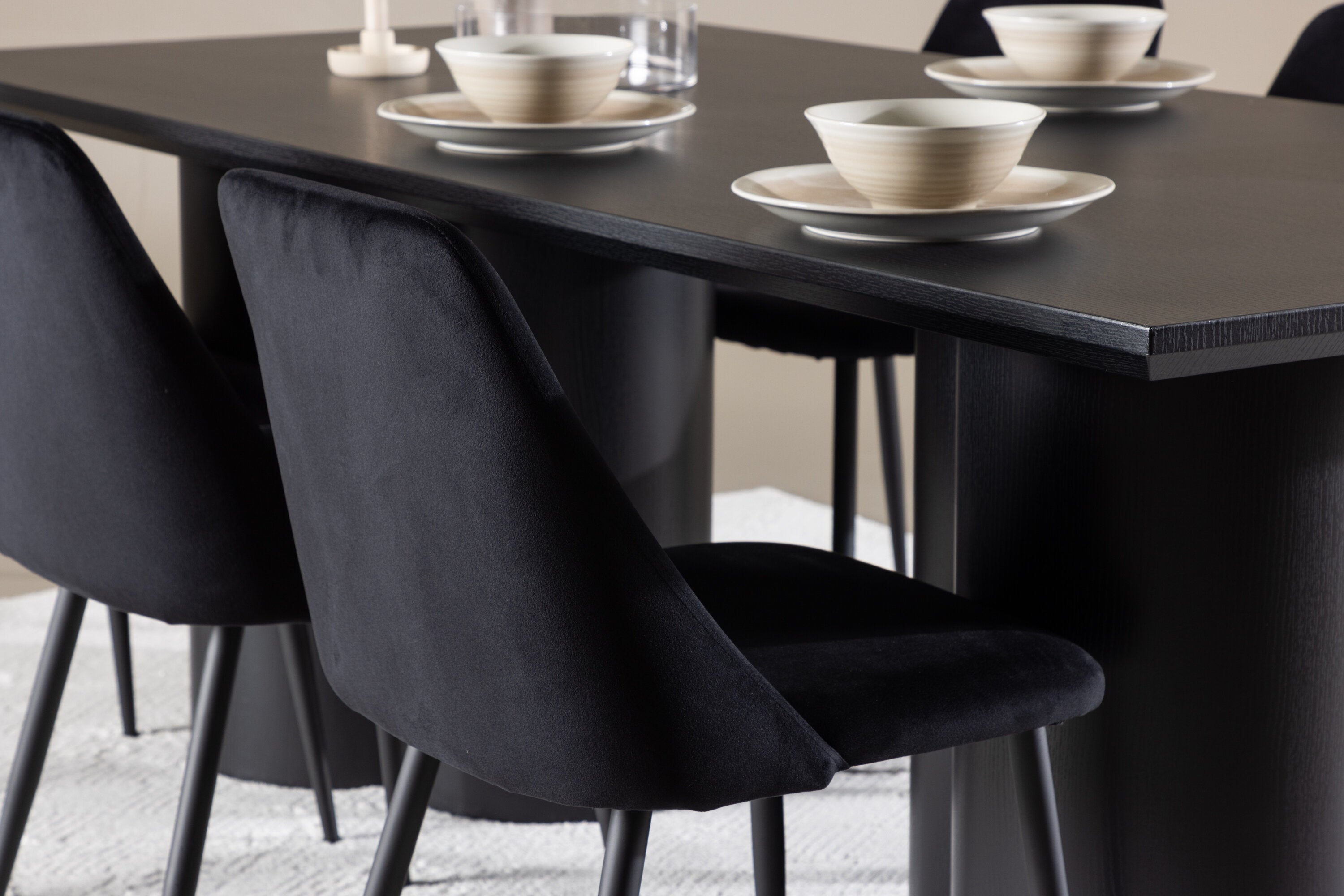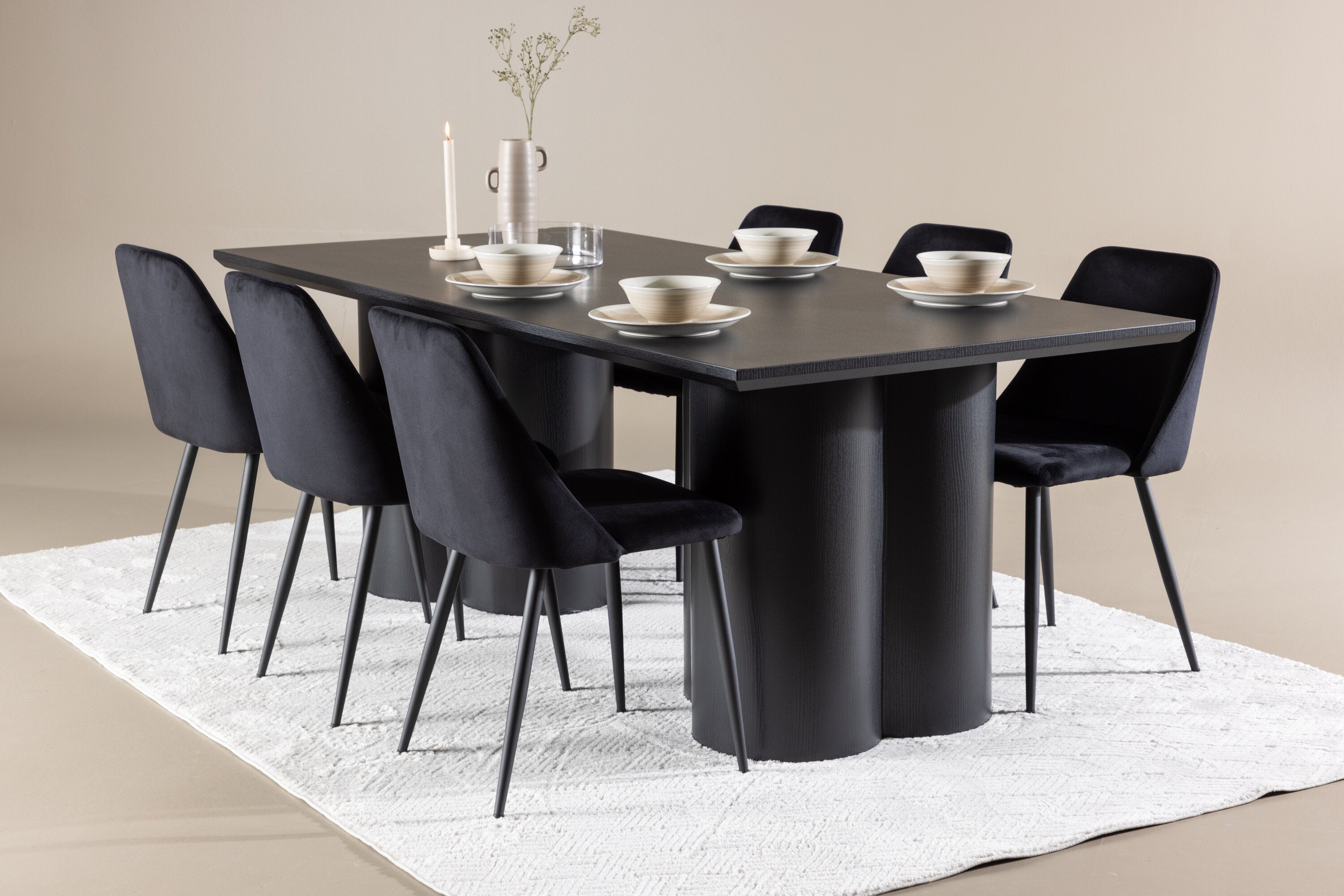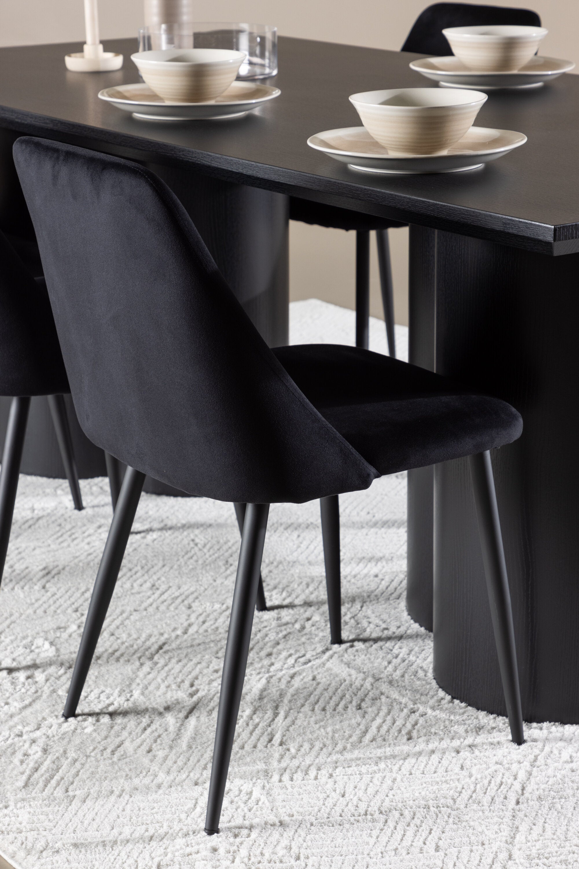 Objevte perfektní jídelní set s jídelní židlí ze série NIGHT a jídelním stolem Olivia - kombinaci, která vyzařuje eleganci i funkčnost pro váš domov. Jídelní židle ze série NIGHT je stejně pohodlná jako stylová s celočalouněným sedákem v černém sametu a ladícími nohami v černé barvě. Tato jídelní židle vytváří luxusní třpyt v místnosti a přispívá k příjemné a módní atmosféře. Mělo by to být skvělé sedět u lahodného jídla! Jídelní stůl Olivia se svými velkorysými rozměry 210x100 cm je perfektní pro vítání přátel a rodiny při společném jídle a posezení. Stůl v sofistikovaném černém odstínu vyzařuje eleganci a modernost a jeho robustní konstrukce zajišťuje dlouhodobou stabilitu. Dodejte své jídelně pocit luxusu a modernosti s jídelní židlí ze série NIGHT a jídelním stolem Olivia. Tento jídelní set vytváří harmonickou atmosféru a zanechává trvalý dojem. Tato kombinace je ideální jak pro každodenní večeři, tak pro slavnostní příležitosti, nabízí rovnováhu mezi nadčasovým designem a moderními detaily, díky čemuž je perfektní volbou pro všechna vaše společenská setkání.