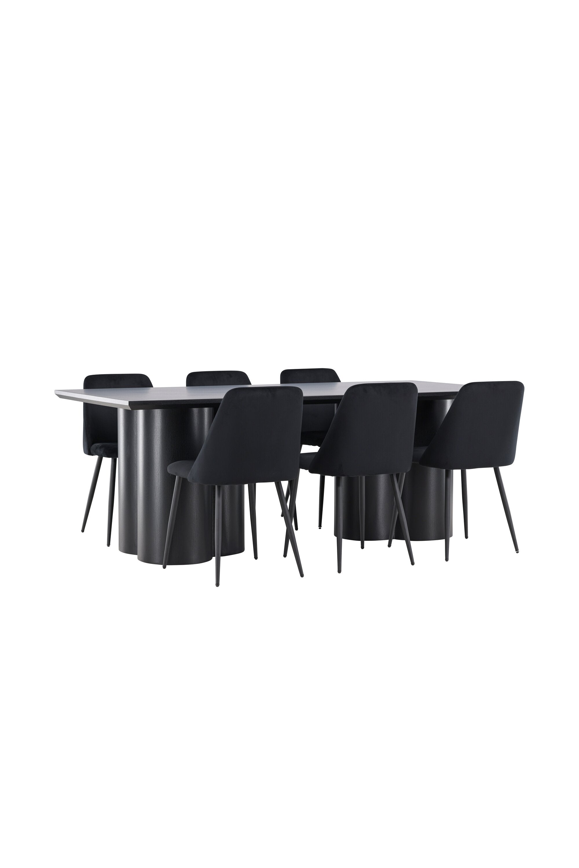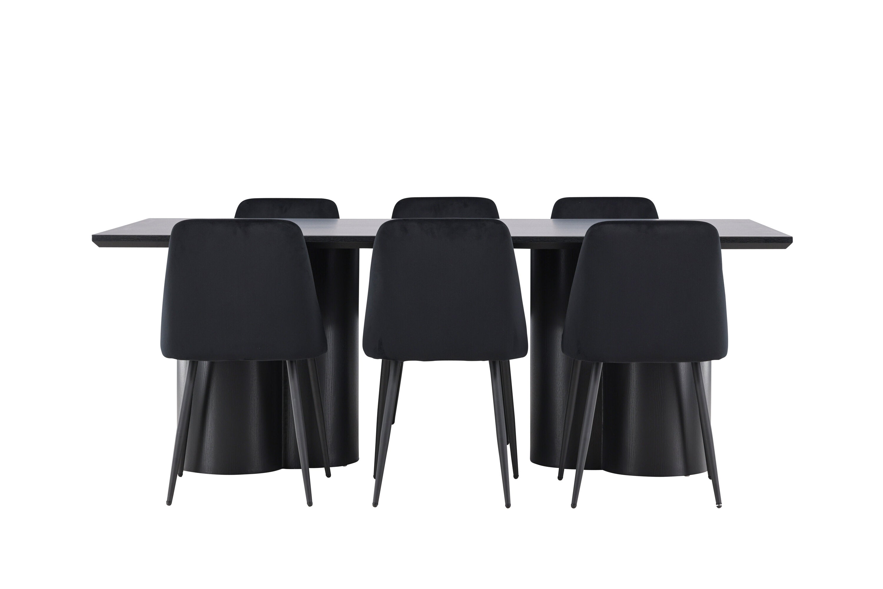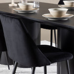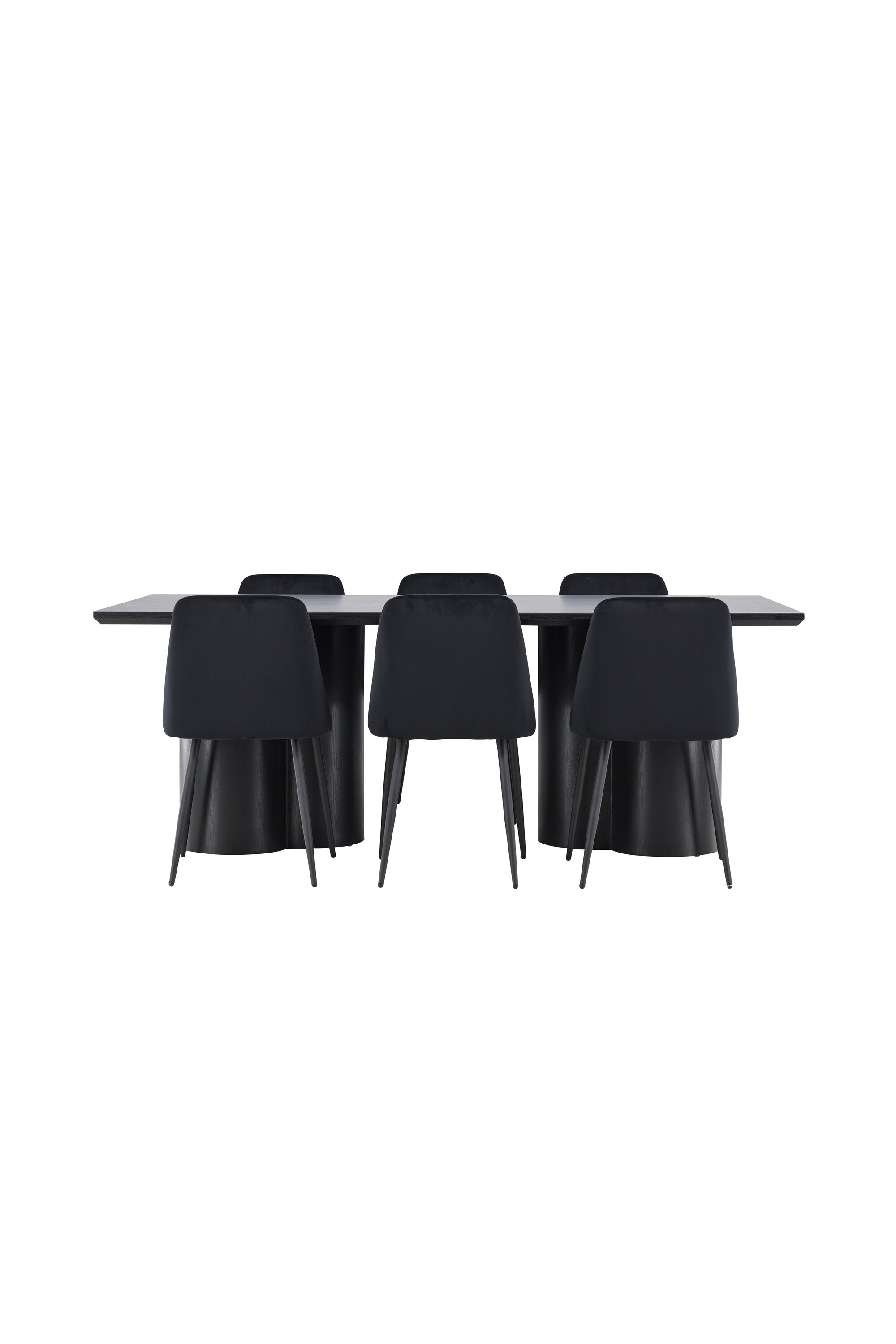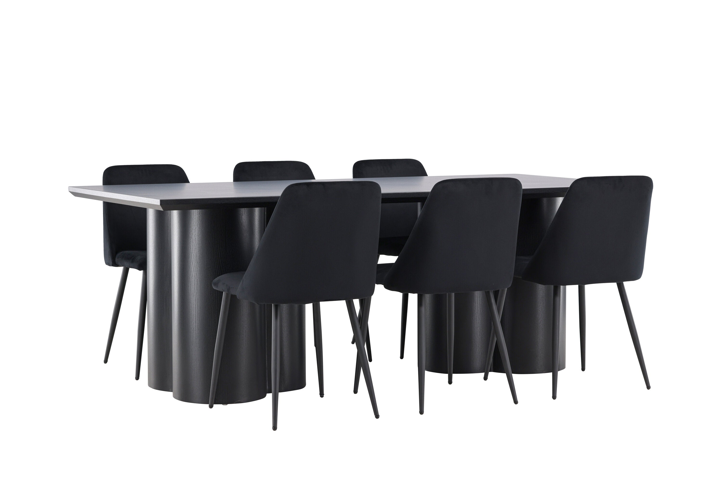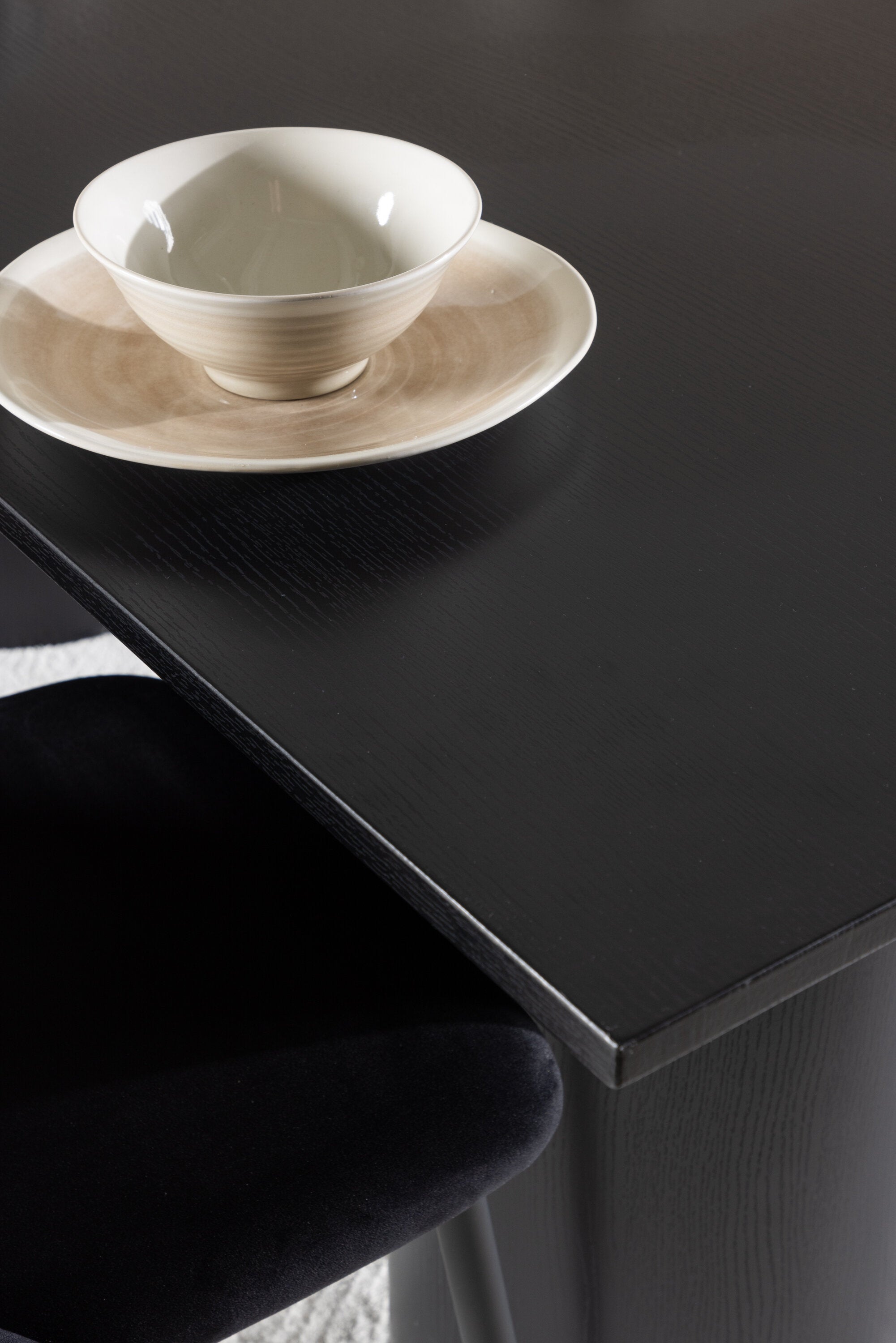 Objevte perfektní jídelní set s jídelní židlí ze série NIGHT a jídelním stolem Olivia - kombinaci, která vyzařuje eleganci i funkčnost pro váš domov. Jídelní židle ze série NIGHT je stejně pohodlná jako stylová s celočalouněným sedákem v černém sametu a ladícími nohami v černé barvě. Tato jídelní židle vytváří luxusní třpyt v místnosti a přispívá k příjemné a módní atmosféře. Mělo by to být skvělé sedět u lahodného jídla! Jídelní stůl Olivia se svými velkorysými rozměry 210x100 cm je perfektní pro vítání přátel a rodiny při společném jídle a posezení. Stůl v sofistikovaném černém odstínu vyzařuje eleganci a modernost a jeho robustní konstrukce zajišťuje dlouhodobou stabilitu. Dodejte své jídelně pocit luxusu a modernosti s jídelní židlí ze série NIGHT a jídelním stolem Olivia. Tento jídelní set vytváří harmonickou atmosféru a zanechává trvalý dojem. Tato kombinace je ideální jak pro každodenní večeři, tak pro slavnostní příležitosti, nabízí rovnováhu mezi nadčasovým designem a moderními detaily, díky čemuž je perfektní volbou pro všechna vaše společenská setkání.