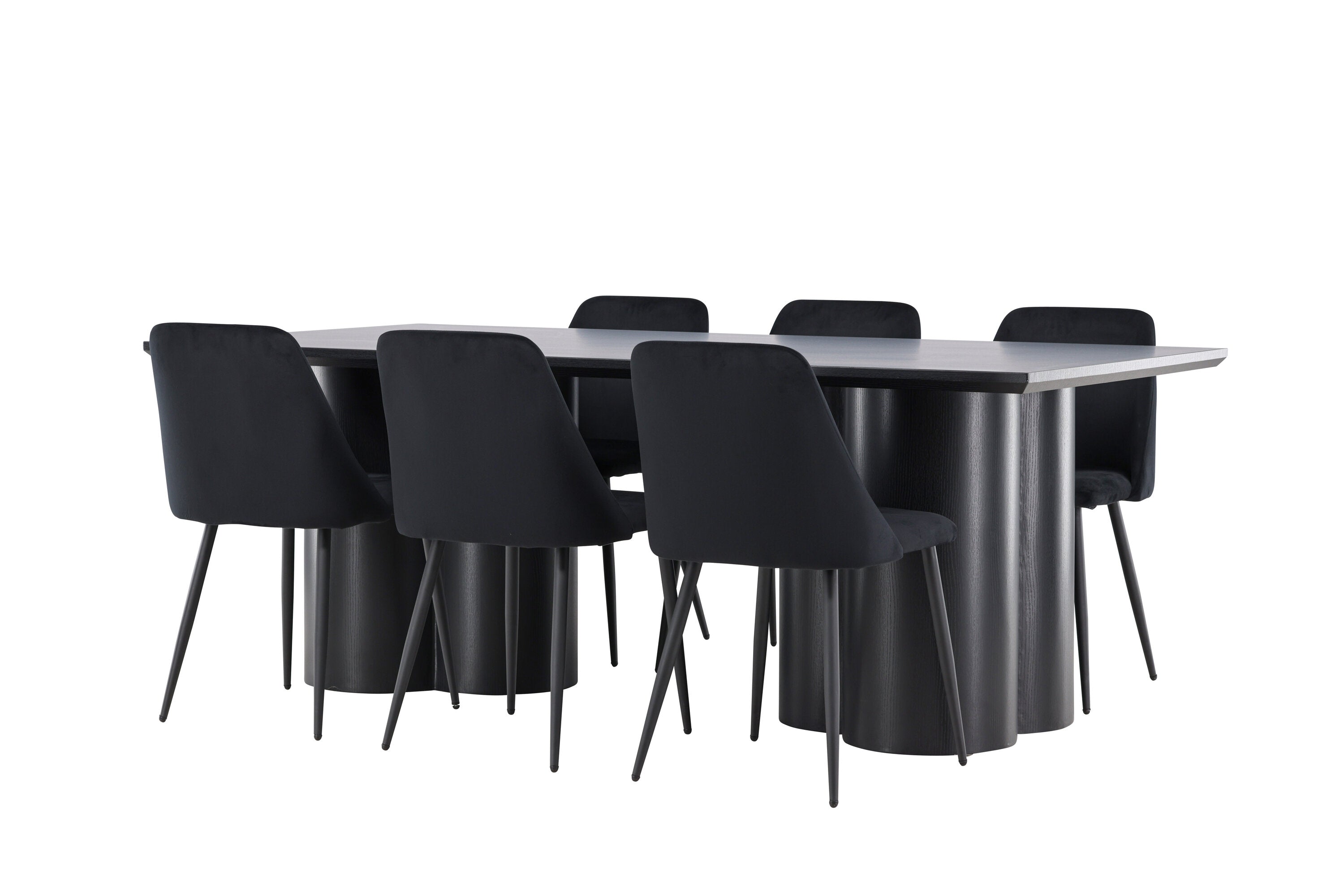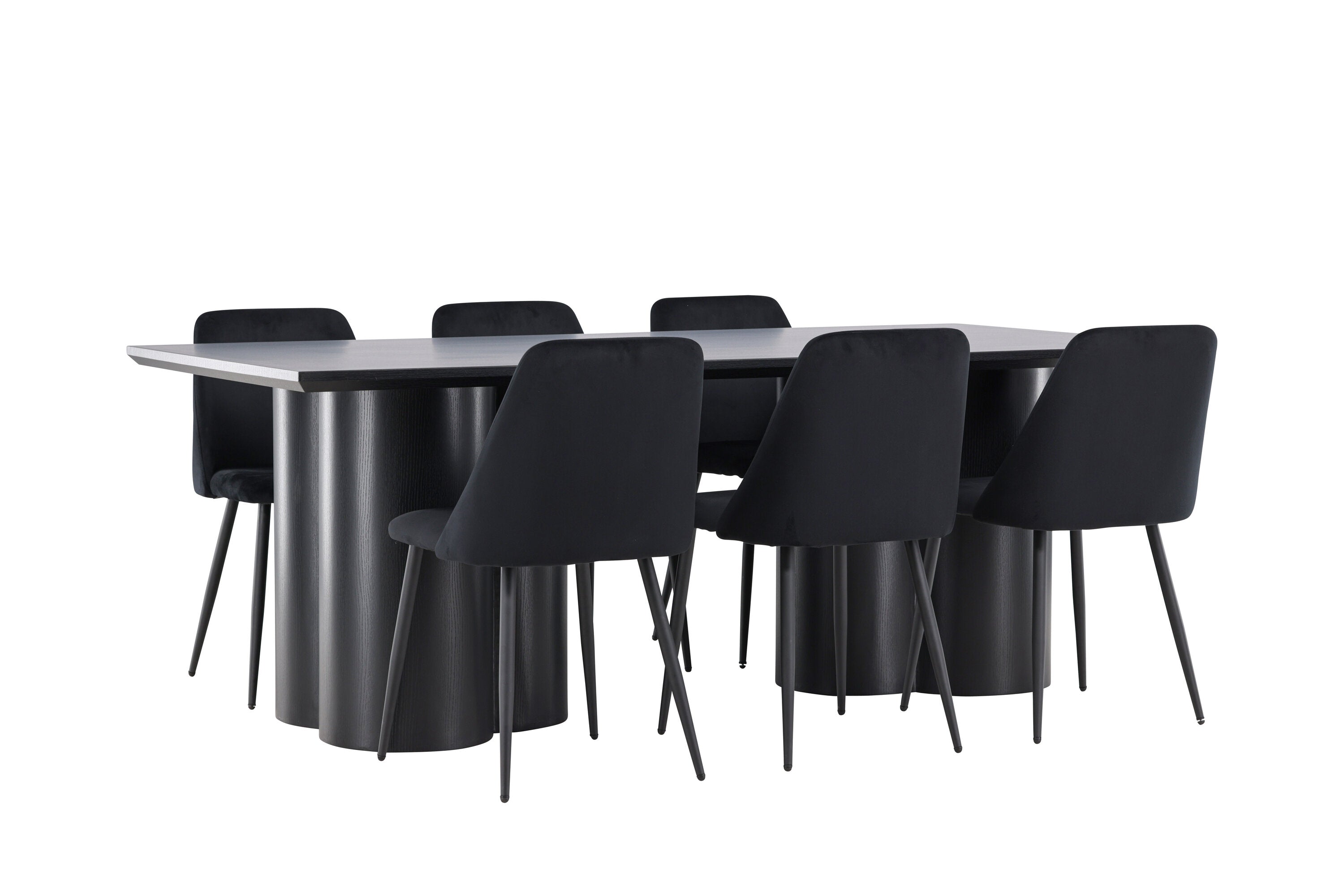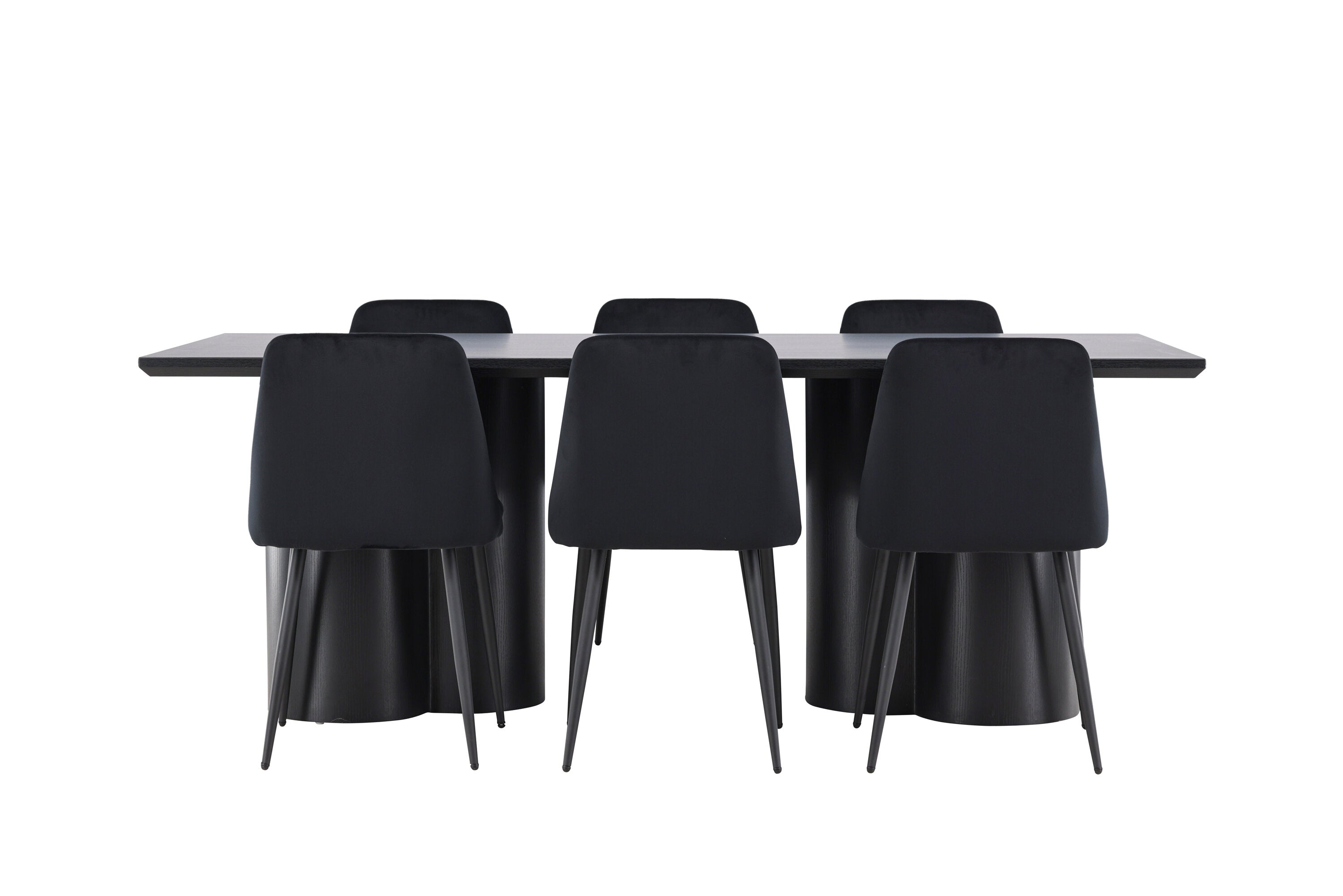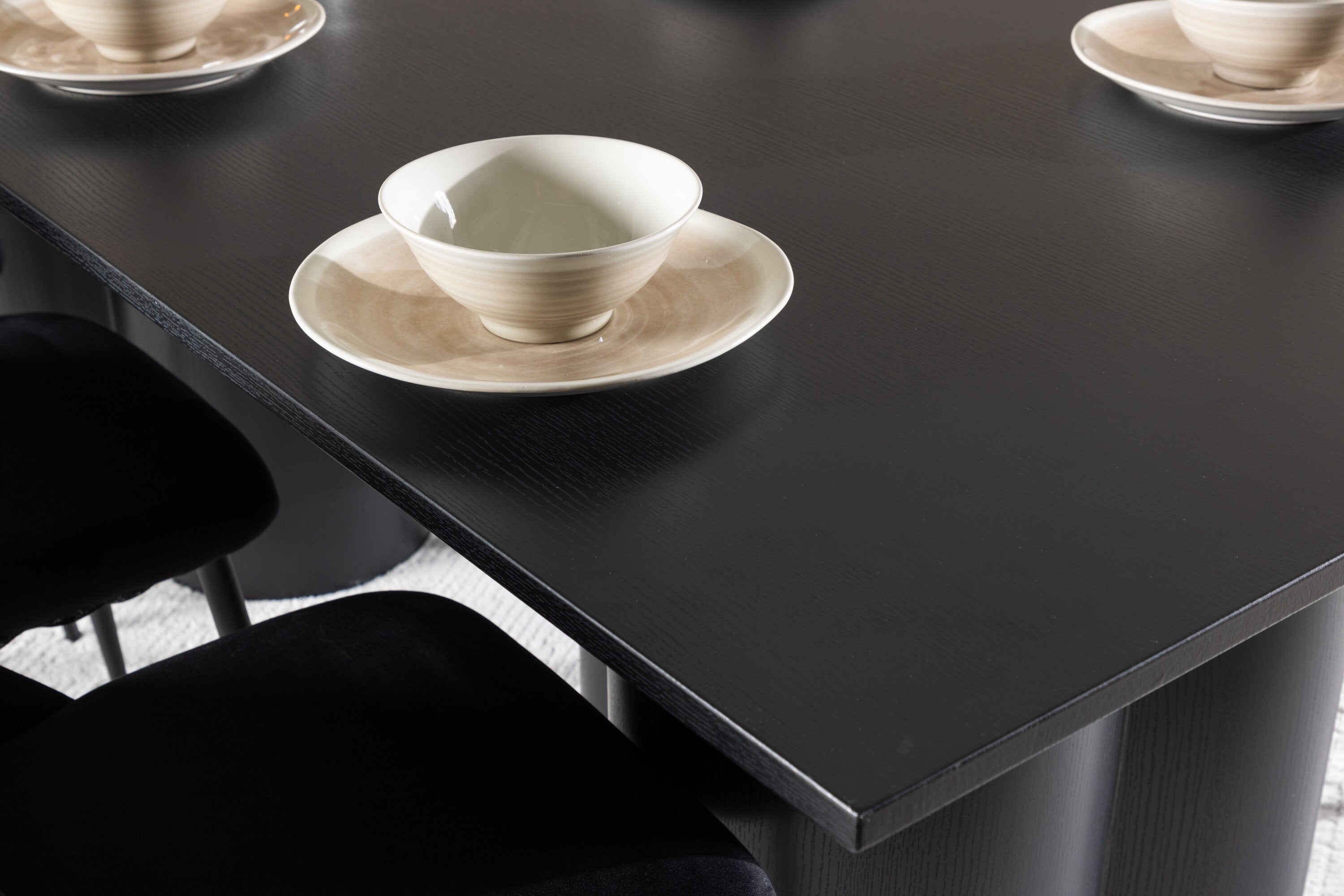 Objevte perfektní jídelní set s jídelní židlí ze série NIGHT a jídelním stolem Olivia - kombinaci, která vyzařuje eleganci i funkčnost pro váš domov. Jídelní židle ze série NIGHT je stejně pohodlná jako stylová s celočalouněným sedákem v černém sametu a ladícími nohami v černé barvě. Tato jídelní židle vytváří luxusní třpyt v místnosti a přispívá k příjemné a módní atmosféře. Mělo by to být skvělé sedět u lahodného jídla! Jídelní stůl Olivia se svými velkorysými rozměry 210x100 cm je perfektní pro vítání přátel a rodiny při společném jídle a posezení. Stůl v sofistikovaném černém odstínu vyzařuje eleganci a modernost a jeho robustní konstrukce zajišťuje dlouhodobou stabilitu. Dodejte své jídelně pocit luxusu a modernosti s jídelní židlí ze série NIGHT a jídelním stolem Olivia. Tento jídelní set vytváří harmonickou atmosféru a zanechává trvalý dojem. Tato kombinace je ideální jak pro každodenní večeři, tak pro slavnostní příležitosti, nabízí rovnováhu mezi nadčasovým designem a moderními detaily, díky čemuž je perfektní volbou pro všechna vaše společenská setkání.