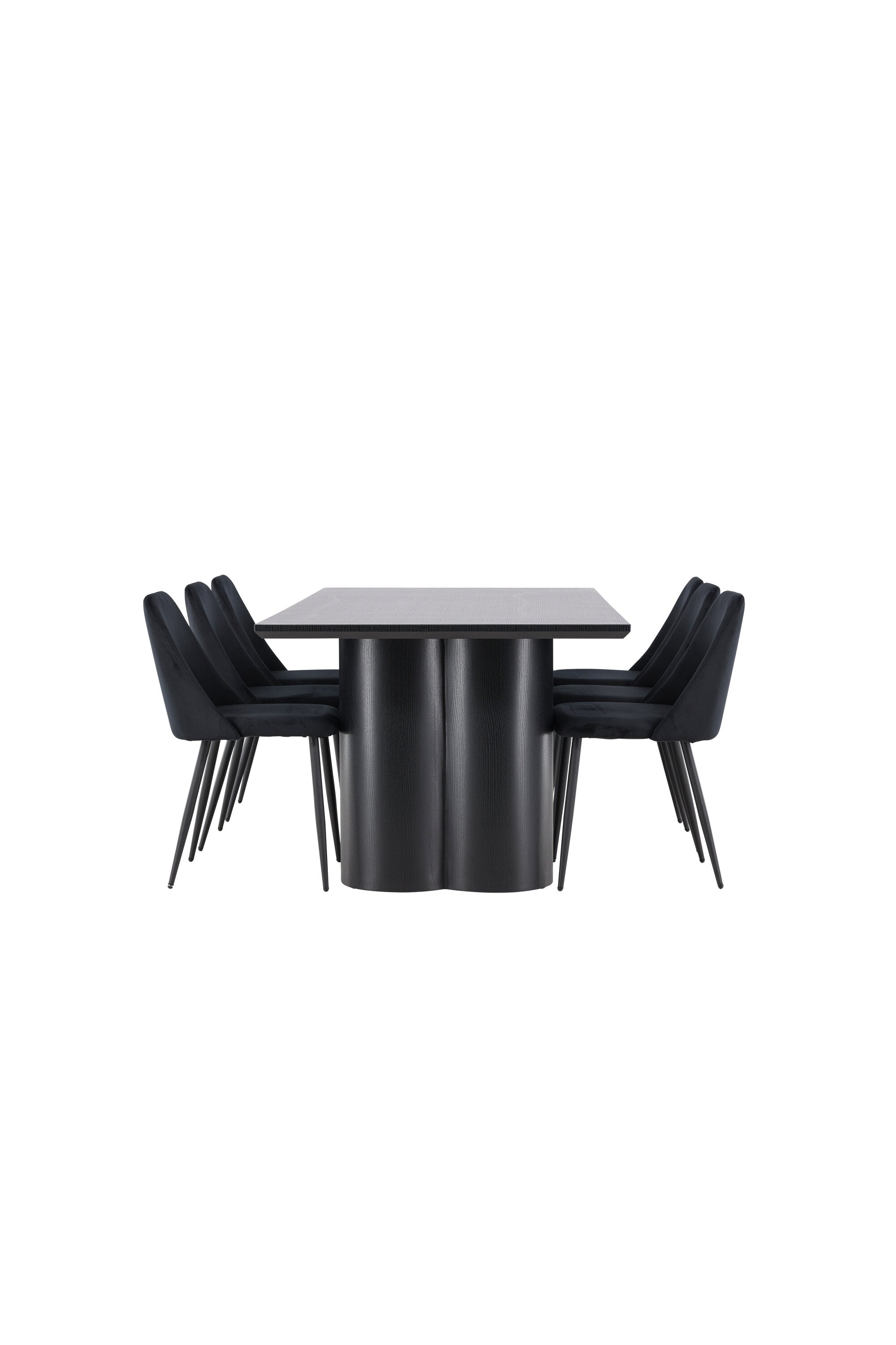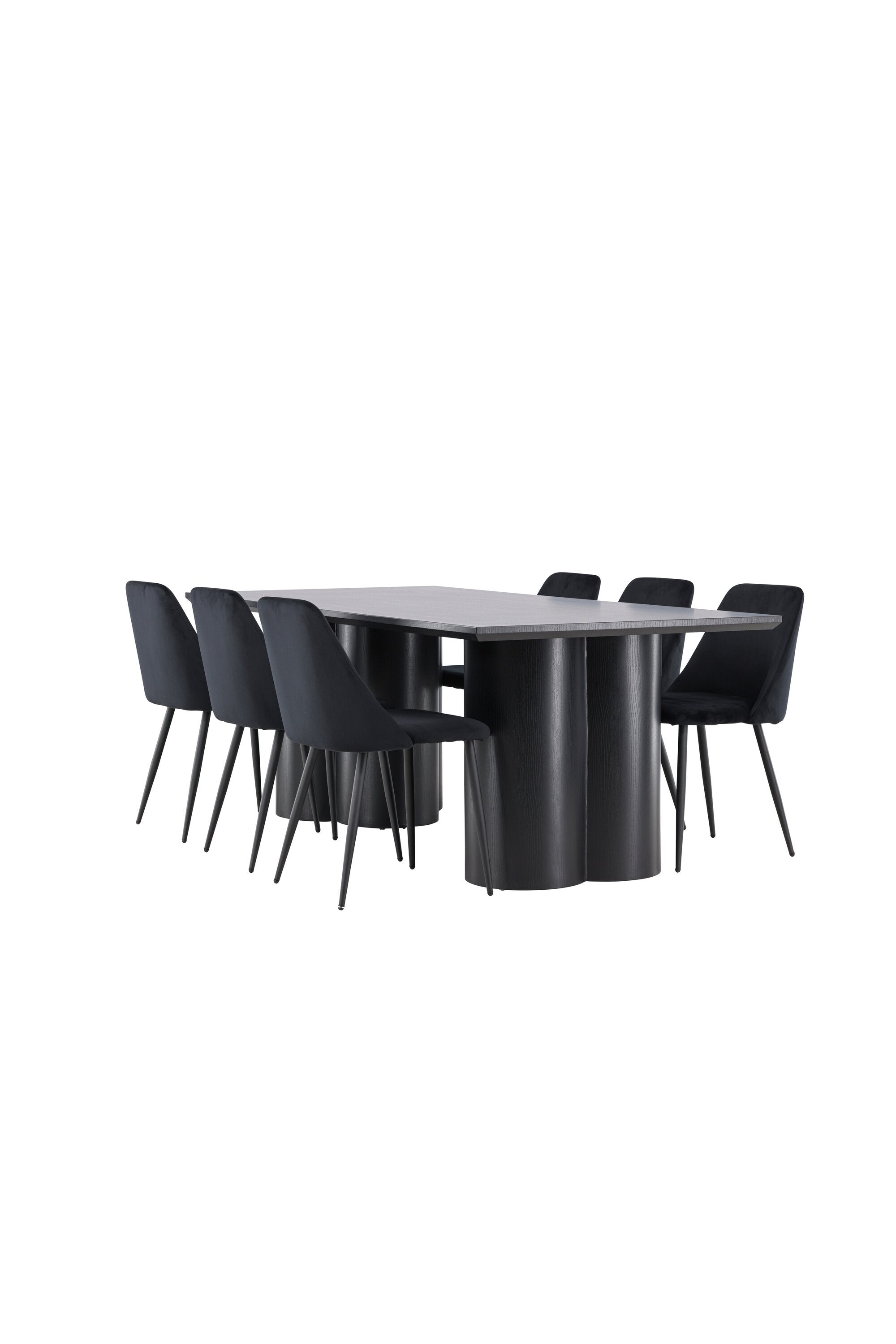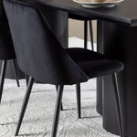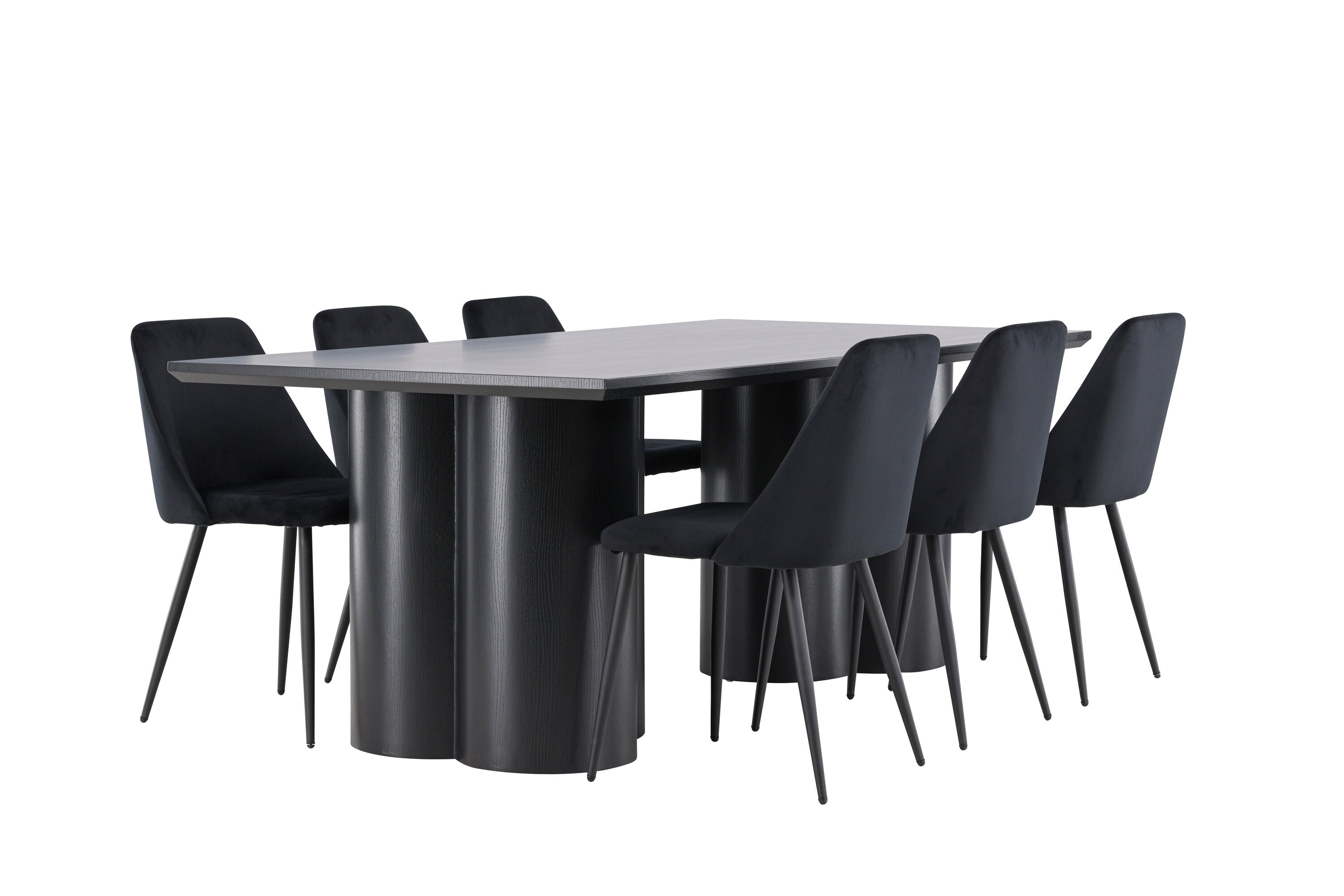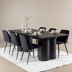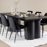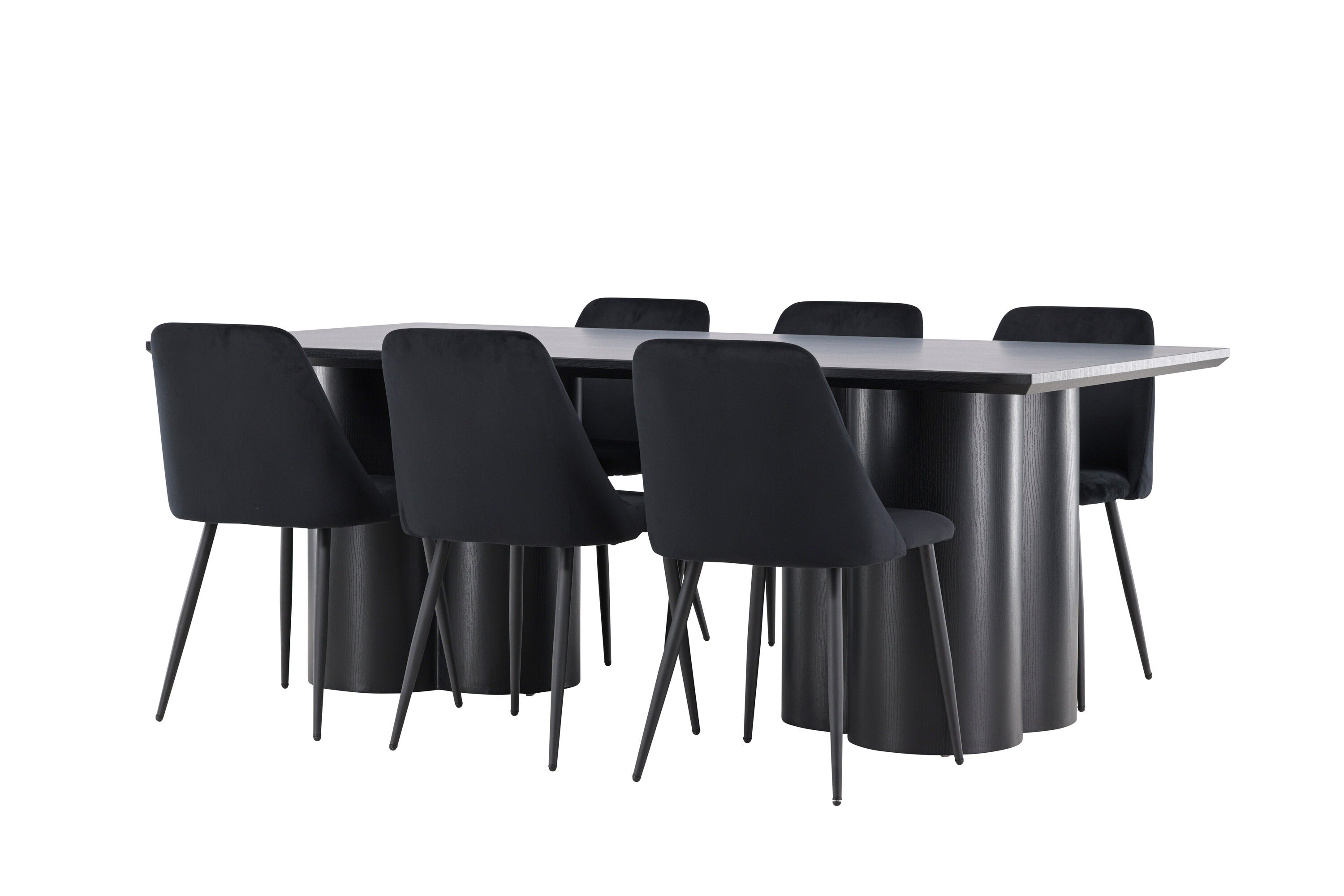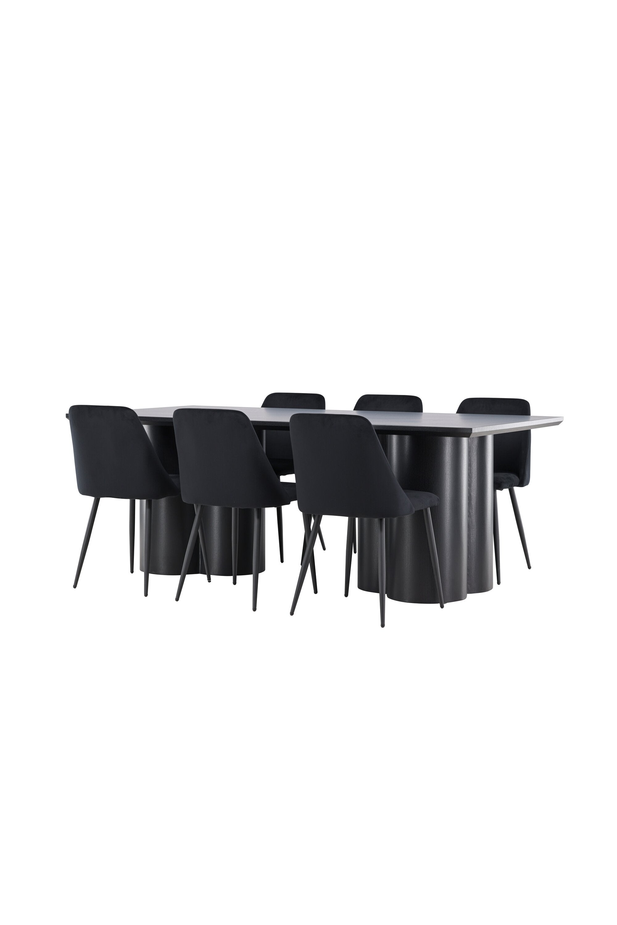 Objevte perfektní jídelní set s jídelní židlí ze série NIGHT a jídelním stolem Olivia - kombinaci, která vyzařuje eleganci i funkčnost pro váš domov. Jídelní židle ze série NIGHT je stejně pohodlná jako stylová s celočalouněným sedákem v černém sametu a ladícími nohami v černé barvě. Tato jídelní židle vytváří luxusní třpyt v místnosti a přispívá k příjemné a módní atmosféře. Mělo by to být skvělé sedět u lahodného jídla! Jídelní stůl Olivia se svými velkorysými rozměry 210x100 cm je perfektní pro vítání přátel a rodiny při společném jídle a posezení. Stůl v sofistikovaném černém odstínu vyzařuje eleganci a modernost a jeho robustní konstrukce zajišťuje dlouhodobou stabilitu. Dodejte své jídelně pocit luxusu a modernosti s jídelní židlí ze série NIGHT a jídelním stolem Olivia. Tento jídelní set vytváří harmonickou atmosféru a zanechává trvalý dojem. Tato kombinace je ideální jak pro každodenní večeři, tak pro slavnostní příležitosti, nabízí rovnováhu mezi nadčasovým designem a moderními detaily, díky čemuž je perfektní volbou pro všechna vaše společenská setkání.