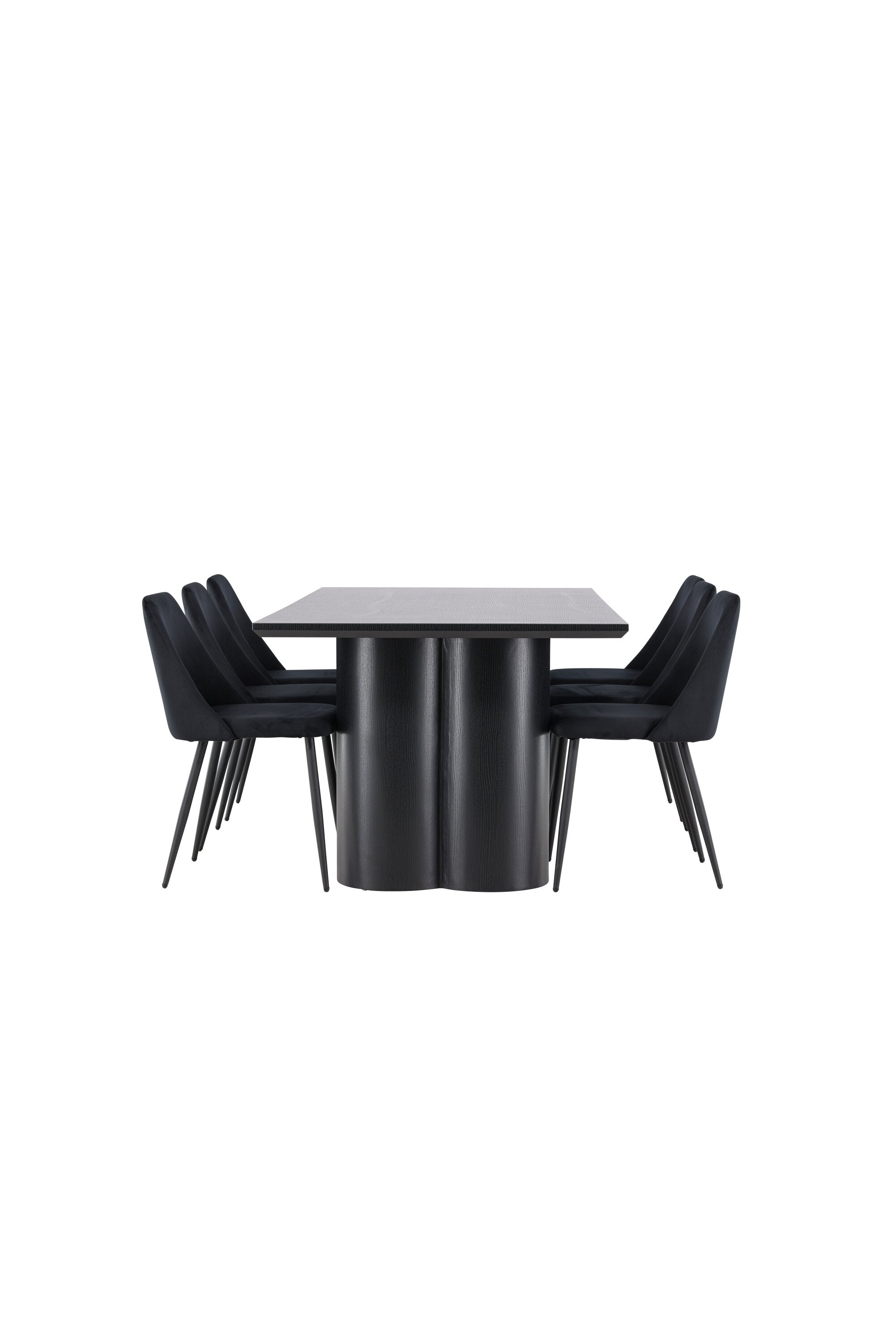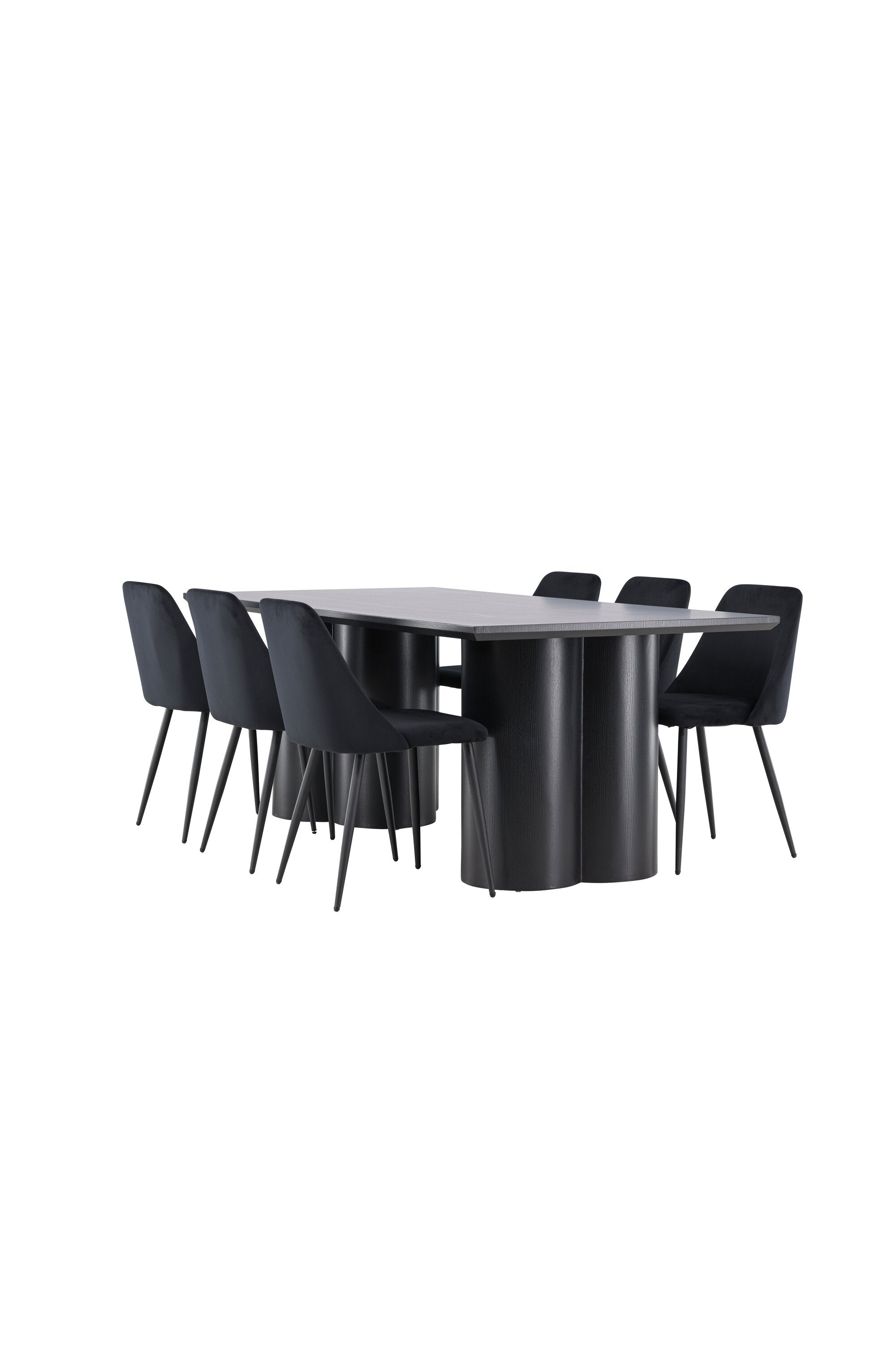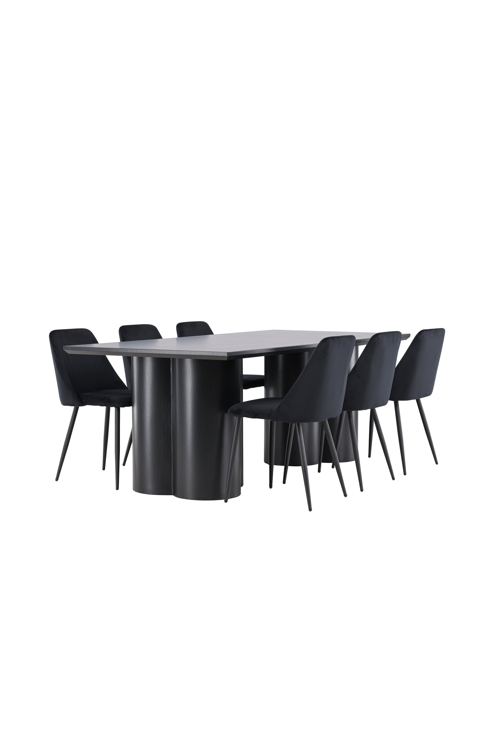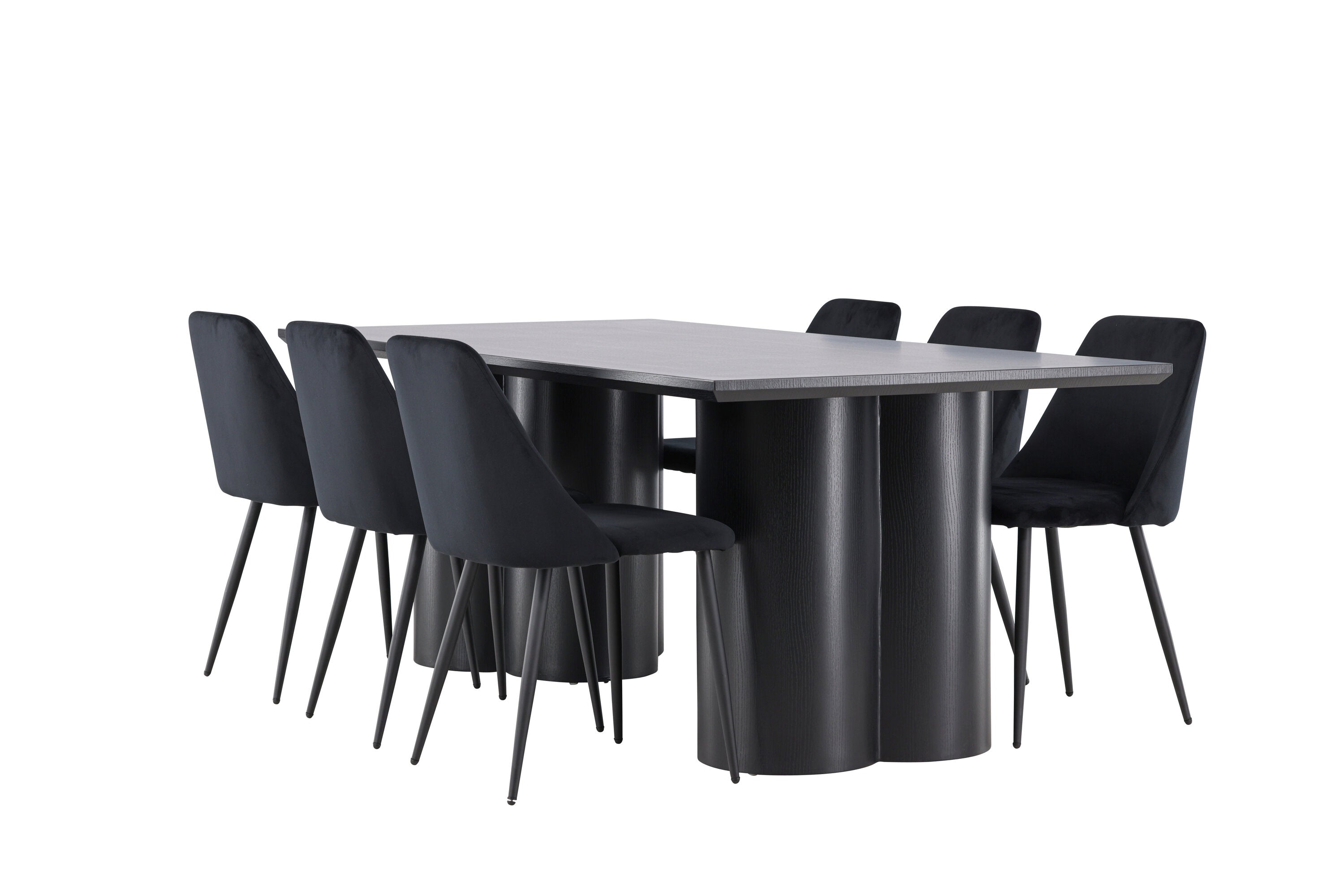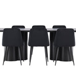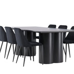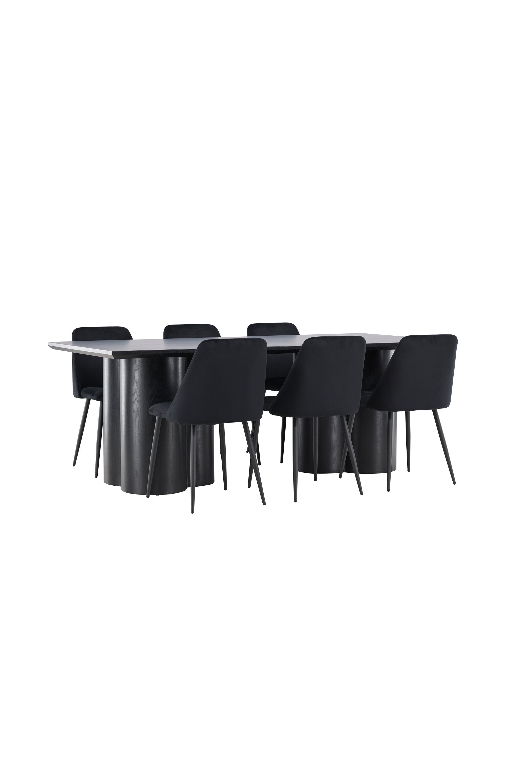 Objevte perfektní jídelní set s jídelní židlí ze série NIGHT a jídelním stolem Olivia - kombinaci, která vyzařuje eleganci i funkčnost pro váš domov. Jídelní židle ze série NIGHT je stejně pohodlná jako stylová s celočalouněným sedákem v černém sametu a ladícími nohami v černé barvě. Tato jídelní židle vytváří luxusní třpyt v místnosti a přispívá k příjemné a módní atmosféře. Mělo by to být skvělé sedět u lahodného jídla! Jídelní stůl Olivia se svými velkorysými rozměry 210x100 cm je perfektní pro vítání přátel a rodiny při společném jídle a posezení. Stůl v sofistikovaném černém odstínu vyzařuje eleganci a modernost a jeho robustní konstrukce zajišťuje dlouhodobou stabilitu. Dodejte své jídelně pocit luxusu a modernosti s jídelní židlí ze série NIGHT a jídelním stolem Olivia. Tento jídelní set vytváří harmonickou atmosféru a zanechává trvalý dojem. Tato kombinace je ideální jak pro každodenní večeři, tak pro slavnostní příležitosti, nabízí rovnováhu mezi nadčasovým designem a moderními detaily, díky čemuž je perfektní volbou pro všechna vaše společenská setkání.