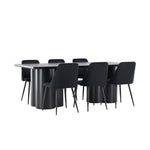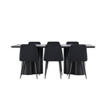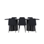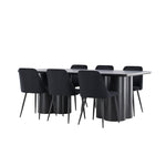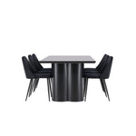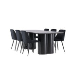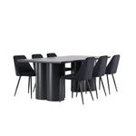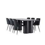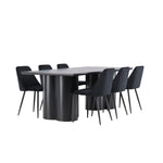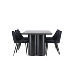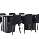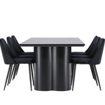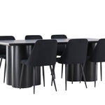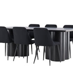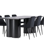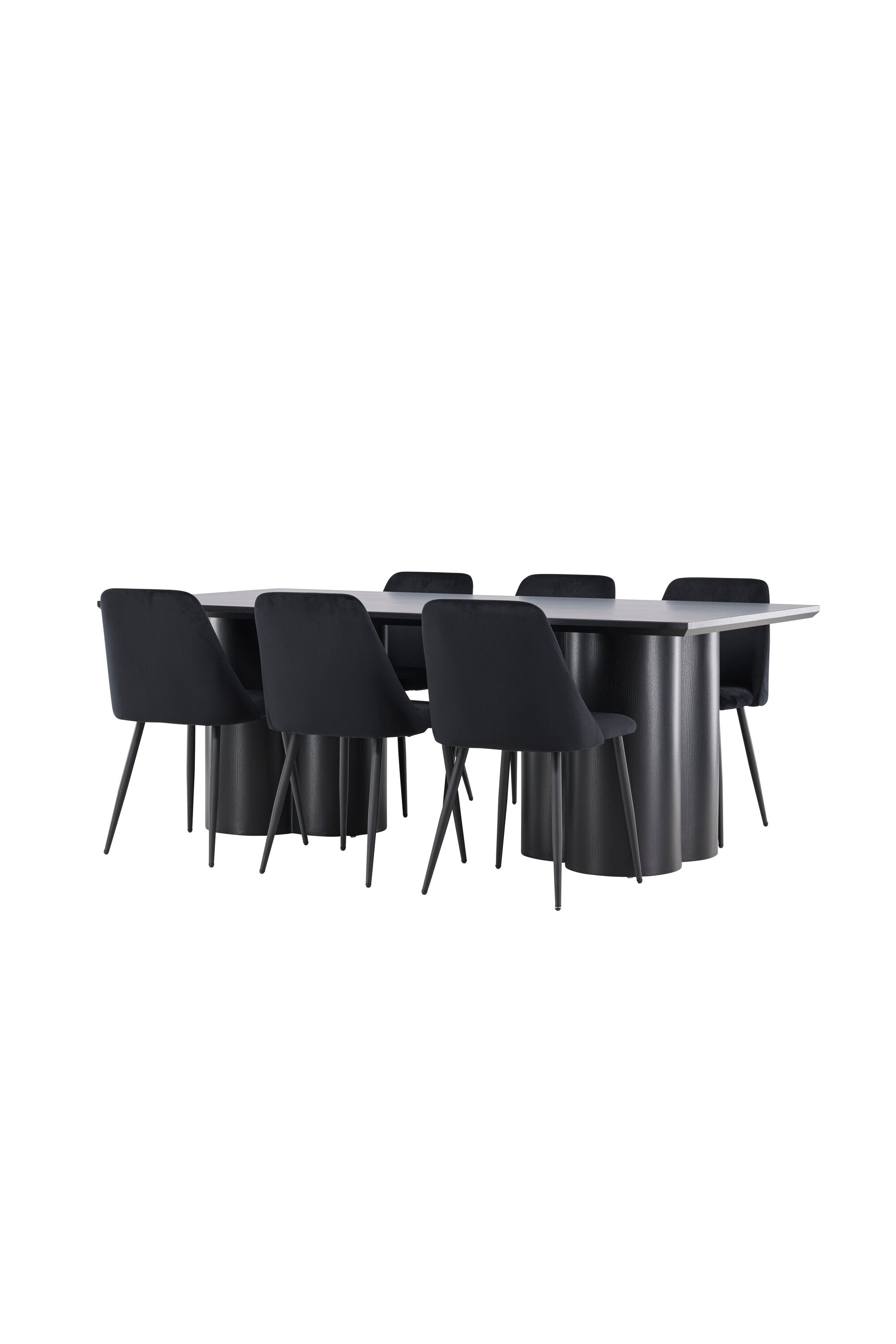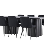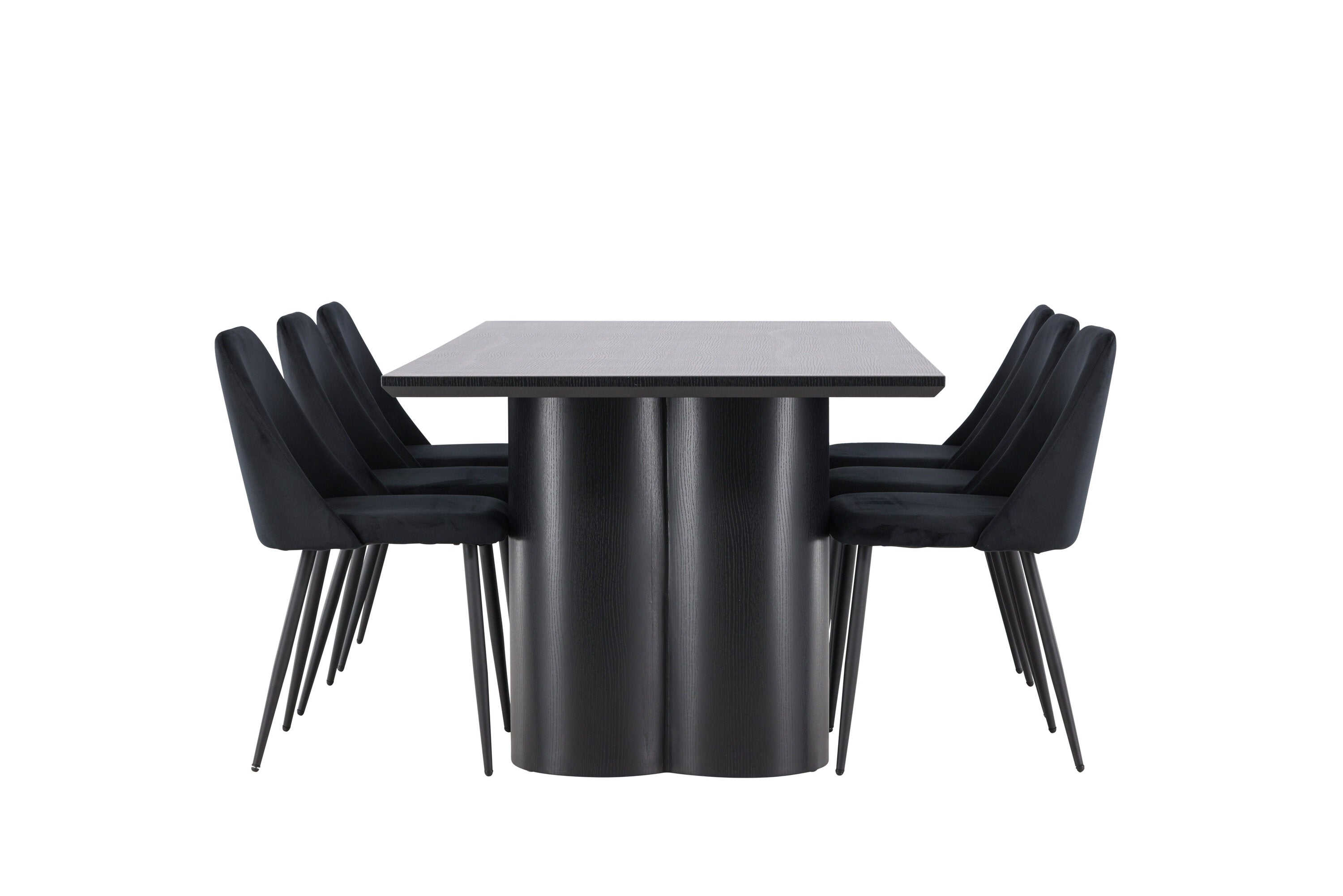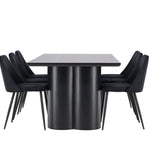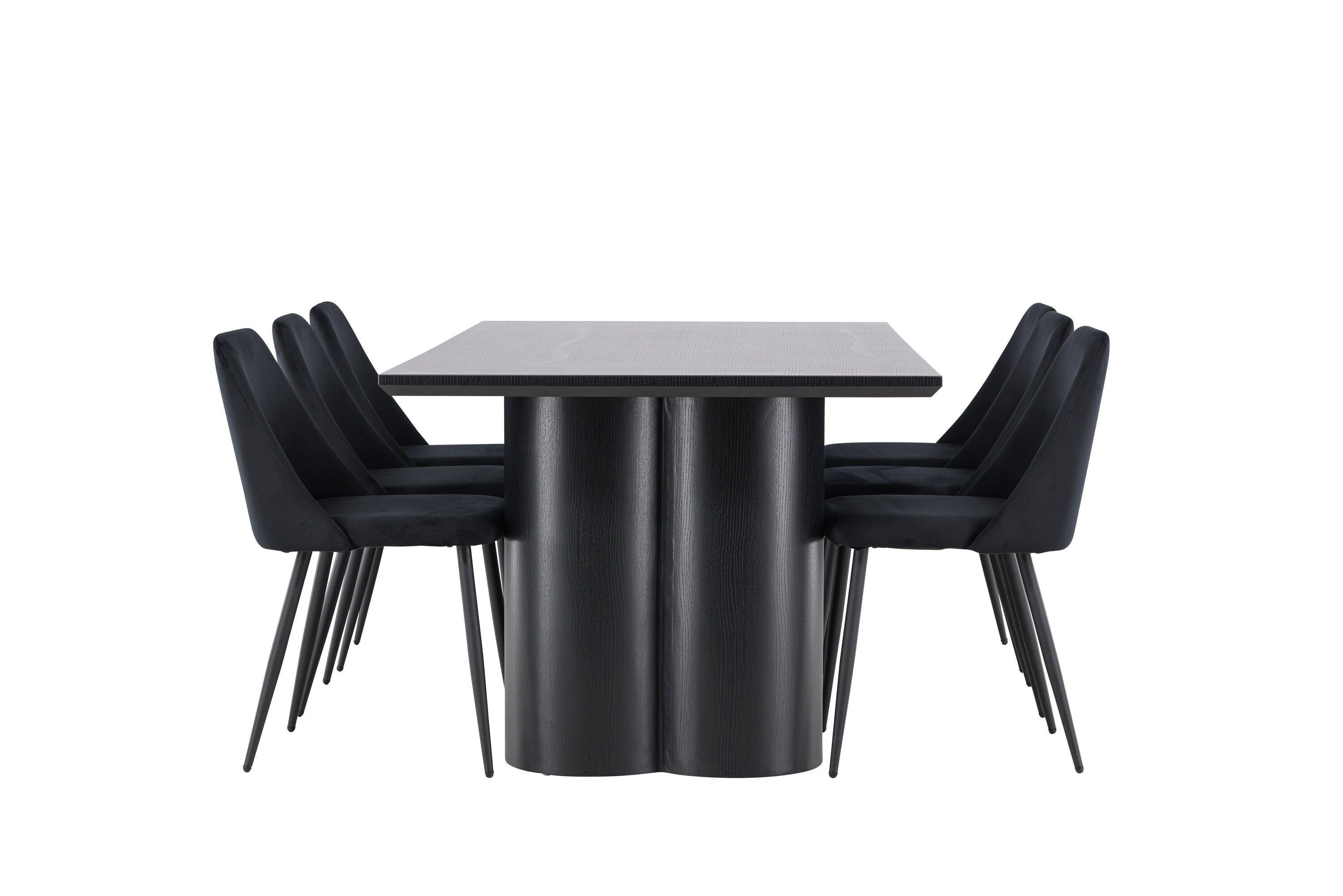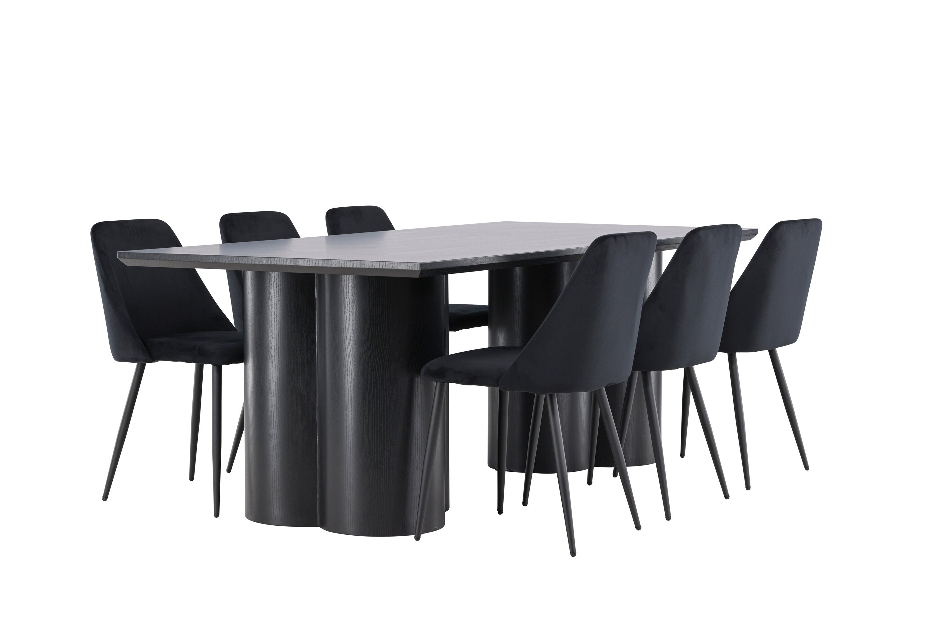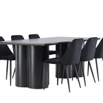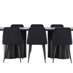 Objevte perfektní jídelní set s jídelní židlí ze série NIGHT a jídelním stolem Olivia - kombinaci, která vyzařuje eleganci i funkčnost pro váš domov. Jídelní židle ze série NIGHT je stejně pohodlná jako stylová s celočalouněným sedákem v černém sametu a ladícími nohami v černé barvě. Tato jídelní židle vytváří luxusní třpyt v místnosti a přispívá k příjemné a módní atmosféře. Mělo by to být skvělé sedět u lahodného jídla! Jídelní stůl Olivia se svými velkorysými rozměry 210x100 cm je perfektní pro vítání přátel a rodiny při společném jídle a posezení. Stůl v sofistikovaném černém odstínu vyzařuje eleganci a modernost a jeho robustní konstrukce zajišťuje dlouhodobou stabilitu. Dodejte své jídelně pocit luxusu a modernosti s jídelní židlí ze série NIGHT a jídelním stolem Olivia. Tento jídelní set vytváří harmonickou atmosféru a zanechává trvalý dojem. Tato kombinace je ideální jak pro každodenní večeři, tak pro slavnostní příležitosti, nabízí rovnováhu mezi nadčasovým designem a moderními detaily, díky čemuž je perfektní volbou pro všechna vaše společenská setkání.