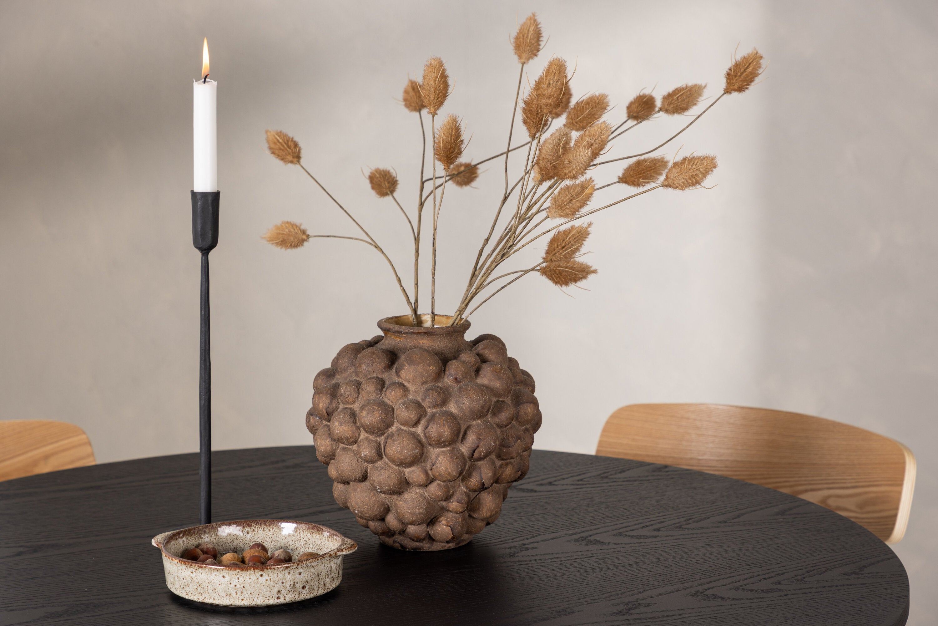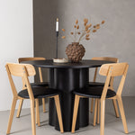 Kompletní jídelní skupina v odpovídajících barvách! Jídelní stůl Olivia zaujme svým skandinávským designem a vkusným designem. Stůl má celkově holistický design v štíhlé mocca barvě. Kulatá deska je z MDF a rám se skládá ze tří noh ve tvaru válce, které jsou shromážděny pod středem stolu. Zde společně s jídelními židlemi ze série Sanjos. Měkké sedadlo je čalouněno pěnou pro větší pohodlí a má stylovou PU látku v černé barvě. Opěradlo a nohy židle jsou vyrobeny ze světlého dřeva a působí dojmem klasického designu. Vytvořte si moderní poutač v obývacím pokoji!