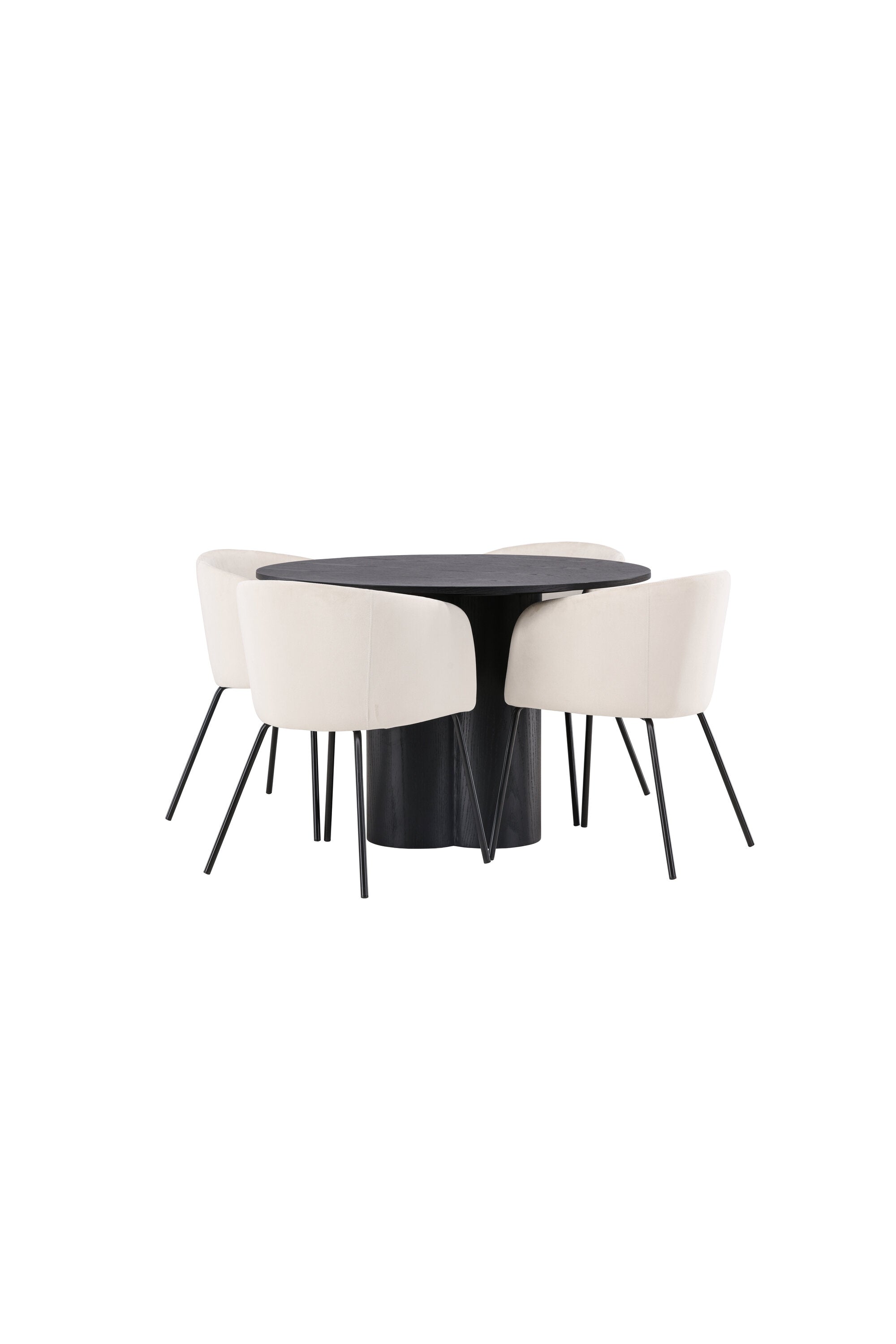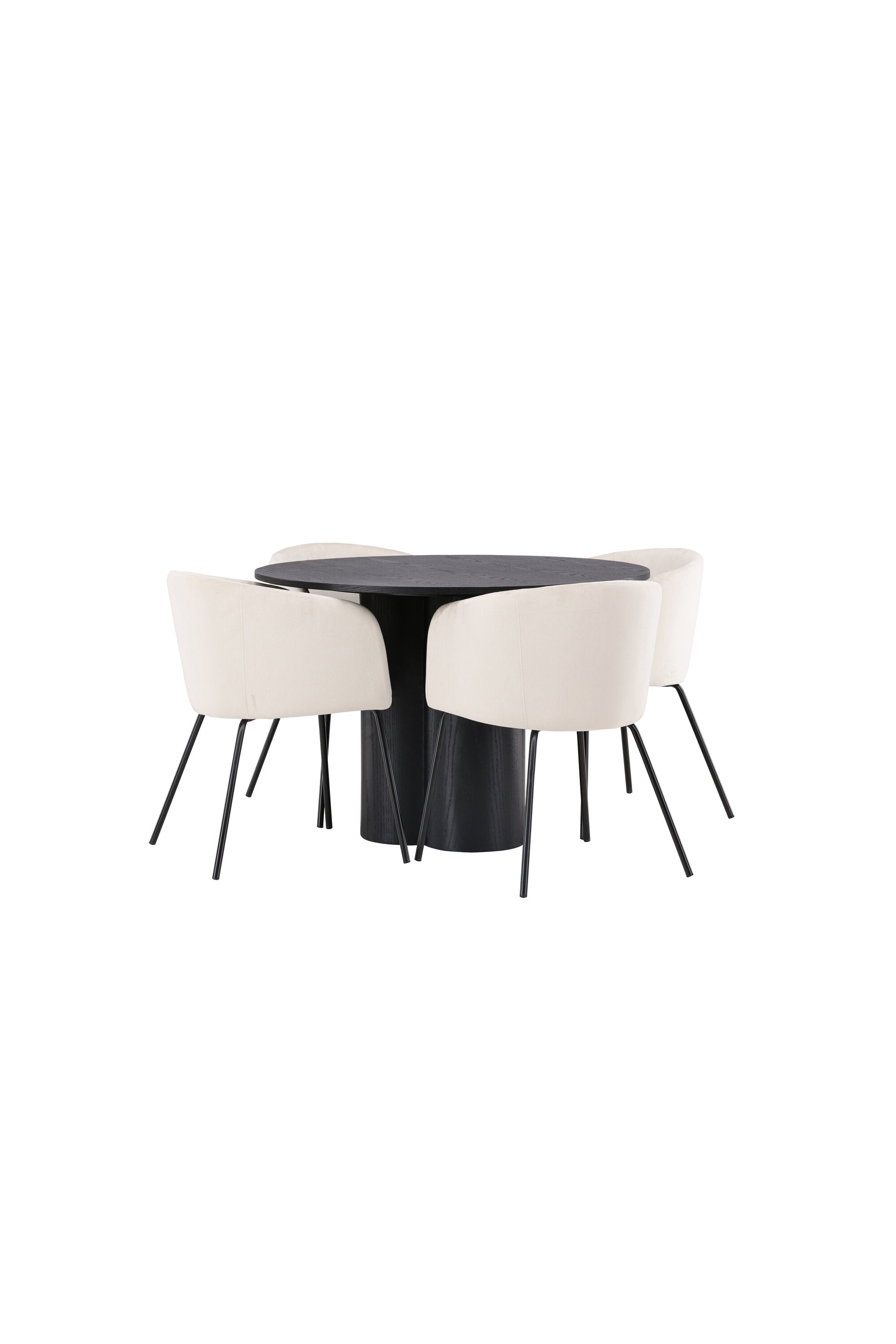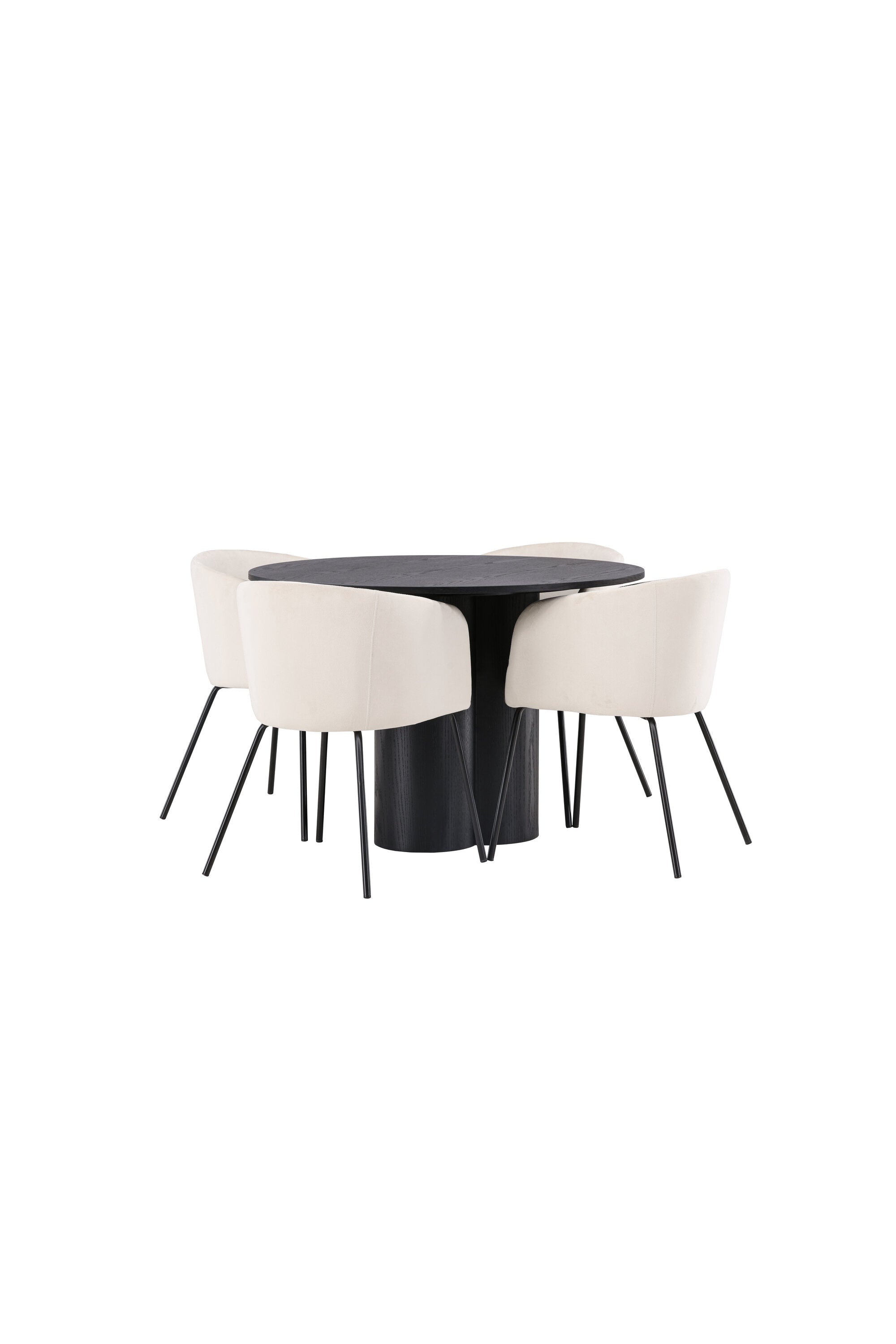 Stylová a chytrá jídelní skupina s měkkými tvary! Kulatý jídelní stůl Olivia zaujme svým skandinávským designem a robustním designem. Stůl má konzistentně holistický design v černé MDF s tenkou, kulatou deskou a třemi nohami ve tvaru válce, které jsou shromážděny pod středem stolu. Zde spolu s našimi nádhernými jídelními židlemi Berit. Židle má celočalouněný design s mírně zaobleným opěradlem a sedákem ze sametové látky a úzkými nohami z černého železa. Stejně moderní jako příjemné! Rozměry stolu: 110 cm.