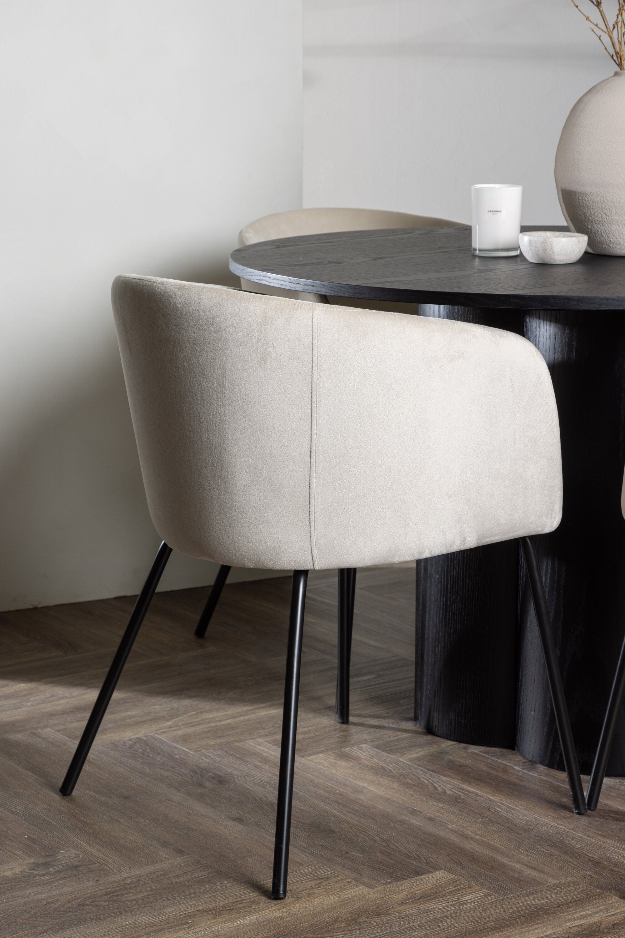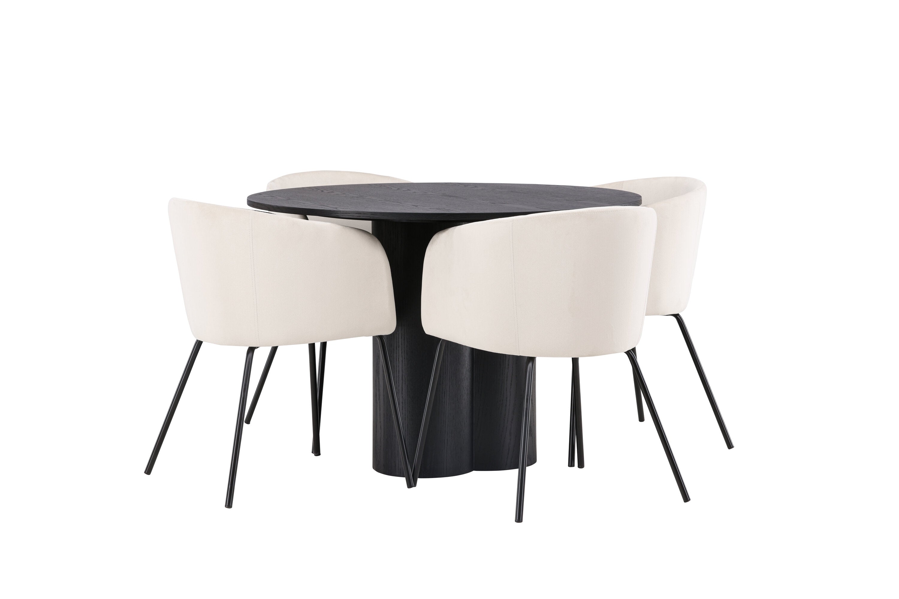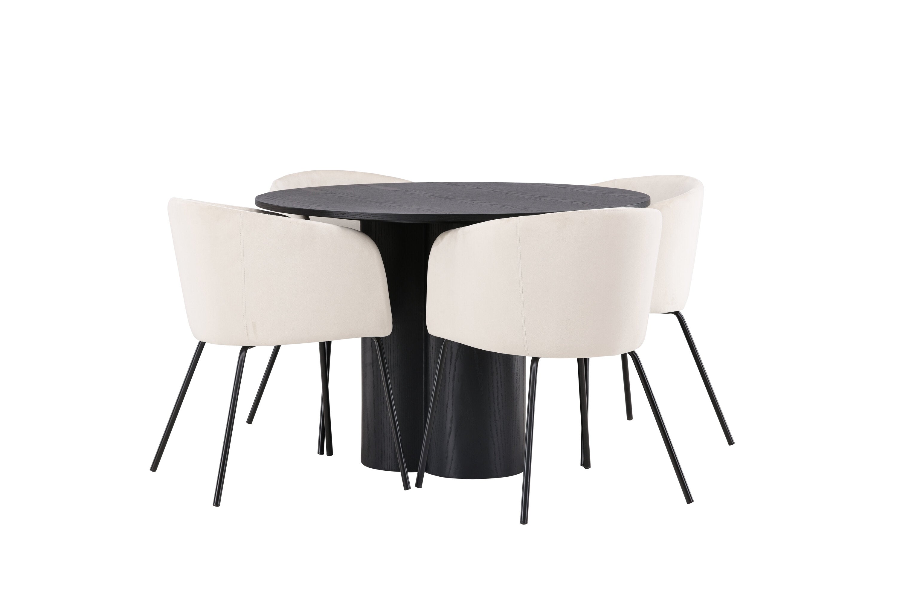 Stylová a chytrá jídelní skupina s měkkými tvary! Kulatý jídelní stůl Olivia zaujme svým skandinávským designem a robustním designem. Stůl má konzistentně holistický design v černé MDF s tenkou, kulatou deskou a třemi nohami ve tvaru válce, které jsou shromážděny pod středem stolu. Zde spolu s našimi nádhernými jídelními židlemi Berit. Židle má celočalouněný design s mírně zaobleným opěradlem a sedákem ze sametové látky a úzkými nohami z černého železa. Stejně moderní jako příjemné! Rozměry stolu: 110 cm.