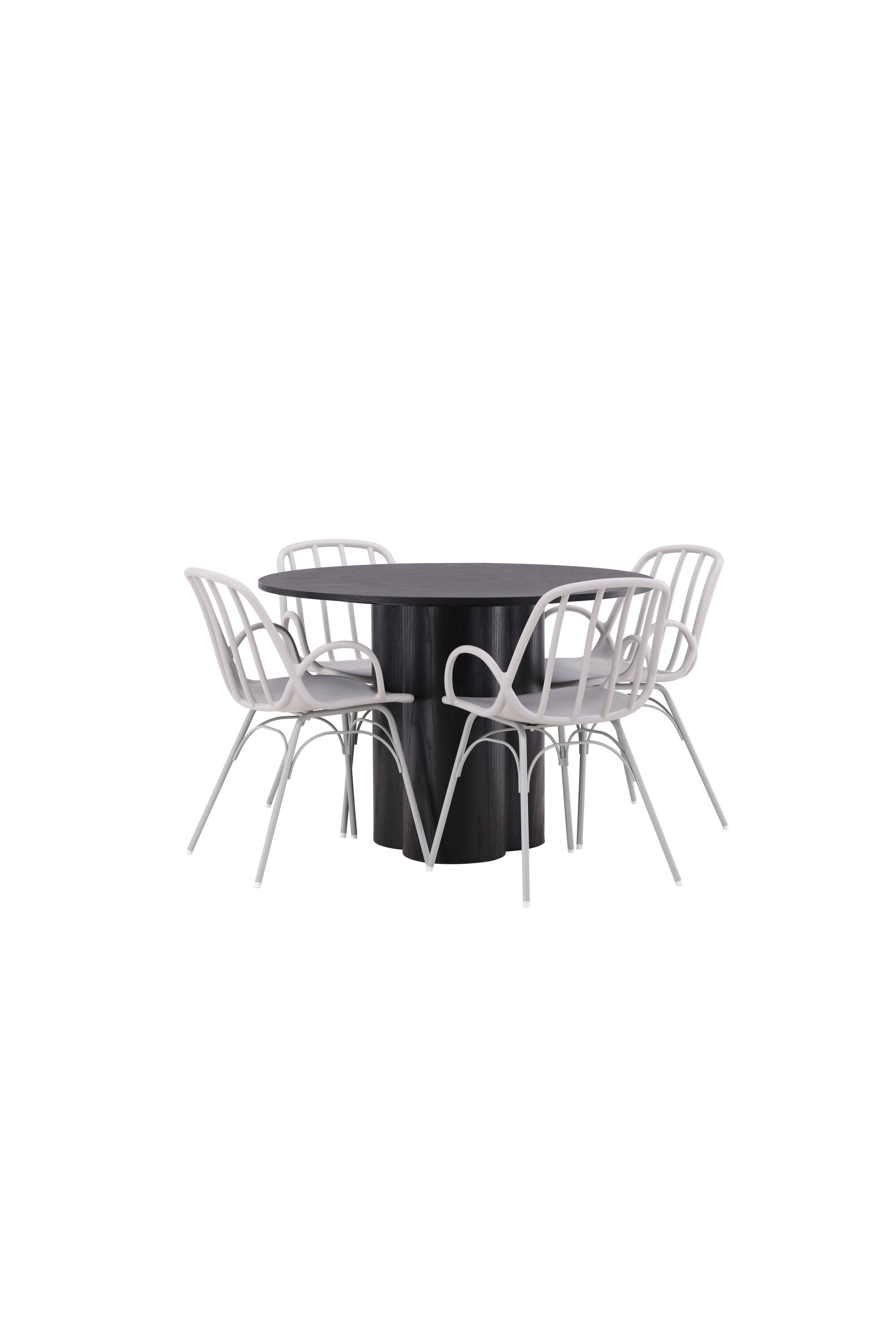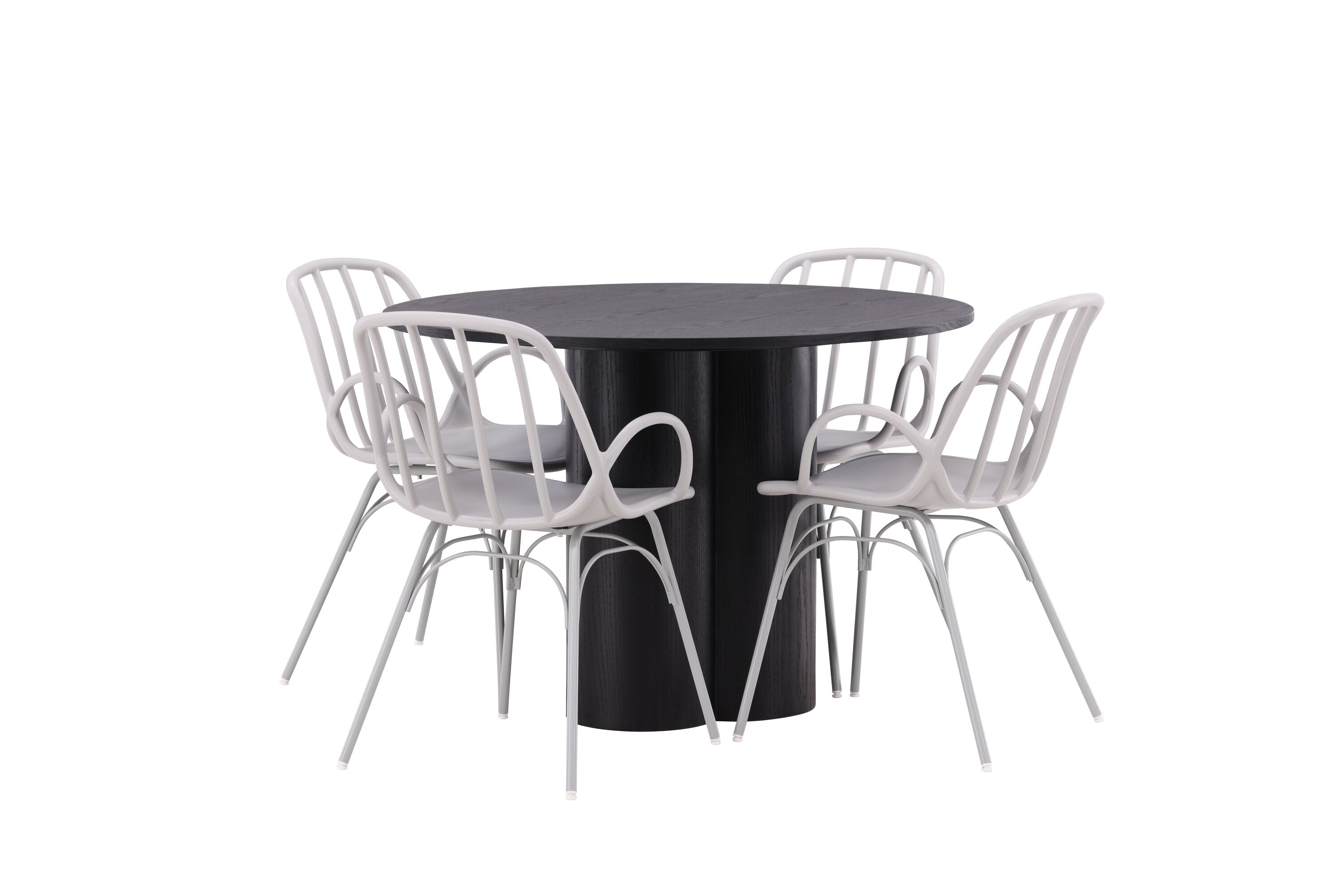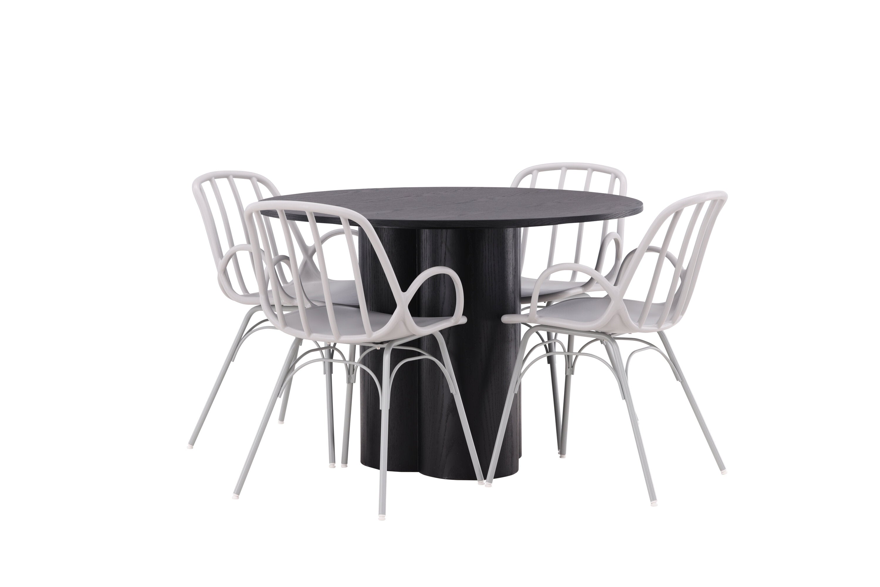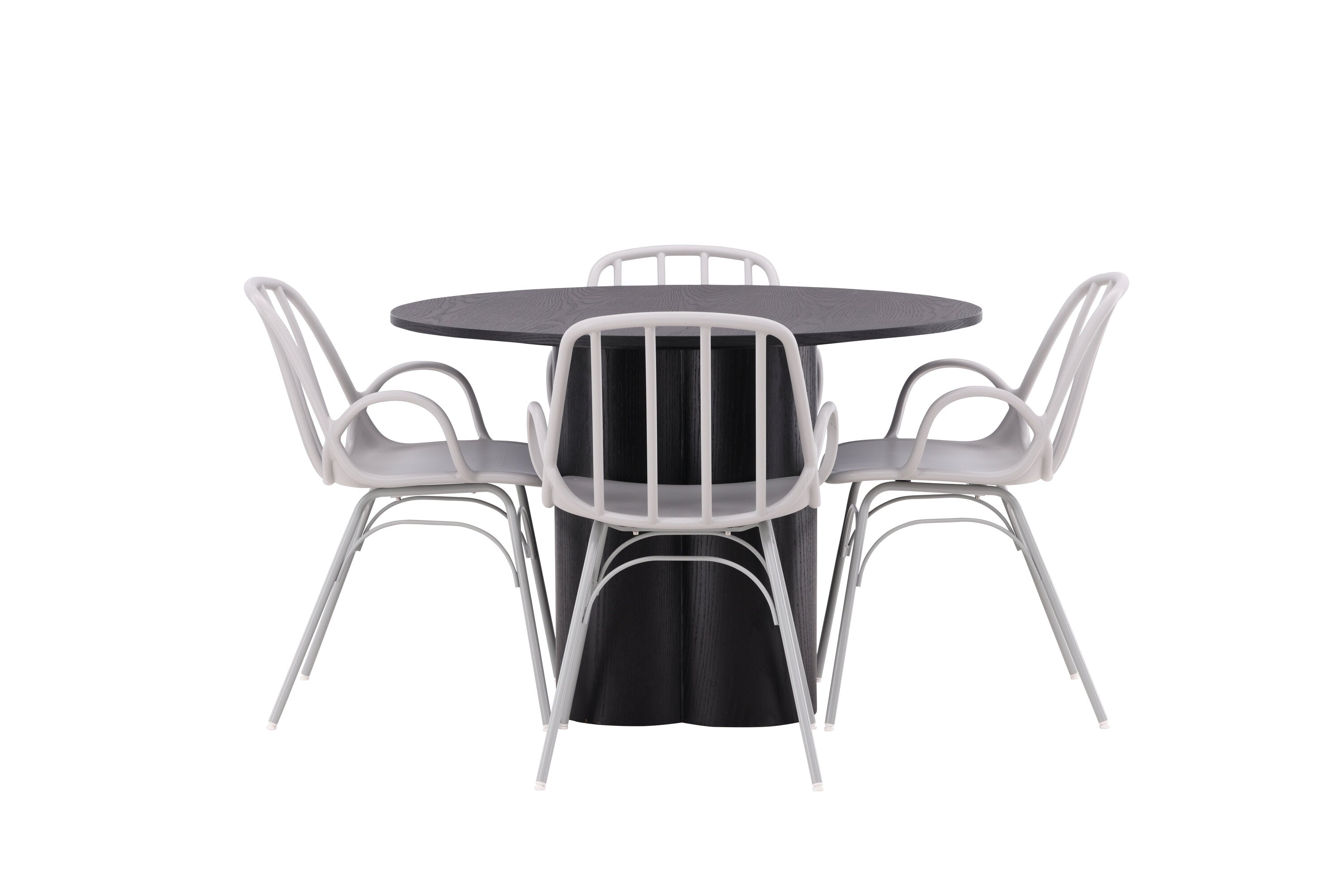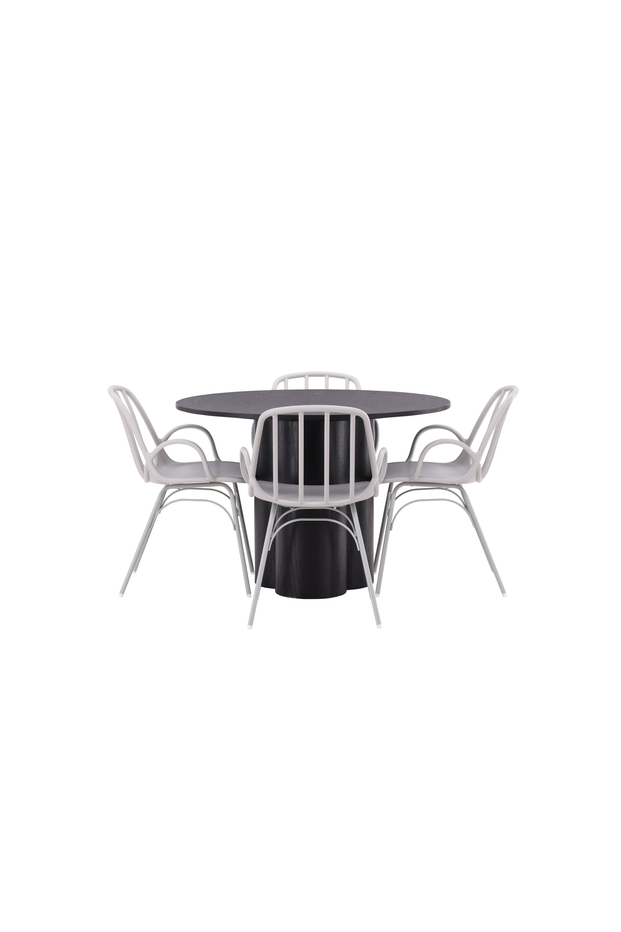 Je to zápas! Vychutnejte si příjemná jídla u našeho oblíbeného jídelního stolu Olivia. Stůl má celý holistický design v černé MDF s tenkou, kulatou deskou a třemi nohami ve tvaru válce, které jsou shromážděny pod středem stolu. Barva má na dýhované desce světlý obal, díky kterému je viditelný vzor materiálu. Zde společně s odolnými jídelními židlemi ze série Dyrön. Tato židle má detailní design se zakřivenými tvary, integrovanými područkami a rozšířenými nohami, důsledně vyrobena z odolného plastu a oceli v štíhlé šedé barvě. Vytvořte si moderní poutač v obývacím pokoji!