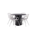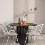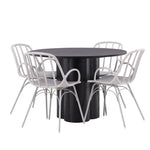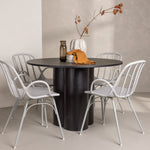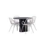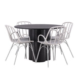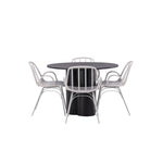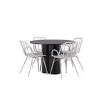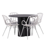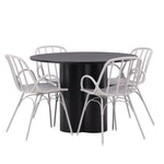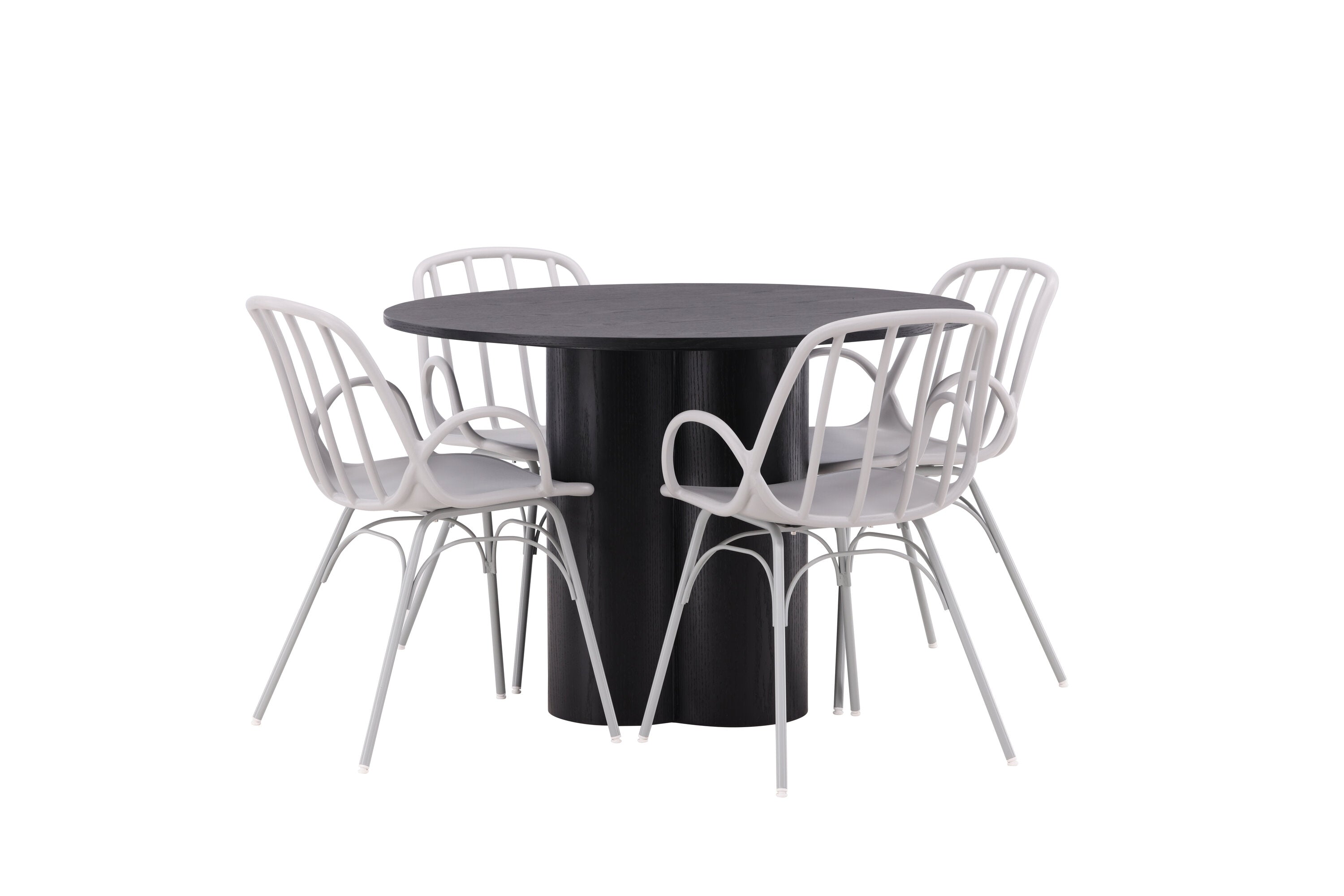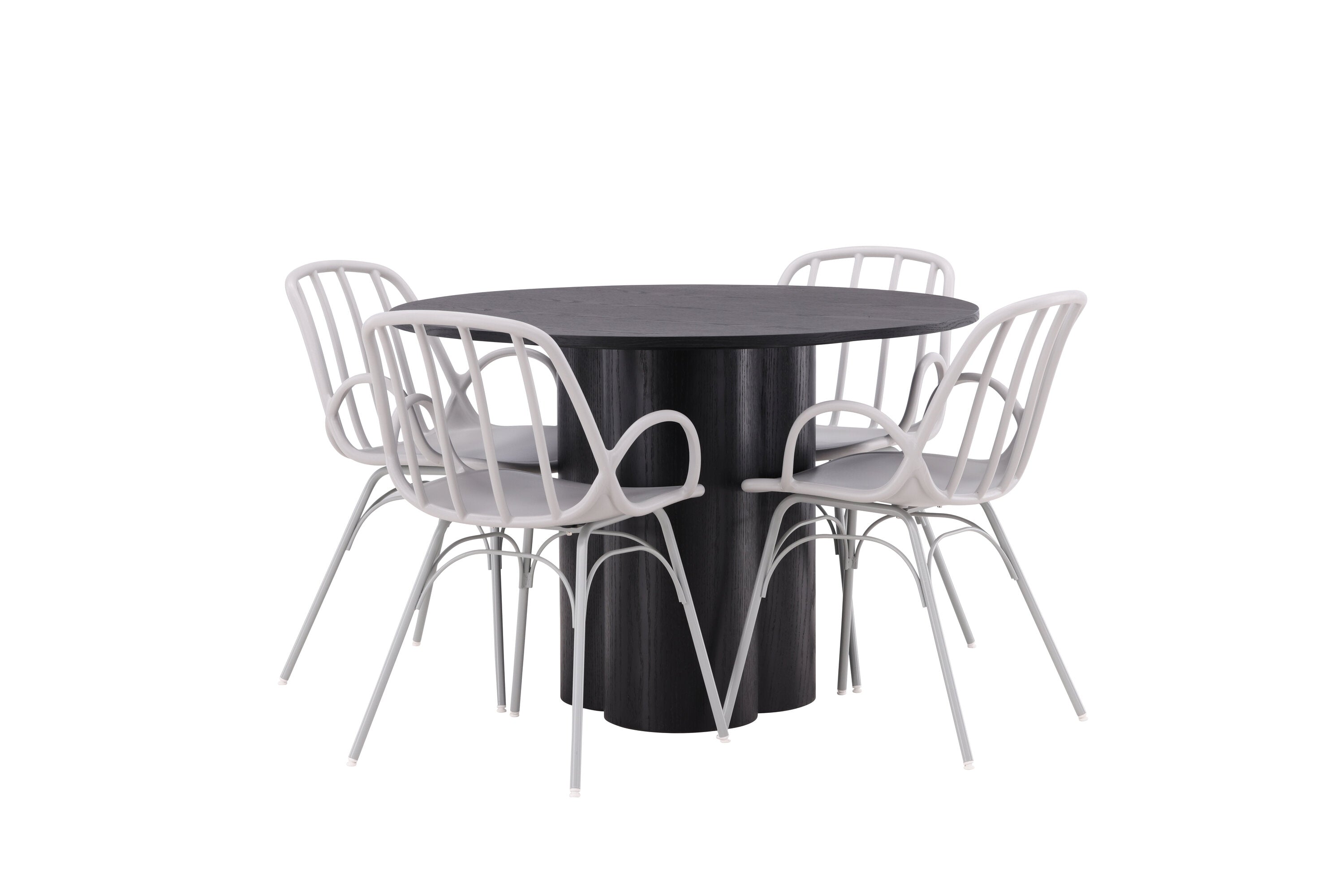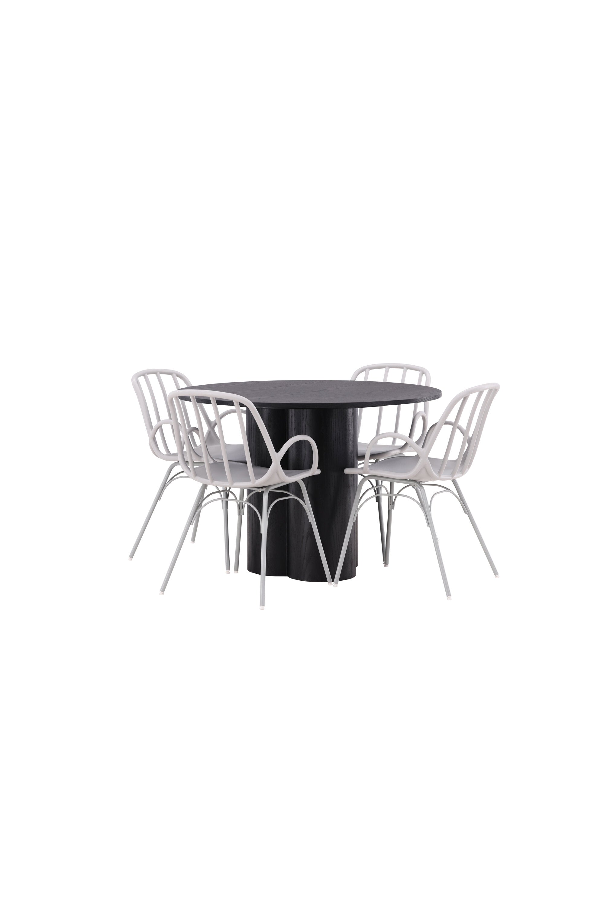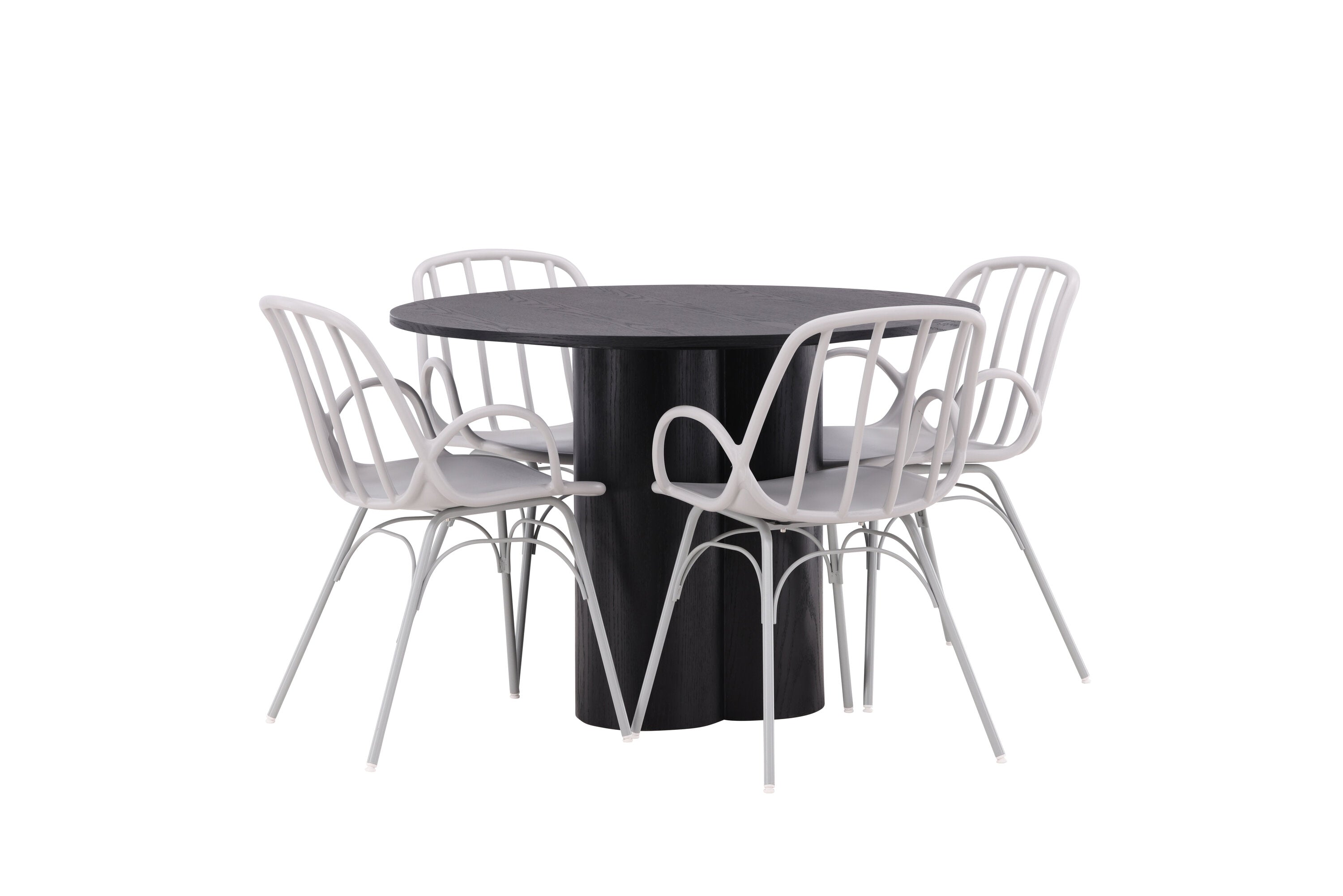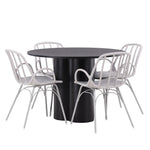Je to zápas! Vychutnejte si příjemná jídla u našeho oblíbeného jídelního stolu Olivia. Stůl má celý holistický design v černé MDF s tenkou, kulatou deskou a třemi nohami ve tvaru válce, které jsou shromážděny pod středem stolu. Barva má na dýhované desce světlý obal, díky kterému je viditelný vzor materiálu. Zde společně s odolnými jídelními židlemi ze série Dyrön. Tato židle má detailní design se zakřivenými tvary, integrovanými područkami a rozšířenými nohami, důsledně vyrobena z odolného plastu a oceli v štíhlé šedé barvě. Vytvořte si moderní poutač v obývacím pokoji!