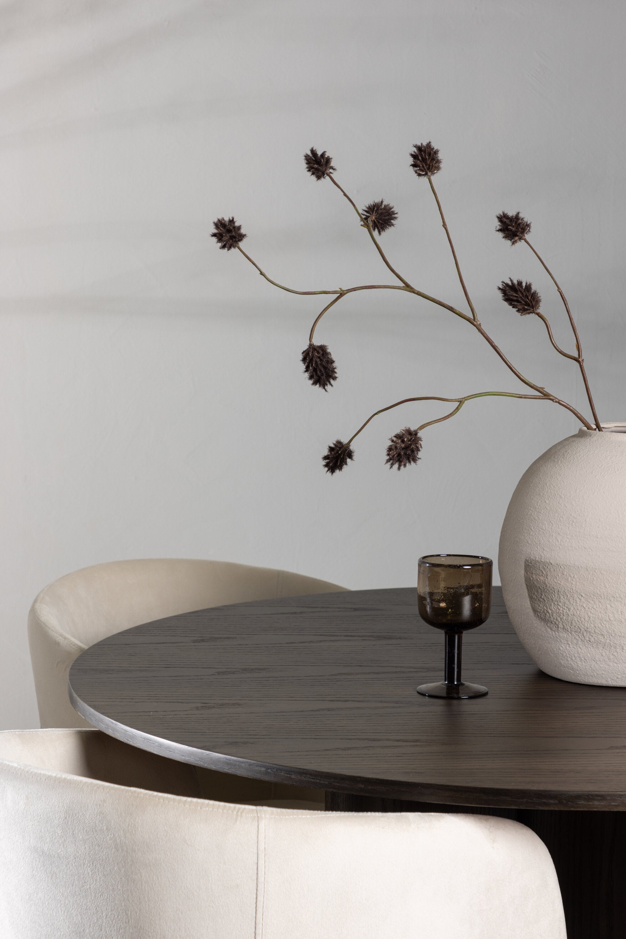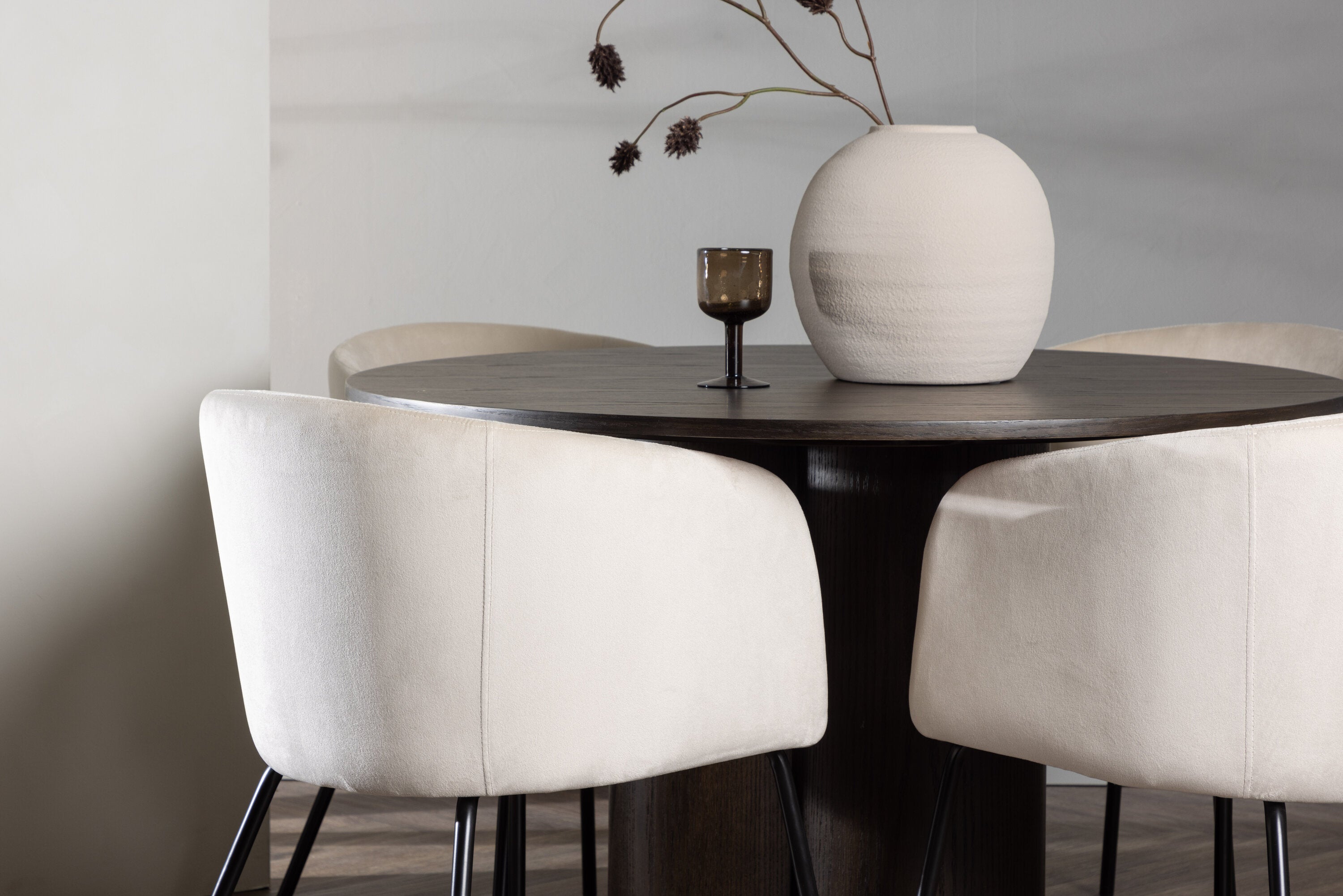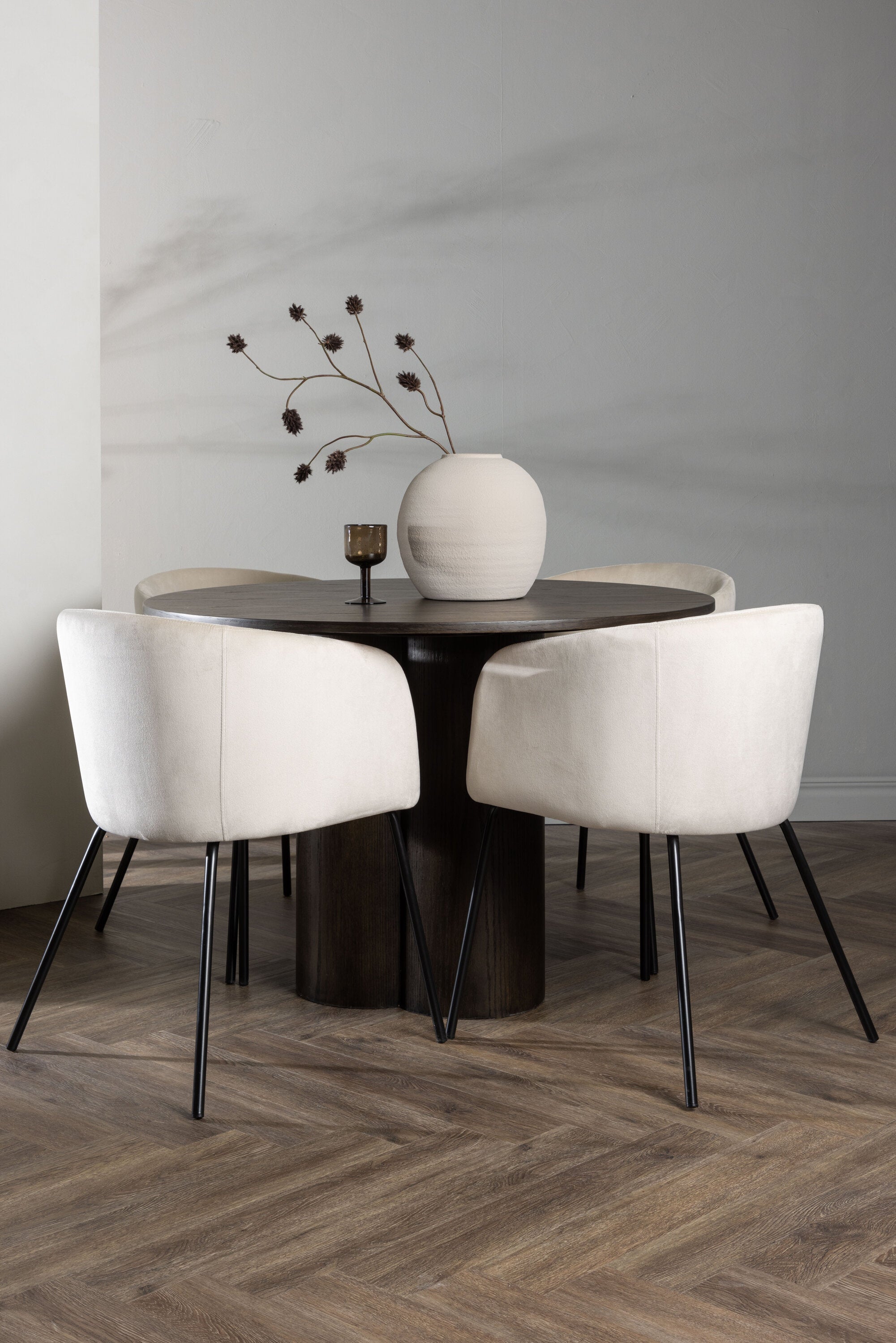 Vytvořte si zářivou záři ve svém obývacím pokoji! Kulatý jídelní stůl Olivia má celkově skandinávský design v moderní mocca barvě. Stůl má tenkou desku z MDF a tři nohy ve tvaru válce, které jsou shromážděny pod středem stolu. Barva má světlý obal, díky kterému je viditelný vzor materiálu. Zde spolu s našimi nádhernými jídelními židlemi Berit. Židle má celočalouněný design s mírně zaobleným opěradlem a sedákem ze sametové látky a úzkými nohami židle z černého železa. Teplá jídelní skupina s trendy pocitem! Rozměry stolu: 110 cm.