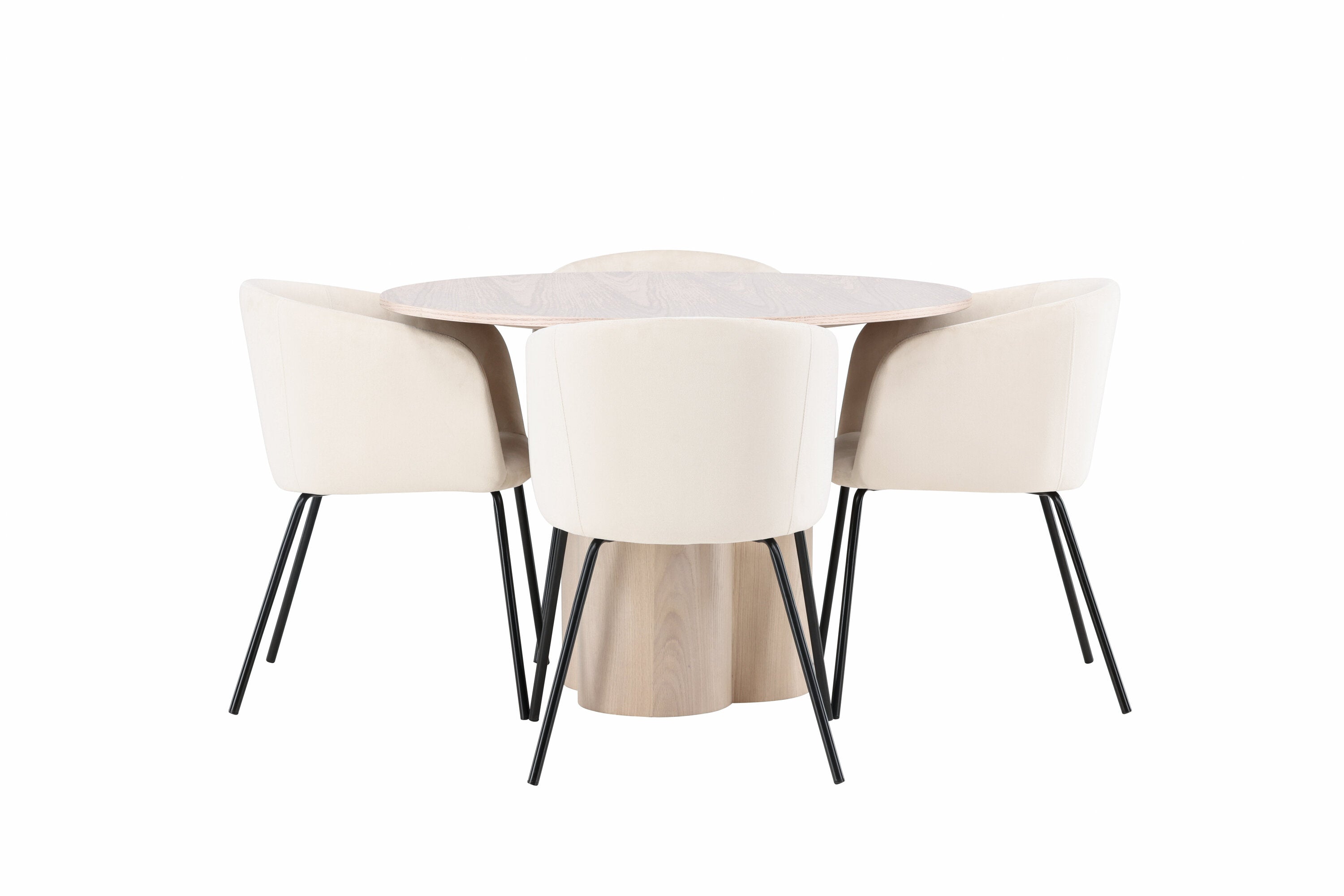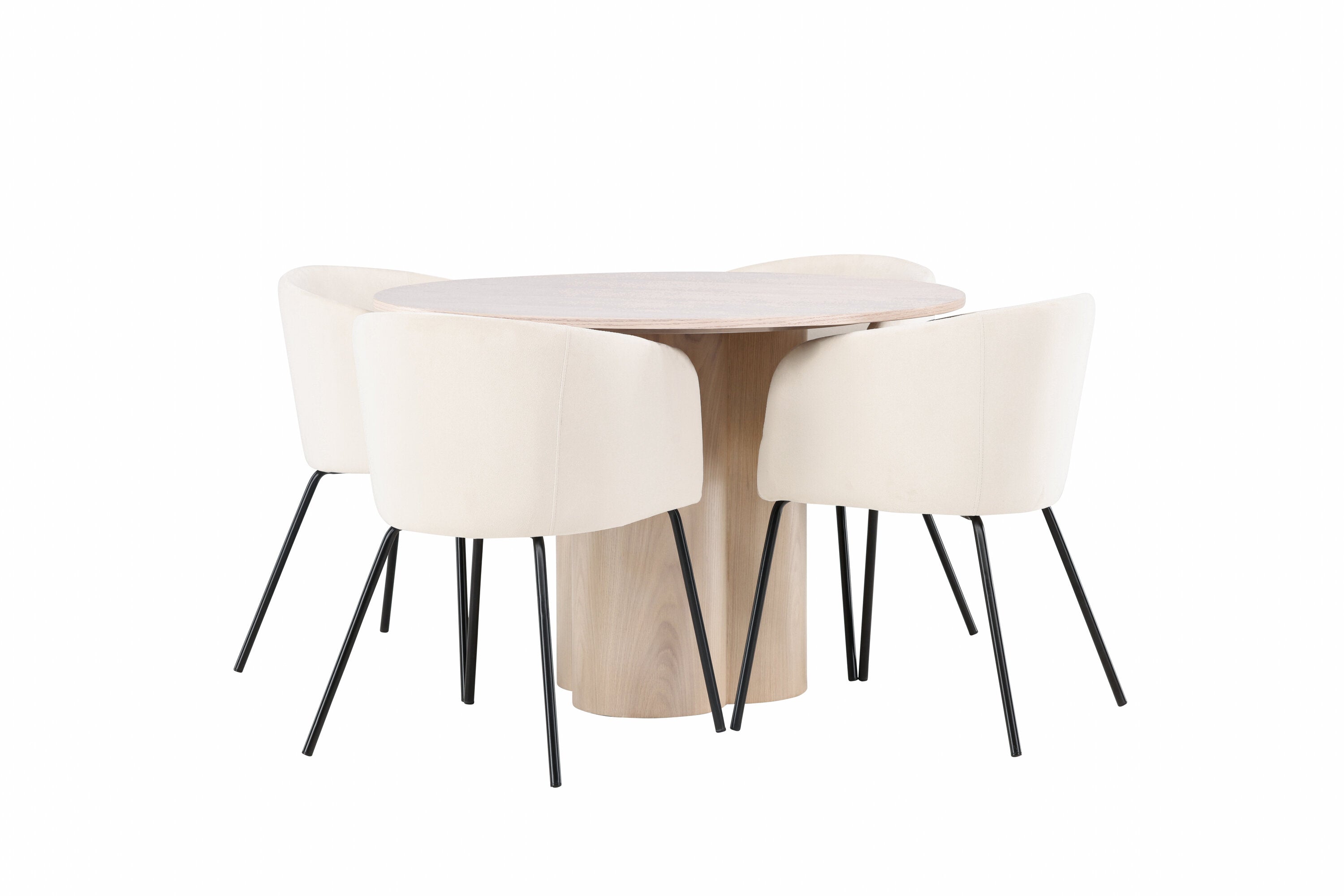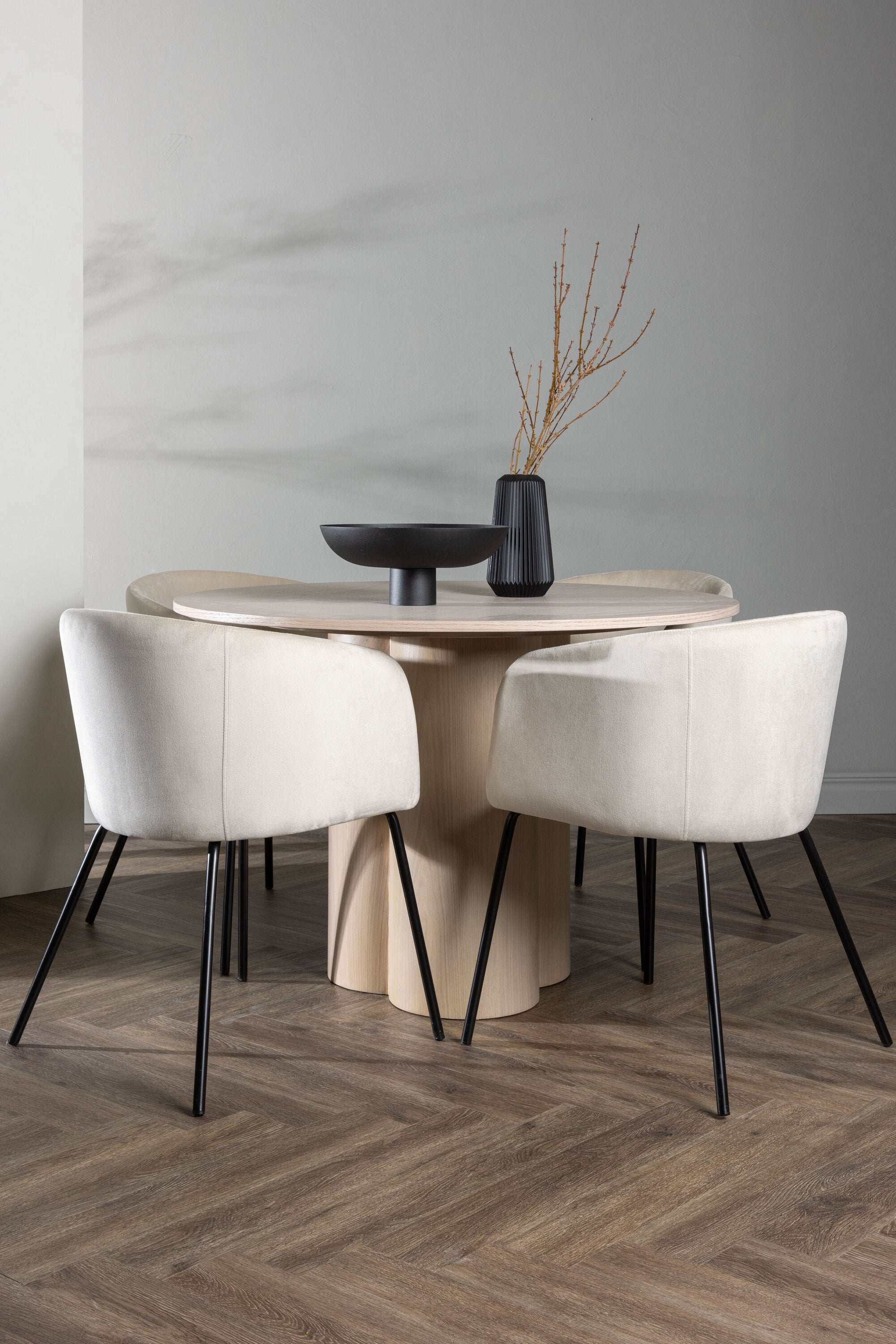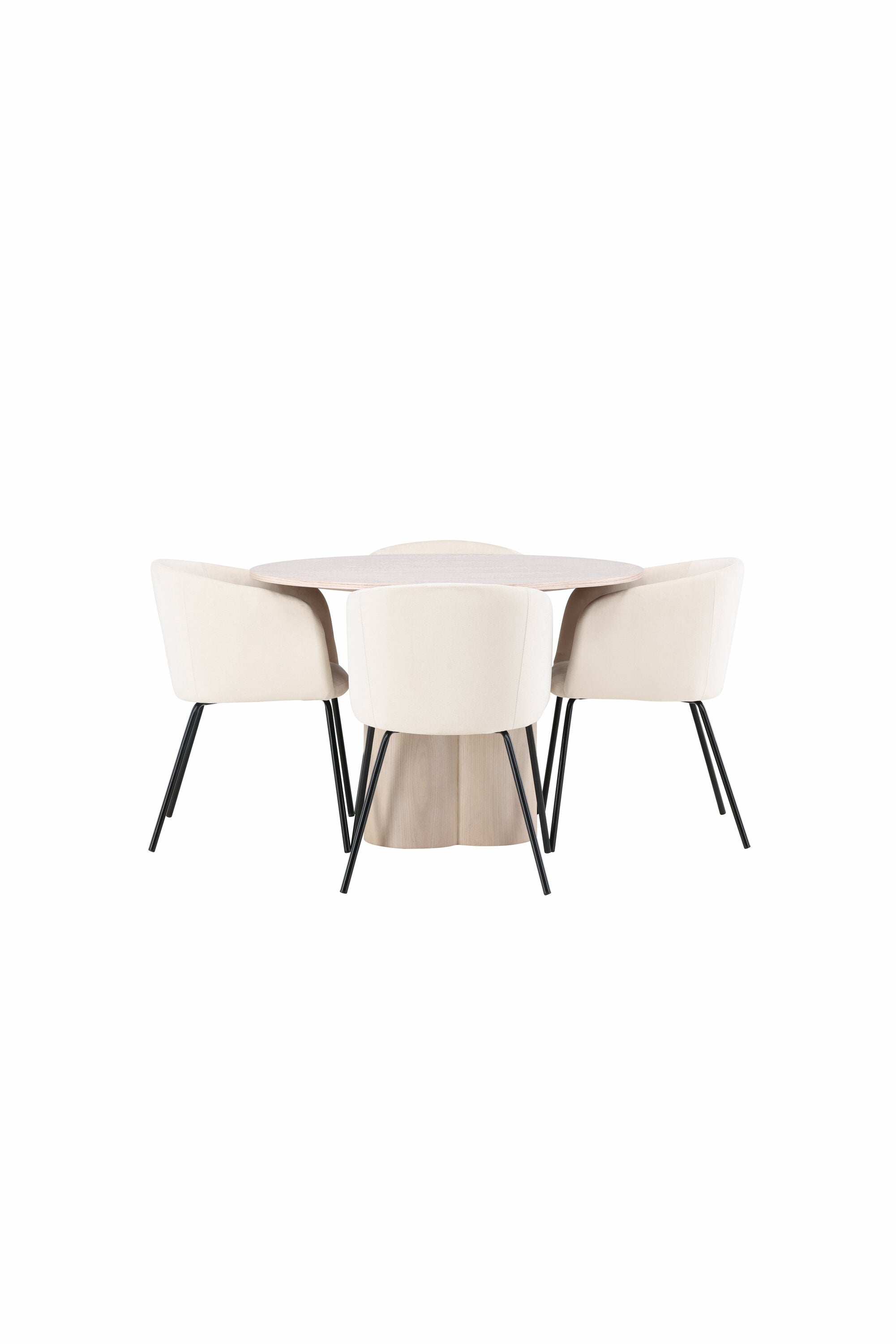 Světlá jídelní skupina, která zvyšuje příjemnou atmosféru v domácnosti! Kulatý jídelní stůl Olivia zaujme svým skandinávským designem. Stůl má celkově holistický design z nabílené MDF desky s tenkou, kulatou deskou a třemi nohami ve tvaru válce, které jsou shromážděny pod středem stolu. Zde spolu s našimi nádhernými jídelními židlemi Berit. Židle má celočalouněný design s mírně zaobleným opěradlem a sedákem ze sametové látky a úzkými nohami z černého železa. Jednoduše, úžasná kombinace! Rozměry stolu: 110 cm.