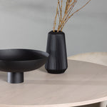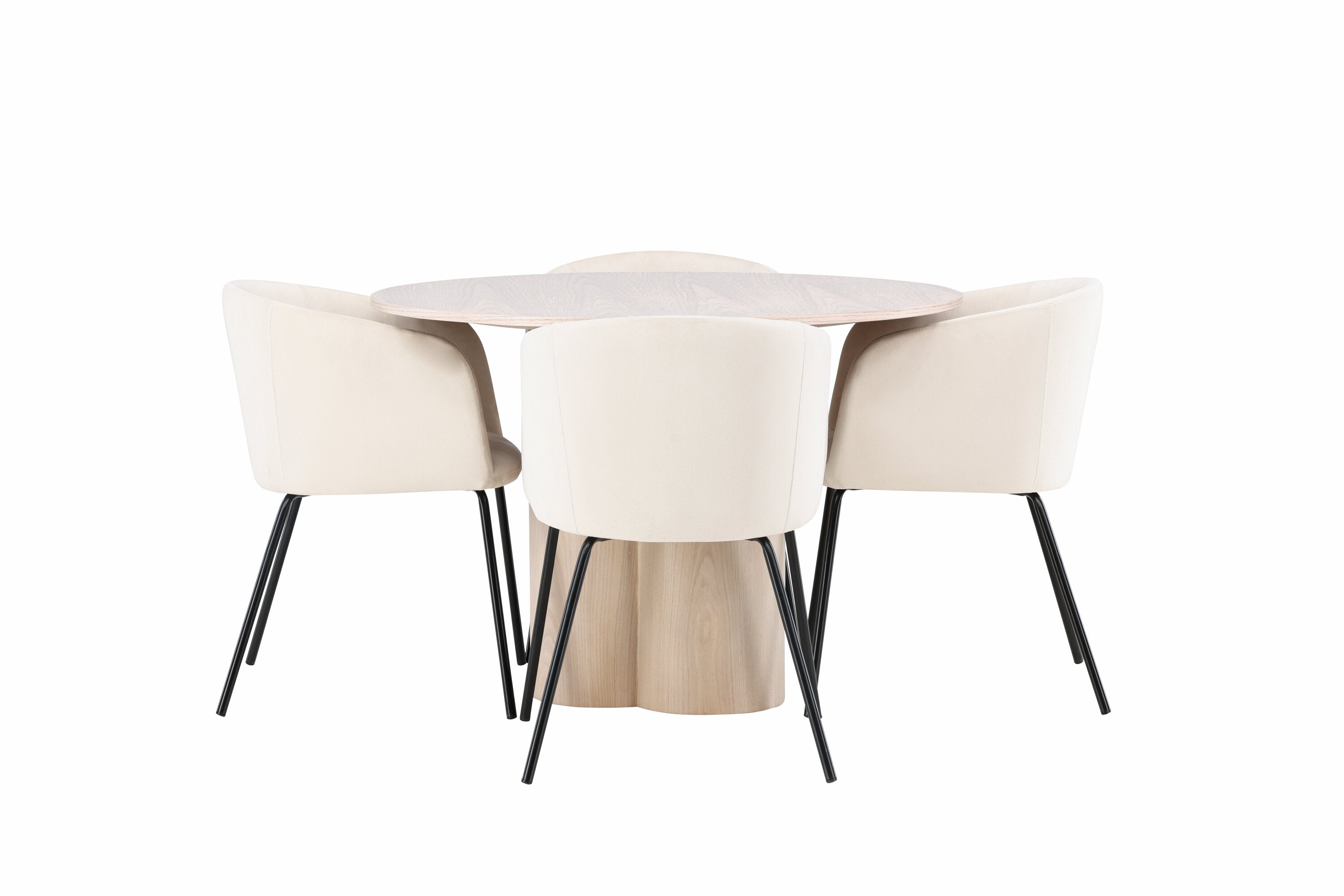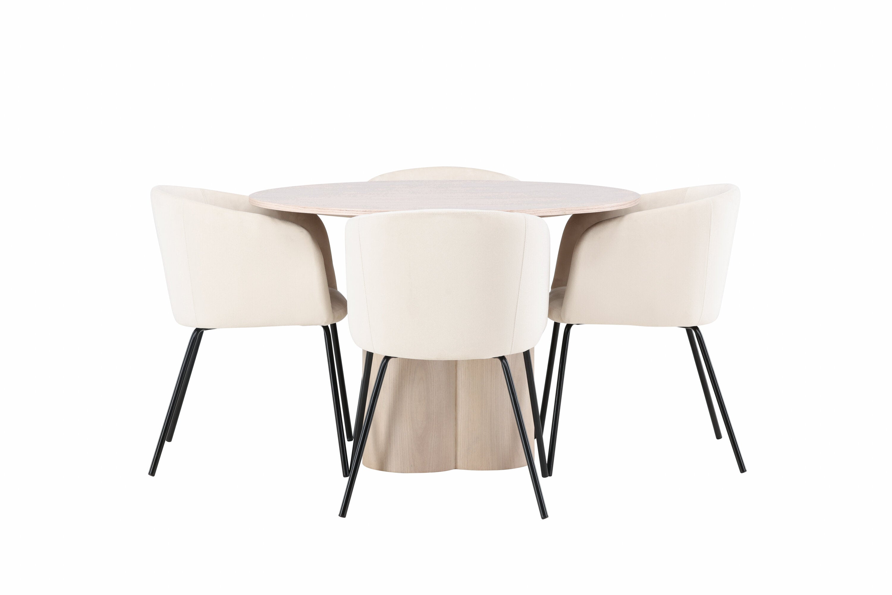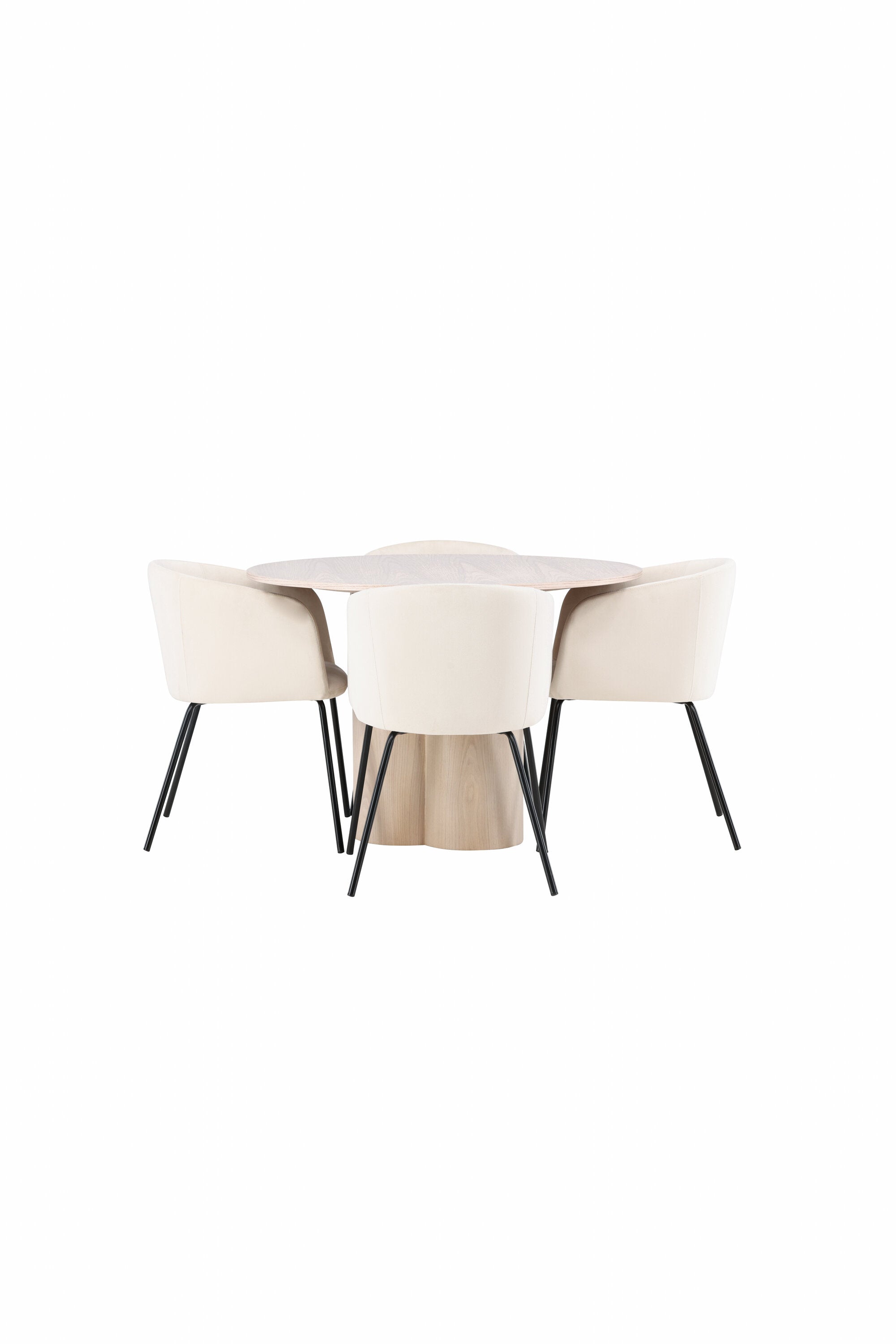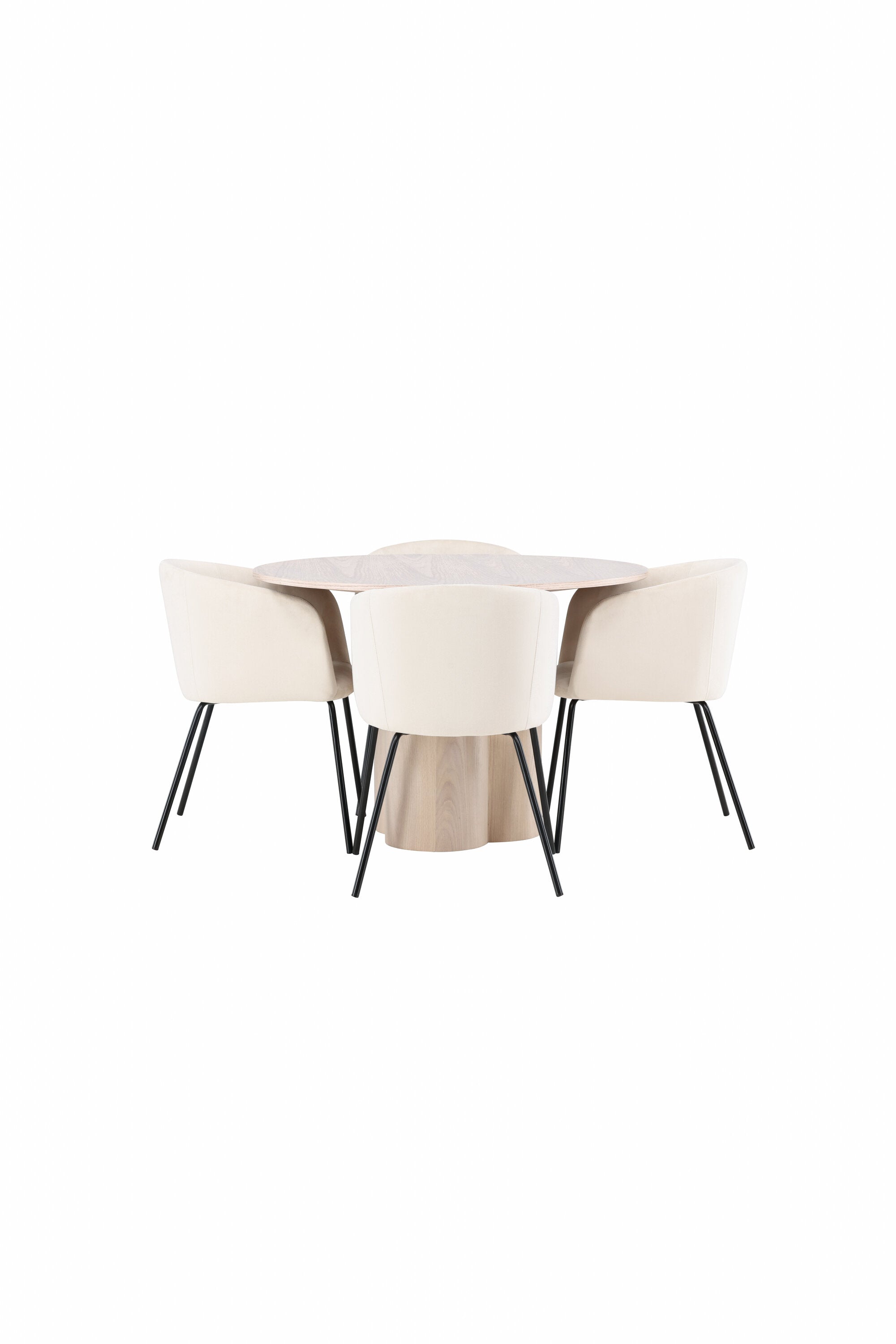 Světlá jídelní skupina, která zvyšuje příjemnou atmosféru v domácnosti! Kulatý jídelní stůl Olivia zaujme svým skandinávským designem. Stůl má celkově holistický design z nabílené MDF desky s tenkou, kulatou deskou a třemi nohami ve tvaru válce, které jsou shromážděny pod středem stolu. Zde spolu s našimi nádhernými jídelními židlemi Berit. Židle má celočalouněný design s mírně zaobleným opěradlem a sedákem ze sametové látky a úzkými nohami z černého železa. Jednoduše, úžasná kombinace! Rozměry stolu: 110 cm.
