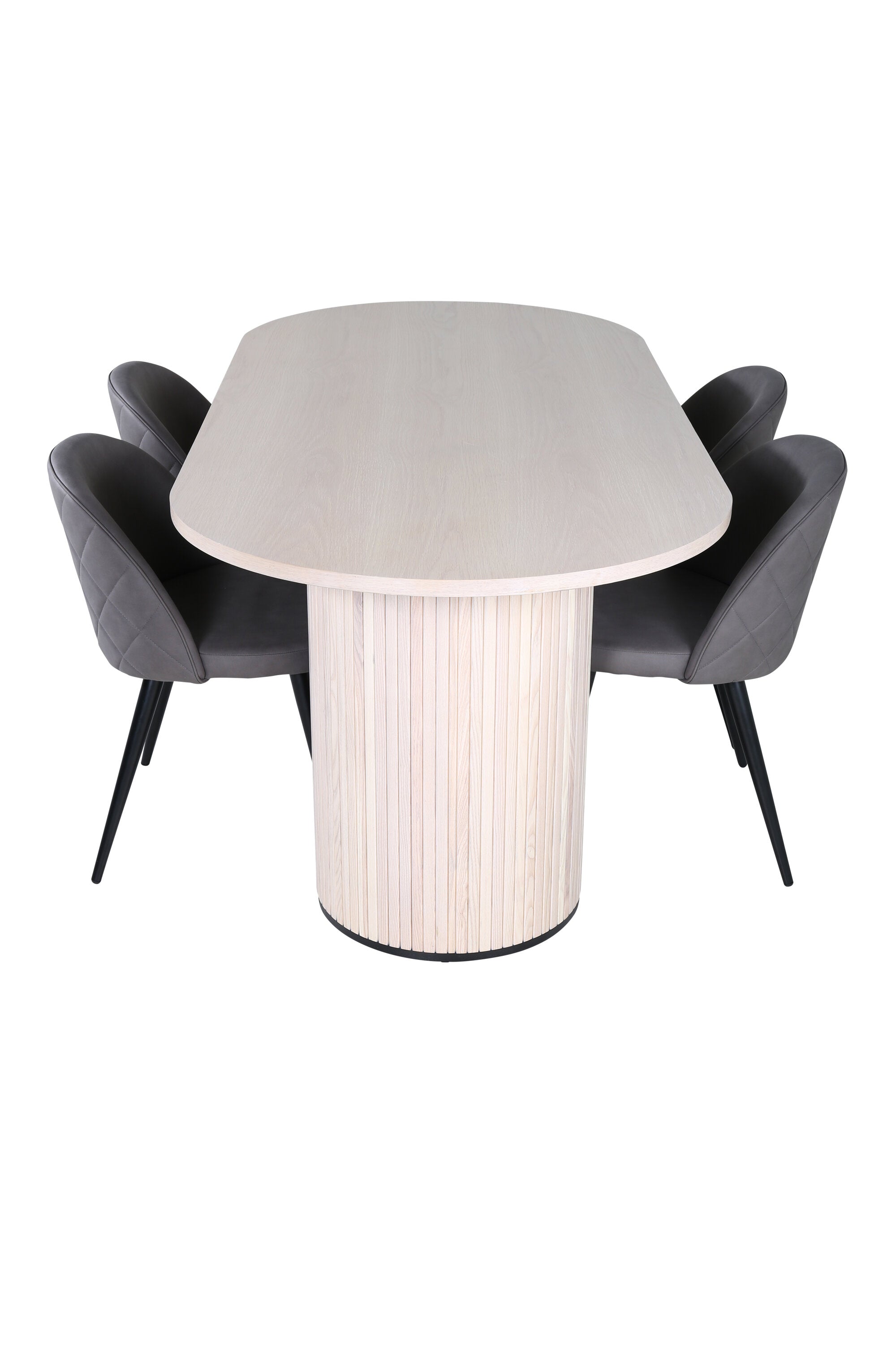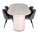 Oválná skupina jídel pro všechny příležitosti - ideální do obývacího pokoje nebo prostorné kuchyně! Náš oválný jídelní stůl Bianca má atraktivní design. Deska stolu má omítnutou bílou barvu z MDF s dýhou a rámem Robustní v bílé i černé barvě dřeva a MDF v žebrovaném provedení, které působí stabilním dojmem. Zde spolu se 4 našimi oblíbenými jídelními židlemi Velvet Stitches, které přispívají k pěknému celku v obývacím pokoji. Nohy židle jsou snadno rozšířeny z černého železa a šedá sedadla z mikrovlákna. Ozdobte srdce domova příjemnou skupinou jídla!
