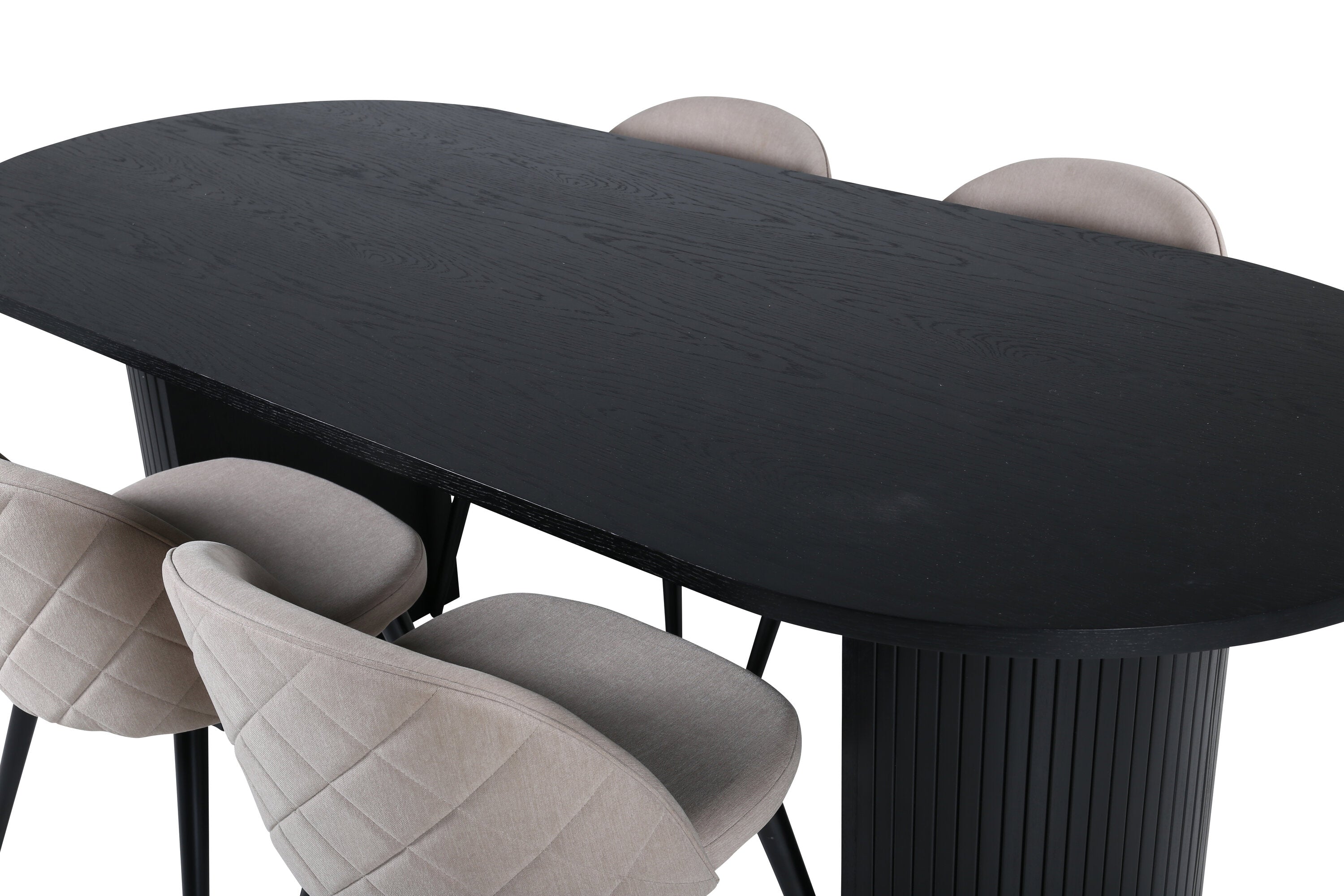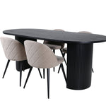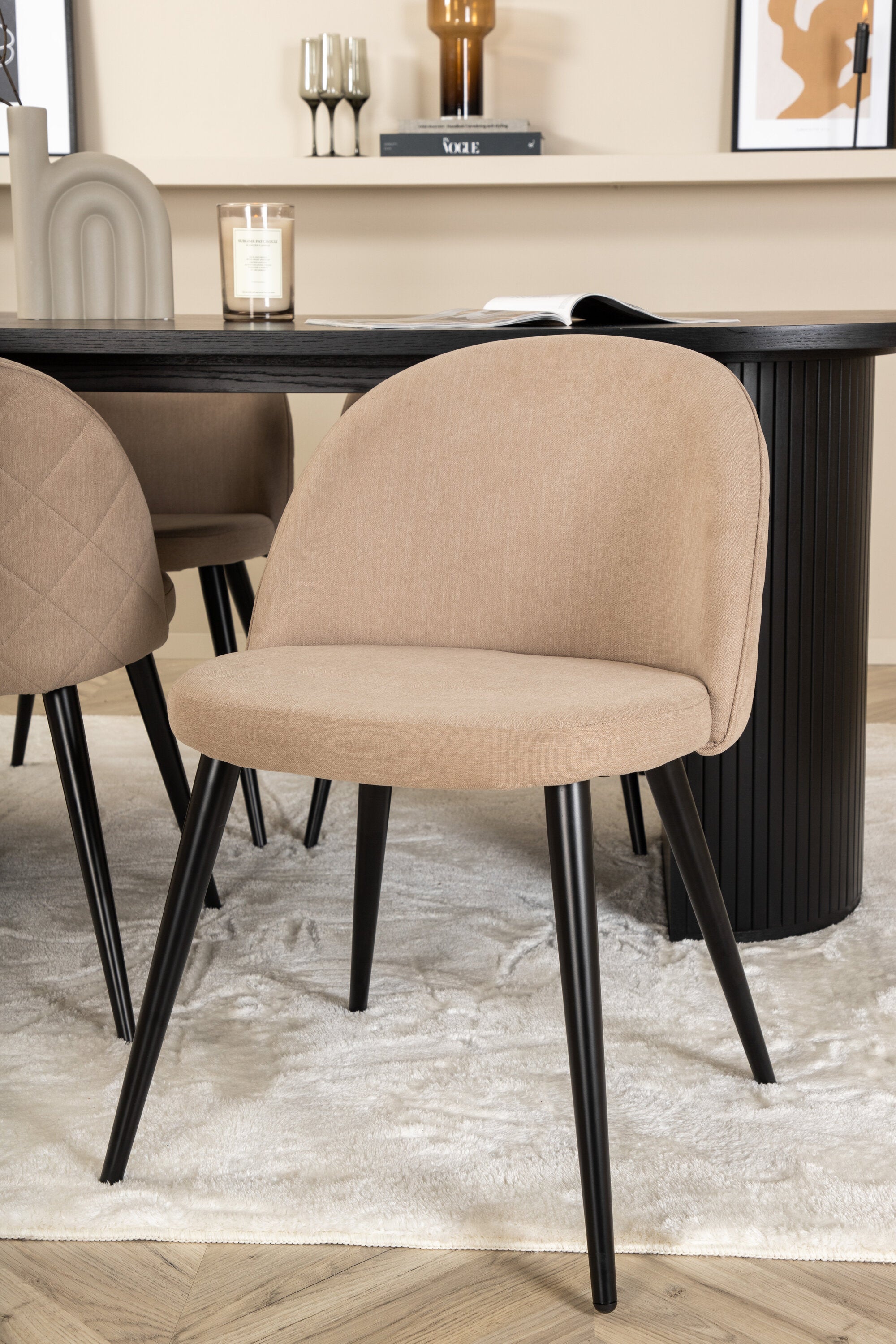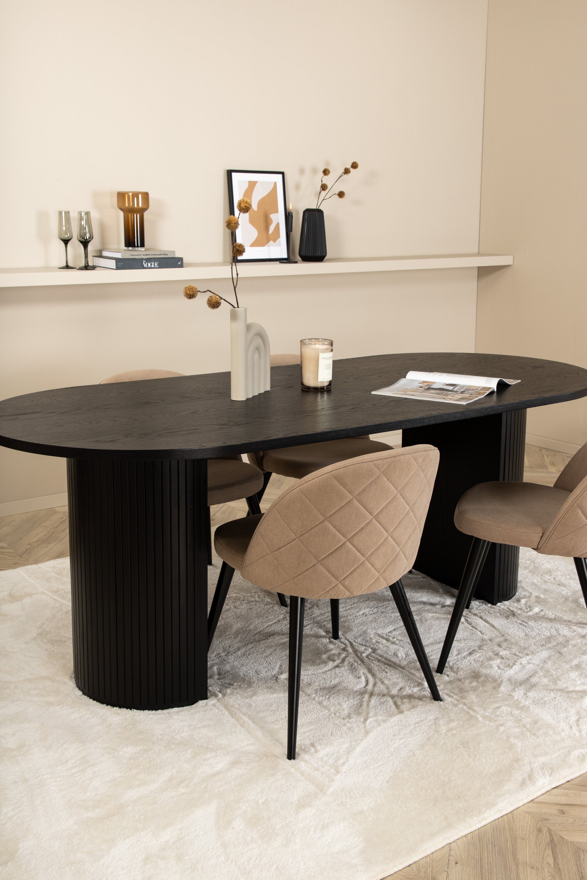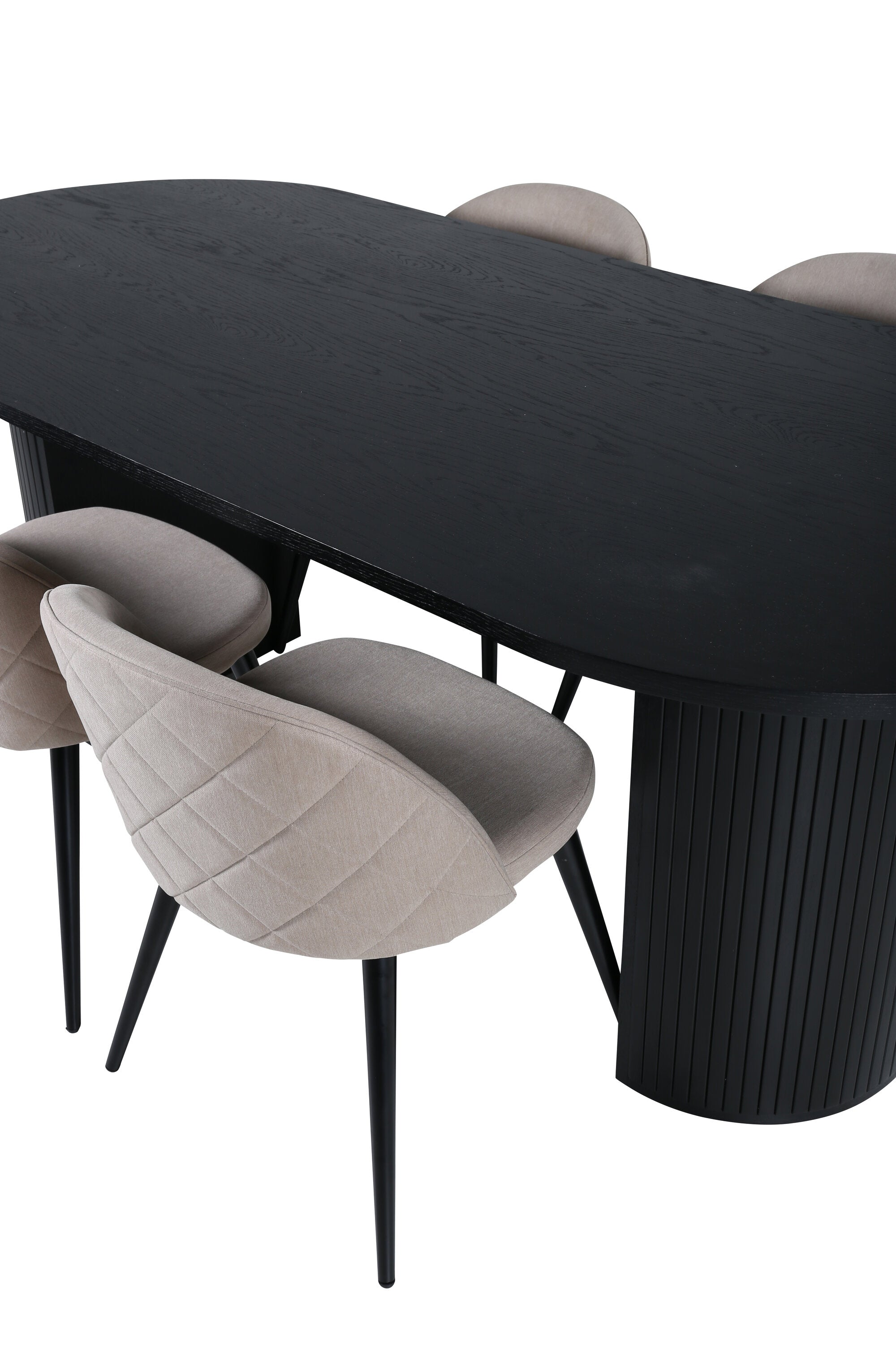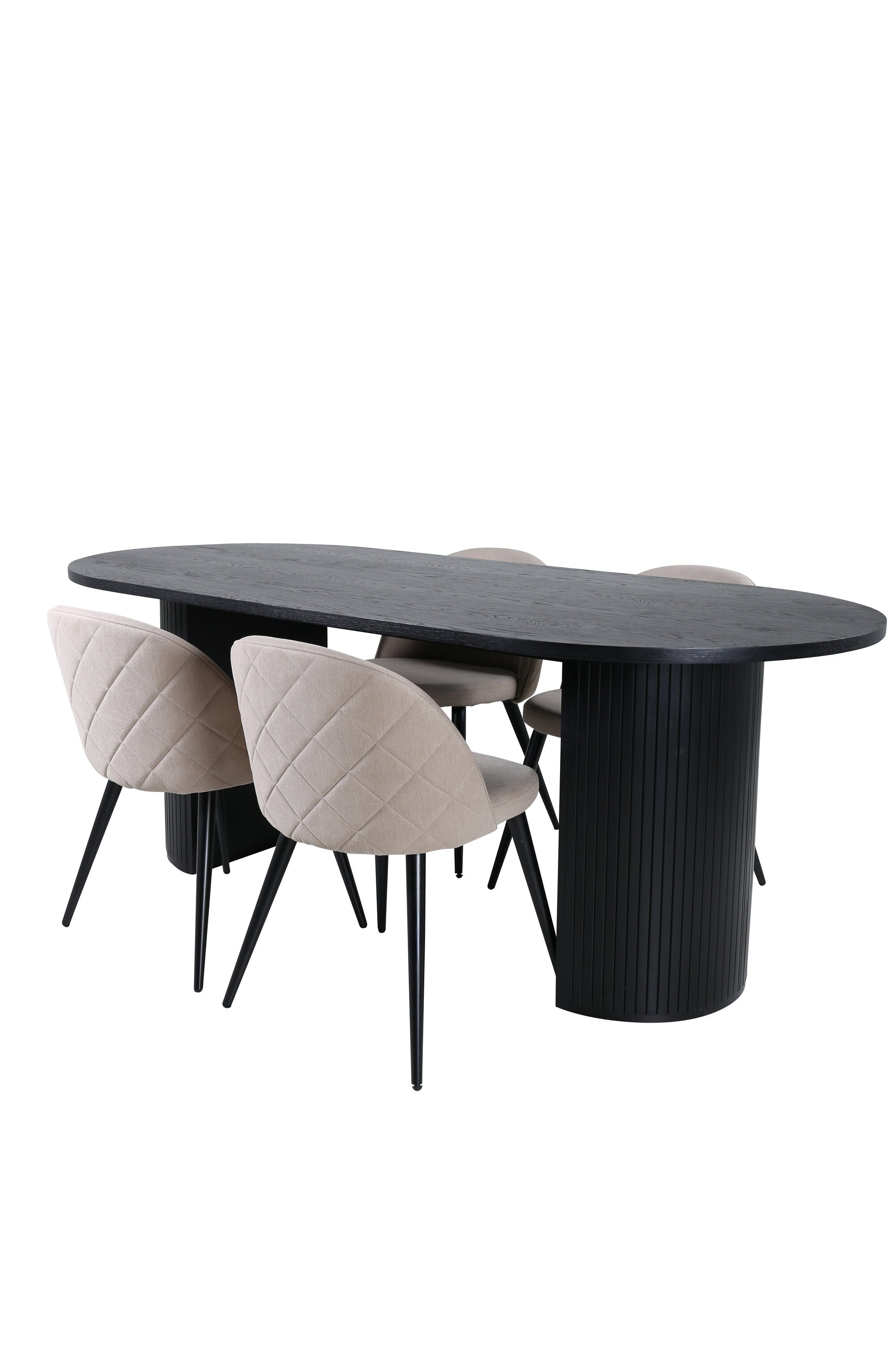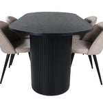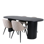 Bianca vytváří stylový poutač, který zaujme! Tento oválný jídelní stůl v konzistentně černé barvě má ​​moderní design se stolovou deskou z MDF a robustním rámem v žebrovaném provedení, který působí stabilním dojmem. Rozměry stolu: Délka: 200 cm, Šířka: 90 cm, Výška: 75 cm. Sladěno se 4 sametovými jídelními židlemi s ozdobným prošíváním v béžovém sedáku z polyesterového lnu a rozšířenými nohami židle ze železa. Rozměry židle: Výška: 76,5 cm, výška sedáku: 46,5 cm, šířka: 50 cm, hloubka: 57 cm. Vysoký komfort sezení křesel zve k dlouhým a úžasným chvilkám společenského života!