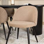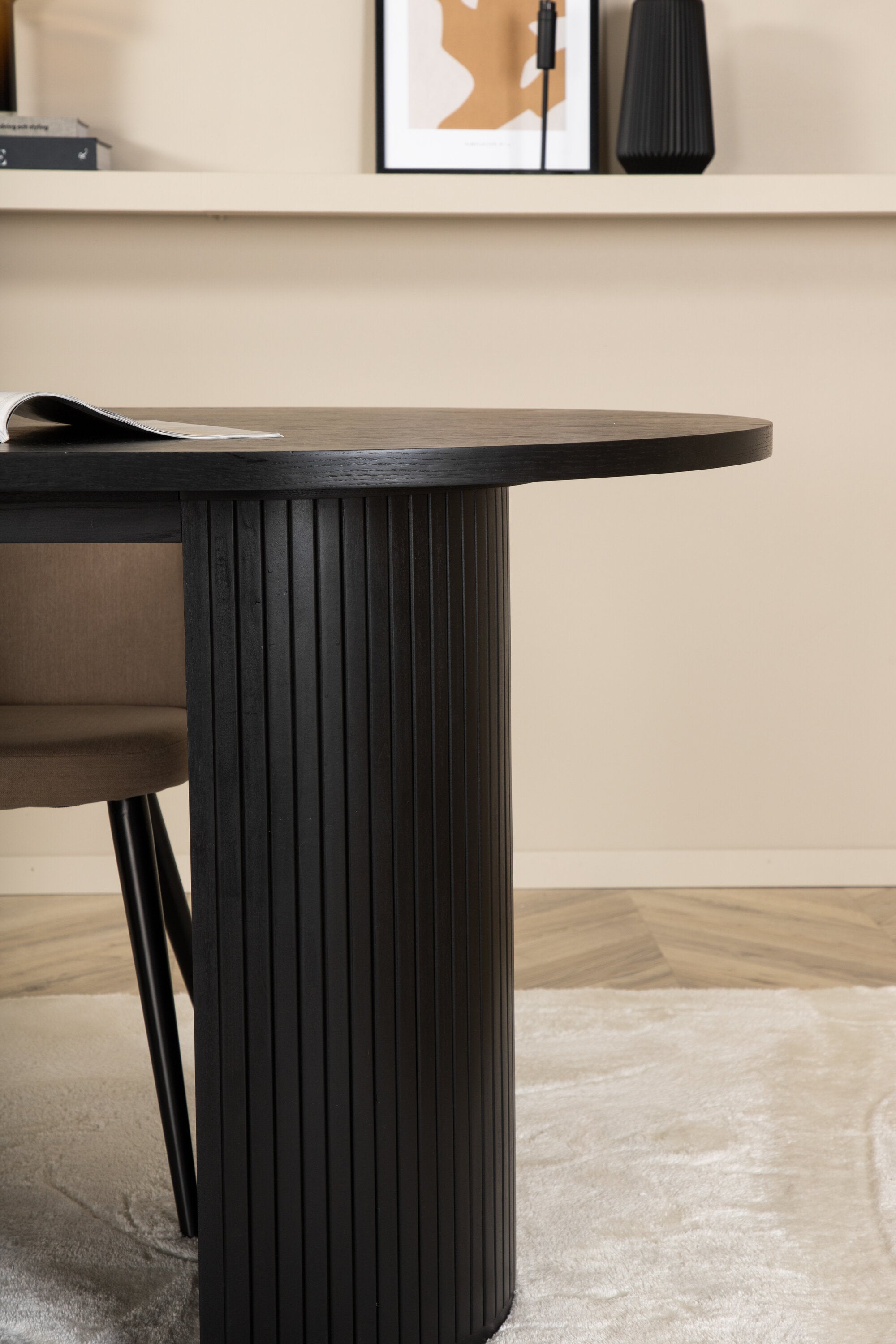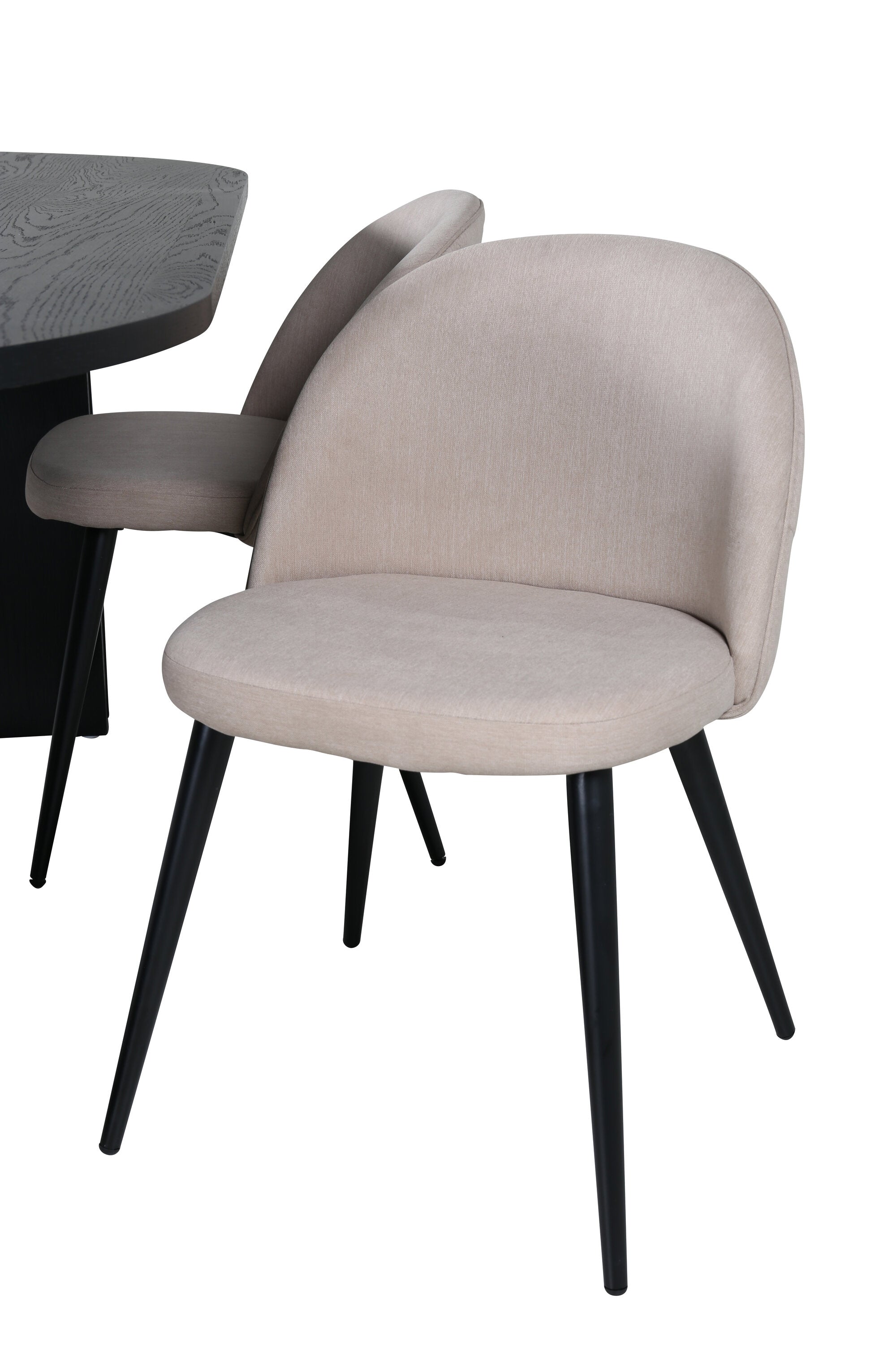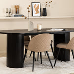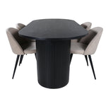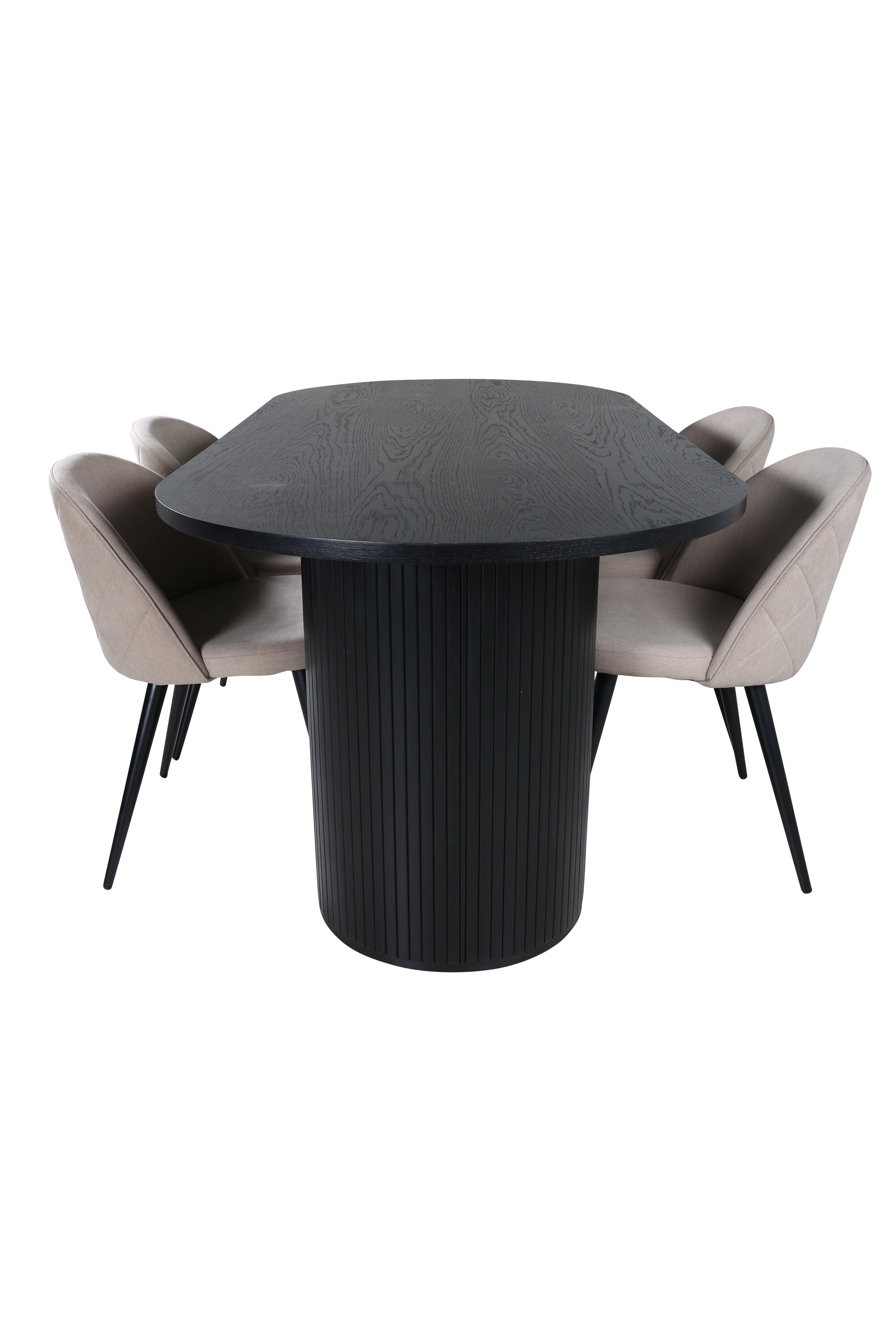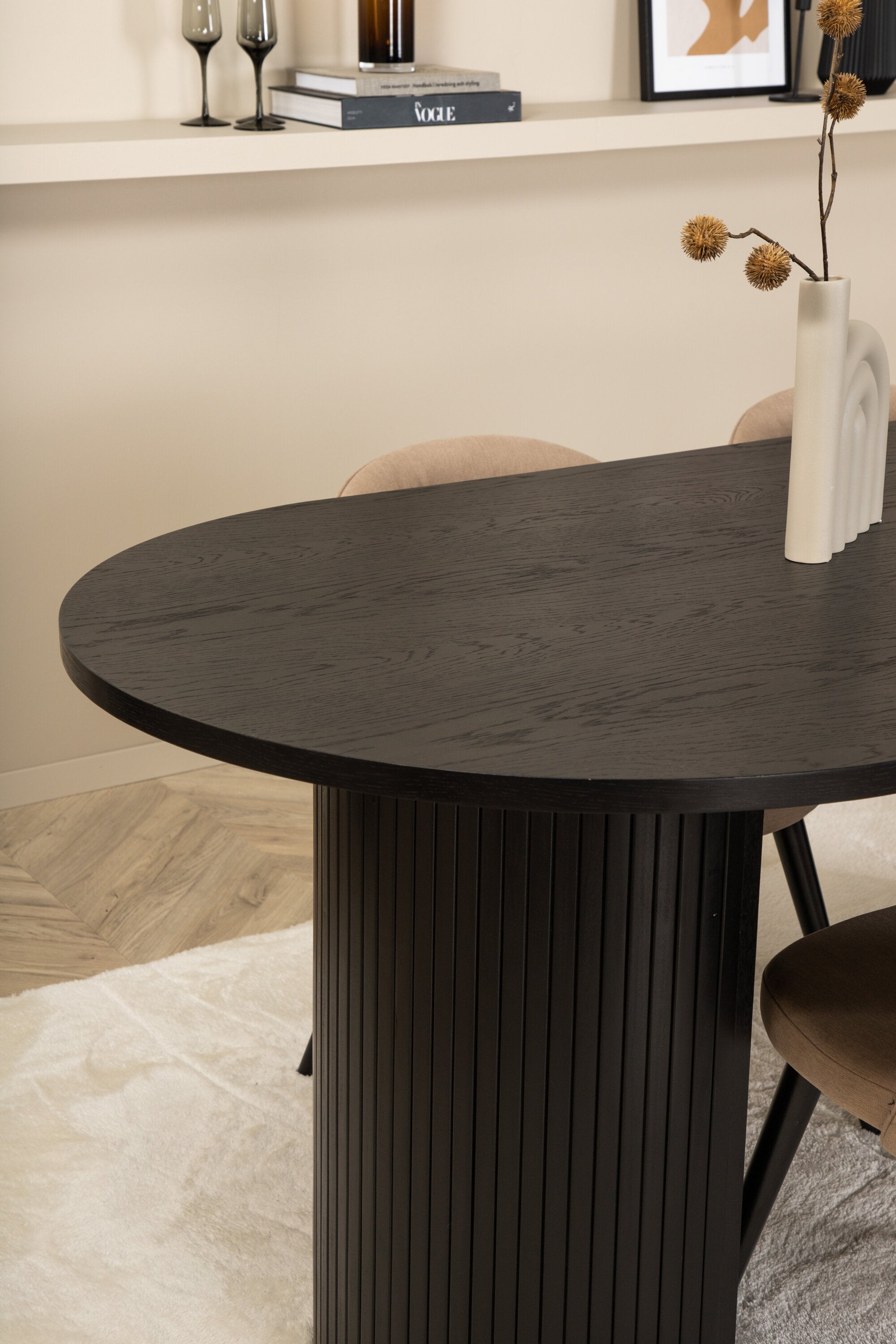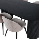 Bianca vytváří stylový poutač, který zaujme! Tento oválný jídelní stůl v konzistentně černé barvě má ​​moderní design se stolovou deskou z MDF a robustním rámem v žebrovaném provedení, který působí stabilním dojmem. Rozměry stolu: Délka: 200 cm, Šířka: 90 cm, Výška: 75 cm. Sladěno se 4 sametovými jídelními židlemi s ozdobným prošíváním v béžovém sedáku z polyesterového lnu a rozšířenými nohami židle ze železa. Rozměry židle: Výška: 76,5 cm, výška sedáku: 46,5 cm, šířka: 50 cm, hloubka: 57 cm. Vysoký komfort sezení křesel zve k dlouhým a úžasným chvilkám společenského života!