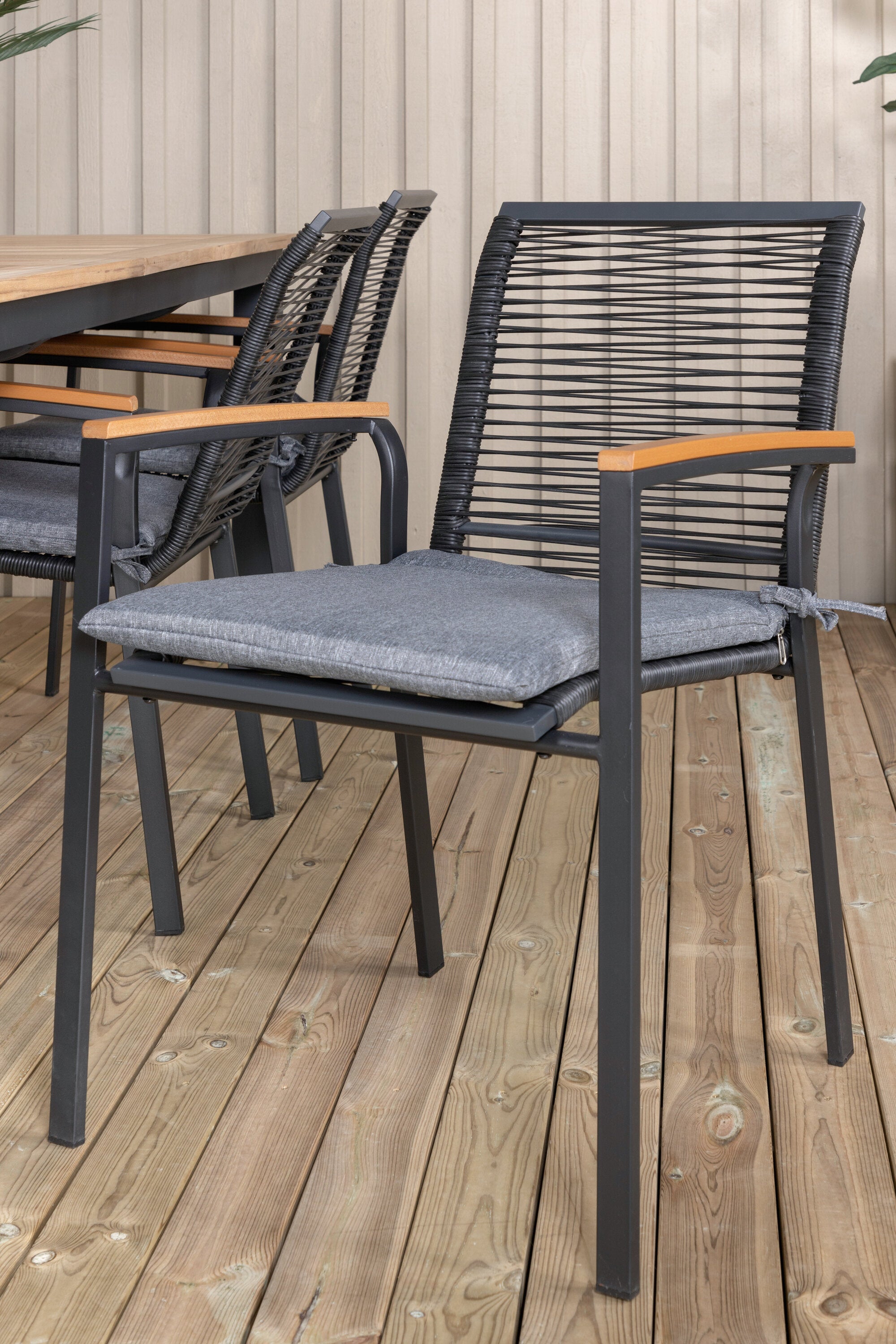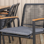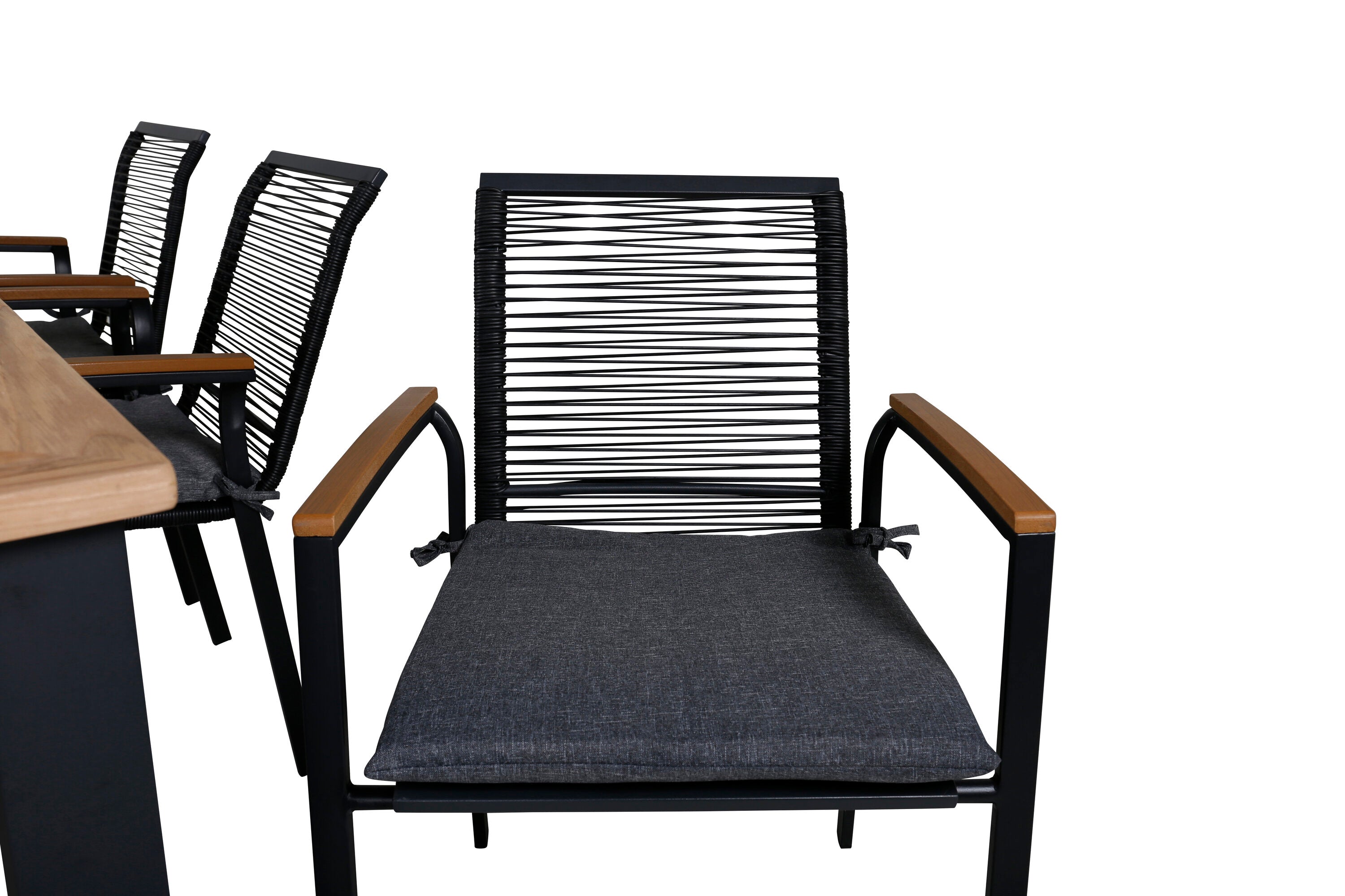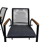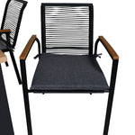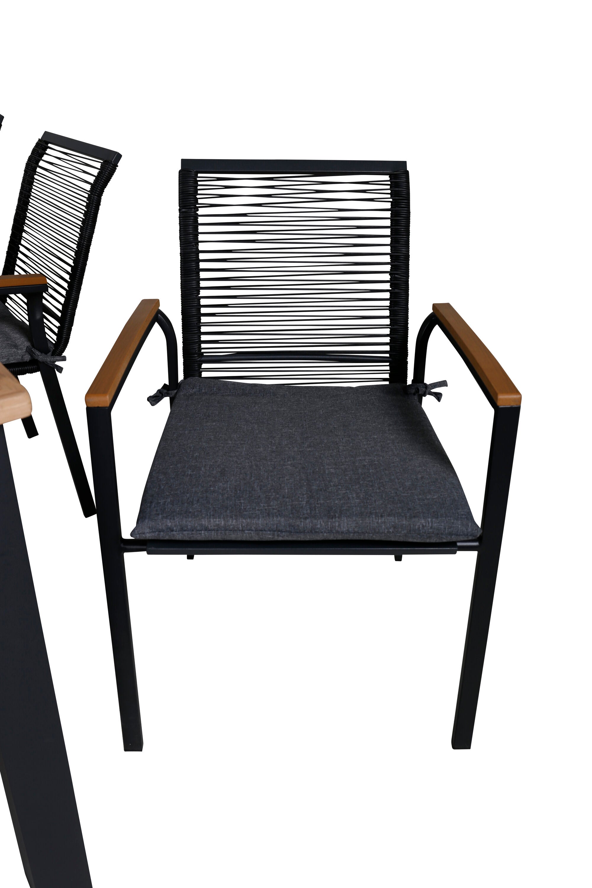 Dallas, naše dekorativní jídelní židle z černých provazů a dřevěných područek. Zde společně s rozkládacím jídelním stolem Panama. Přivítejte letošní letní jídla venku s lákavou skupinou jídla velkorysé velikosti!