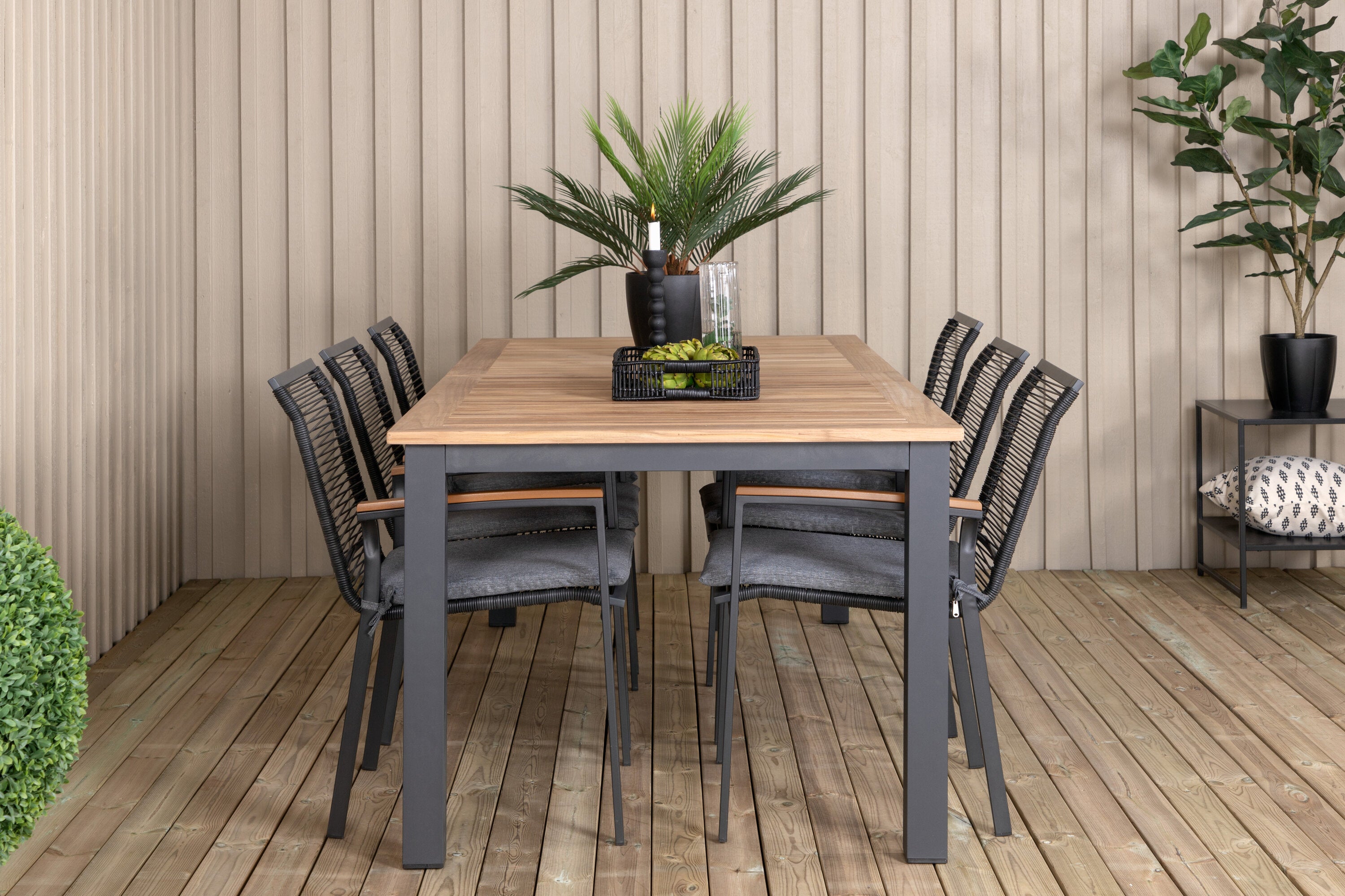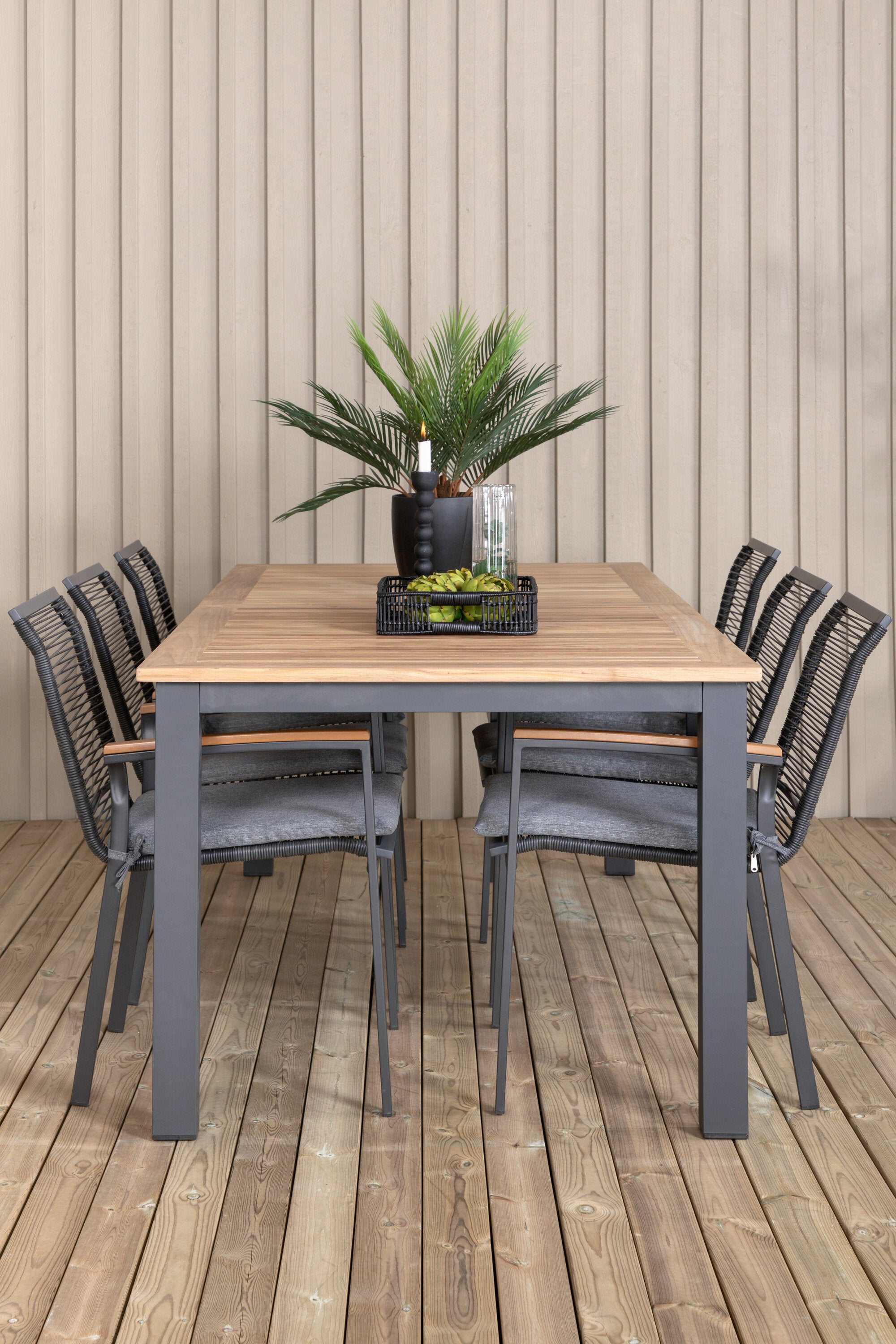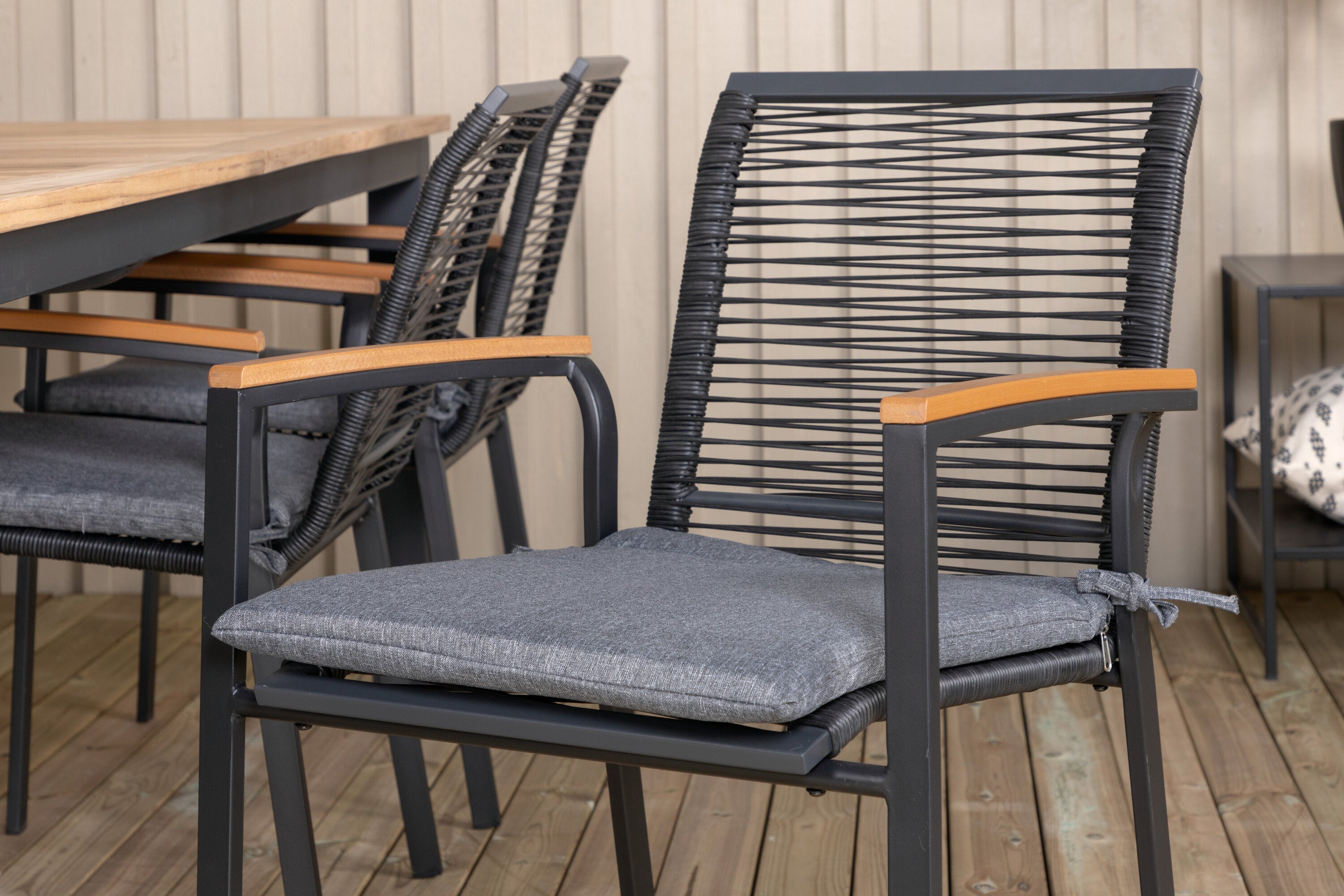 Dallas, naše dekorativní jídelní židle z černých provazů a dřevěných područek. Zde společně s rozkládacím jídelním stolem Panama. Přivítejte letošní letní jídla venku s lákavou skupinou jídla velkorysé velikosti!