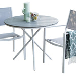 Okouzlující kavárenská skupina se stylovým designem! Kulatý kavárenský stůl Parma má desku stolu z šedého aintwoodu a bílý hliníkový rám, díky čemuž je stůl stejně praktický a odolný. Zde pěkně ladí se 2 šedými židlemi ze série Copacabana. Židle je stohovatelná pro chytré skladování, má šedý sedák z textilu a rovné nohy z bílého hliníku. Ideální na malý balkon nebo menší terasu! Průměr stolu: 90 cm.