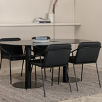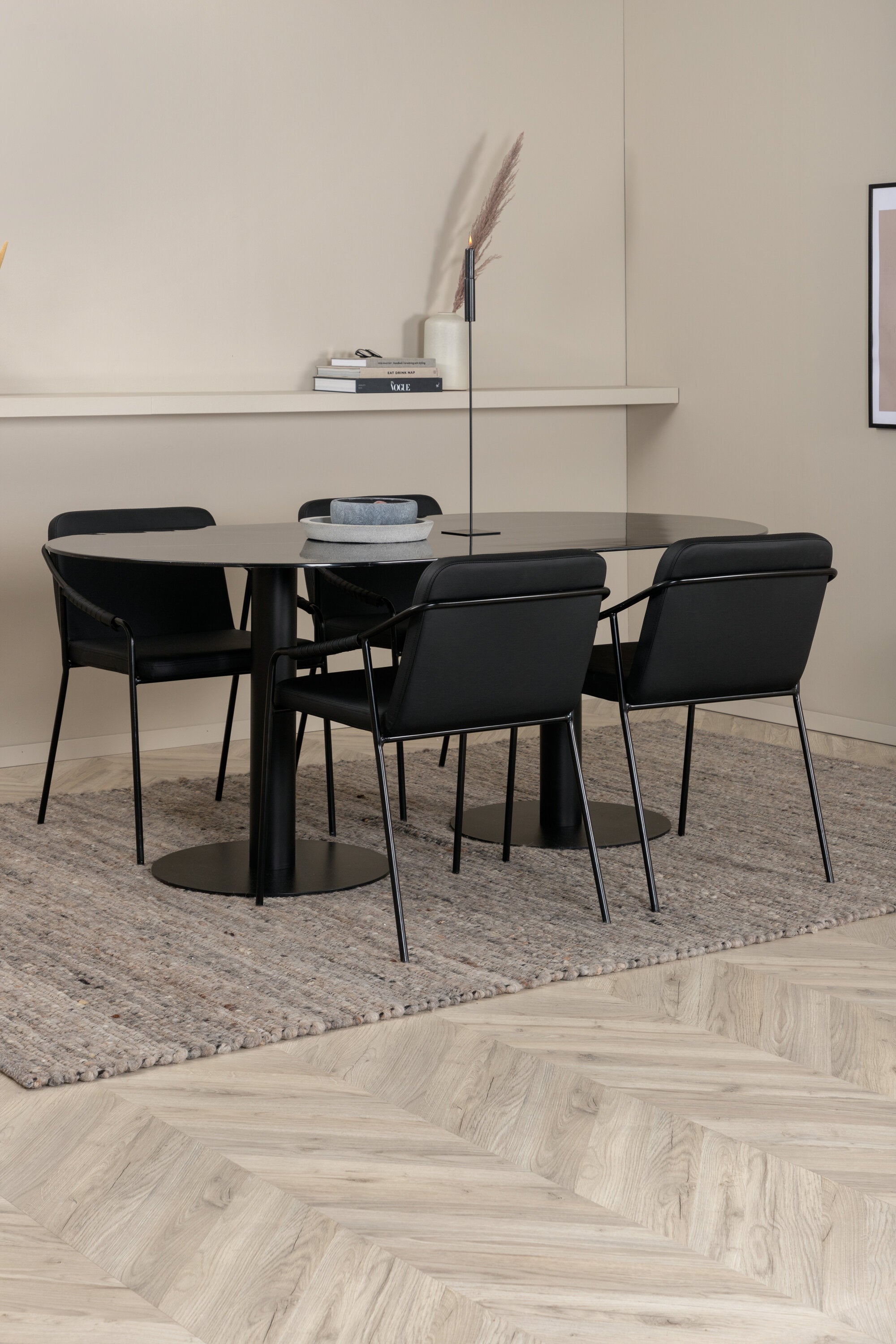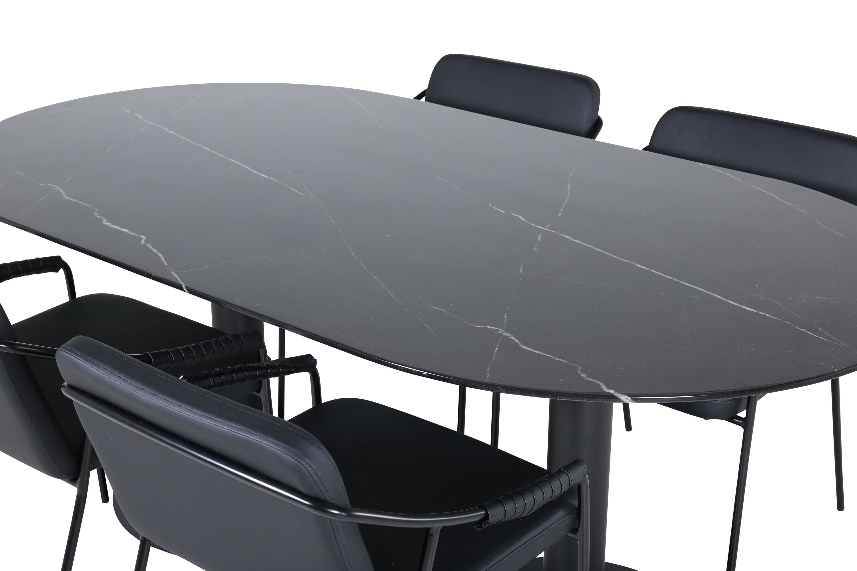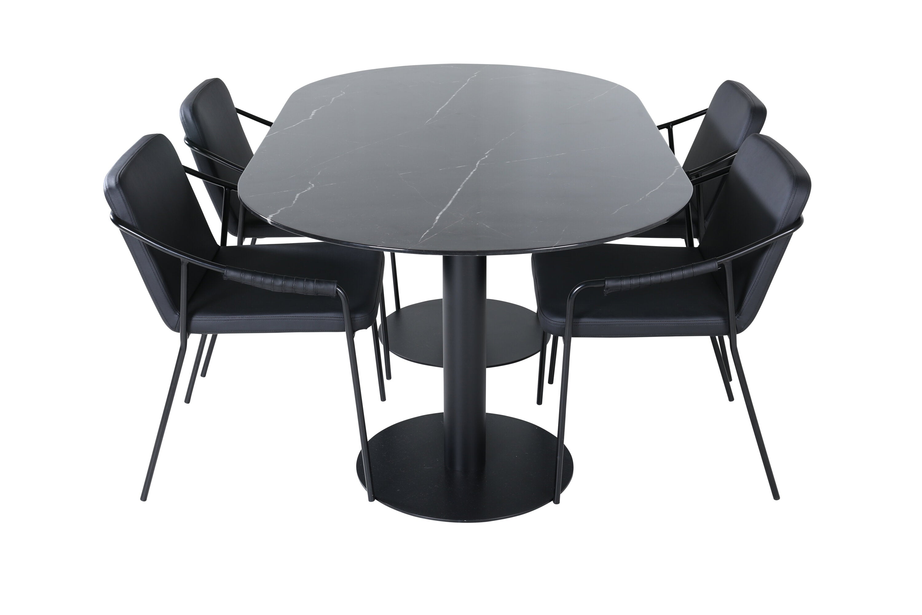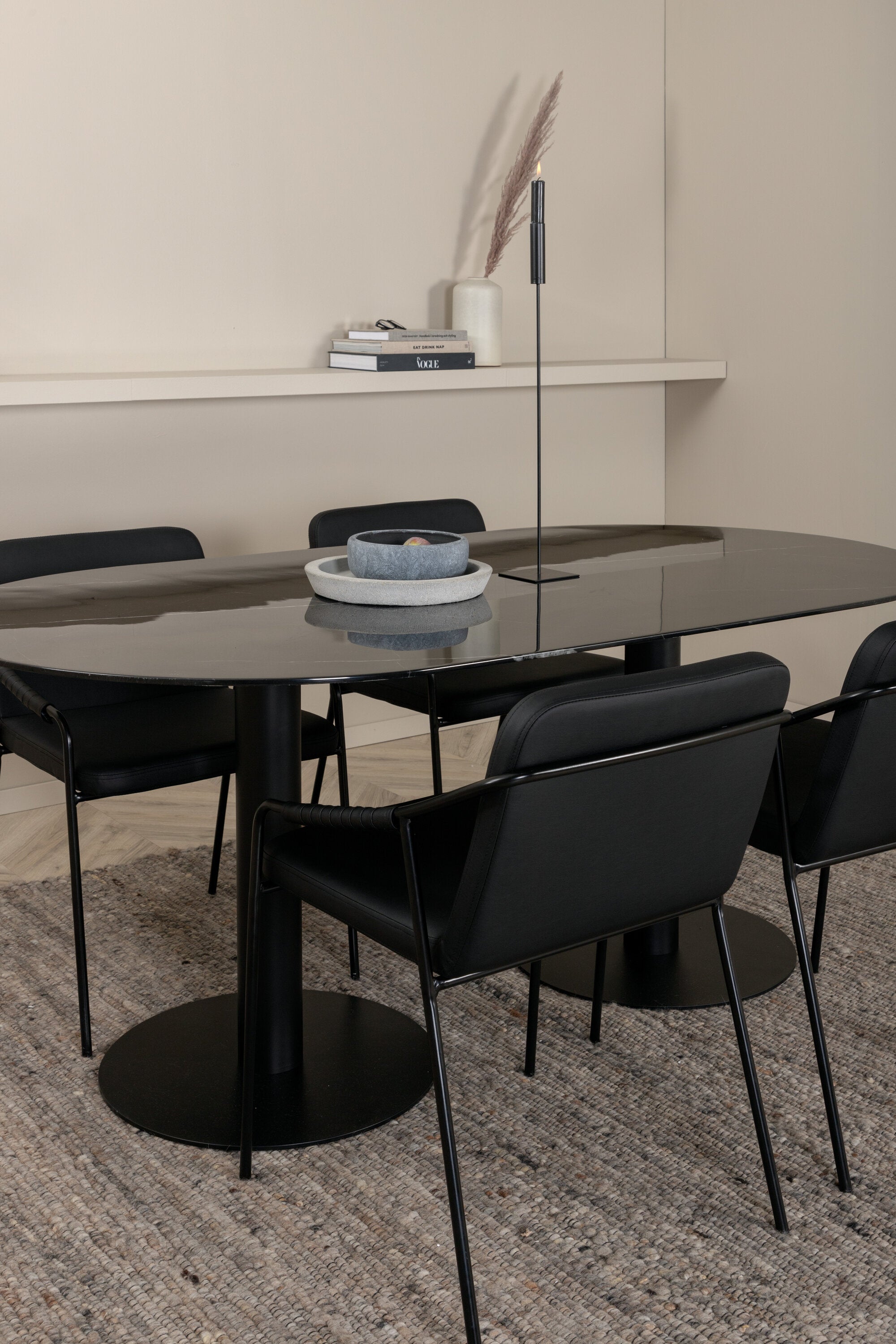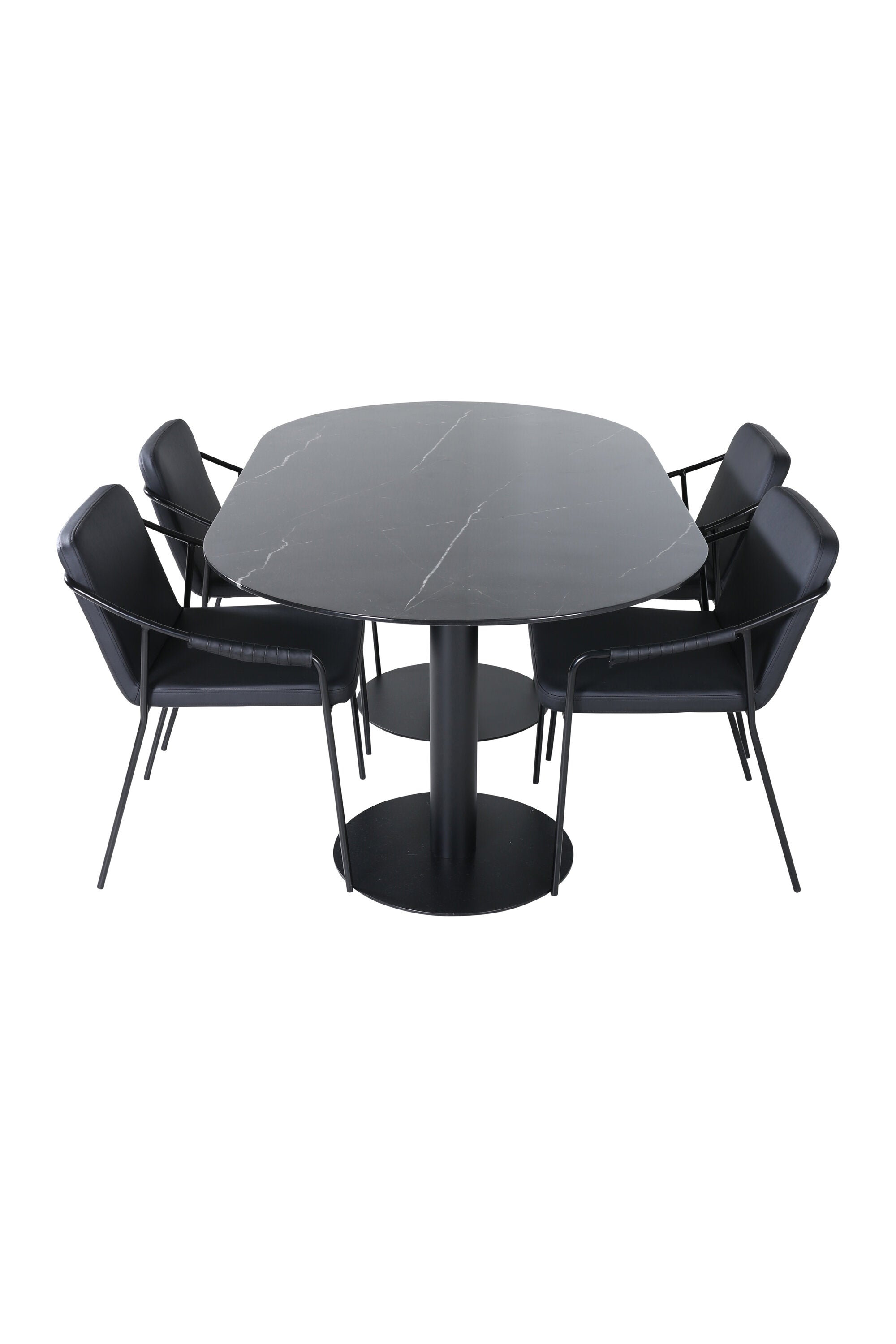 Jídelní stůl Pillan působí u vás doma módním dojmem a příjemnou atmosférou! Oválný design a celkový design jsou dobře promyšlené s tenkou horní deskou z černého mramorového skla a dvěma stabilními nohami stolu v černém kovu. Rozměry stolu: Délka: 180 cm, Šířka: 100 cm, Výška: 74 cm. Zde spolu se 4 jídelními židlemi sporu v lahodném designu. Sedadla jsou v černé umělé kůži a mají integrované područky a nohy židle z černého železa. Rozměry židle: výška: 77 cm, výška sedáku: 48 cm, šířka: 53 cm, hloubka: 59 cm. Ať se čas u jídelního stolu stane jedním z vrcholů dneška!