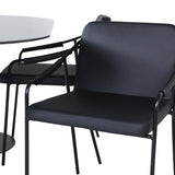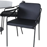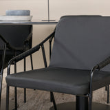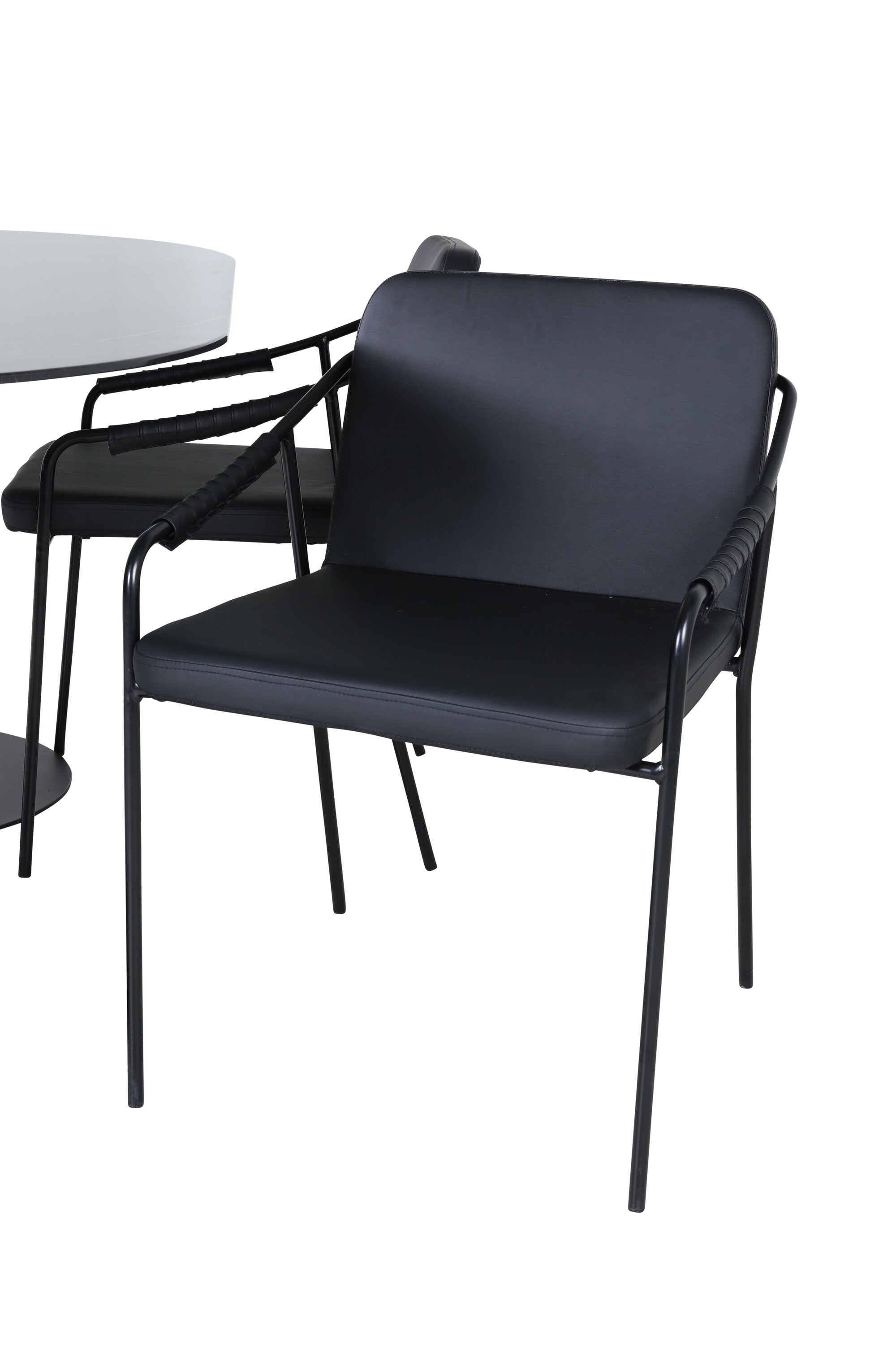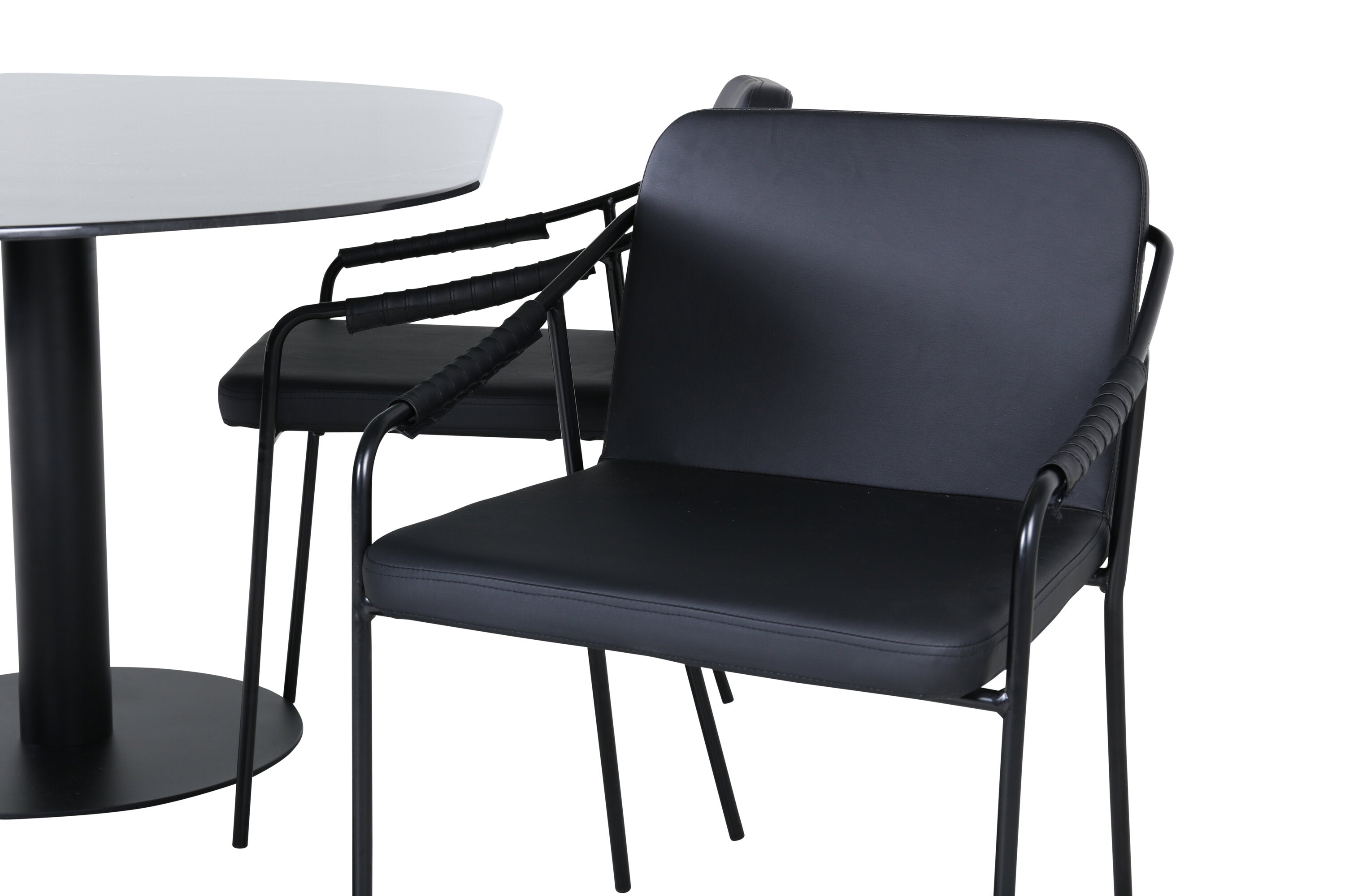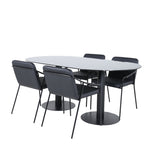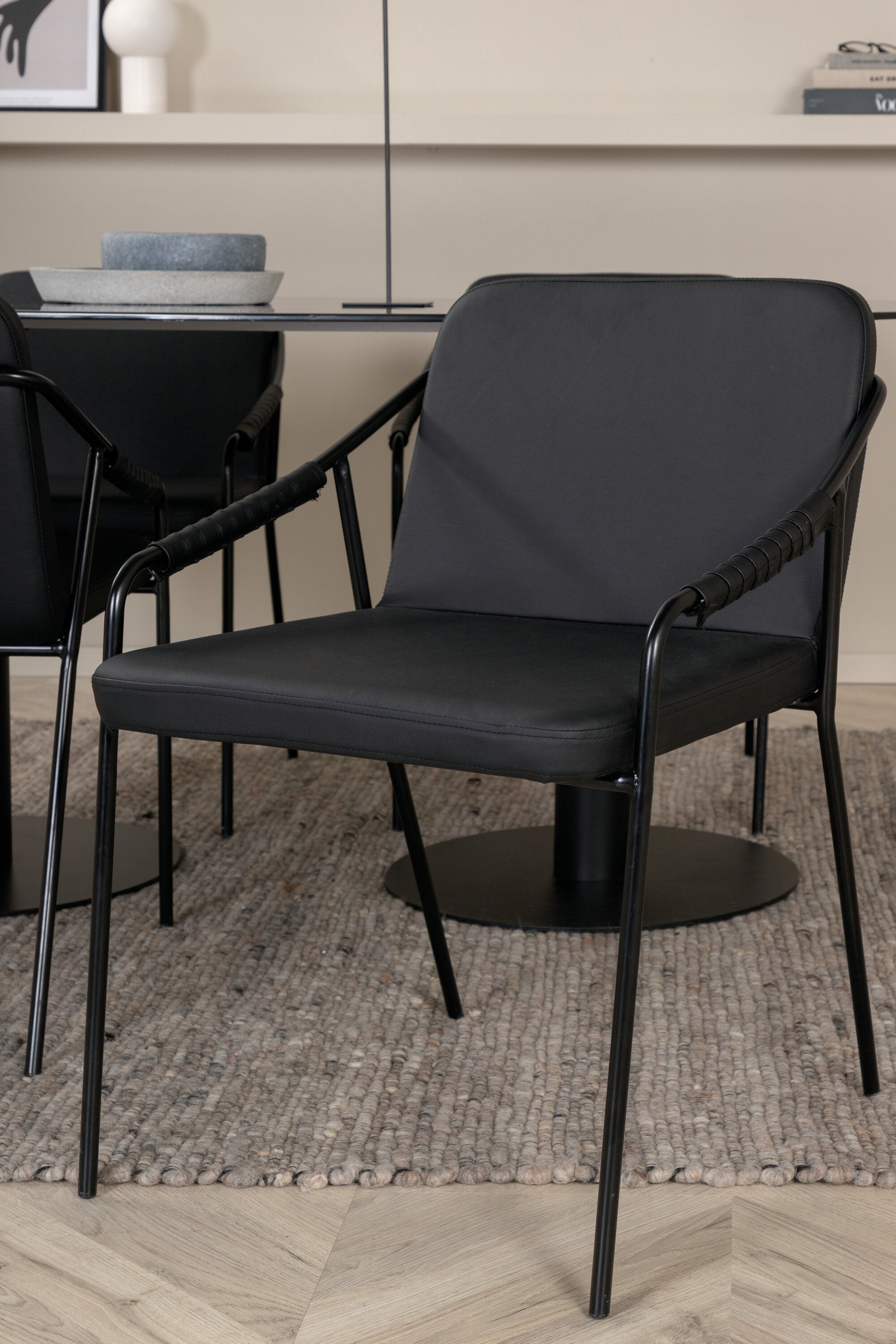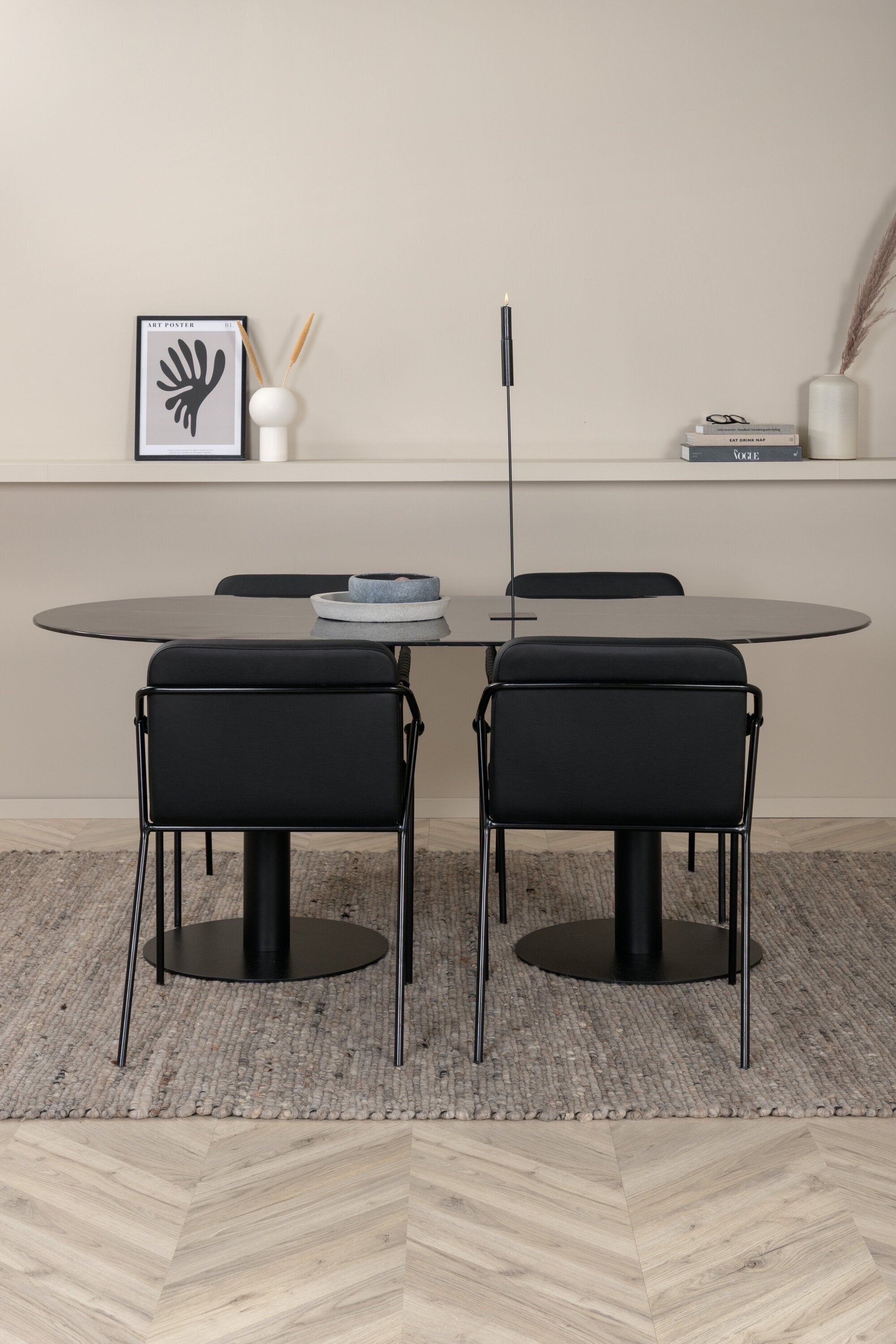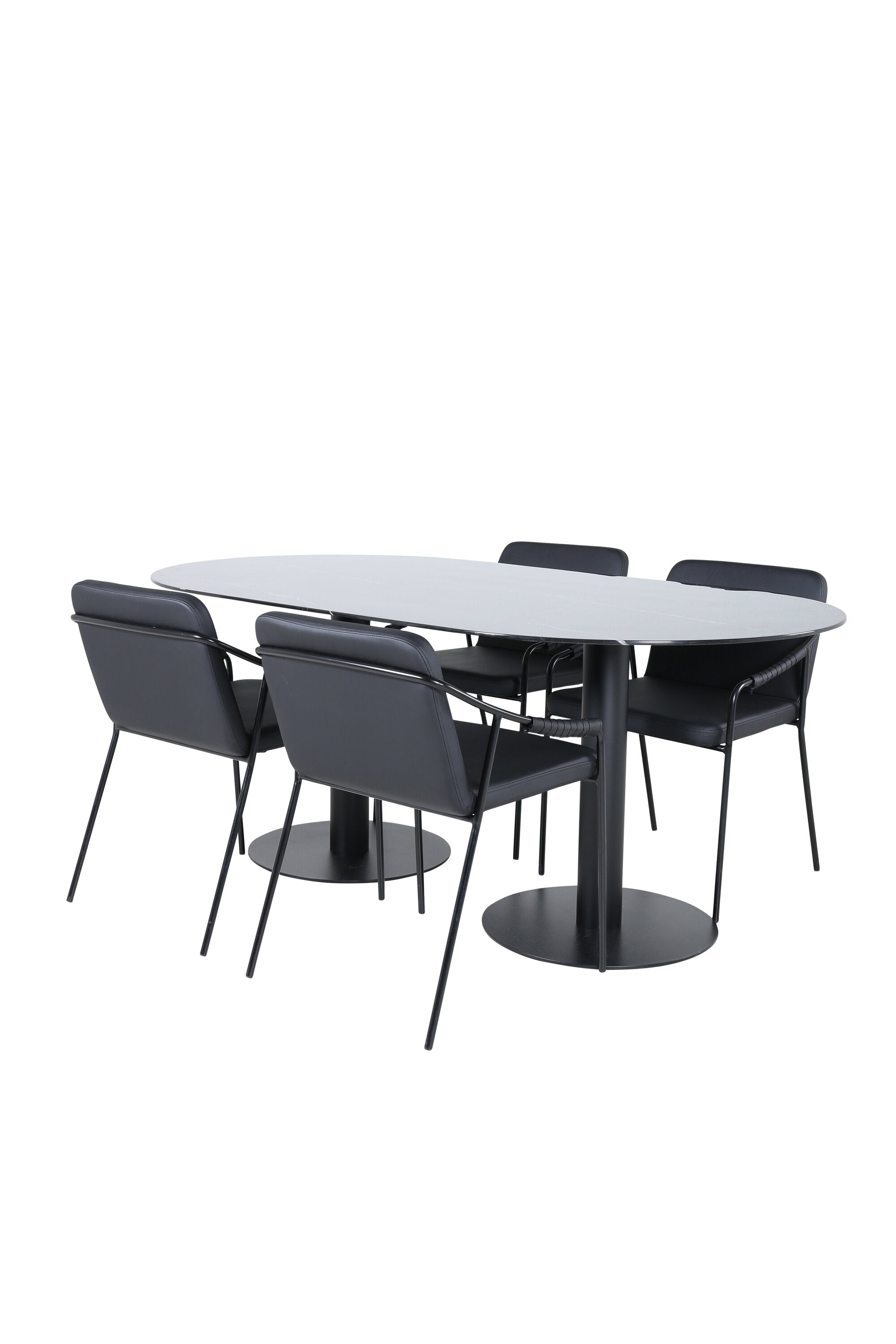 Jídelní stůl Pillan působí u vás doma módním dojmem a příjemnou atmosférou! Oválný design a celkový design jsou dobře promyšlené s tenkou horní deskou z černého mramorového skla a dvěma stabilními nohami stolu v černém kovu. Rozměry stolu: Délka: 180 cm, Šířka: 100 cm, Výška: 74 cm. Zde spolu se 4 jídelními židlemi sporu v lahodném designu. Sedadla jsou v černé umělé kůži a mají integrované područky a nohy židle z černého železa. Rozměry židle: výška: 77 cm, výška sedáku: 48 cm, šířka: 53 cm, hloubka: 59 cm. Ať se čas u jídelního stolu stane jedním z vrcholů dneška!