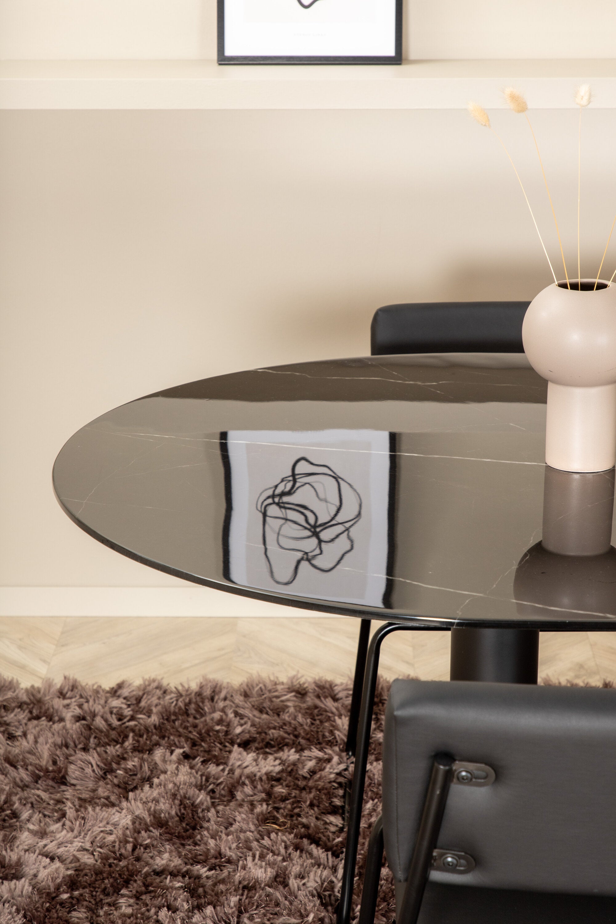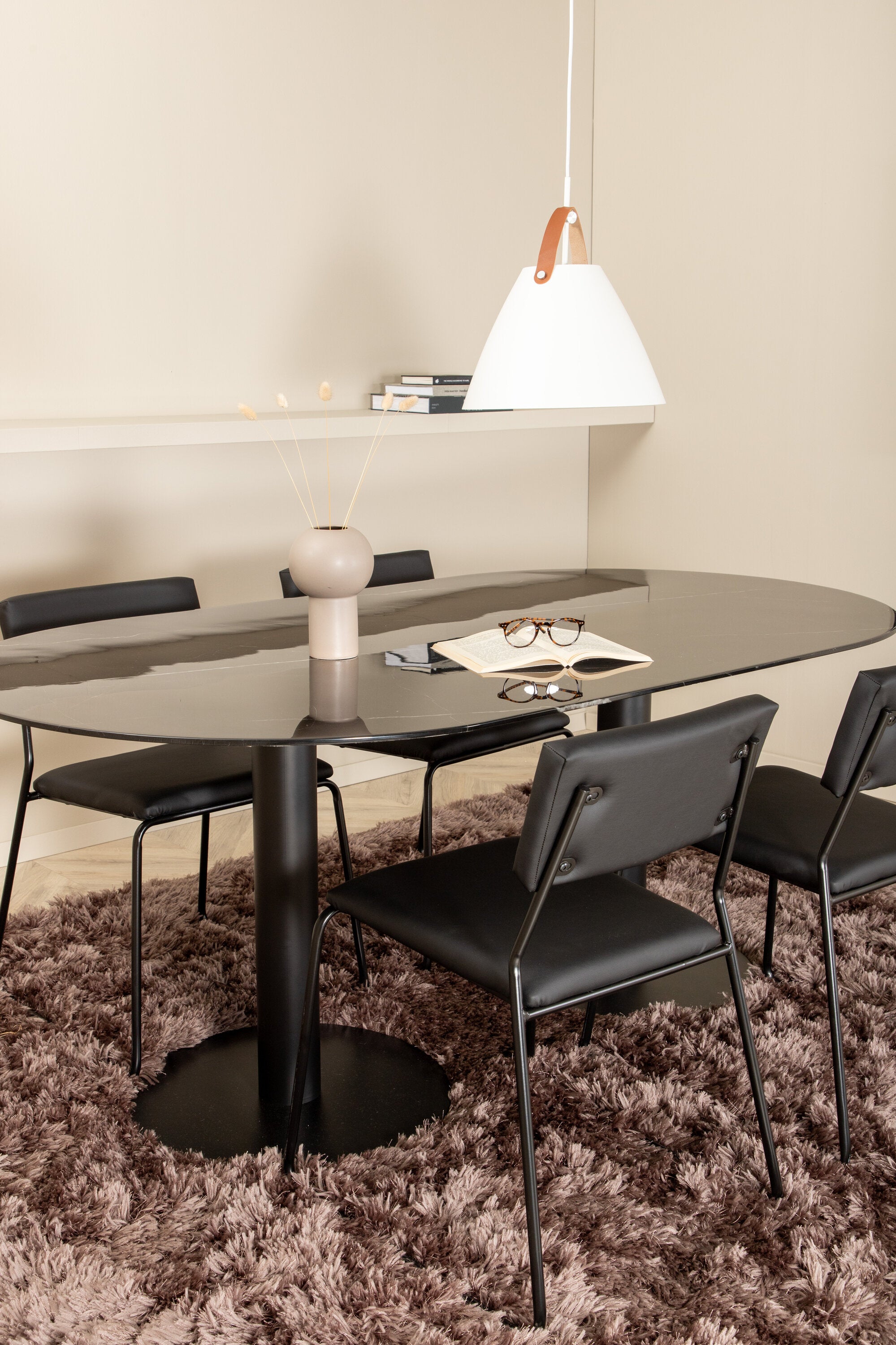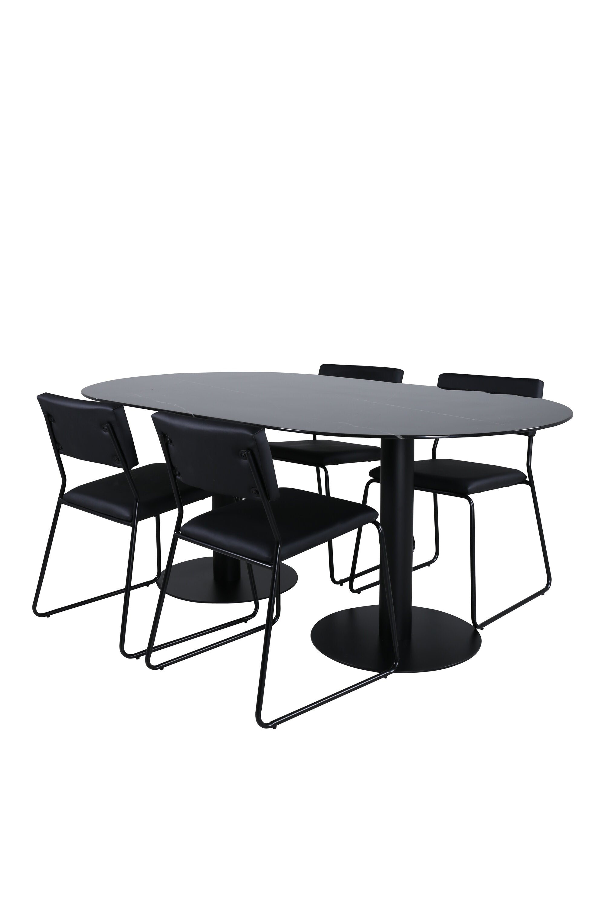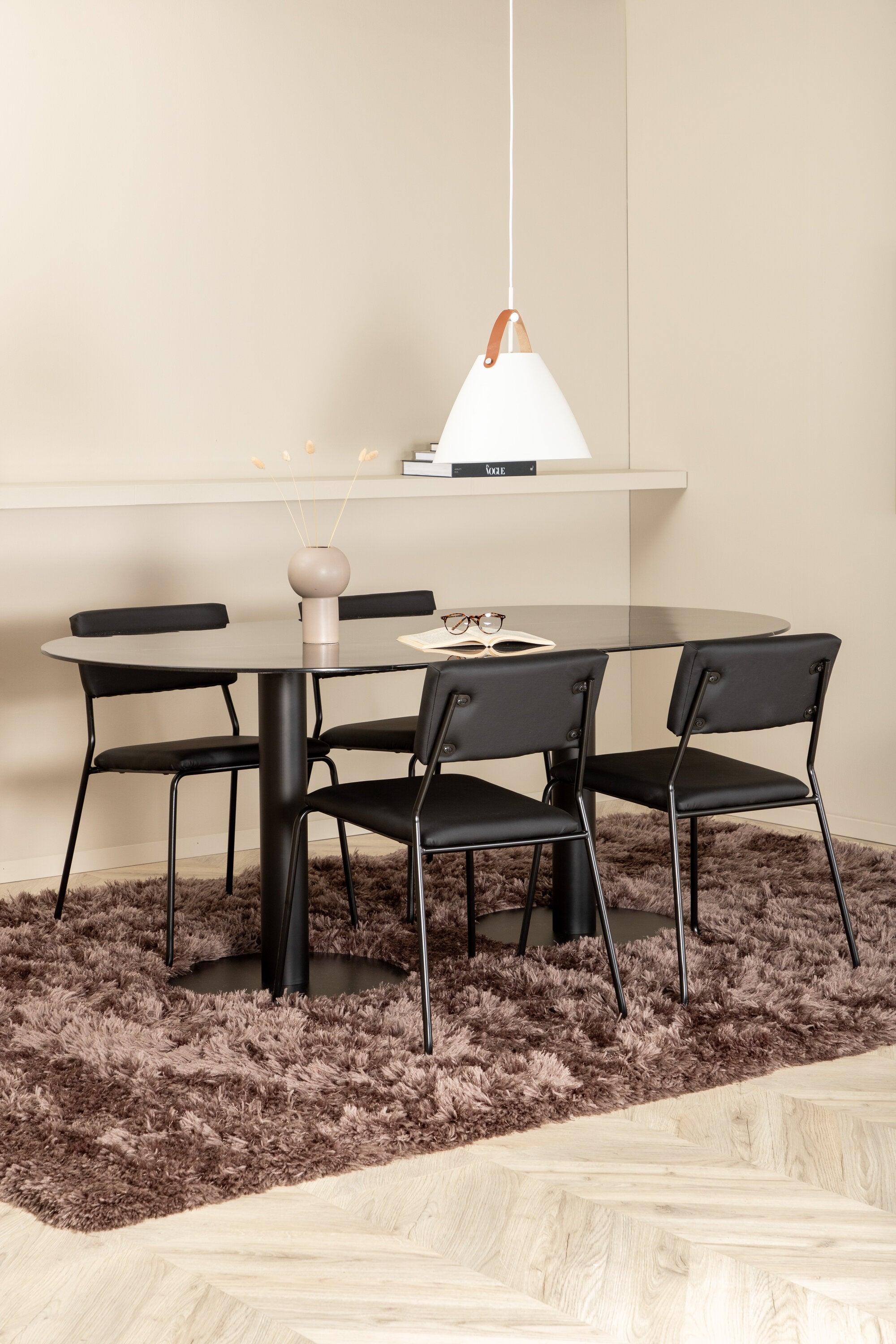 Stylové a vzdušné - dokonalé spojení elegance a minimalismu! Jídelní stůl Pillan zaujme svým elegantním designem a příjemným oválným designem. Celkový design je velmi dobře promyšlený s tenkou horní deskou z černého mramorového skla a dvěma stabilními nohami stolu v černém kovu. Rozměry stolu: Délka: 180 cm, Šířka: 100 cm, Výška: 74 cm. Zde je sladěn se 4 jídelními židlemi Kenth v úzkém designu s černými nohami židlí ze železa a černými sedáky z umělé kůže. Rozměry židle: Výška: 76 cm, výška sedáku: 48,5 cm, šířka: 40 cm, hloubka: 52 cm. Nechte toto krásně sladěné jídlo s moderním nádechem stát se přirozeným místem setkávání u vás doma.