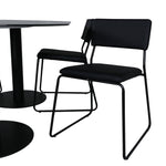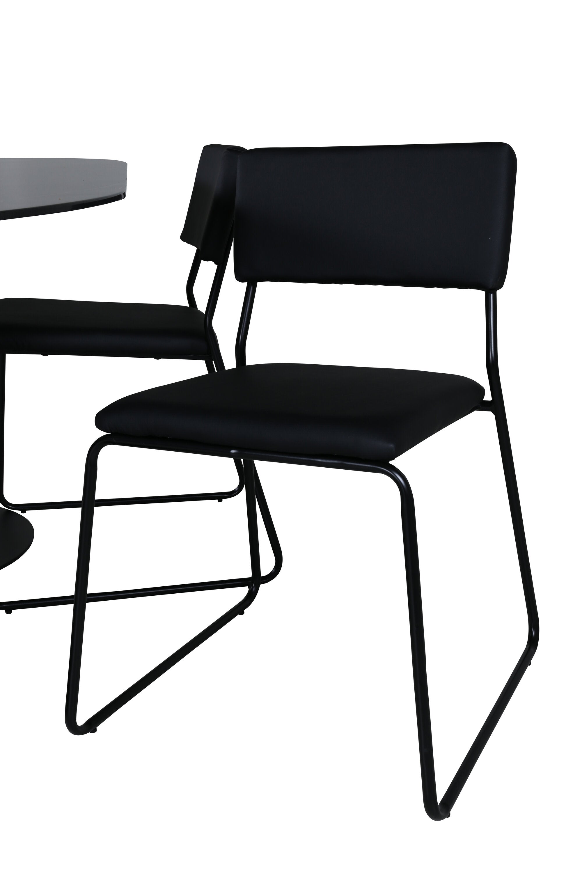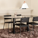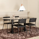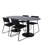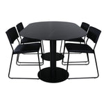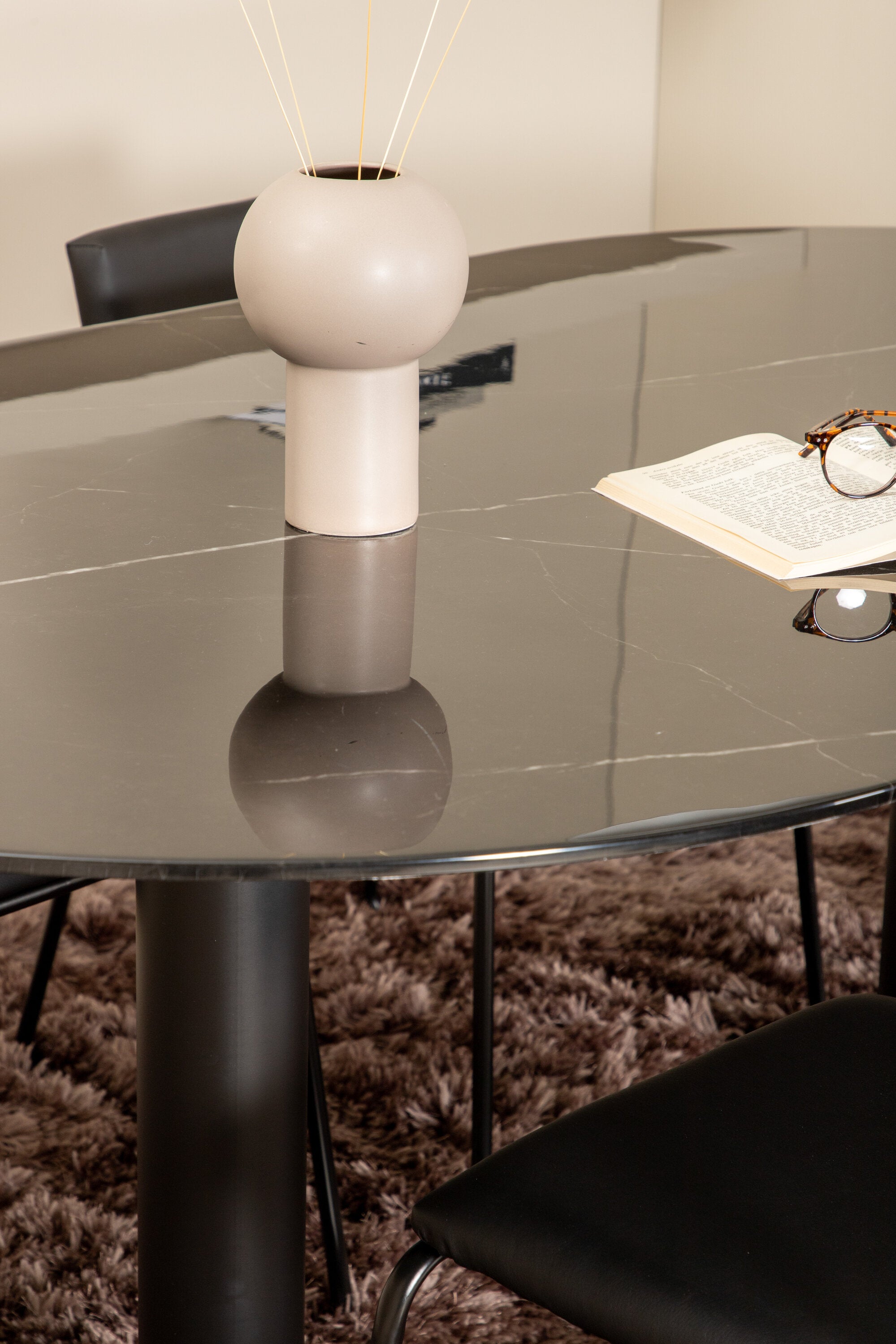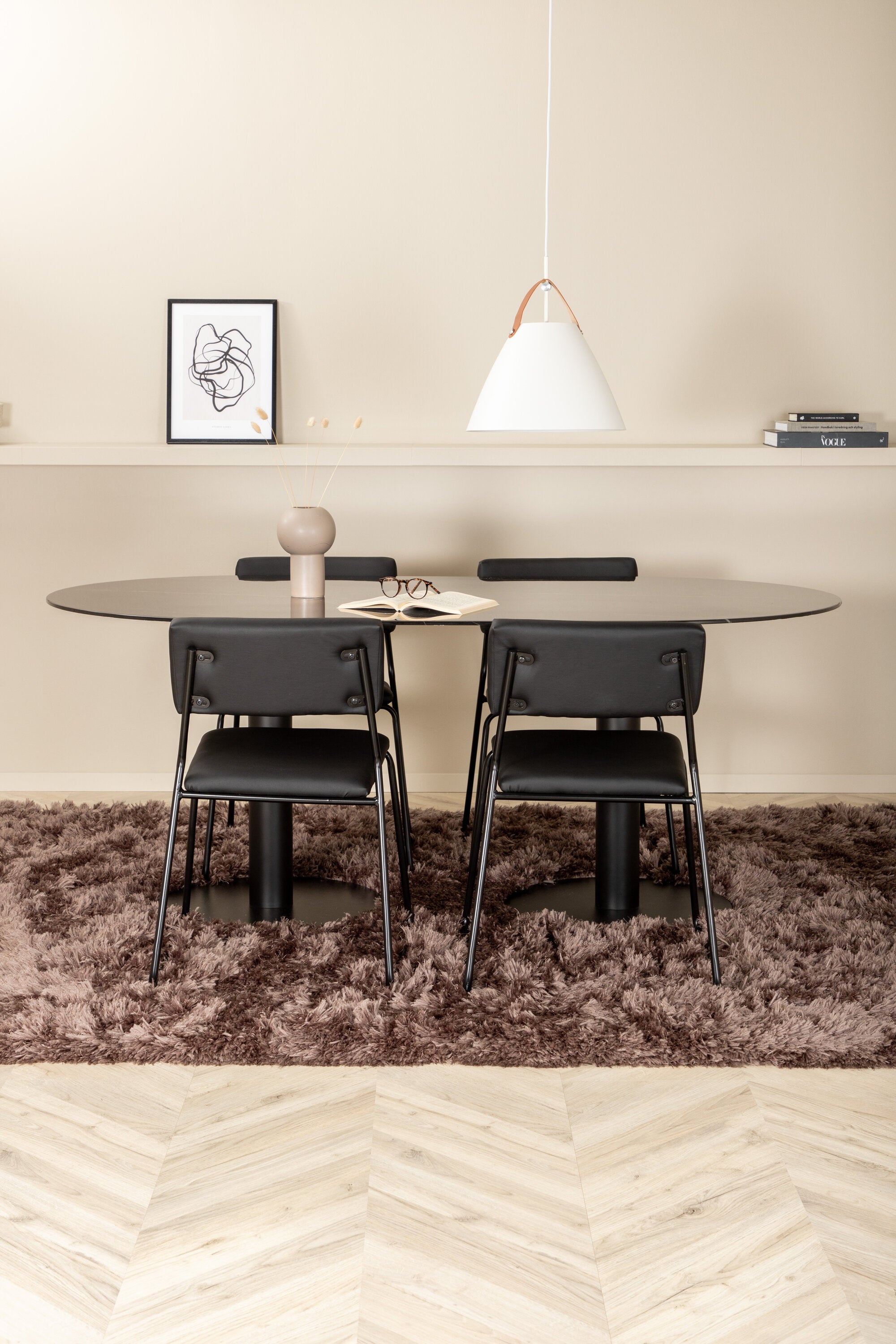 Stylové a vzdušné - dokonalé spojení elegance a minimalismu! Jídelní stůl Pillan zaujme svým elegantním designem a příjemným oválným designem. Celkový design je velmi dobře promyšlený s tenkou horní deskou z černého mramorového skla a dvěma stabilními nohami stolu v černém kovu. Rozměry stolu: Délka: 180 cm, Šířka: 100 cm, Výška: 74 cm. Zde je sladěn se 4 jídelními židlemi Kenth v úzkém designu s černými nohami židlí ze železa a černými sedáky z umělé kůže. Rozměry židle: Výška: 76 cm, výška sedáku: 48,5 cm, šířka: 40 cm, hloubka: 52 cm. Nechte toto krásně sladěné jídlo s moderním nádechem stát se přirozeným místem setkávání u vás doma.