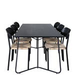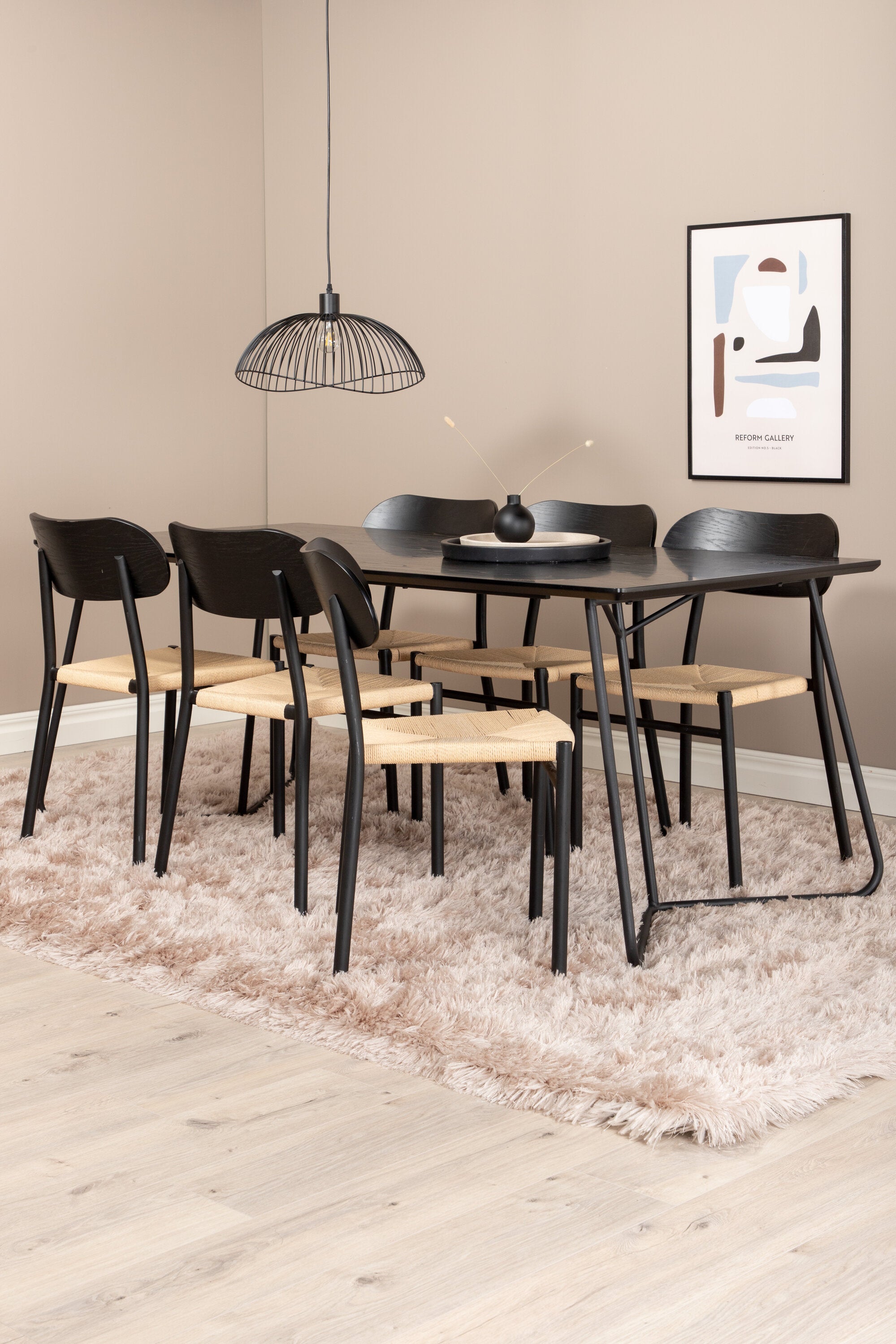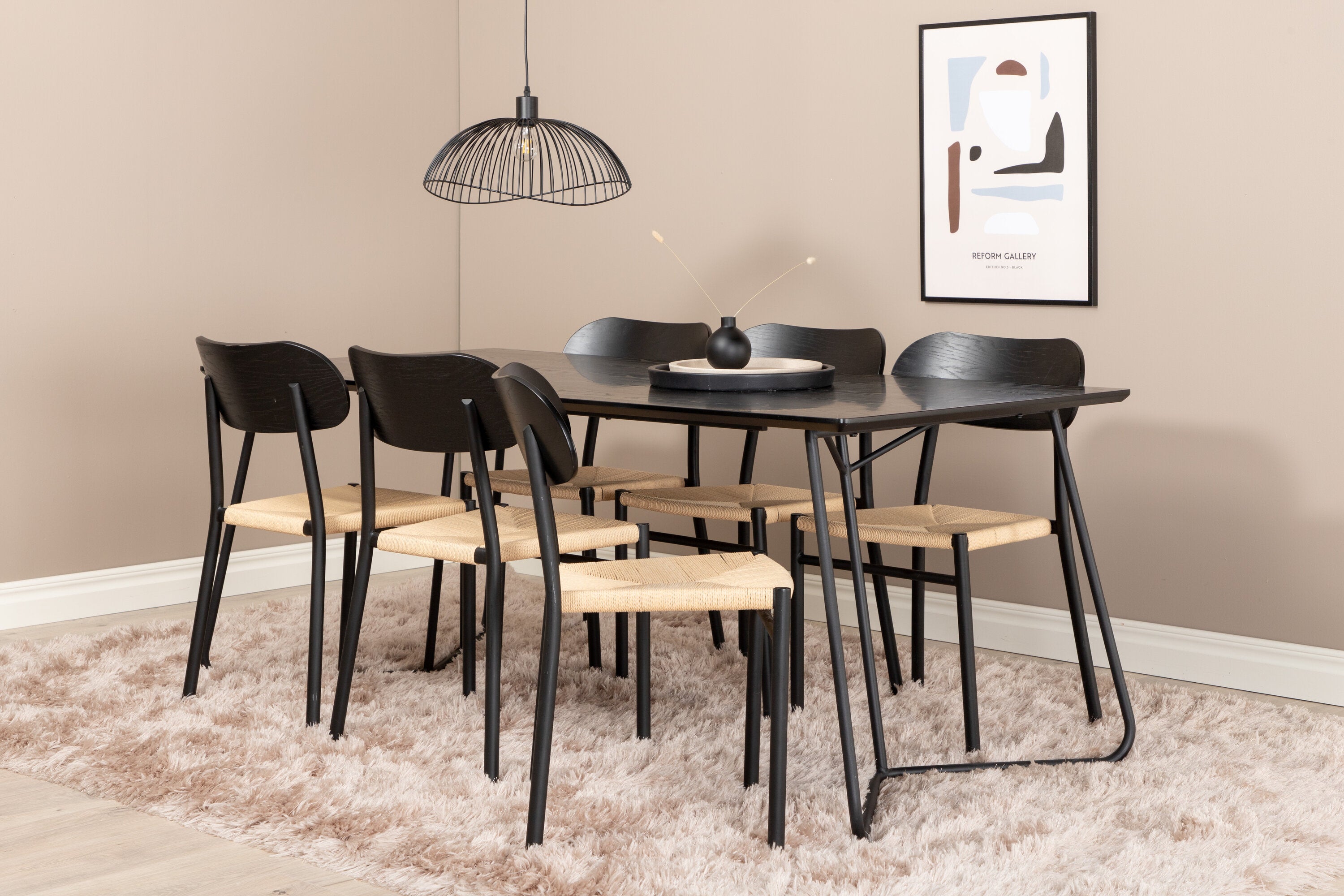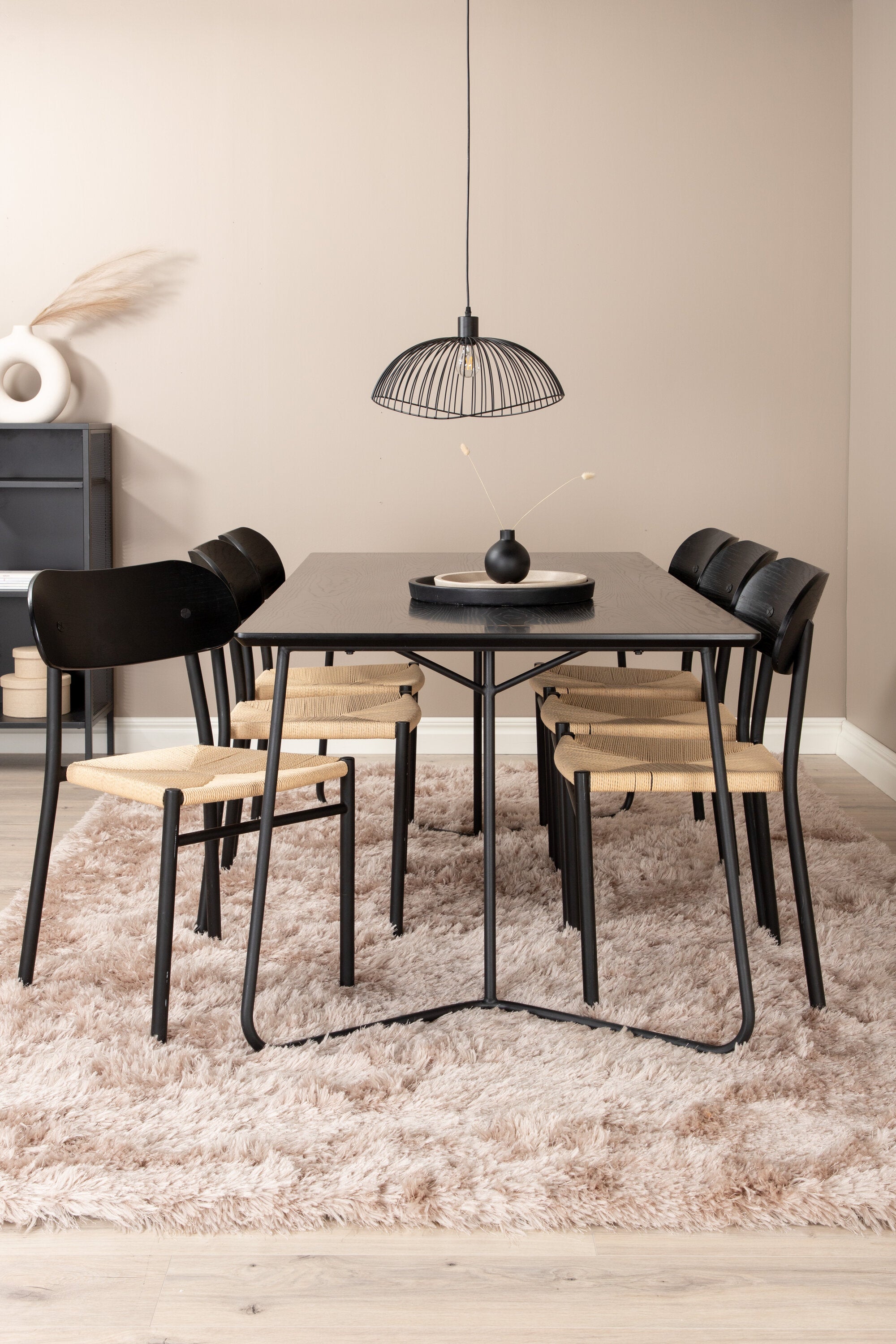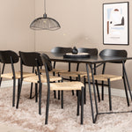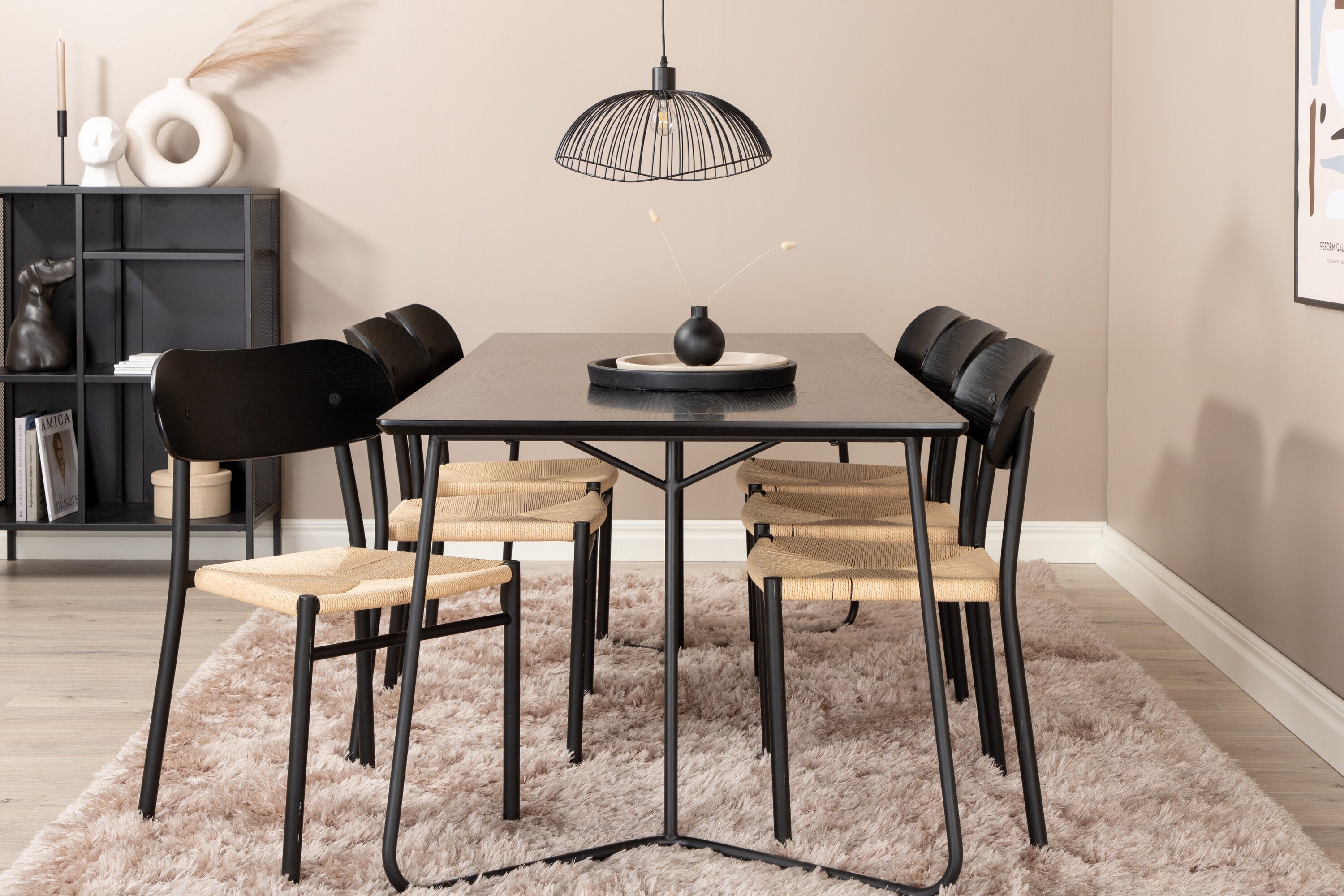 Módní skupina jídel, která se skvěle hodí do obývacího pokoje! Jídelní stůl Petra má promyšlený design se skandinávskými tvary, který působí stylově, úzké, lehce rozšířené nohy ze železa a stolní deska z černé MDF s dýhou. Rozměry stolu: Délka: 190 cm, Šířka: 90 cm, Výška: 75 cm. Zde v dokonalé kombinaci se 6 jídelními židlemi ze série Polly. Nohy židle jsou z černého kovu a sedáky v přírodní barvě z lan. Rozměry židle: výška: 88 cm, výška sedáku: 47 cm, šířka: 42 cm, hloubka: 55 cm. Nechte toto krásně sladěné jídlo s moderním nádechem stát se přirozeným místem setkávání u vás doma.