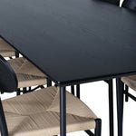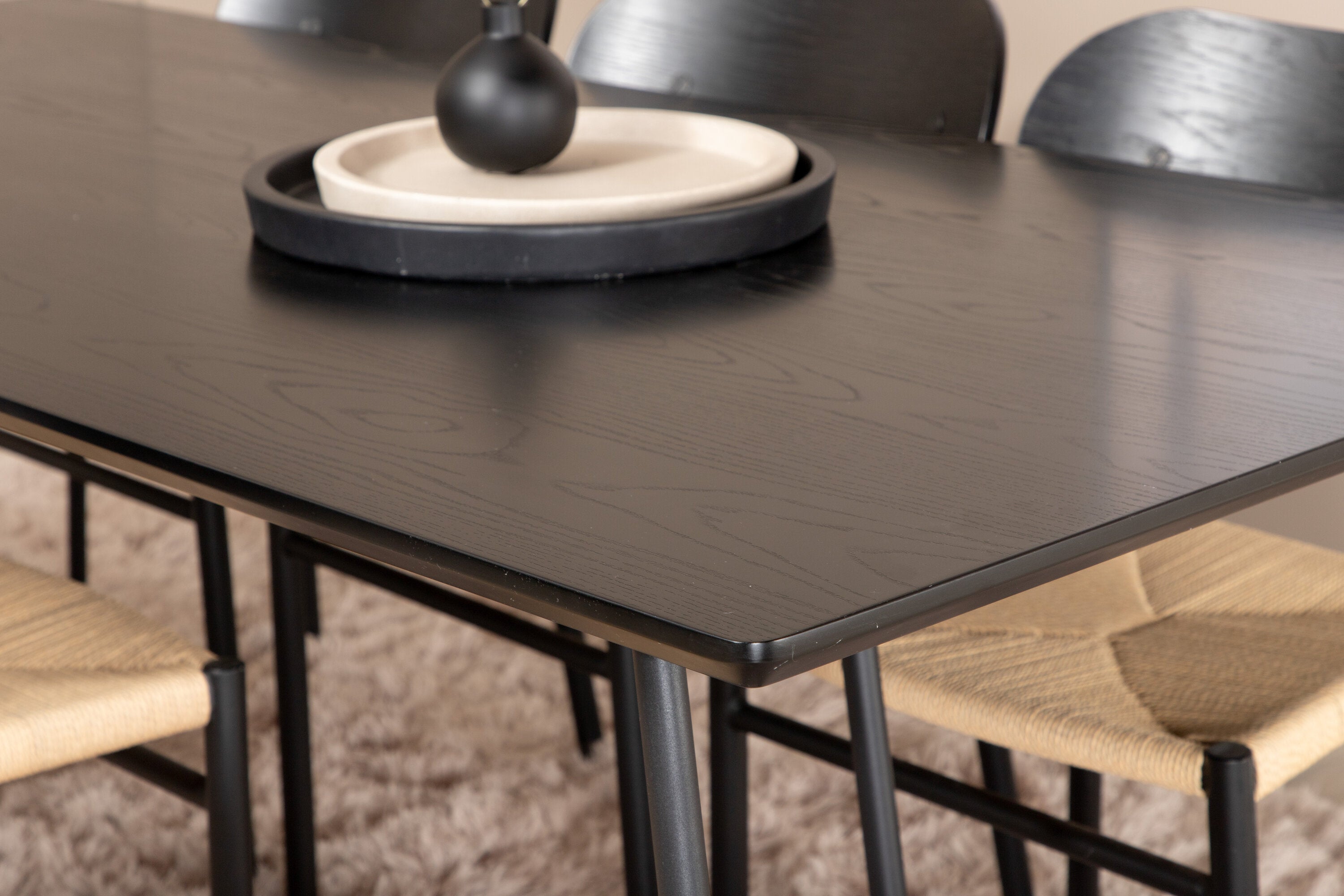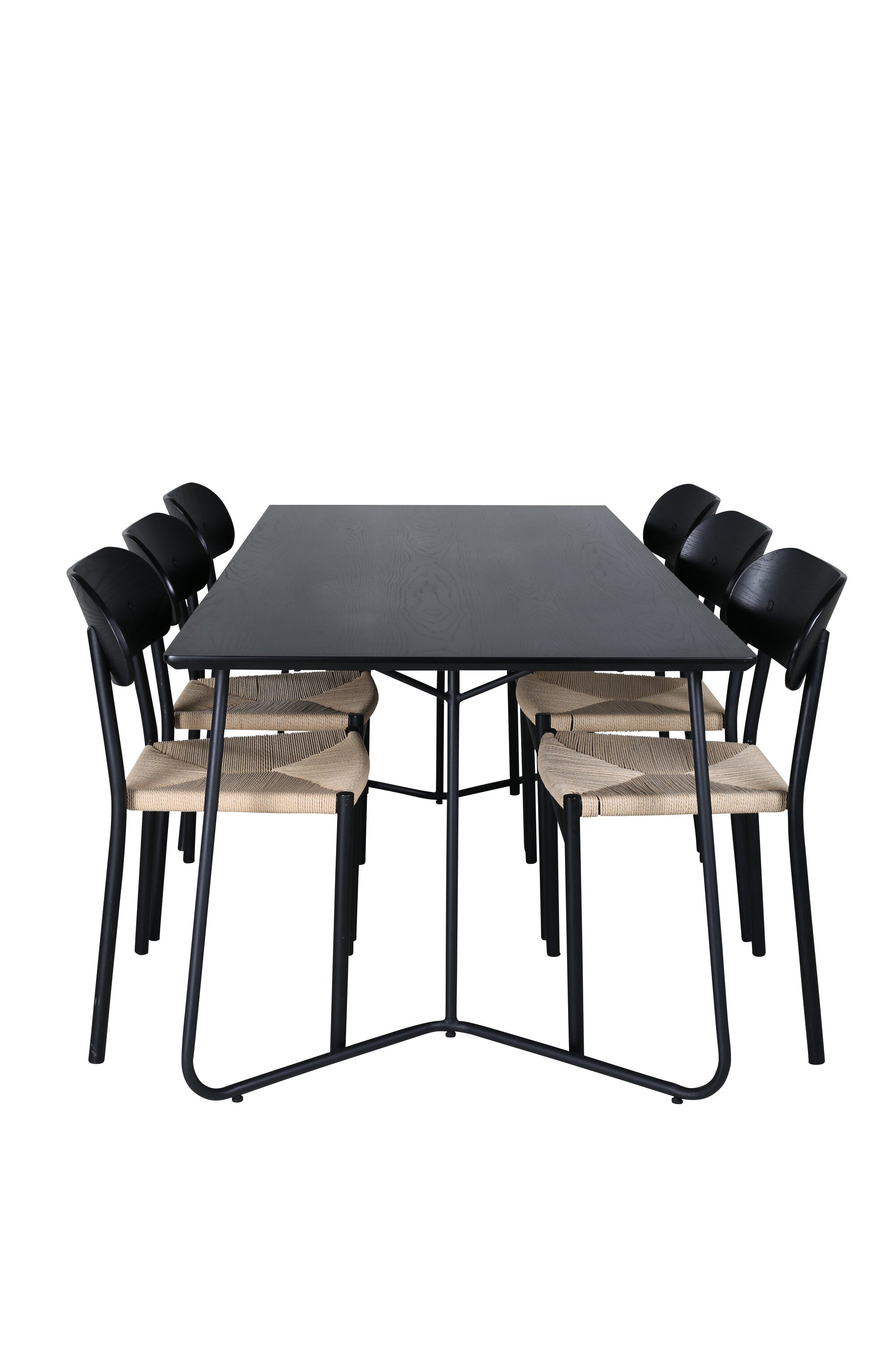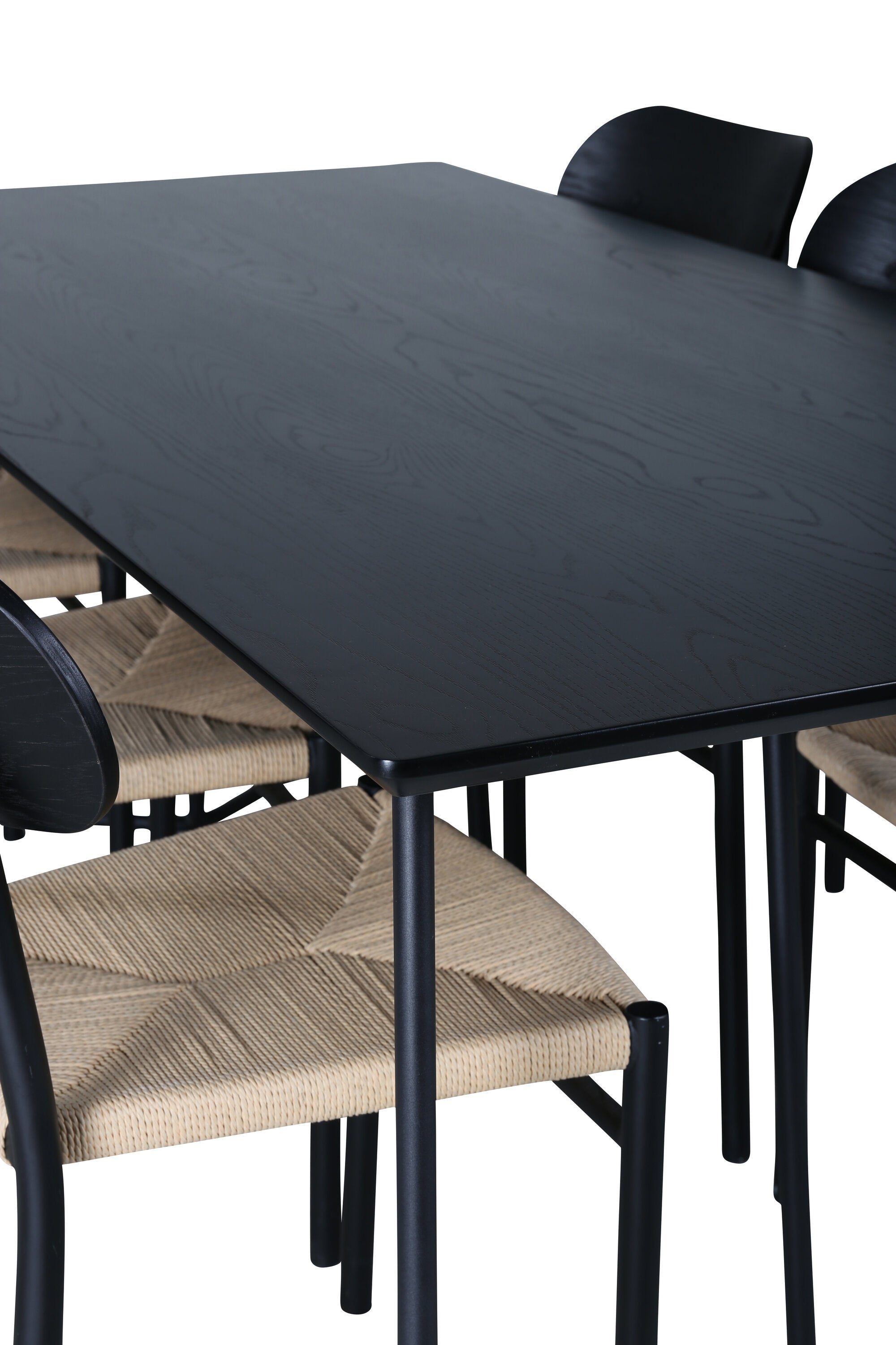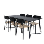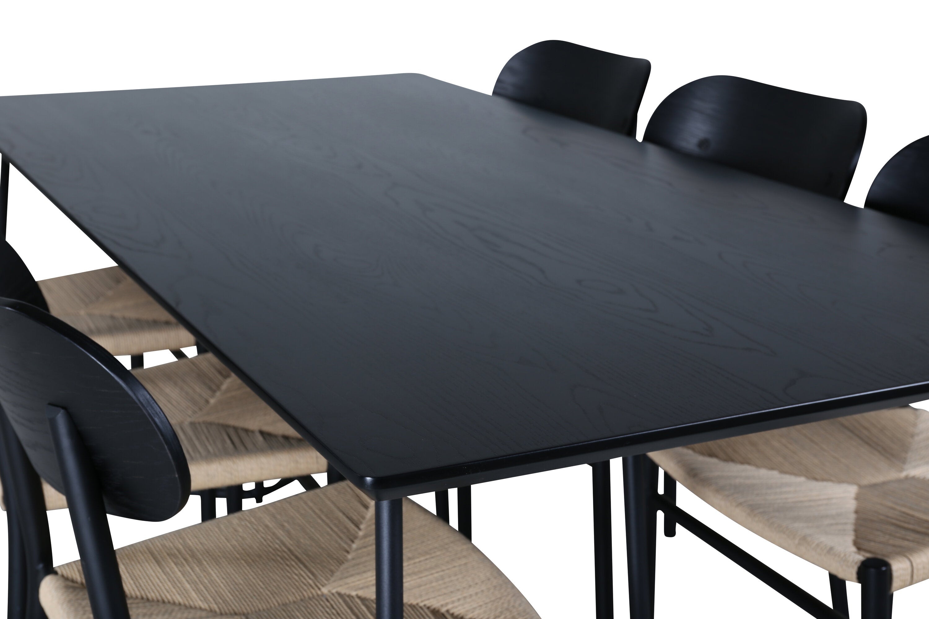 Módní skupina jídel, která se skvěle hodí do obývacího pokoje! Jídelní stůl Petra má promyšlený design se skandinávskými tvary, který působí stylově, úzké, lehce rozšířené nohy ze železa a stolní deska z černé MDF s dýhou. Rozměry stolu: Délka: 190 cm, Šířka: 90 cm, Výška: 75 cm. Zde v dokonalé kombinaci se 6 jídelními židlemi ze série Polly. Nohy židle jsou z černého kovu a sedáky v přírodní barvě z lan. Rozměry židle: výška: 88 cm, výška sedáku: 47 cm, šířka: 42 cm, hloubka: 55 cm. Nechte toto krásně sladěné jídlo s moderním nádechem stát se přirozeným místem setkávání u vás doma.